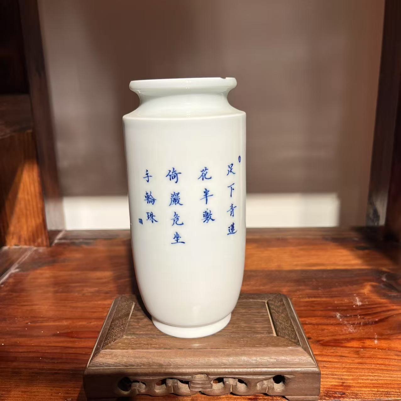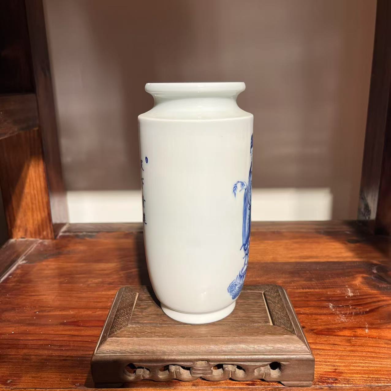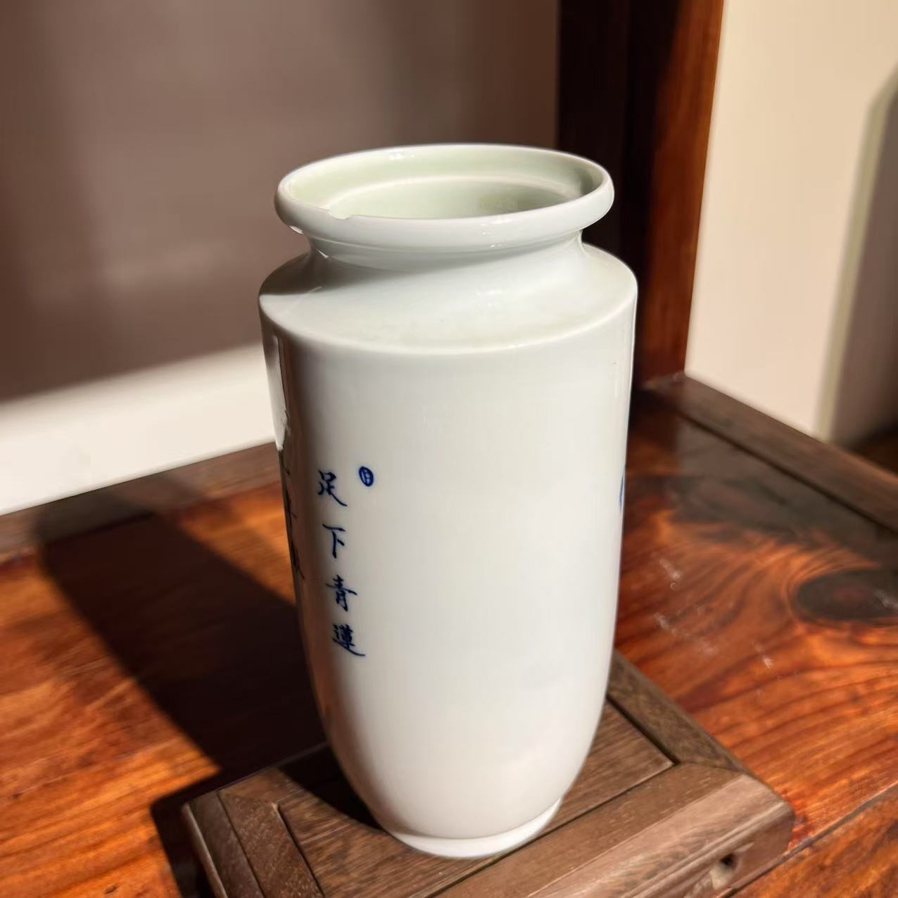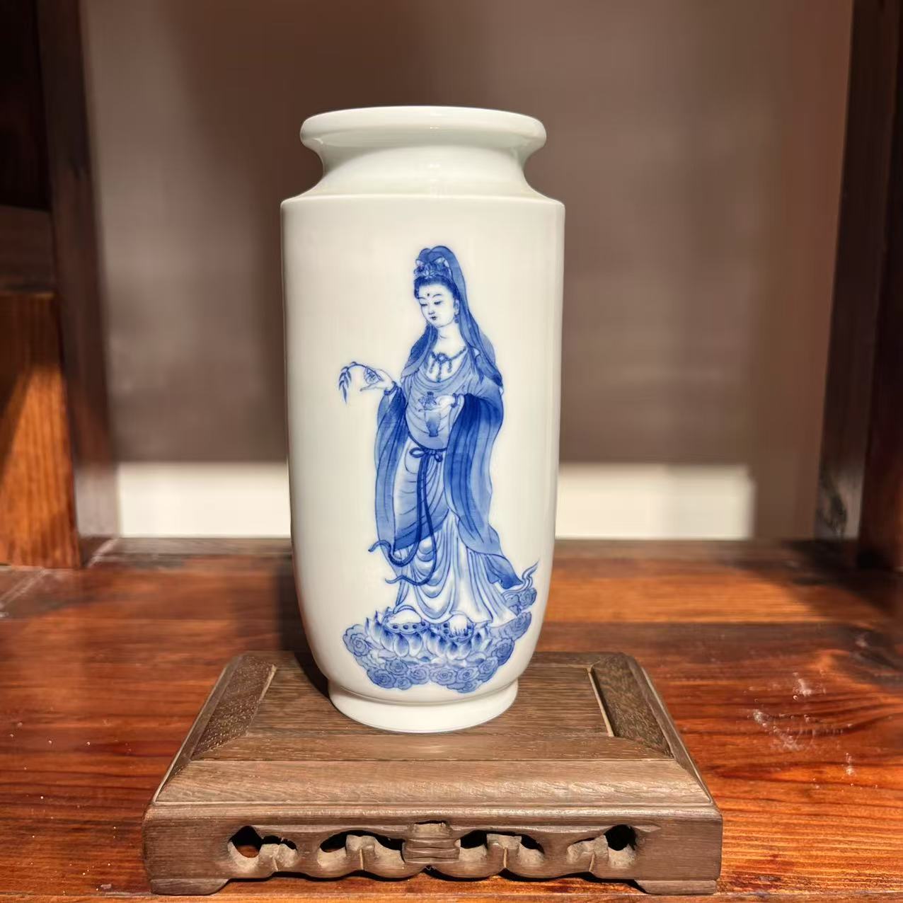 此花瓶造型简洁大方,瓶身以白瓷为底,采用青花工艺精心绘制观音像。观音神态安详,衣袂飘飘,线条流畅细腻 ,青花发色沉稳。整体给人一种宁静、祥和之感,不仅是一件精美的家居装饰品,更承载着美好的祈愿与祝福。