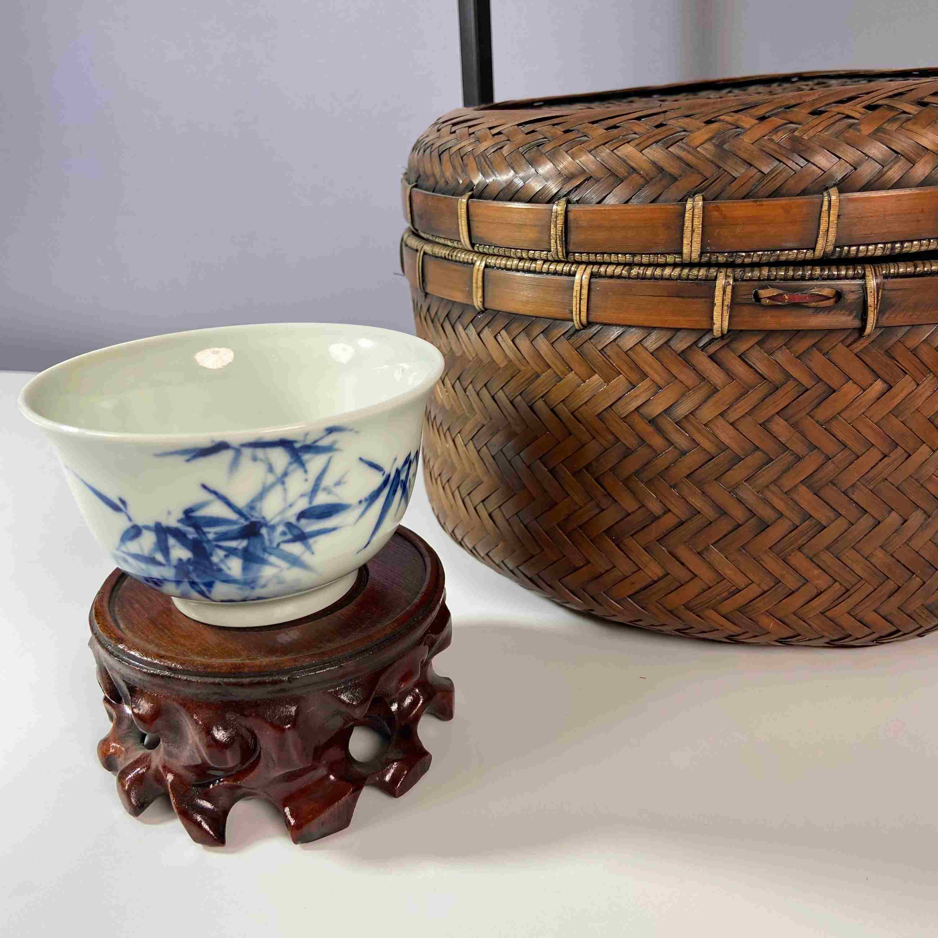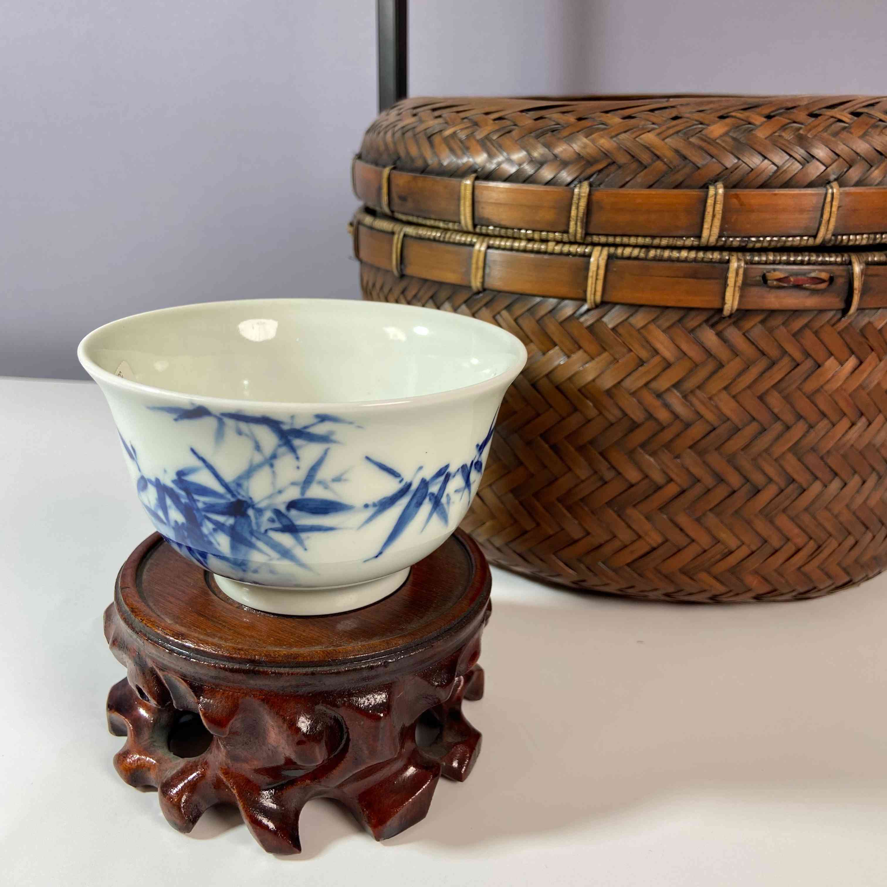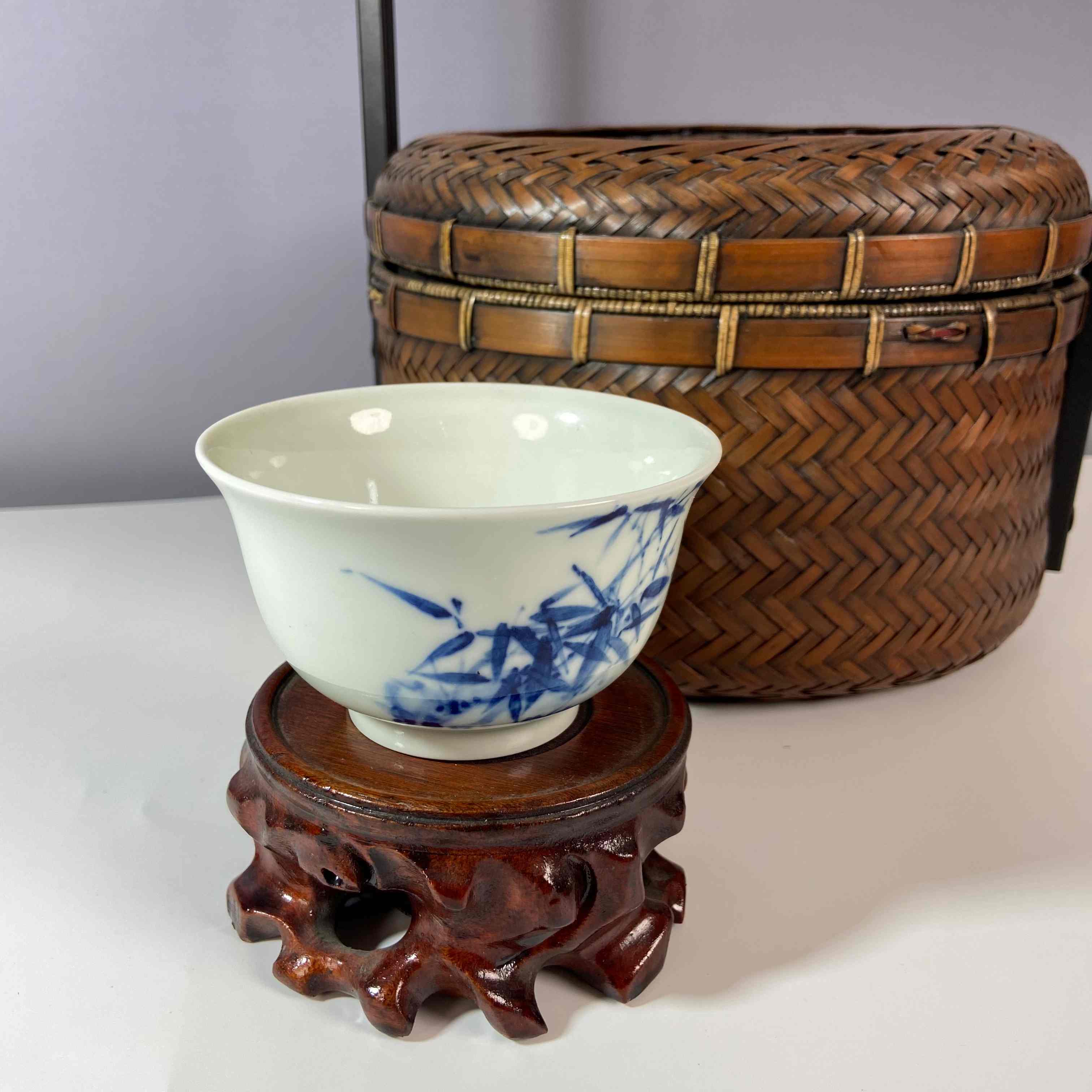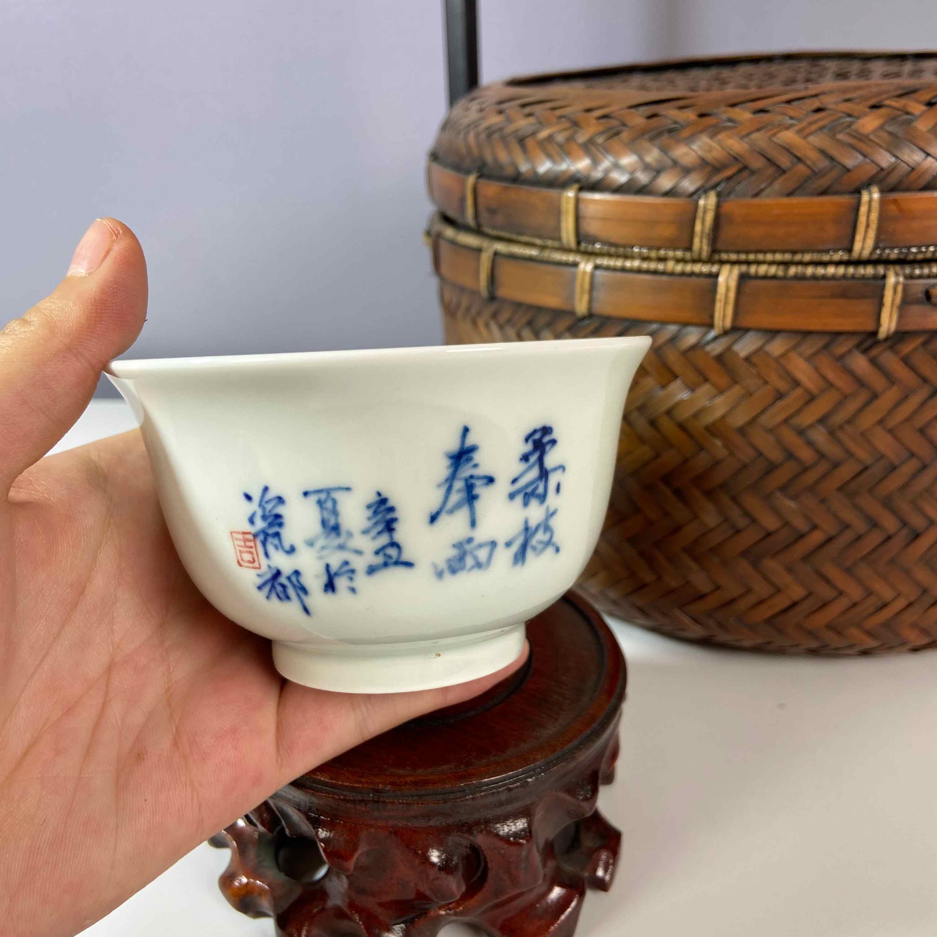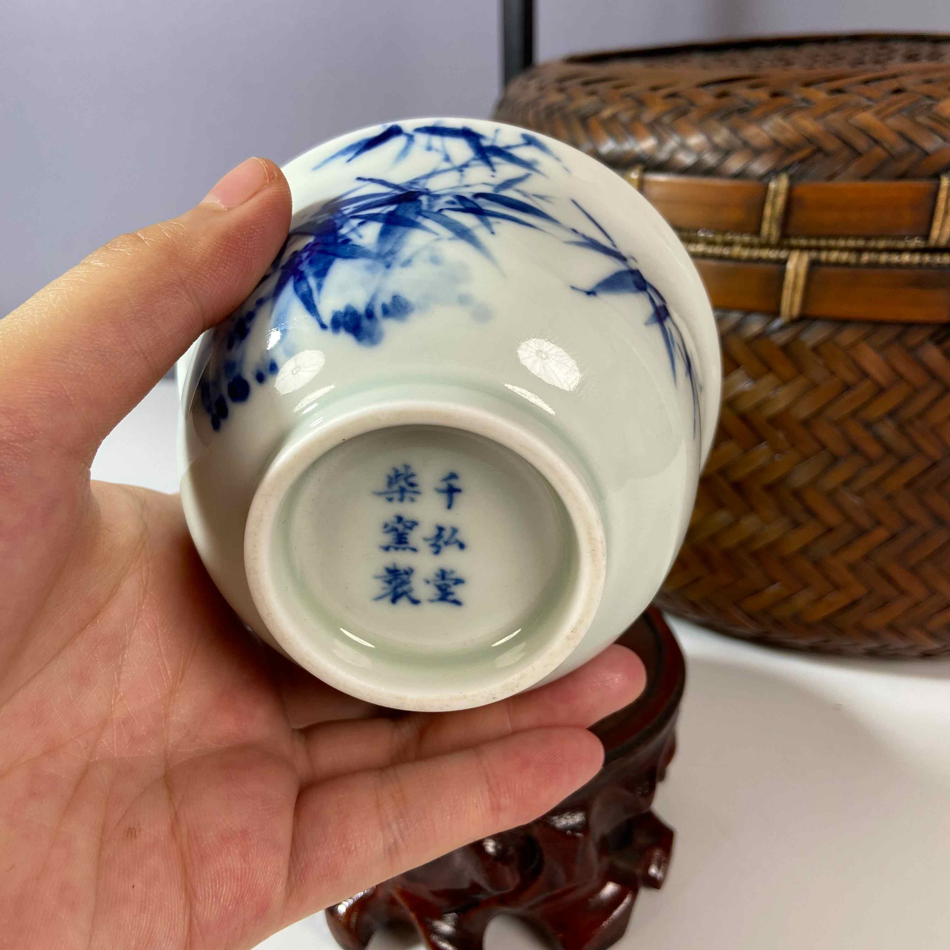 青花绘画:杯身运用了青花瓷的装饰工艺,以钴料为着色剂,在白瓷胎上绘制图案,再施透明釉,经过高温烧制后,呈现出蓝色的花纹。杯身上绘制了竹子图案,竹子枝叶的线条流畅,青花发色浓淡相宜,展现出一定的绘画功底和工艺水平 ,竹子在中国传统文化中常象征着气节、坚韧和高洁。