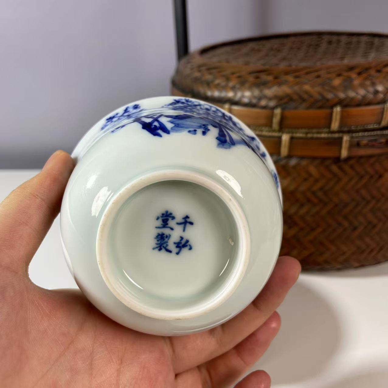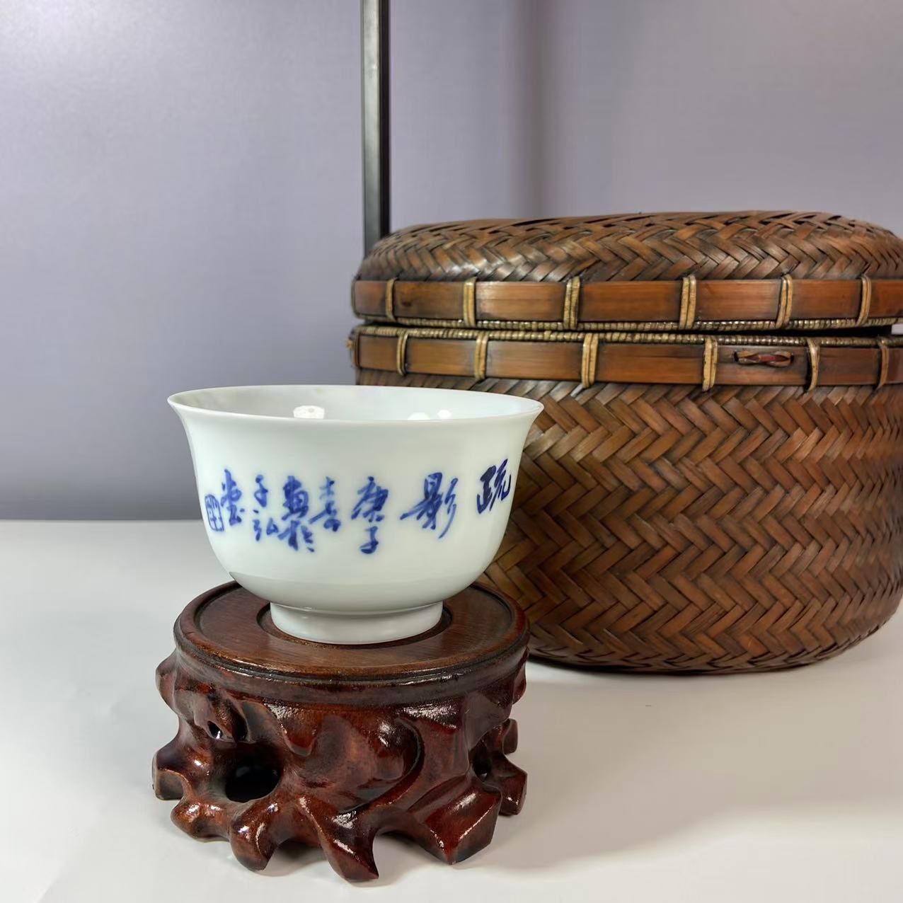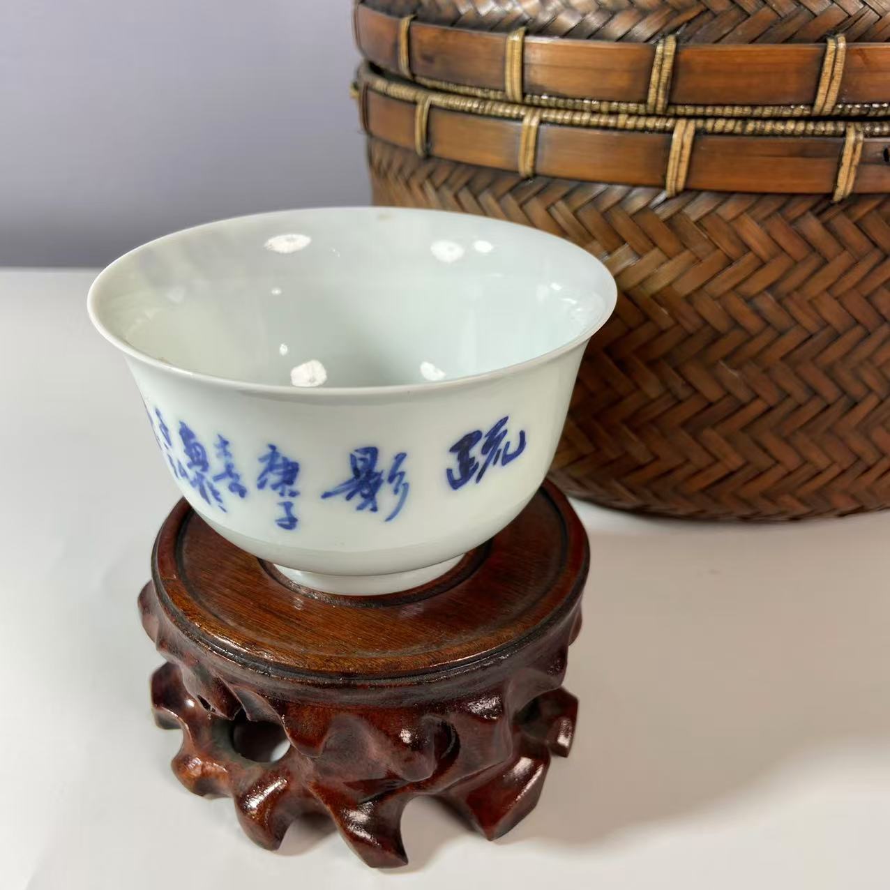 杯身上还书写有青花字体的文字,这些书法文字进一步增添了杯子的文化艺术气息,与青花绘画相互映衬,使整个杯子更具韵味 。书法字体的书写风格也具有一定的艺术美感,体现了制作者在书法和装饰设计上的用心。