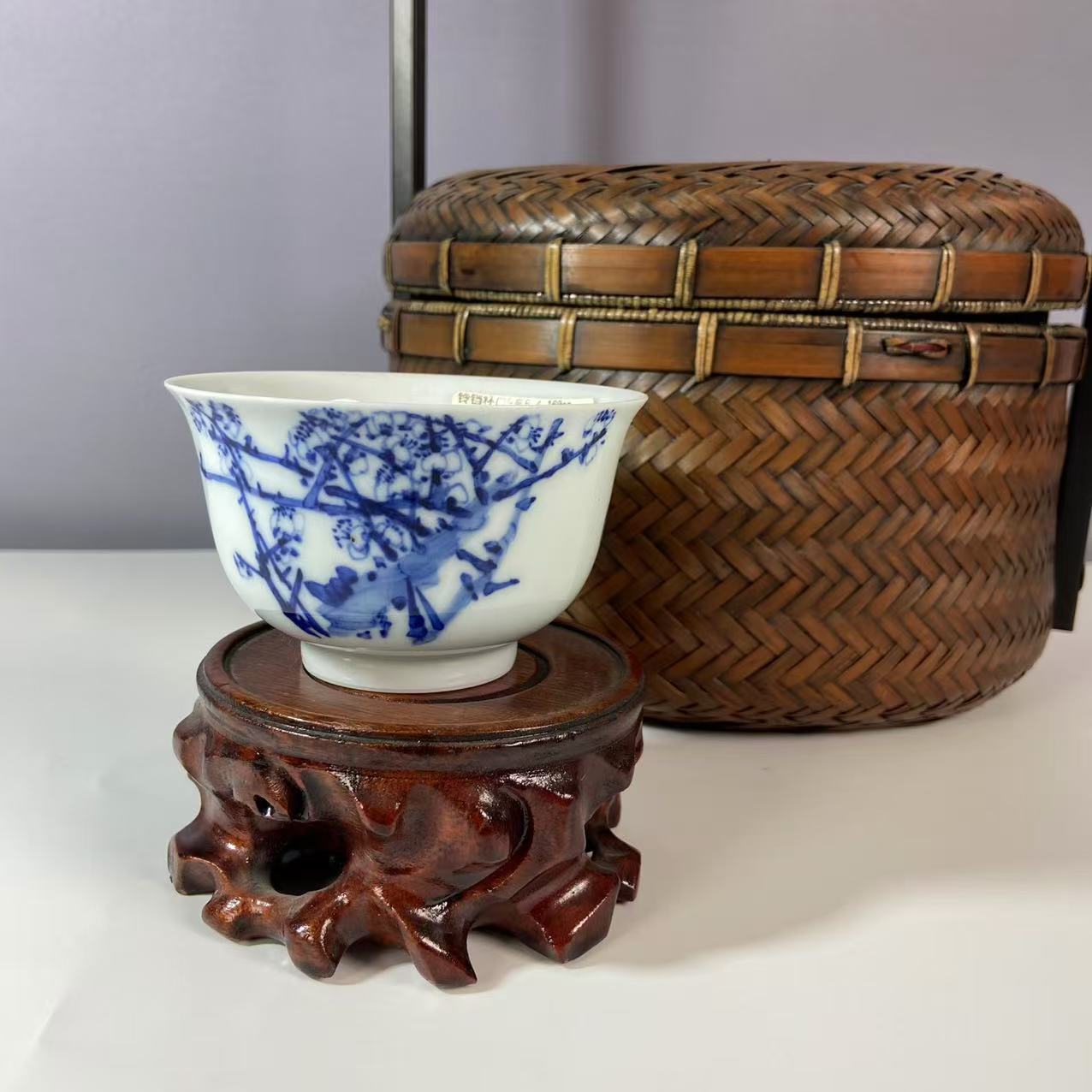 杯身采用了青花瓷工艺,以钴料为着色剂在白瓷胎上进行绘画,再施透明釉经高温烧制而成。杯身绘制的青花图案是梅花树,梅花枝干的线条刚劲有力,梅花点缀其间,青花发色纯正,浓淡层次分明,展现出了较高的绘画技艺。梅花在中国文化中象征坚韧、高洁和不屈不挠的精神,赋予了杯子深厚的文化内涵 。