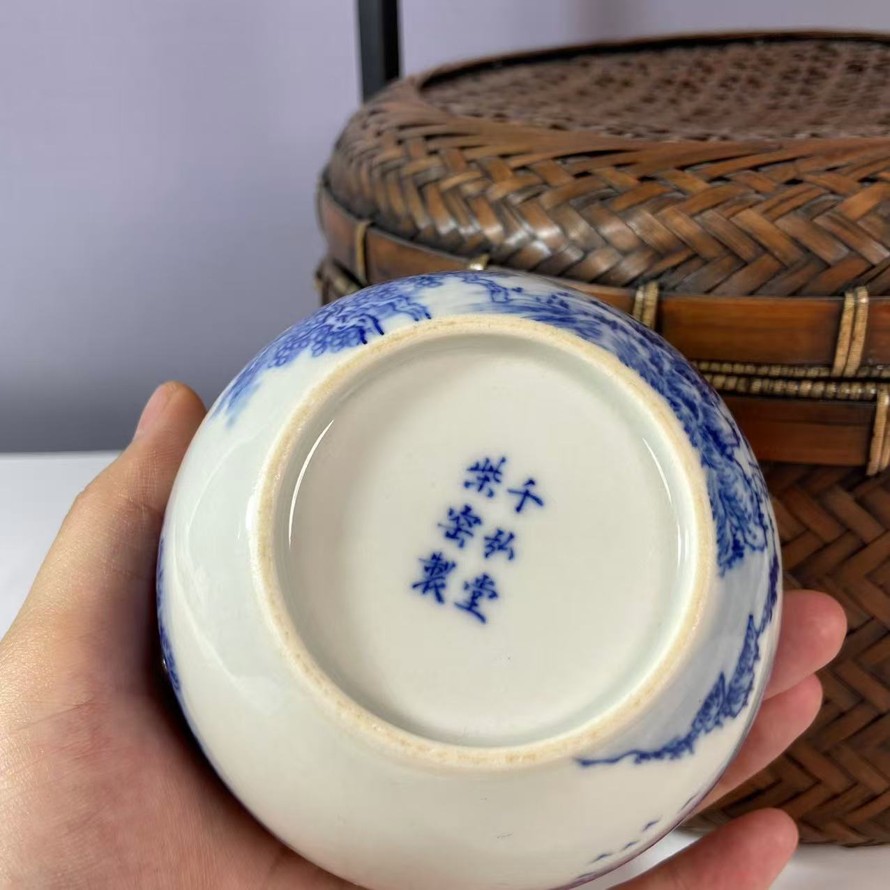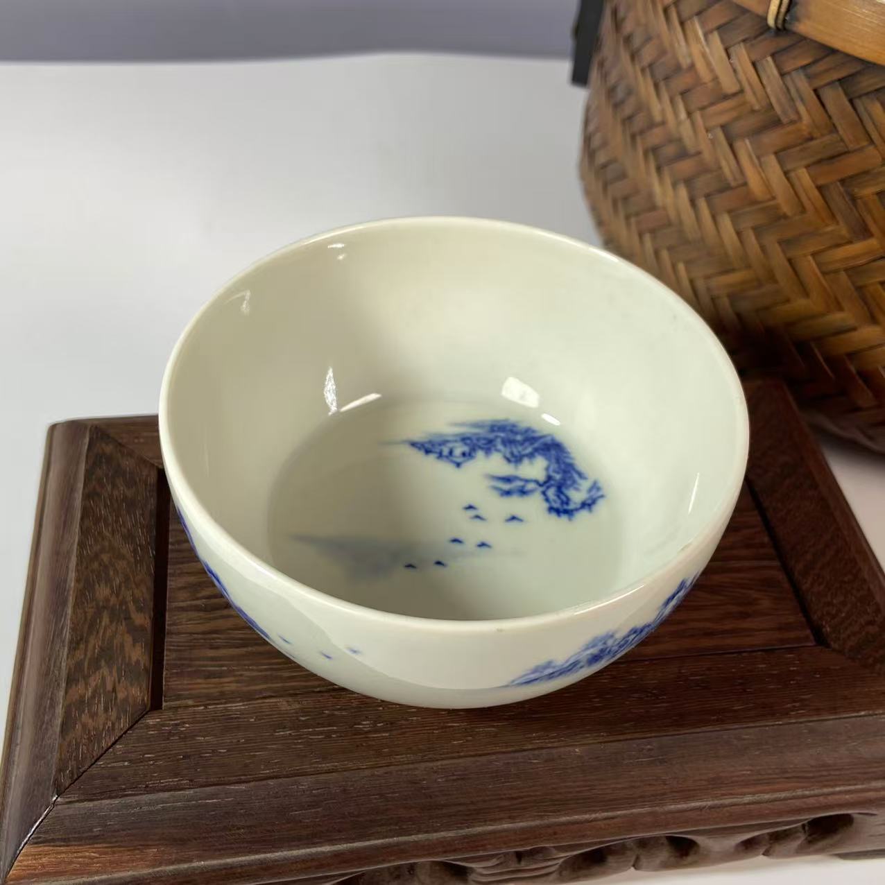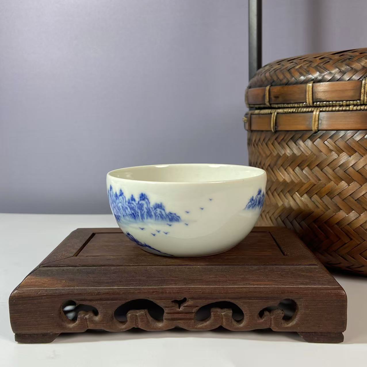 外观上,杯身莹白如玉,青花色泽清新雅致。画师凭借细腻笔触,将山峦的层叠、树木的葱郁、云雾的缥缈等山水元素生动呈现,画面布局精妙,层次丰富,把自然山水的灵秀意境巧妙融入杯体。