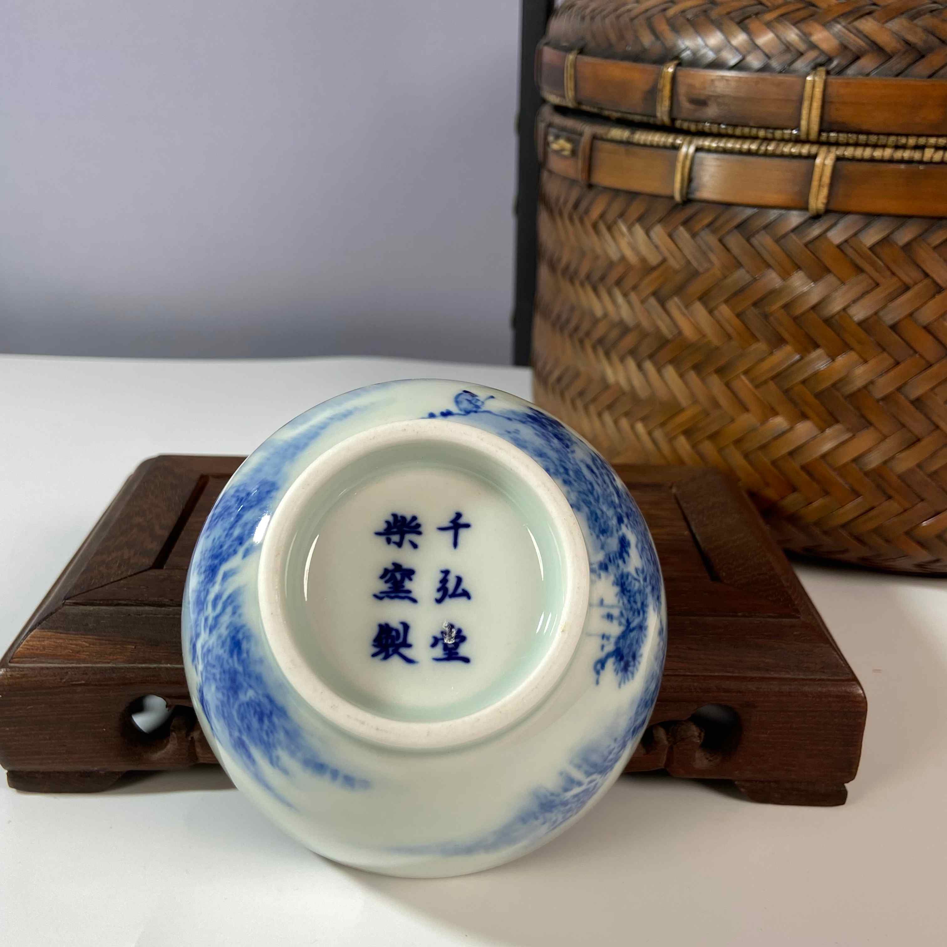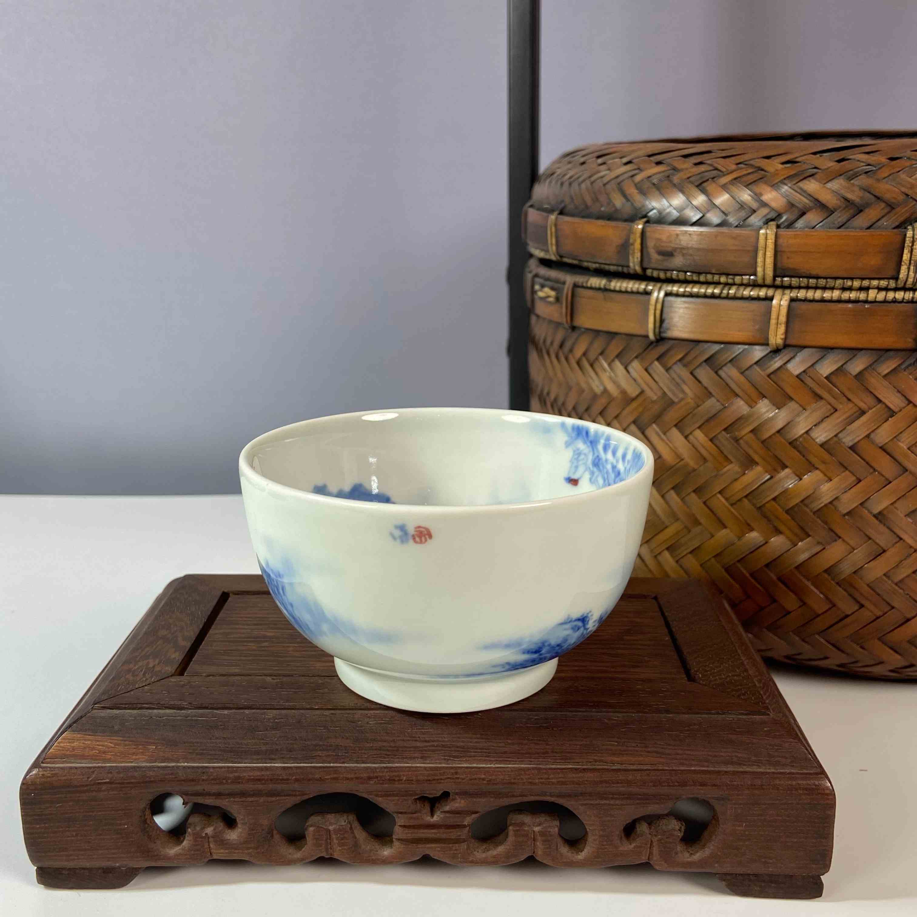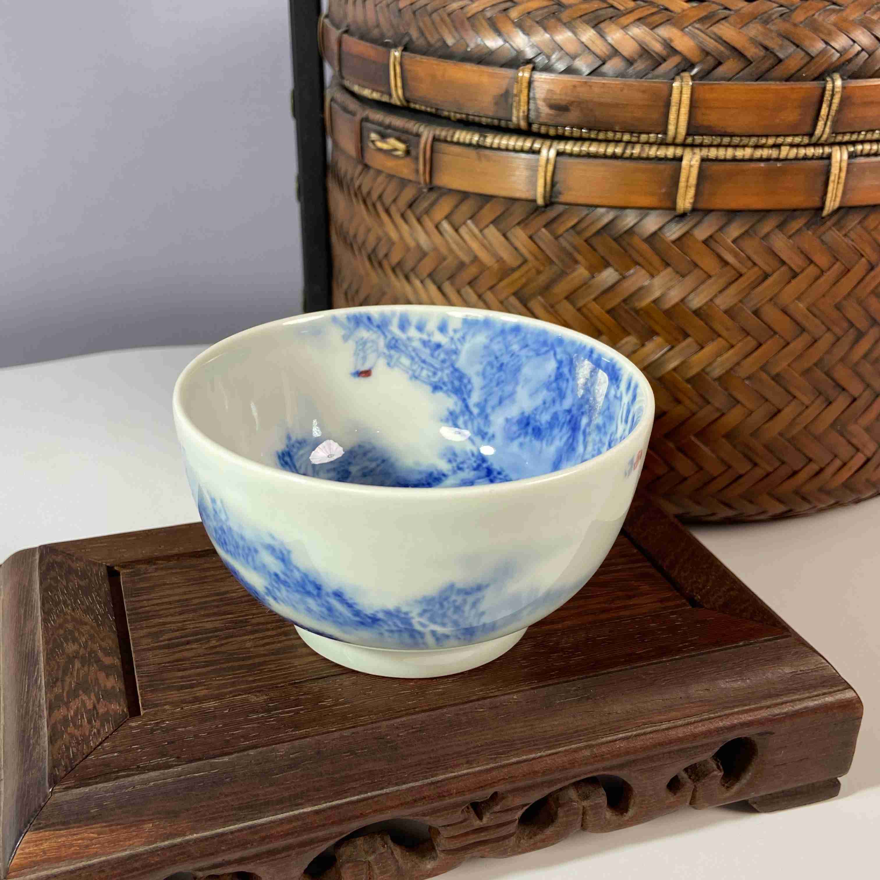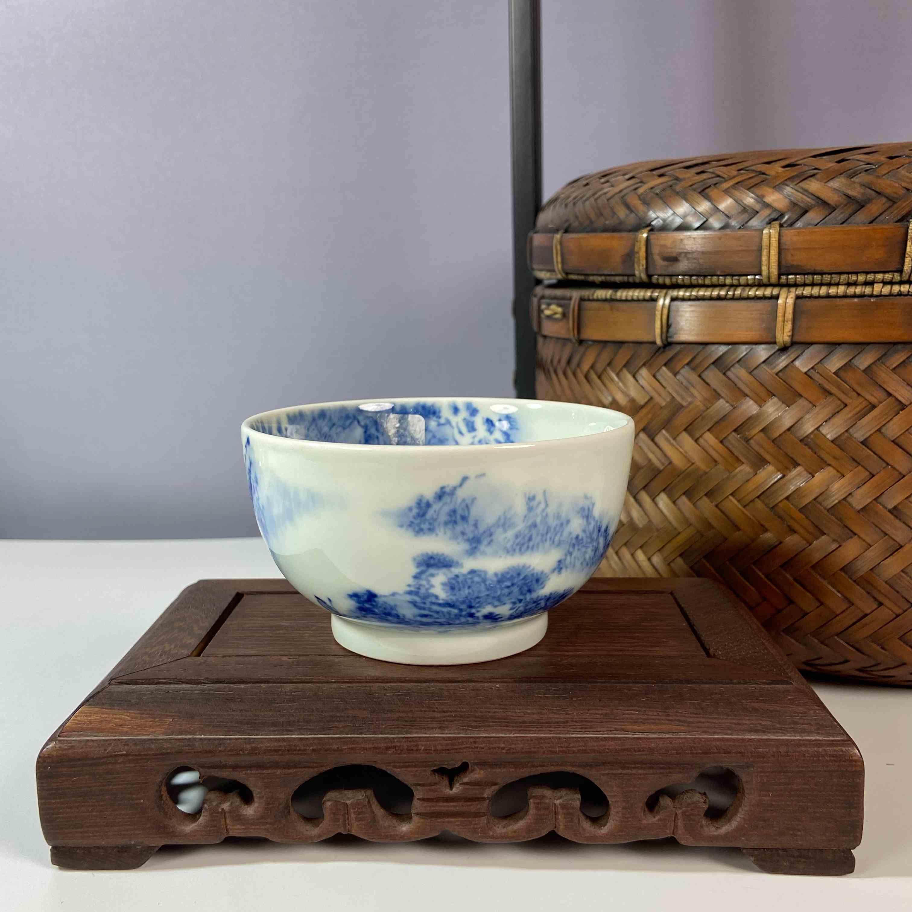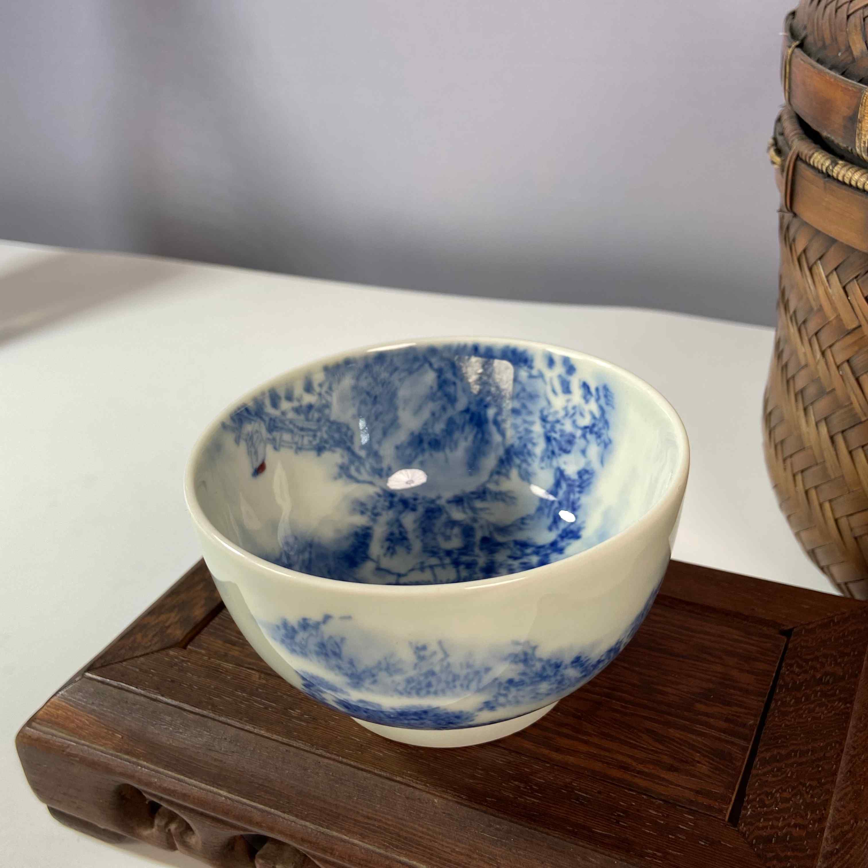 青花山水图案:采用传统的青花瓷工艺,以钴料在白瓷胎上绘制山水图案。杯身内外壁的青花山水图景层次丰富,描绘了山峦起伏、树木葱郁的景致,或有云雾缭绕其间,营造出悠远空灵的意境,仿佛将自然山水浓缩于小小的杯身之上 。青花发色淡雅,通过深浅不同的蓝色调,表现出山水的远近、高低,展现出画师较高的绘画技艺和对意境的把握能力。