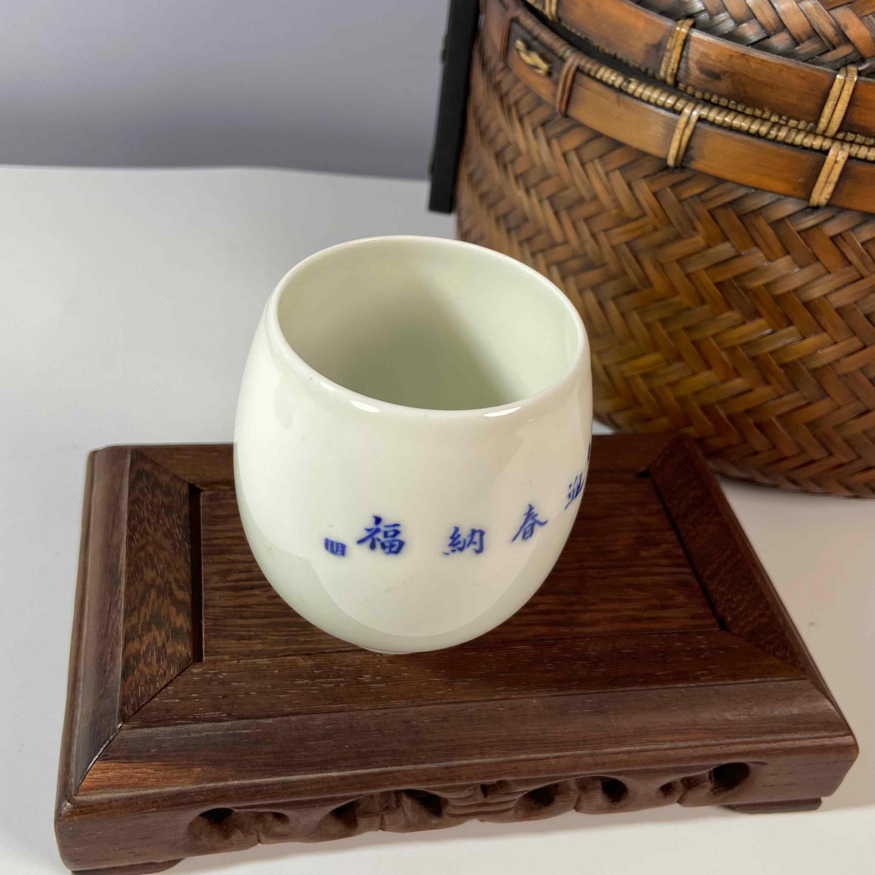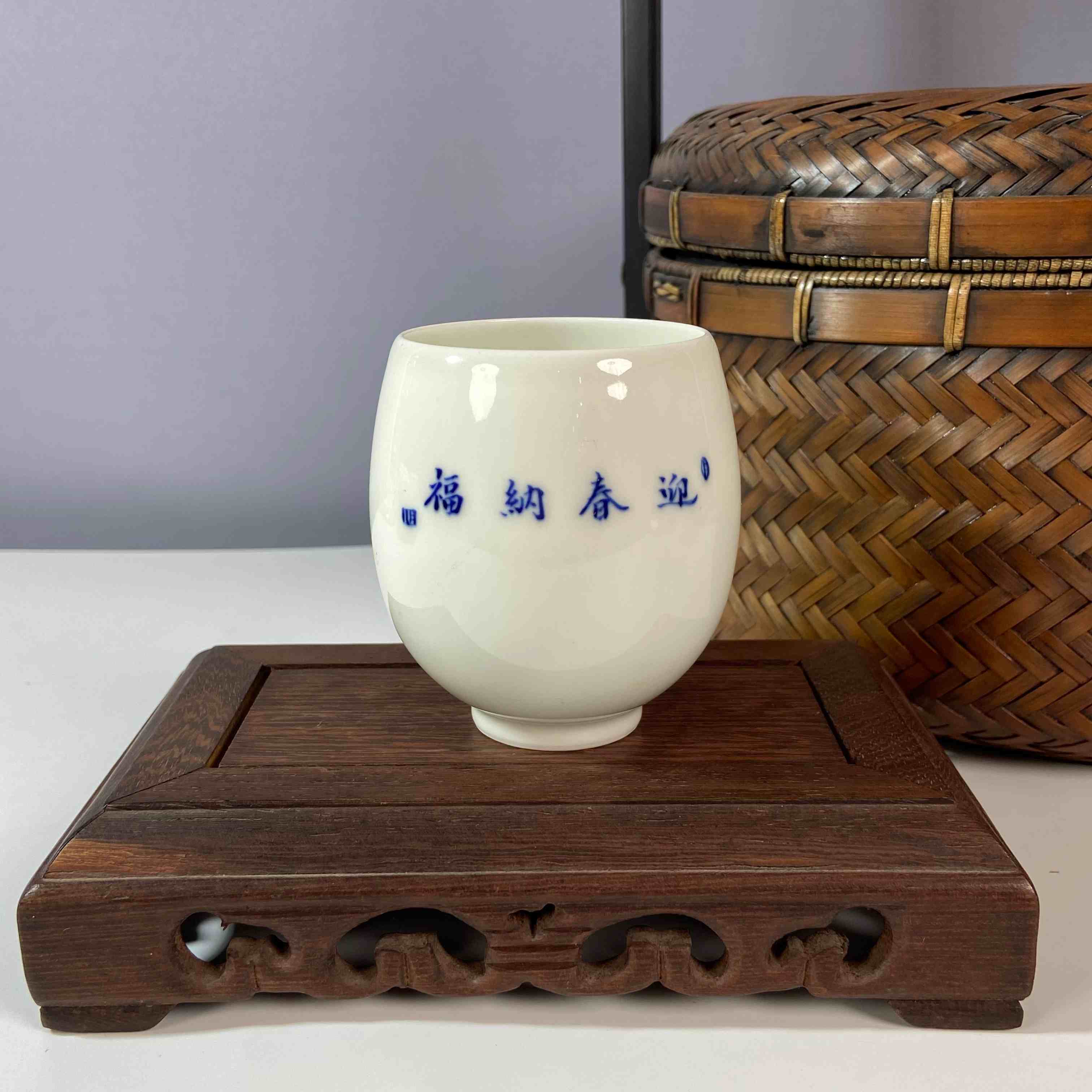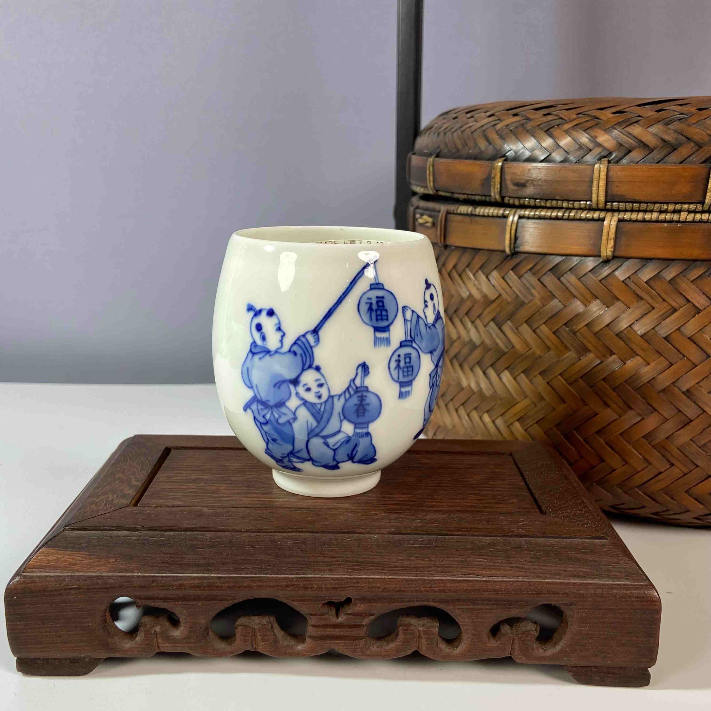 以白色瓷胎为底,用蓝色颜料进行绘制。杯子一面有 “迎春纳福” 字样,传递出迎接新春、祈愿福气的美好寓意。另一面绘有童子形象,童子们手持灯笼,灯笼上写有 “福” 字 ,童子嬉戏的场景生动活泼,富有童趣,也增添了喜庆、吉祥的氛围。