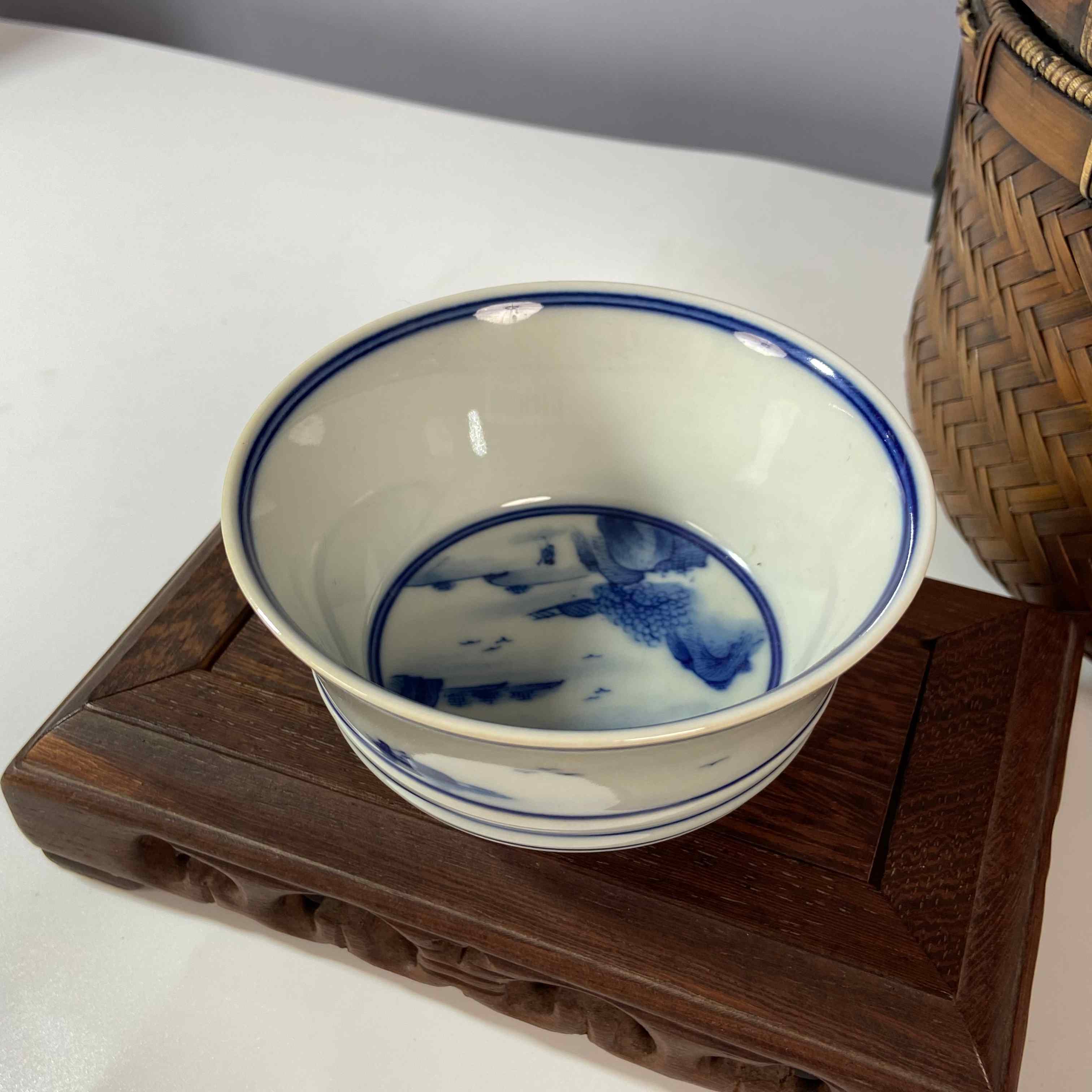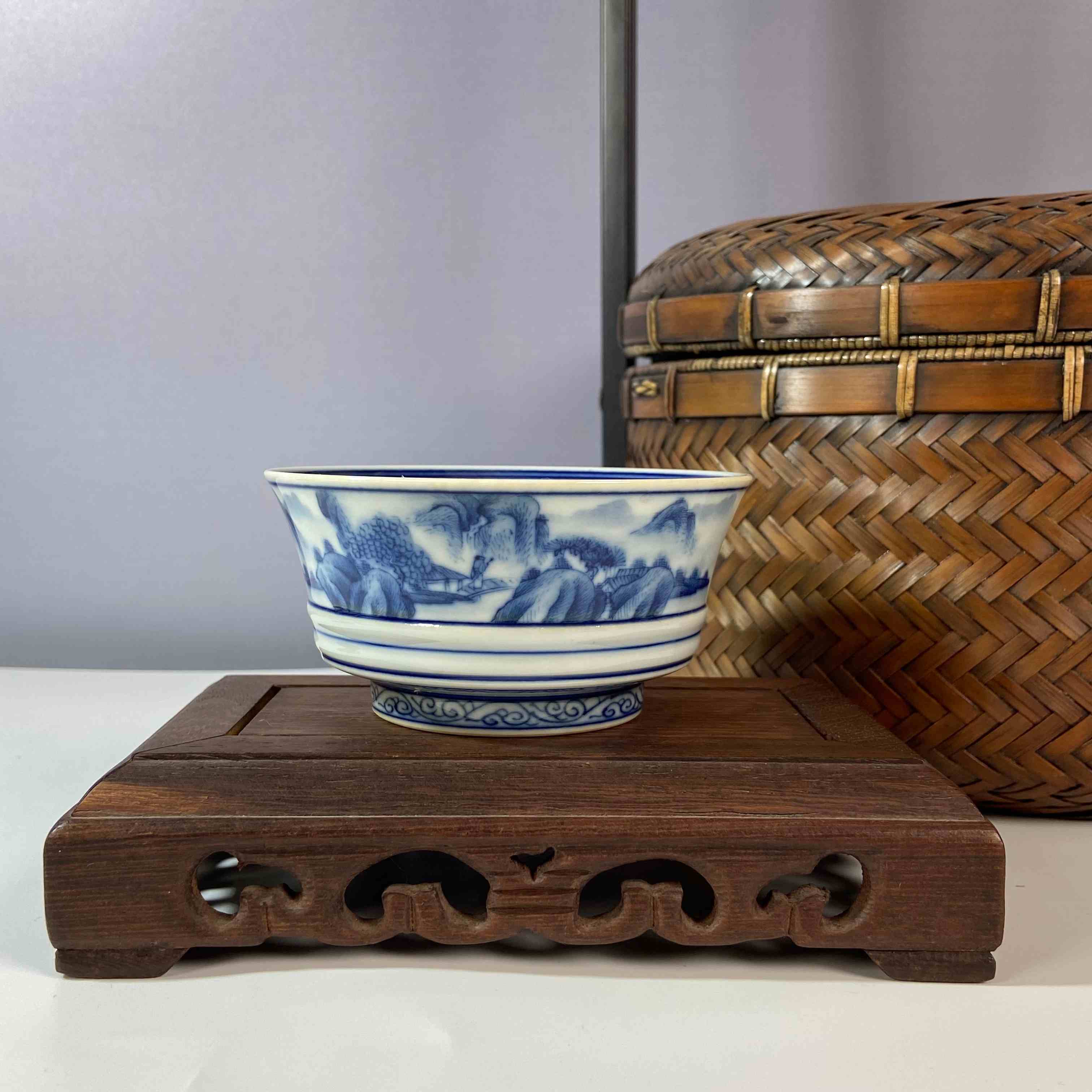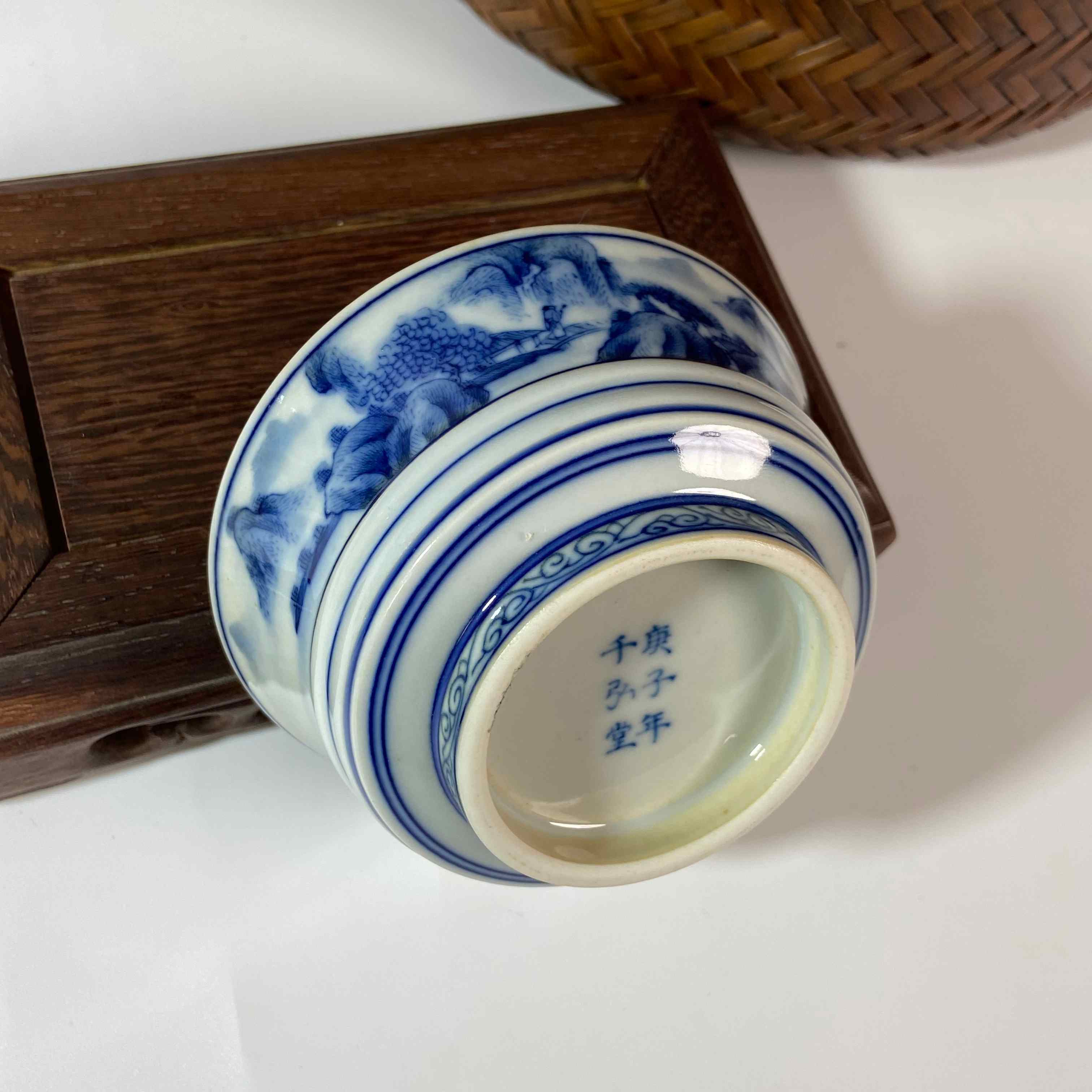 这只手绘山水杯是青花瓷制品,以白瓷为胎体,用蓝色钴料绘制图案。杯身外壁绘有山水图景,山峦起伏、树木葱郁,展现出自然山水的秀丽风光,笔触细腻,青花发色沉稳 ,给人一种宁静悠远的美感。