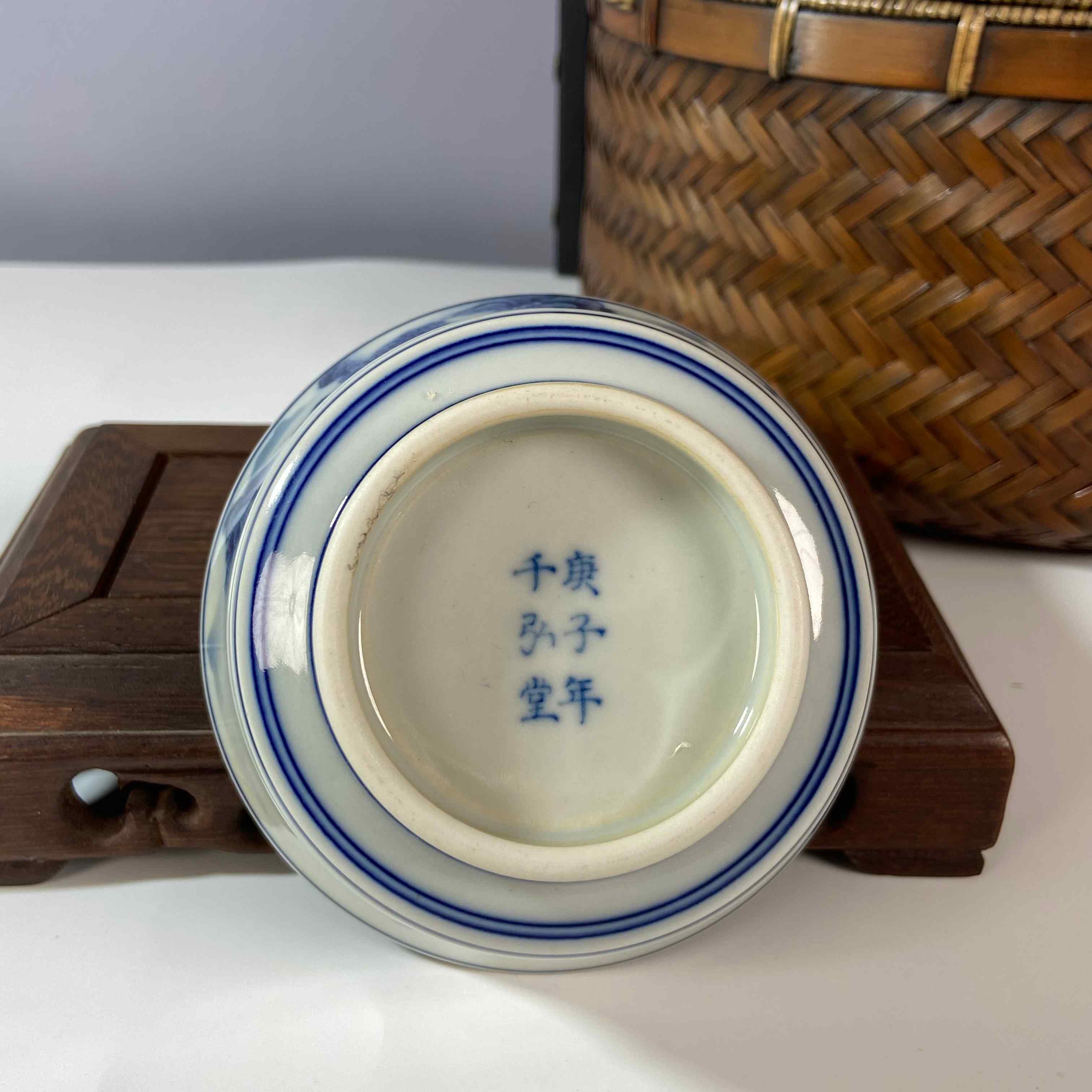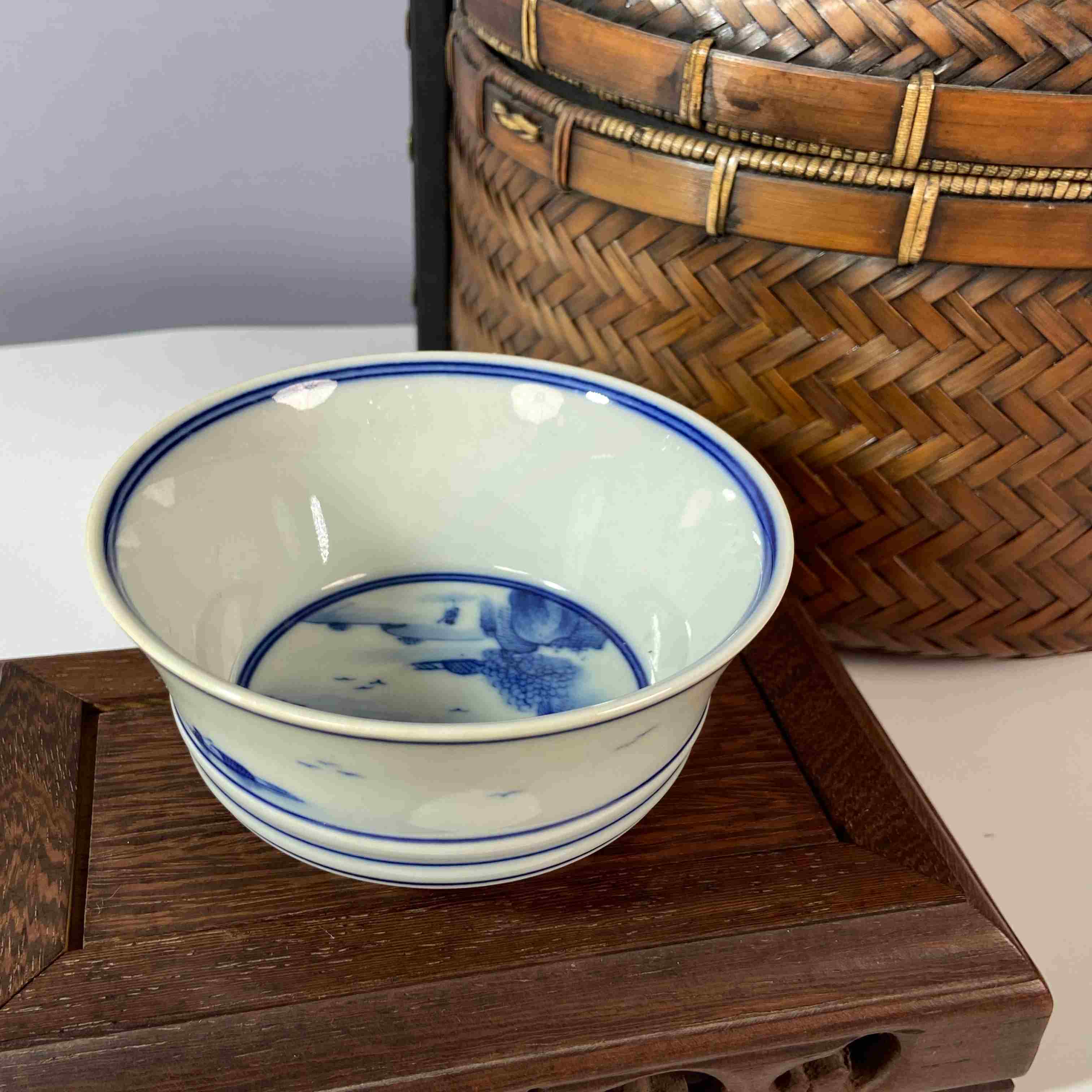 杯身上有多道蓝色弦纹装饰,增加了层次感和韵律感。整体造型端庄,敞口、深腹、圈足,适合用作品茗杯,能为品茶增添一份雅致的氛围,体现了传统瓷器工艺之美与深厚的文化底蕴。