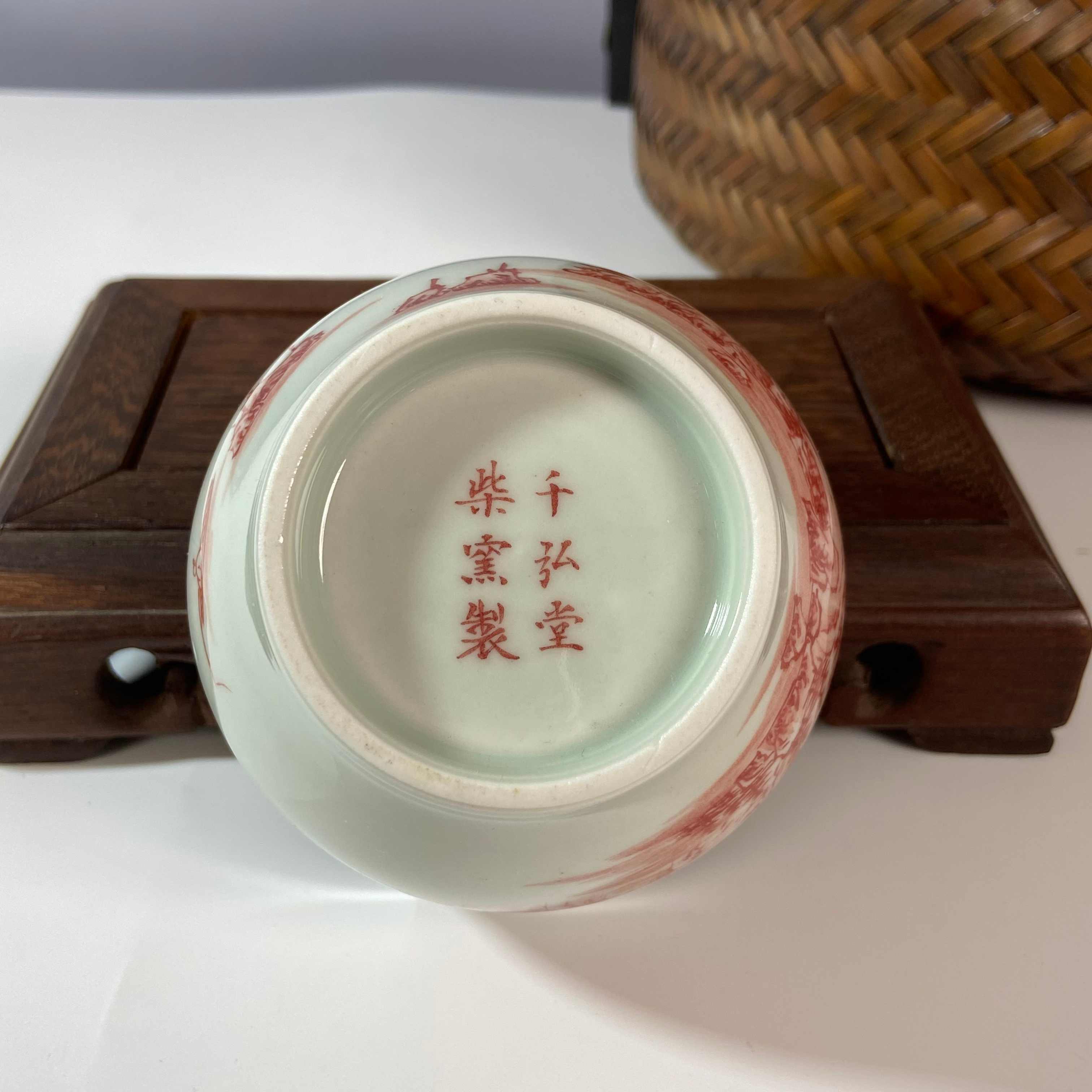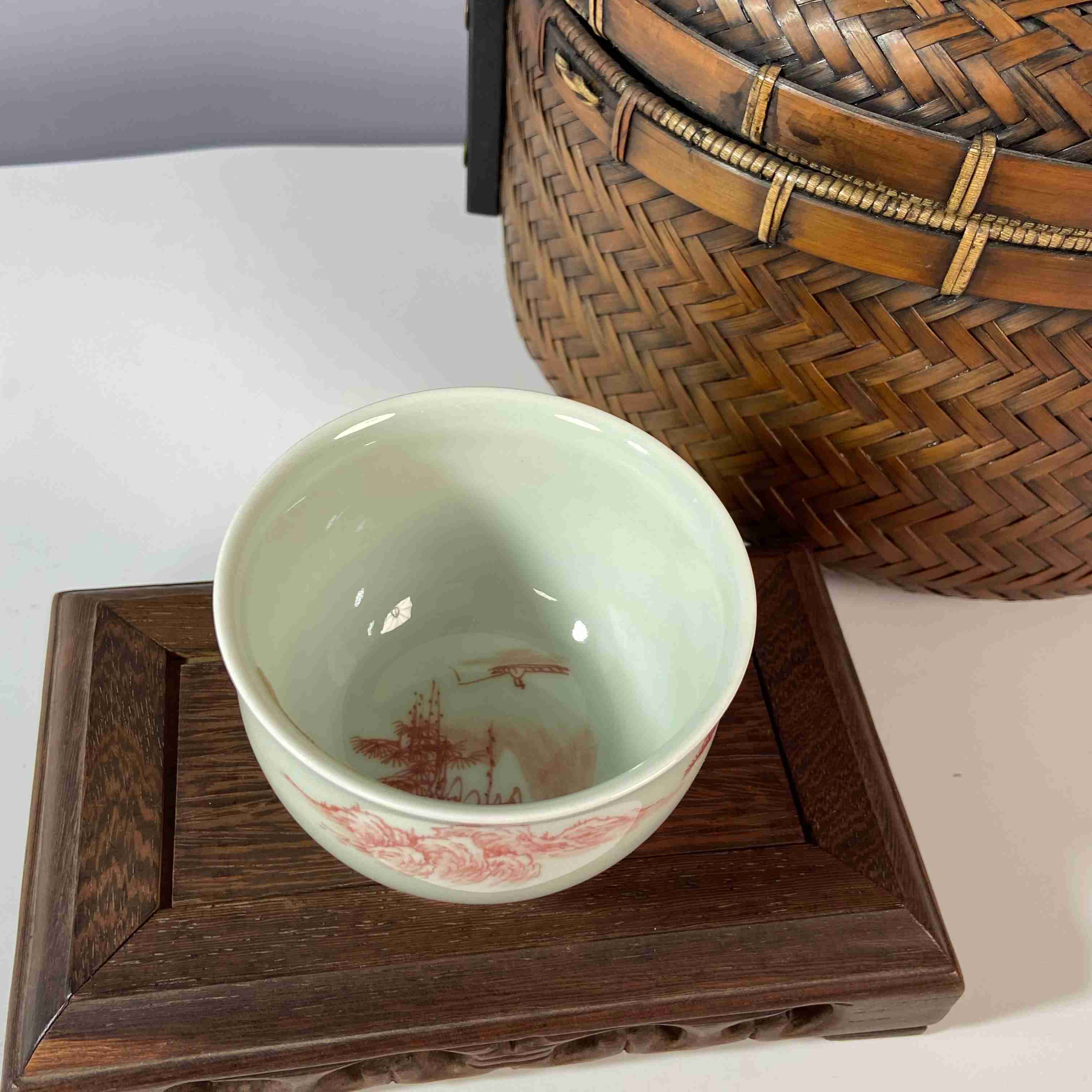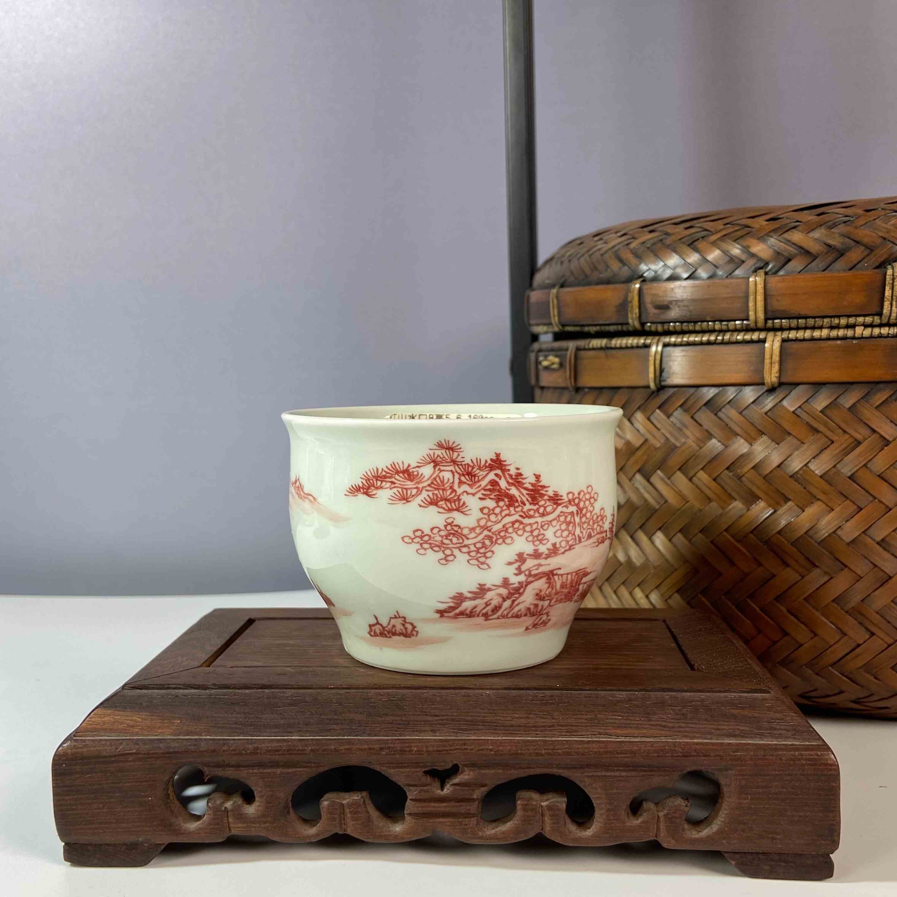 杯身绘制的山水图案独具韵味,以红色调展现出山峦的起伏、树木的繁茂 ,比如有挺拔的松树、层叠的山峦,有的杯内还绘制有飞鸟等元素,为画面增添灵动之感。红色的深浅变化营造出一定的层次感和立体感,虽不同于青花瓷的清新淡雅,却有着别样的热烈与古朴,呈现出中国传统山水画的意境,给人以视觉上的独特享受。