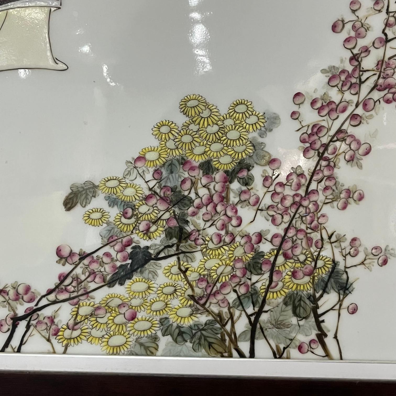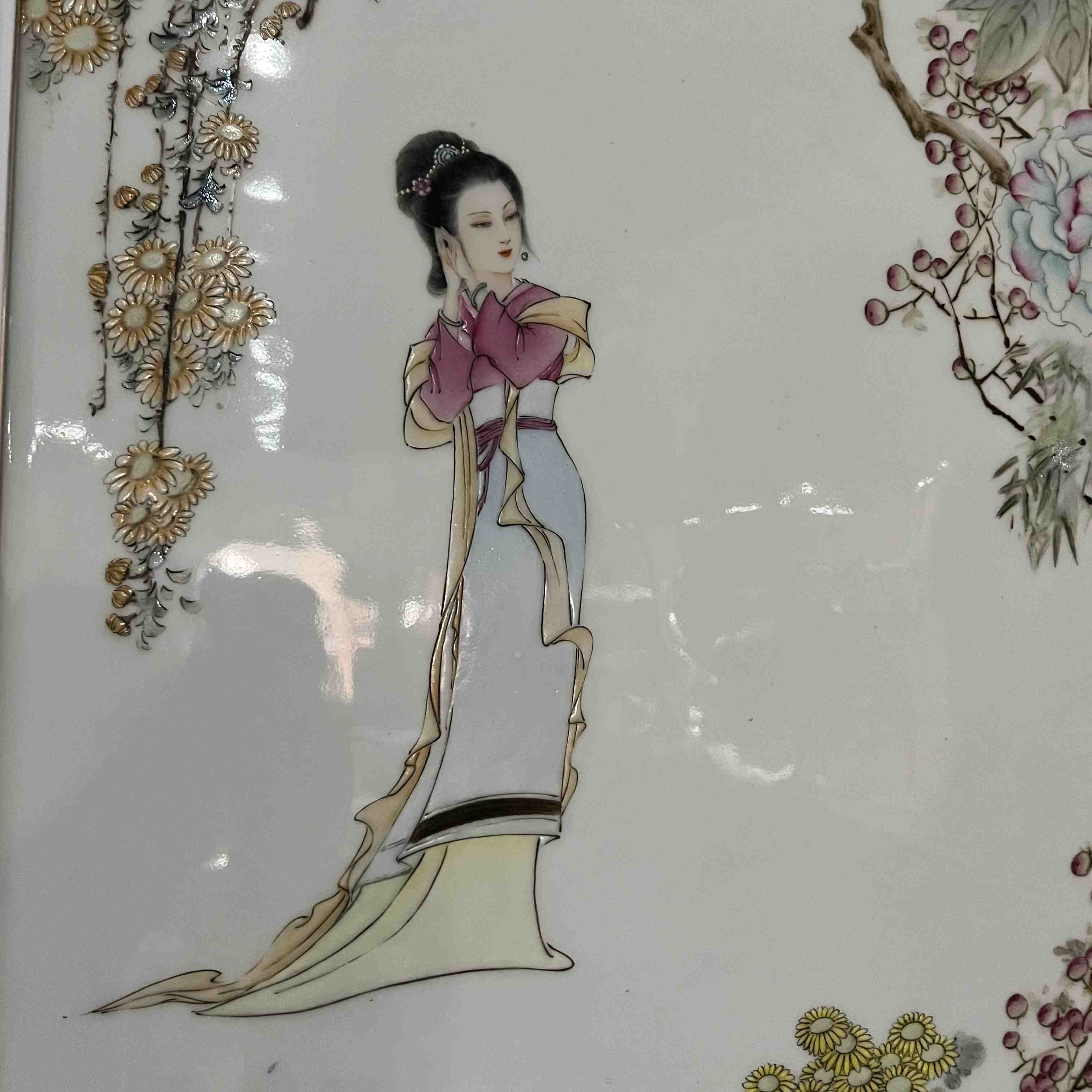 瓷板画以细腻的笔触勾勒出人物与植物的形态,色彩运用上较为柔和,花卉的颜色过渡自然,仕女服饰的色彩搭配和谐,展现出较高的绘制工艺水平,可能是采用了粉彩等传统瓷绘工艺 。