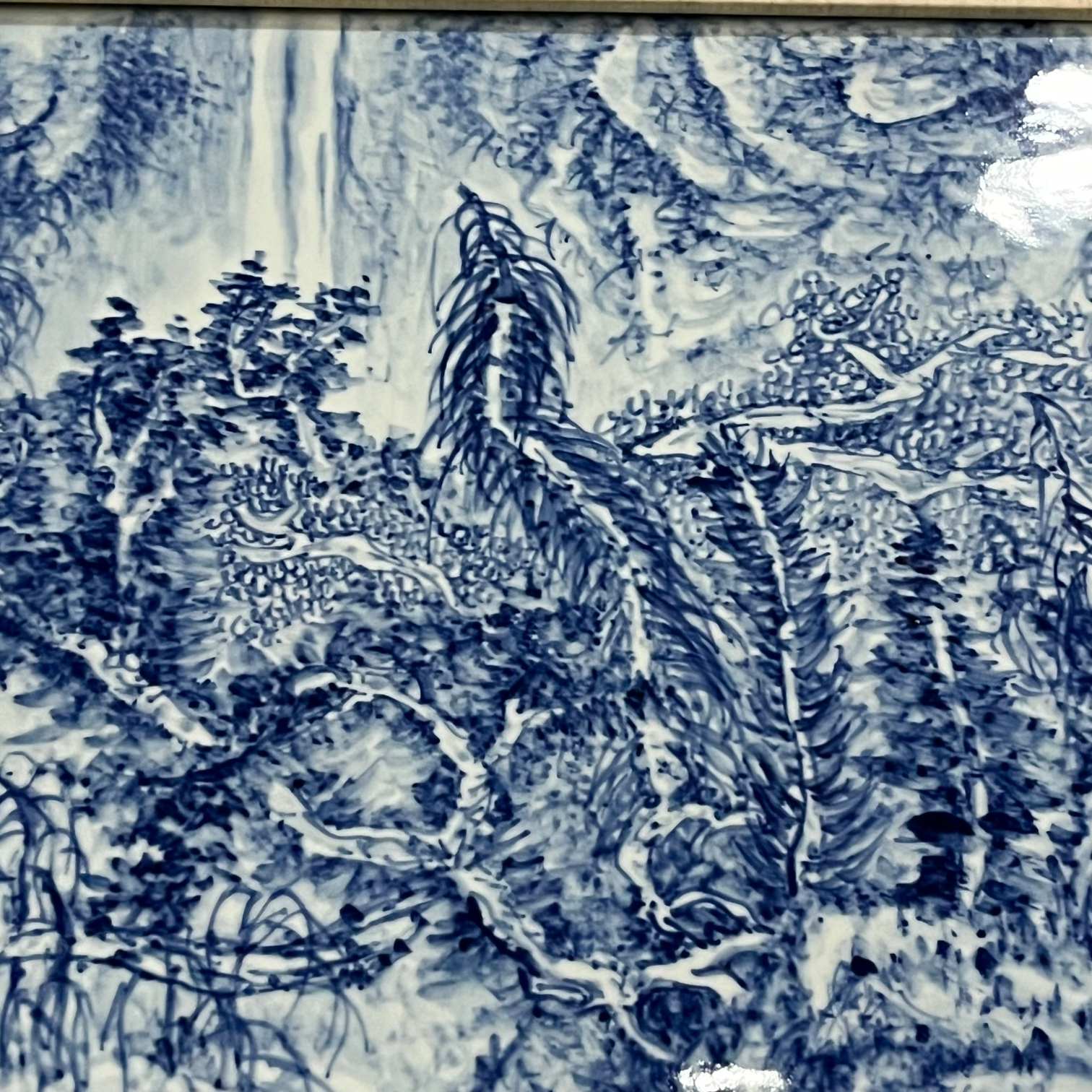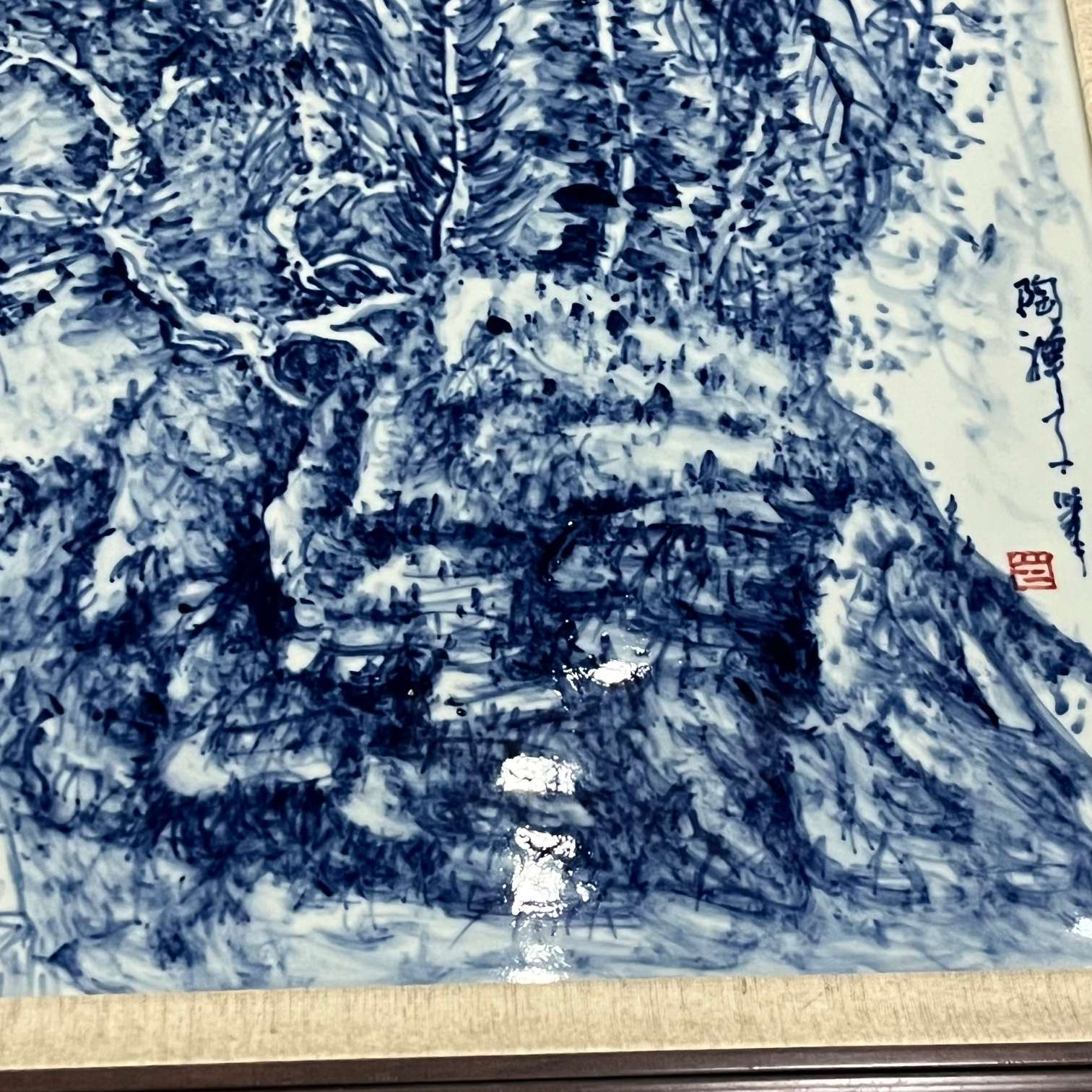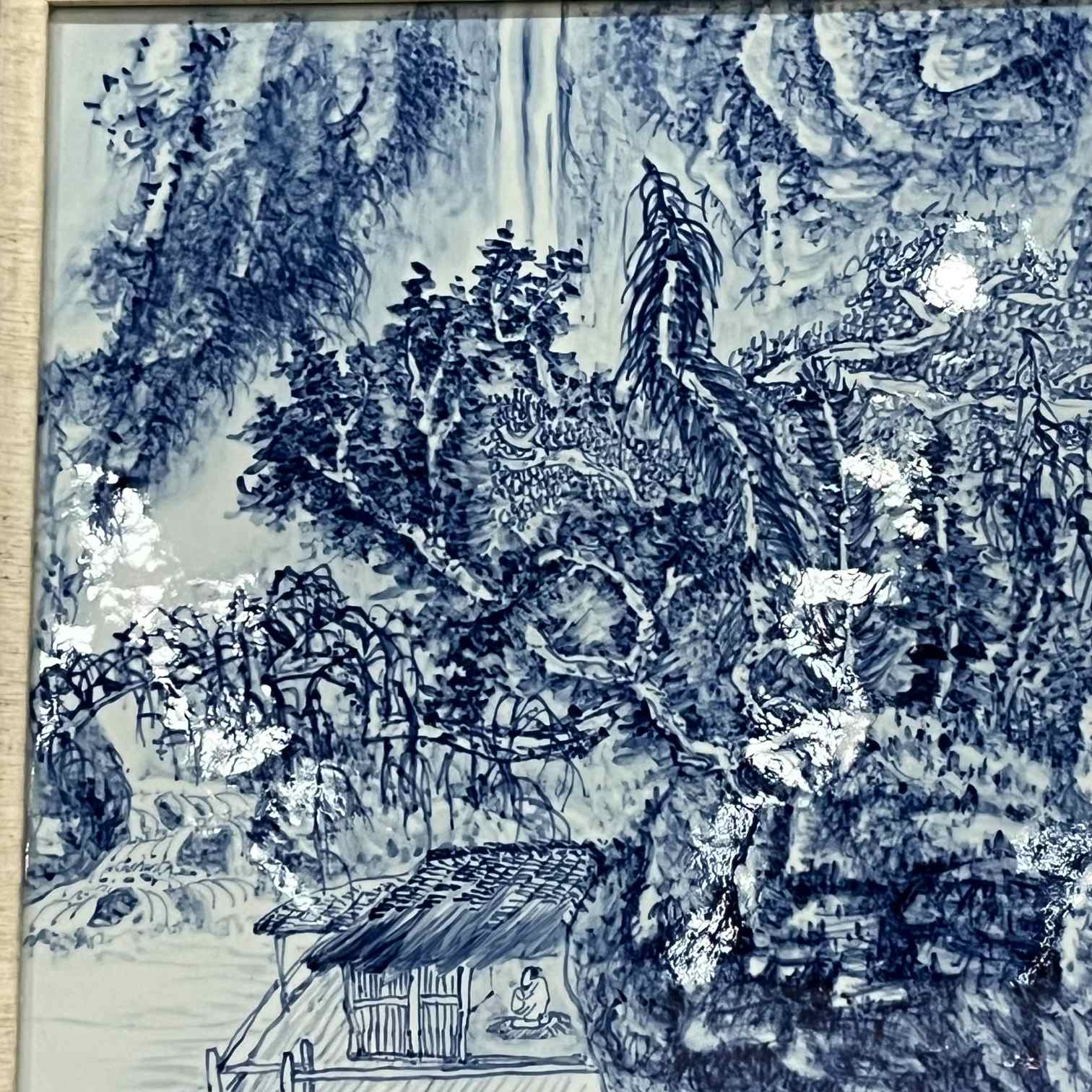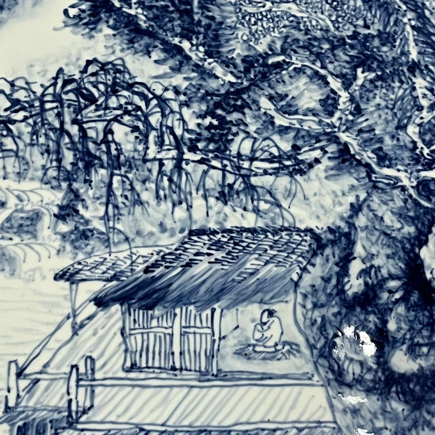 采用青花工艺绘制。青花以氧化钴为着色剂,在瓷胎上描绘图案,然后罩上透明釉,经高温烧制而成。画面中蓝色的浓淡变化,通过钴料的浓淡和绘画时的笔触来实现,展现出青花独特的艺术效果。