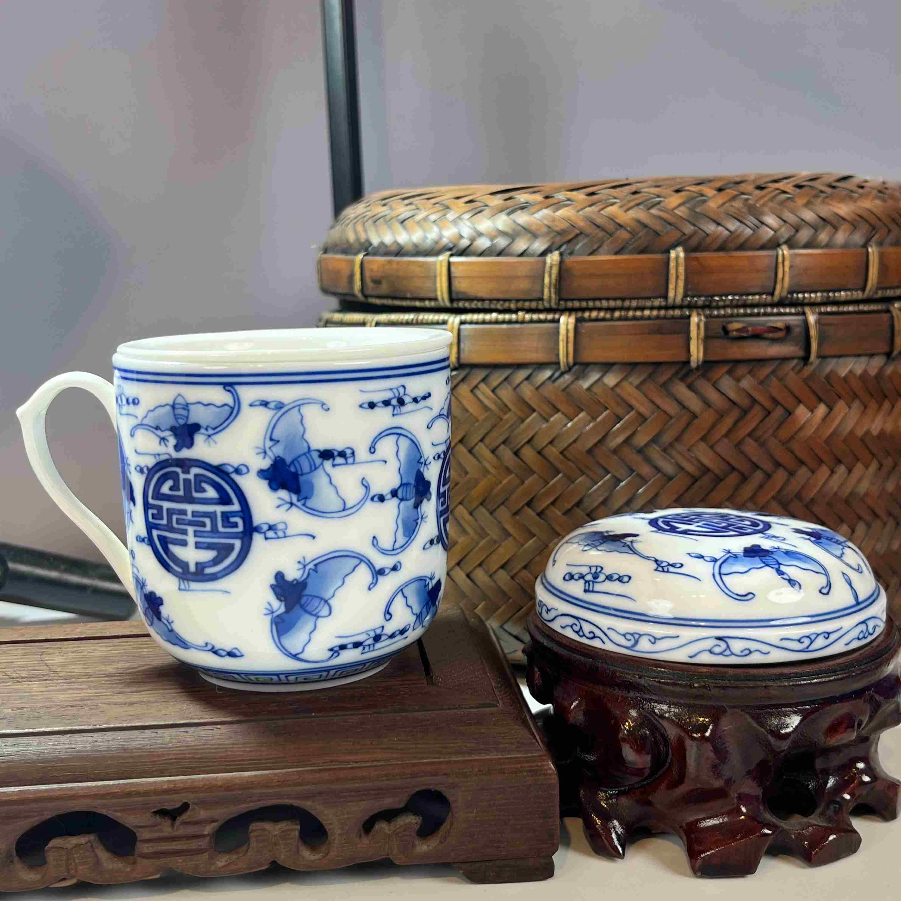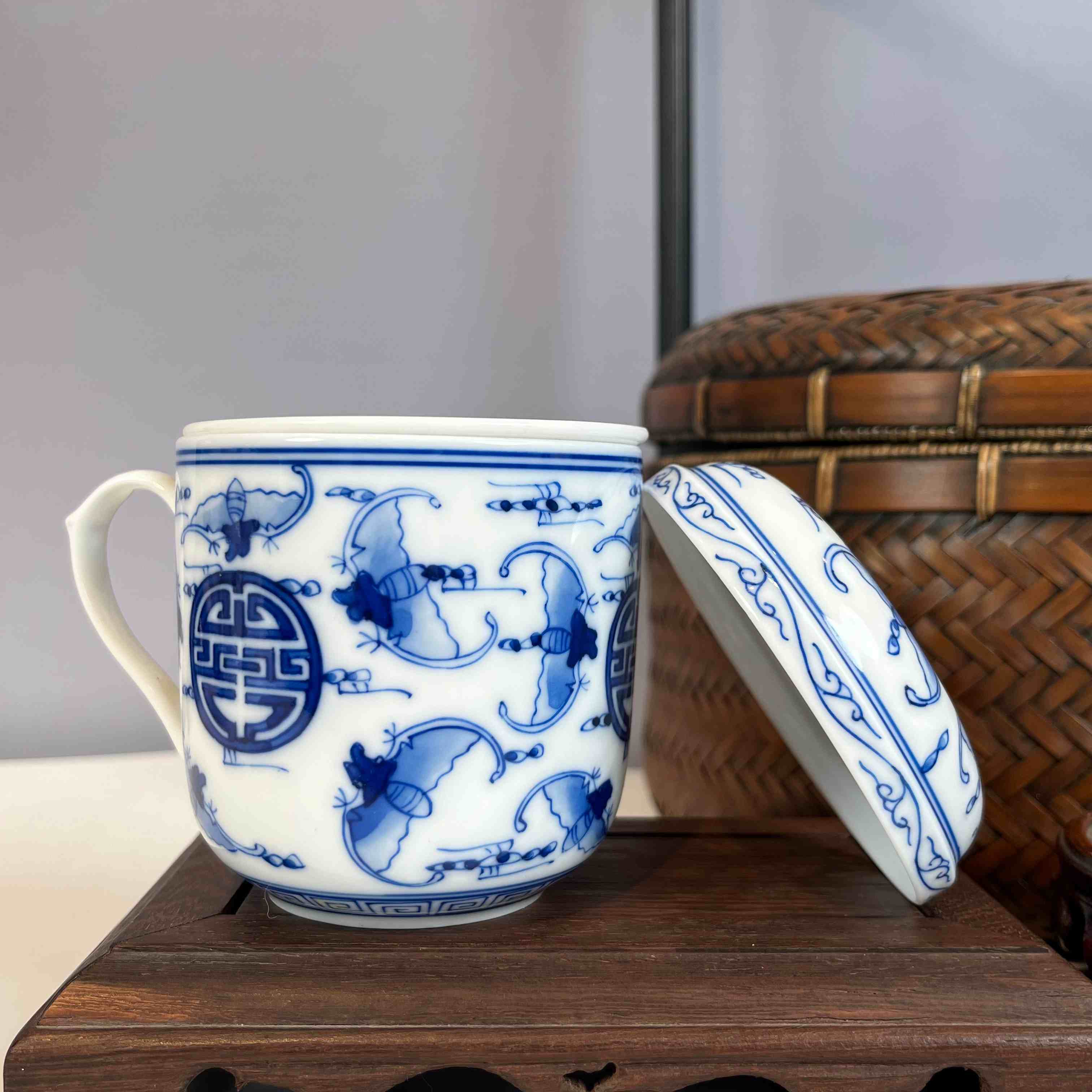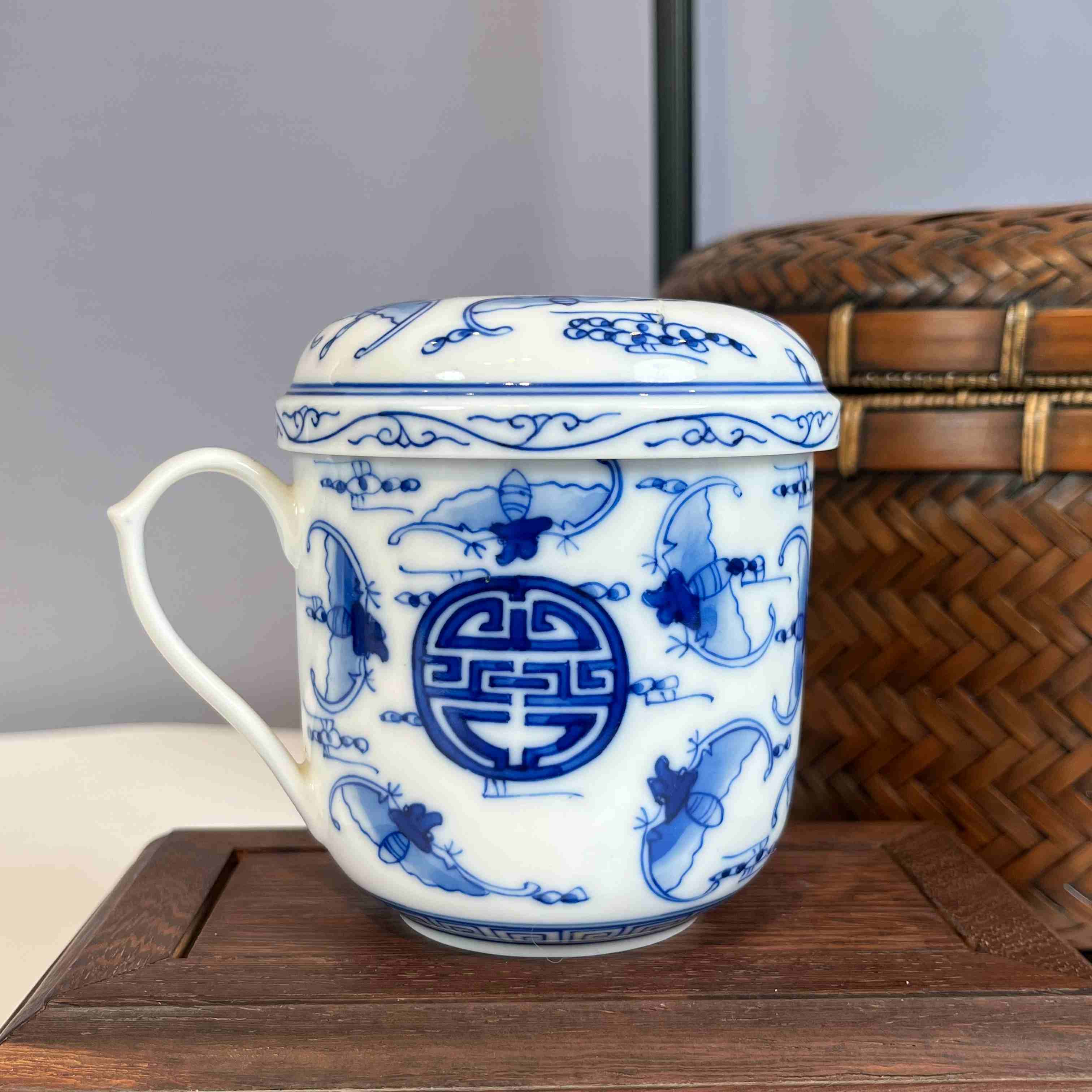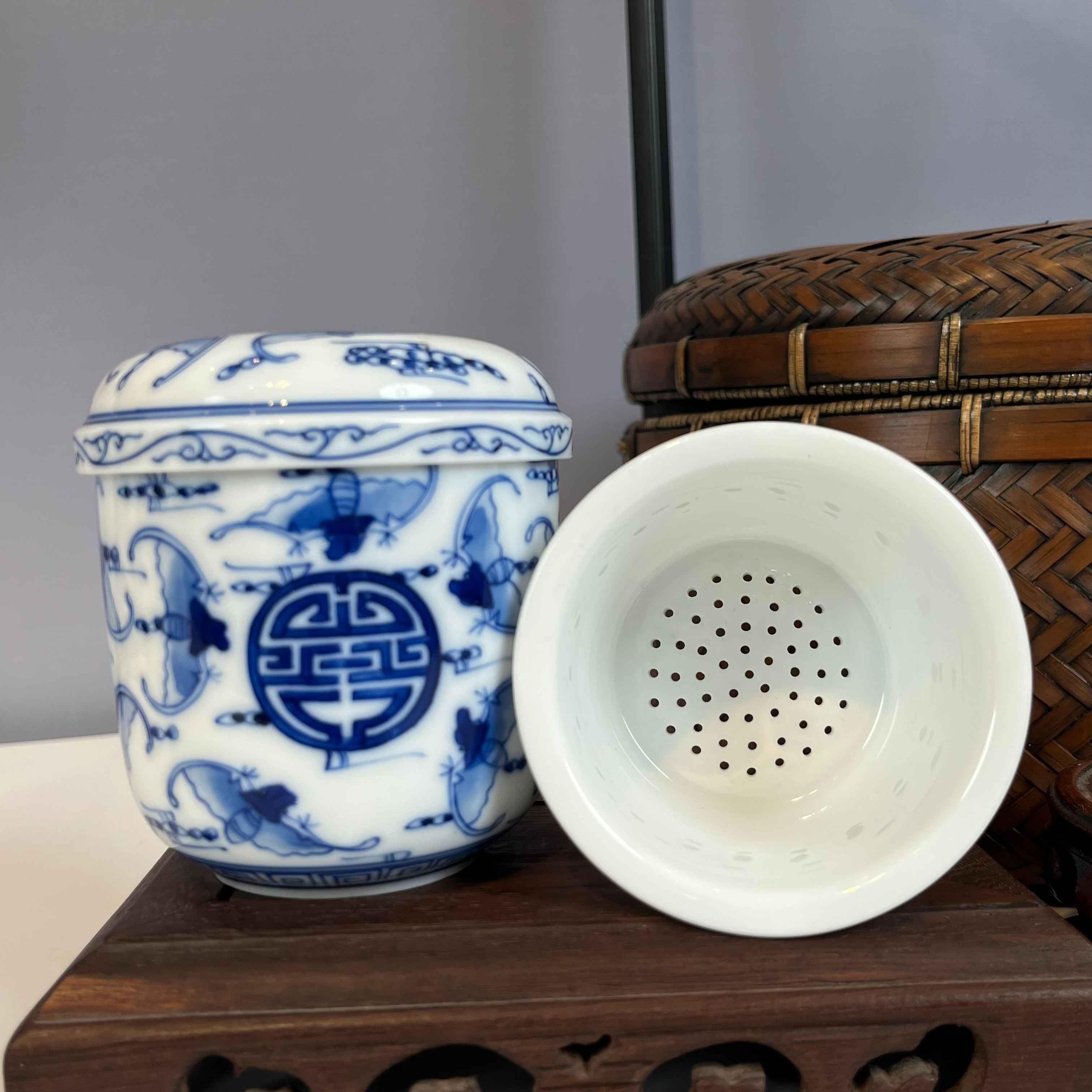 带有茶漏,能方便地过滤茶叶,让喝茶时口感更纯粹。杯身的图案,像图里的蝙蝠和寿字纹组合,在传统文化里寓意着 “福寿双全”,很有吉祥美好的寓意。无论是自己日常办公使用,享受泡茶的惬意时光,还是作为礼品赠送,都很合适,既实用又能传递美好的祝福。