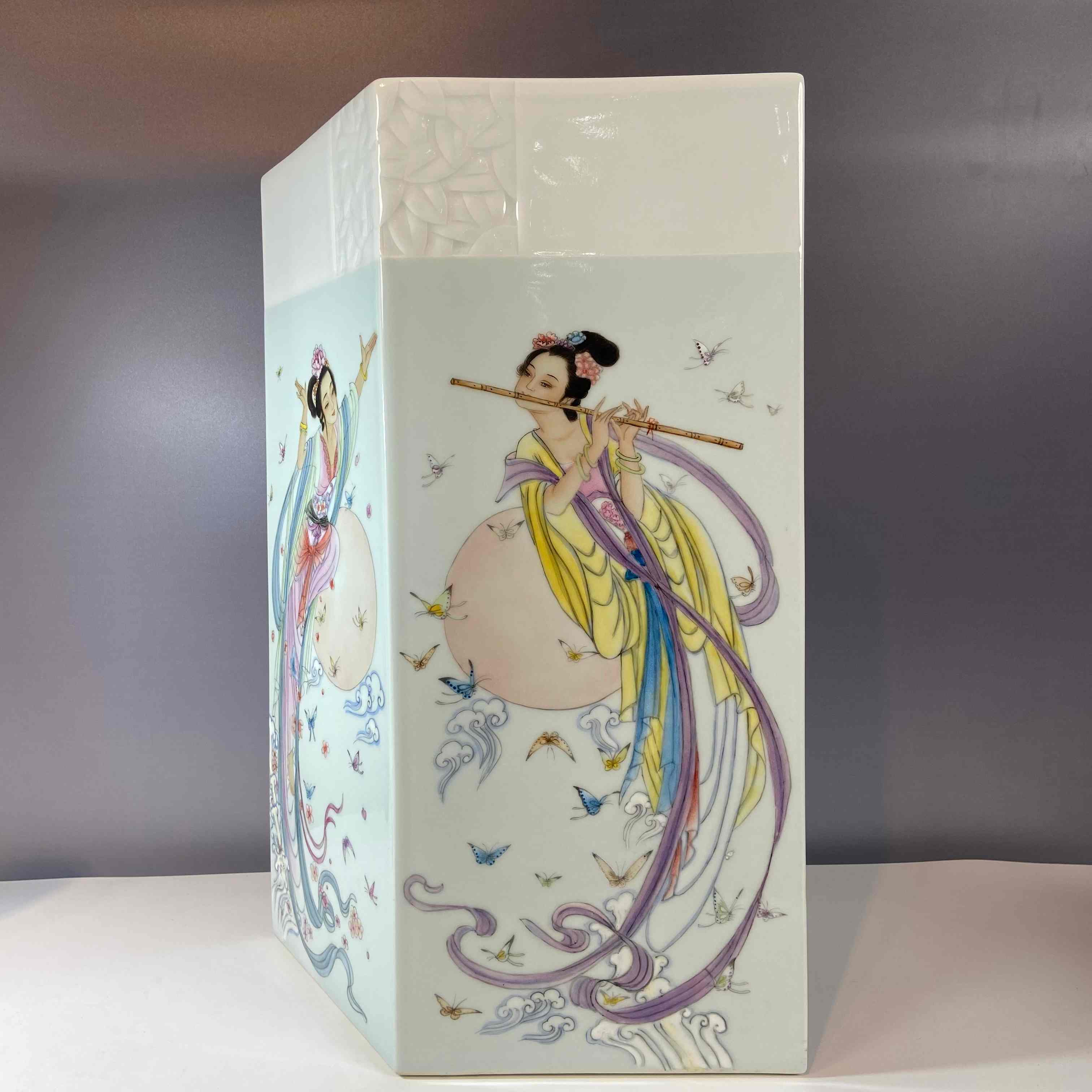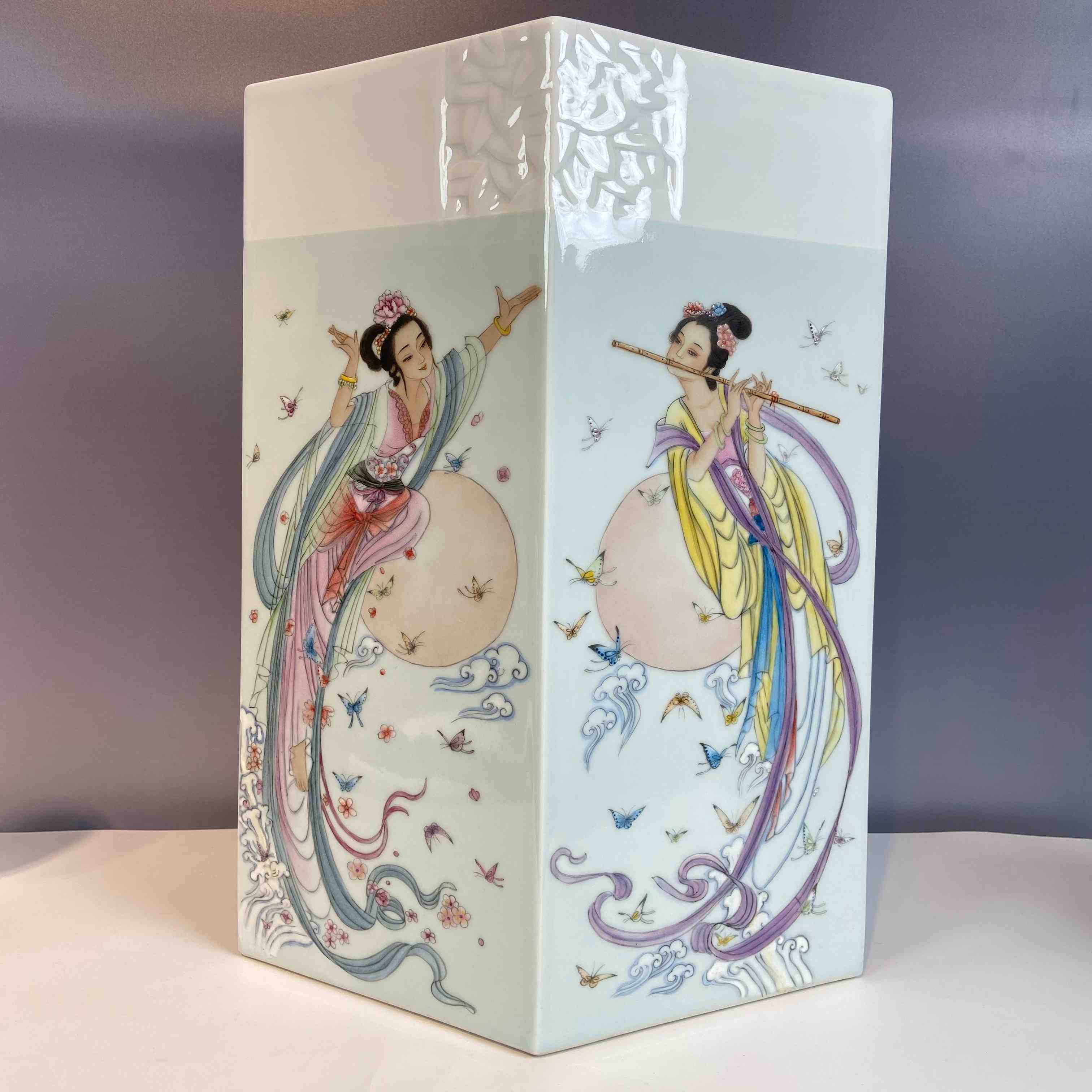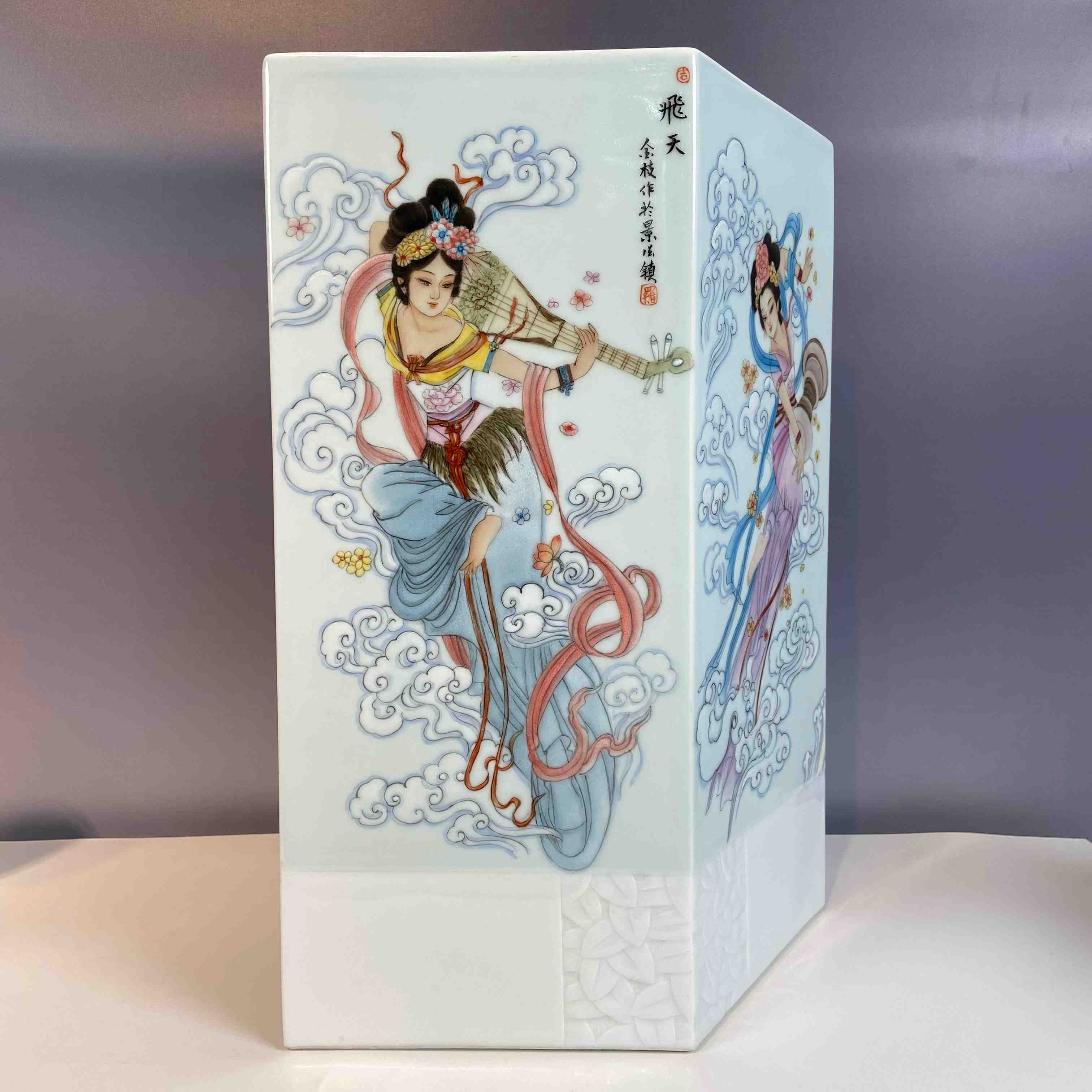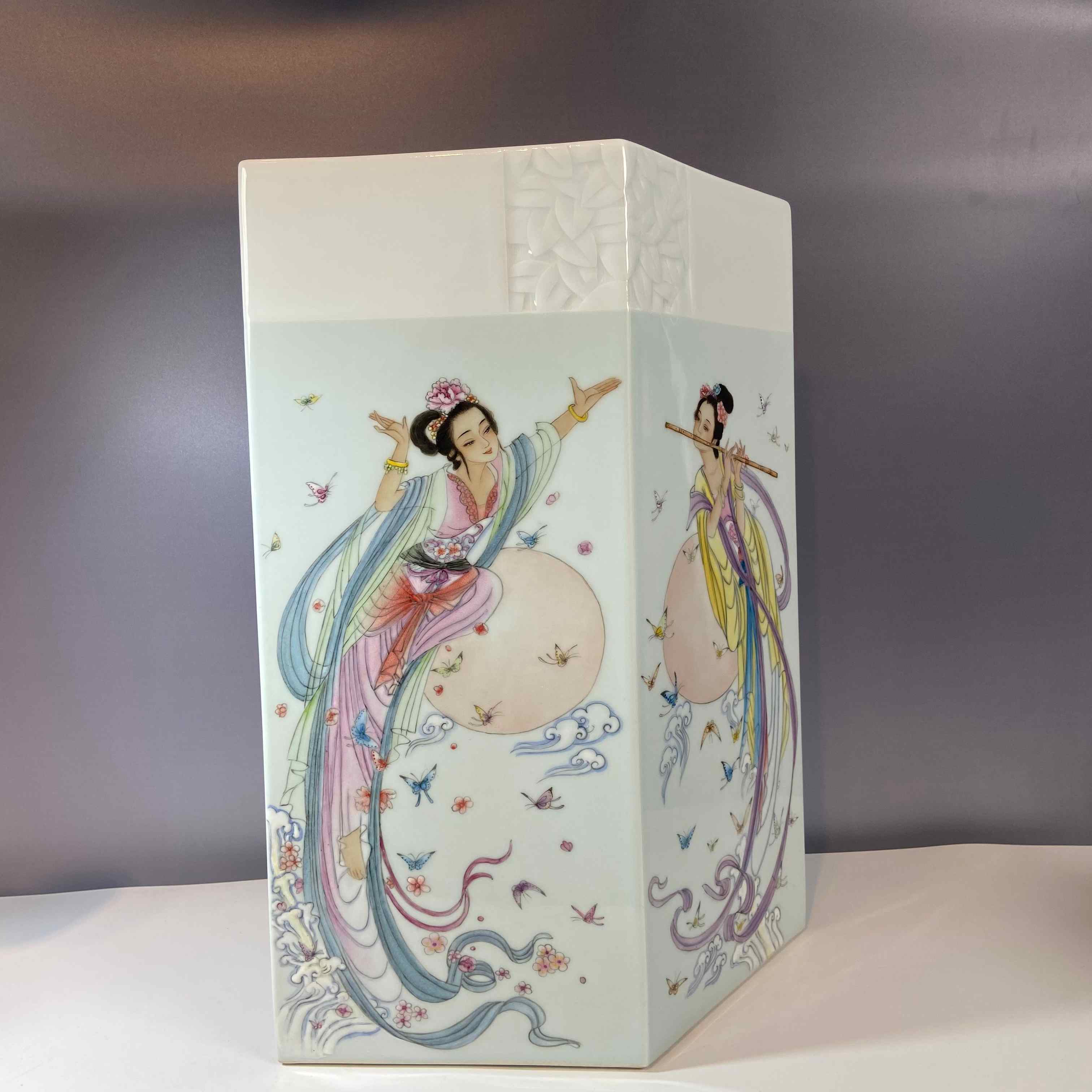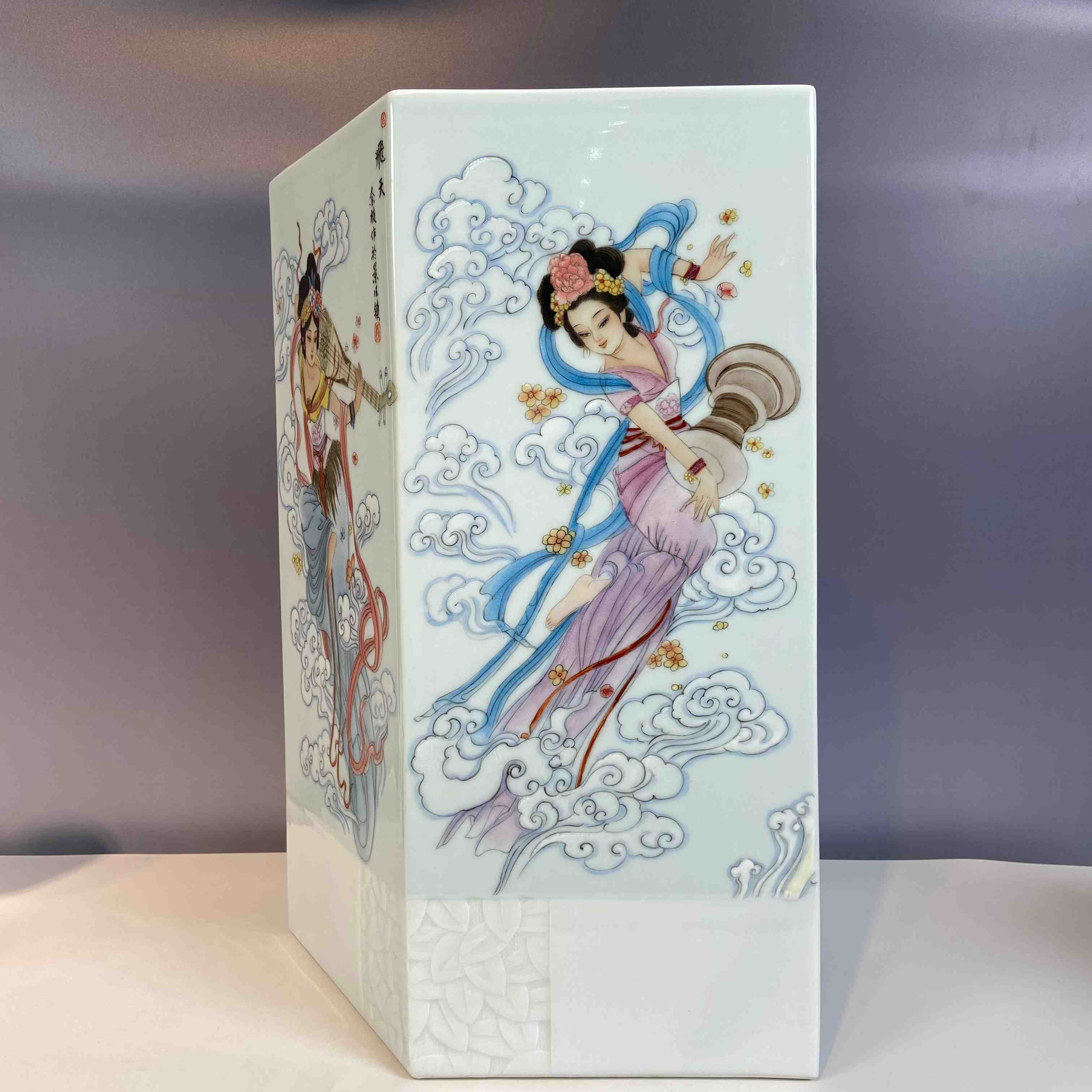 这款镶器是手绘人物纹方瓶,属于陶瓷工艺品。它的瓶身呈方形,这种造型在陶瓷中比较独特,制作工艺要求较高。