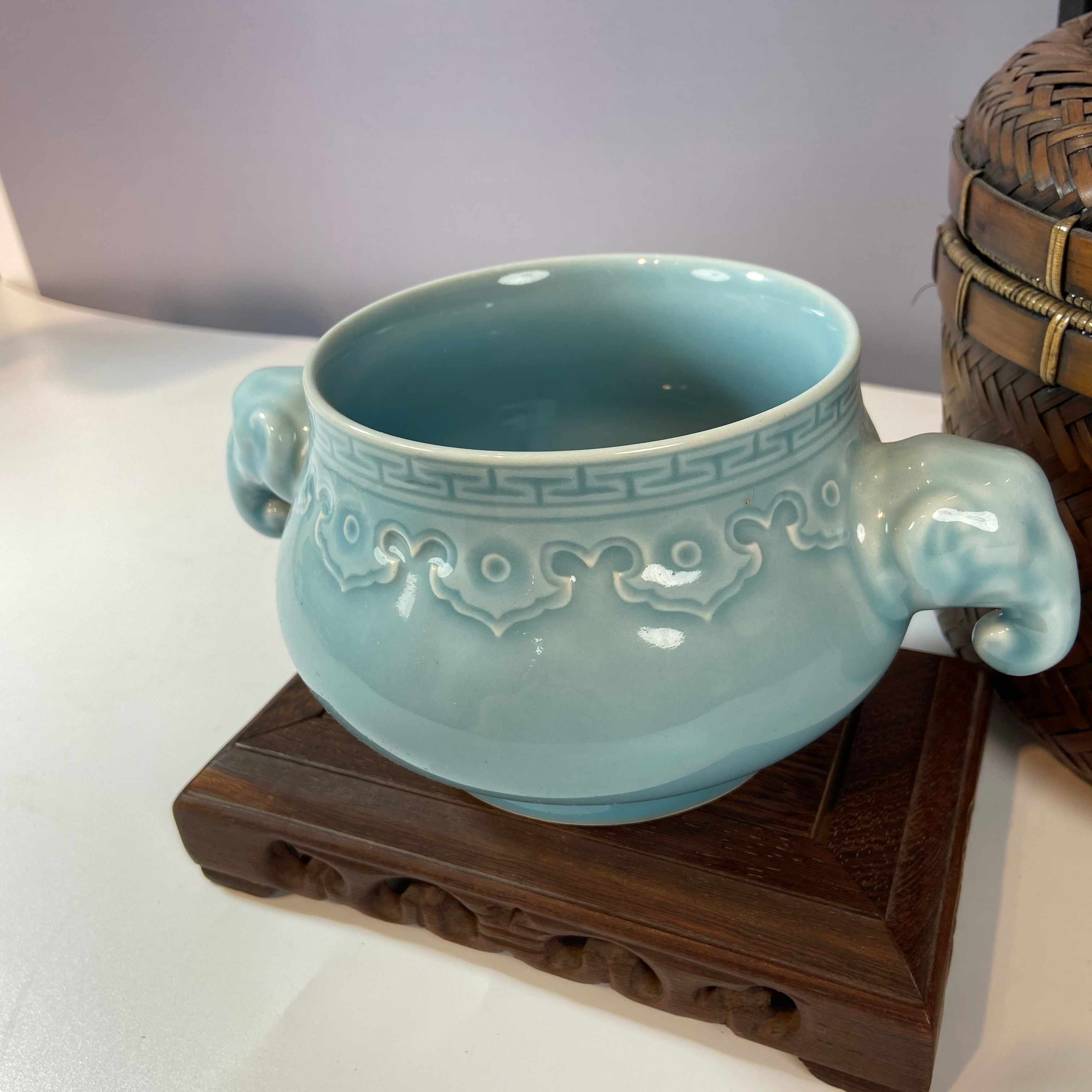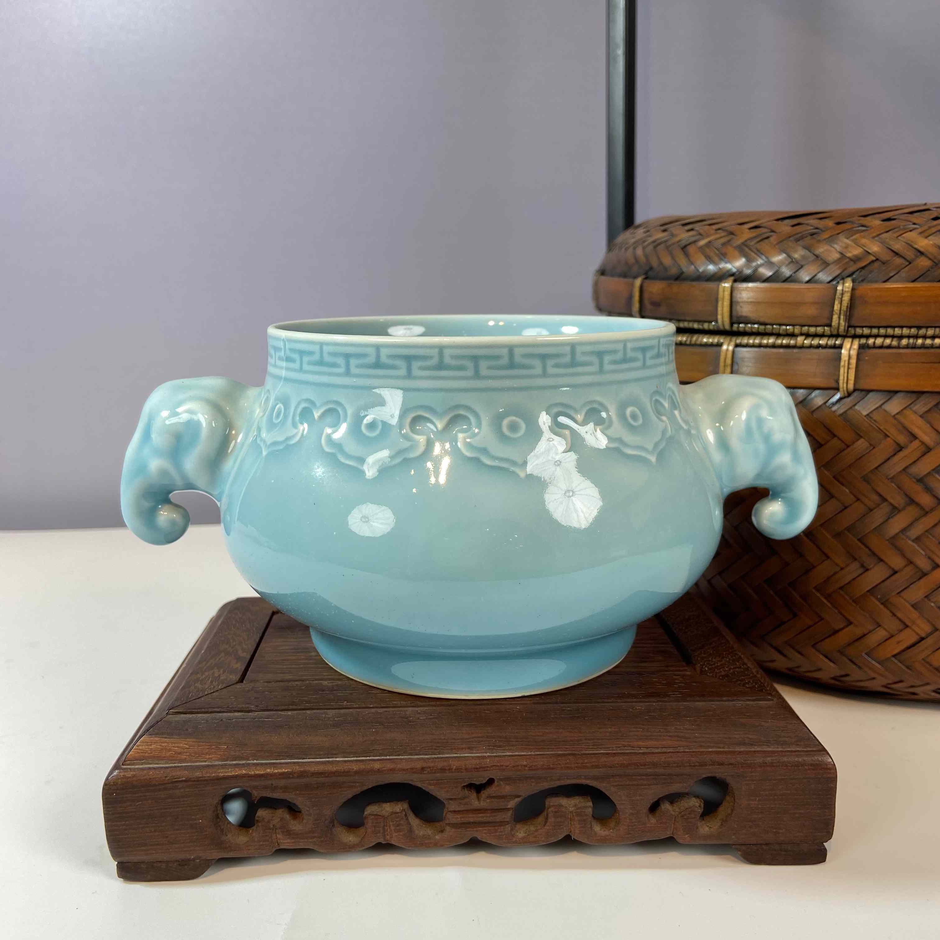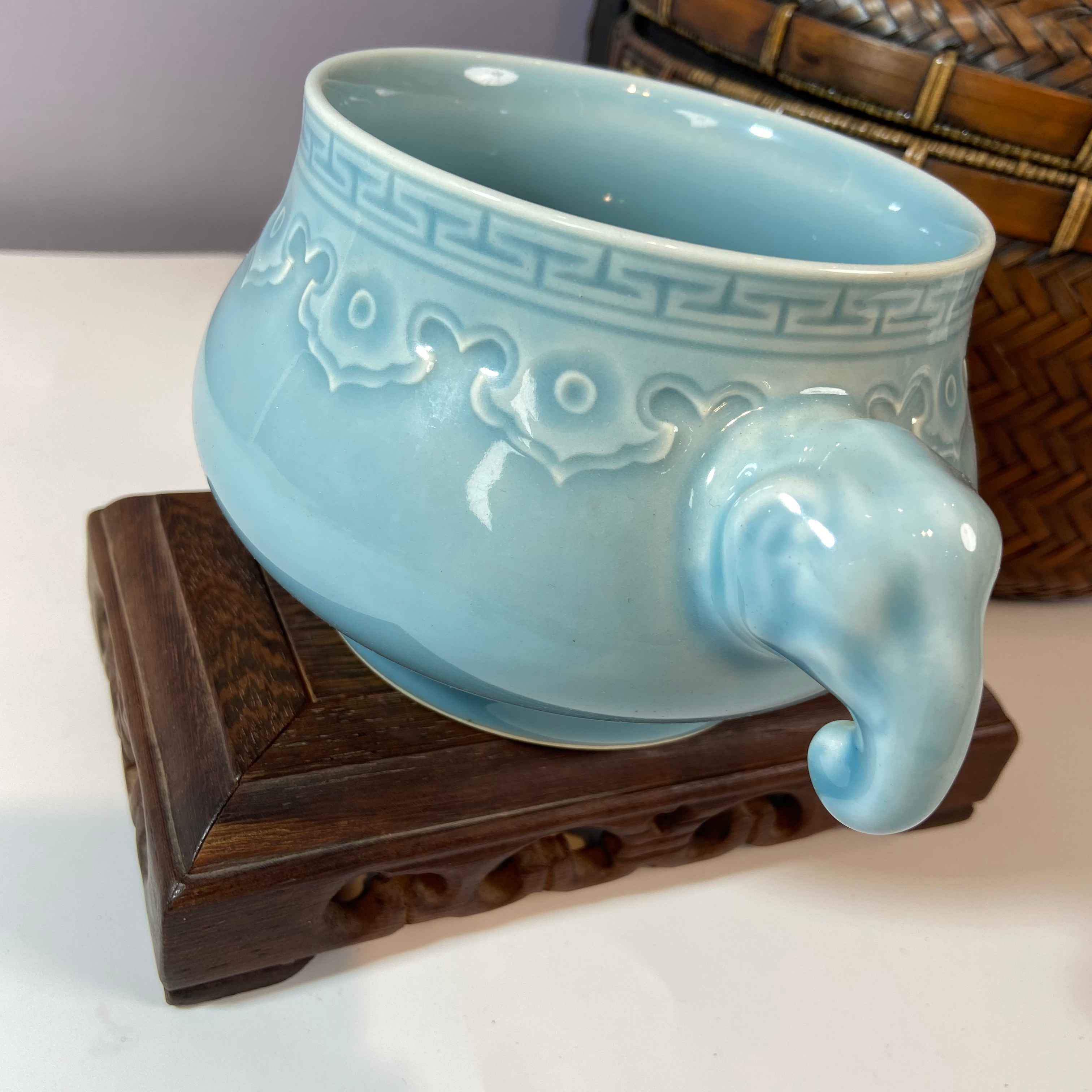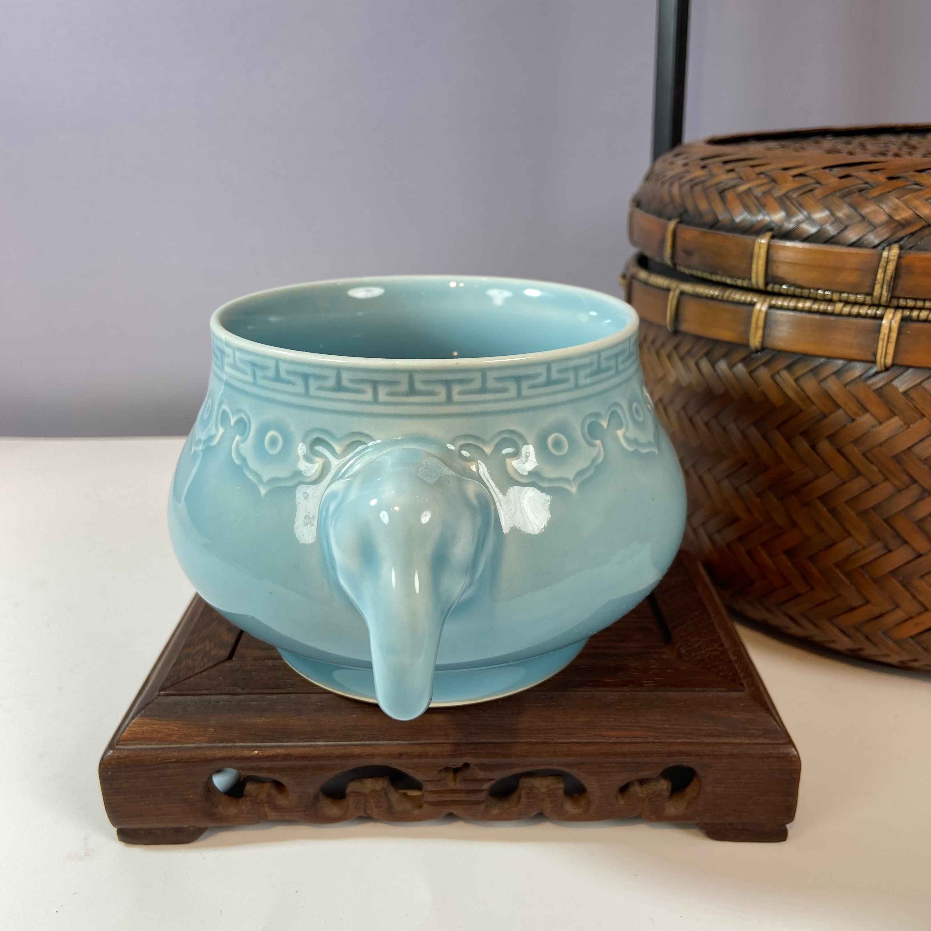 香炉两侧塑有象首造型的耳,憨态可掬。在传统文化里,大象象征吉祥、太平、力量,象耳设计不仅增添了香炉的美观度,更赋予其美好的寓意。