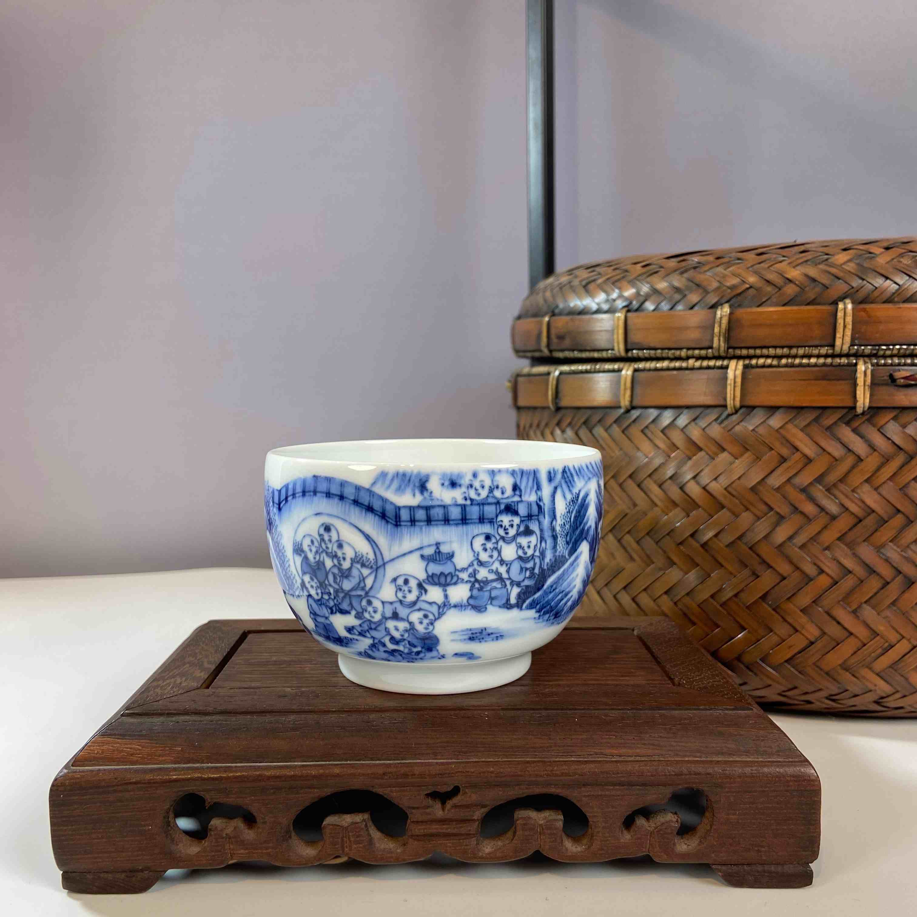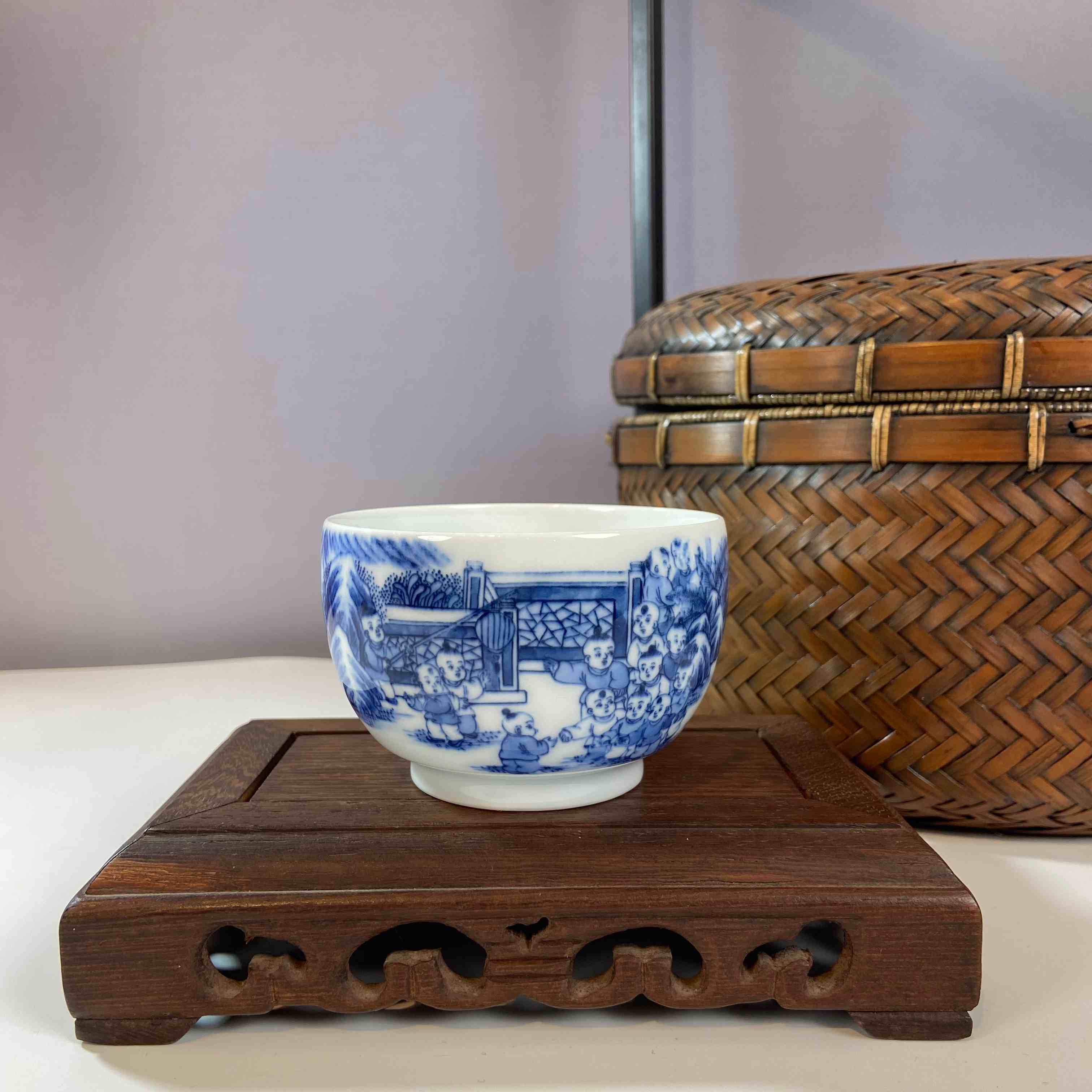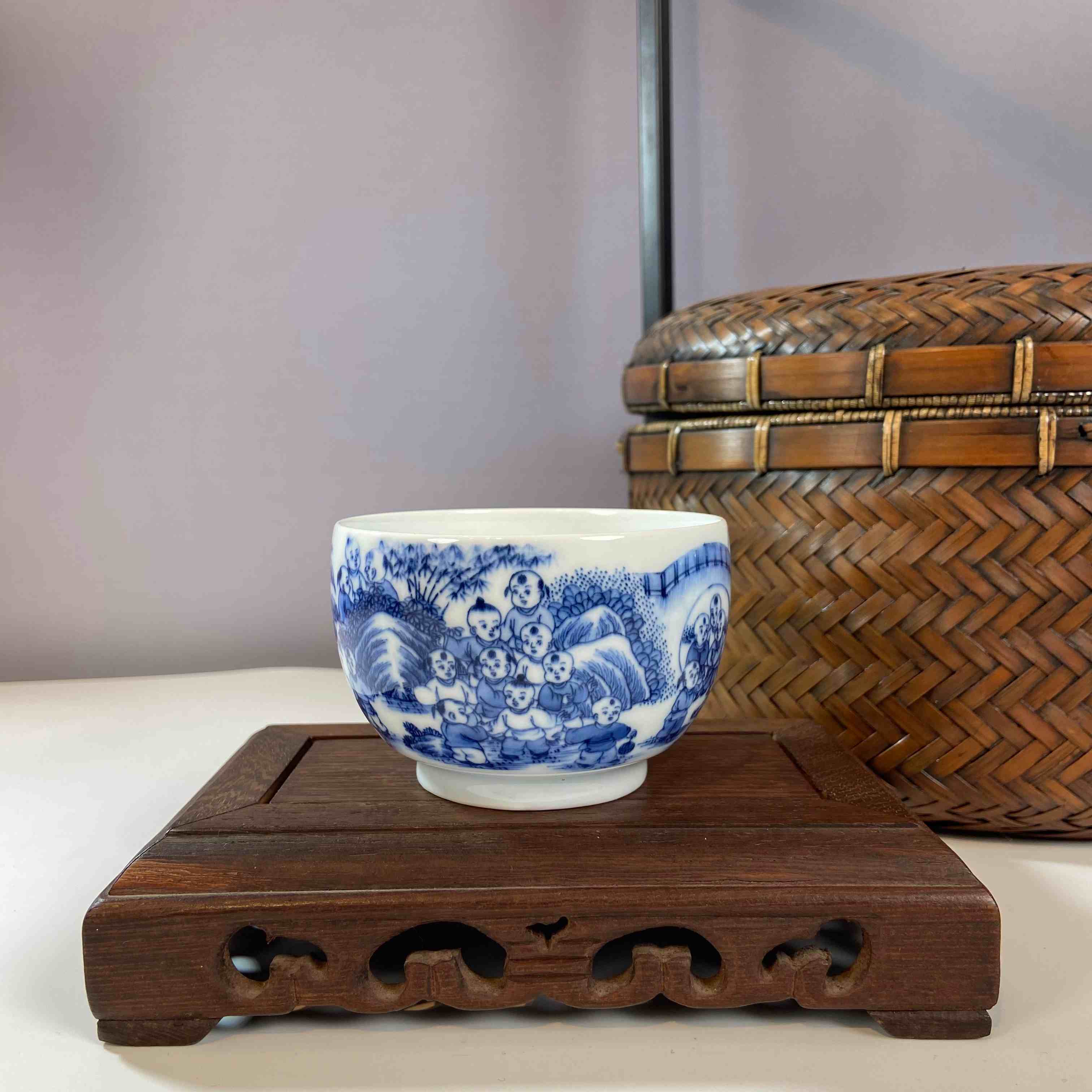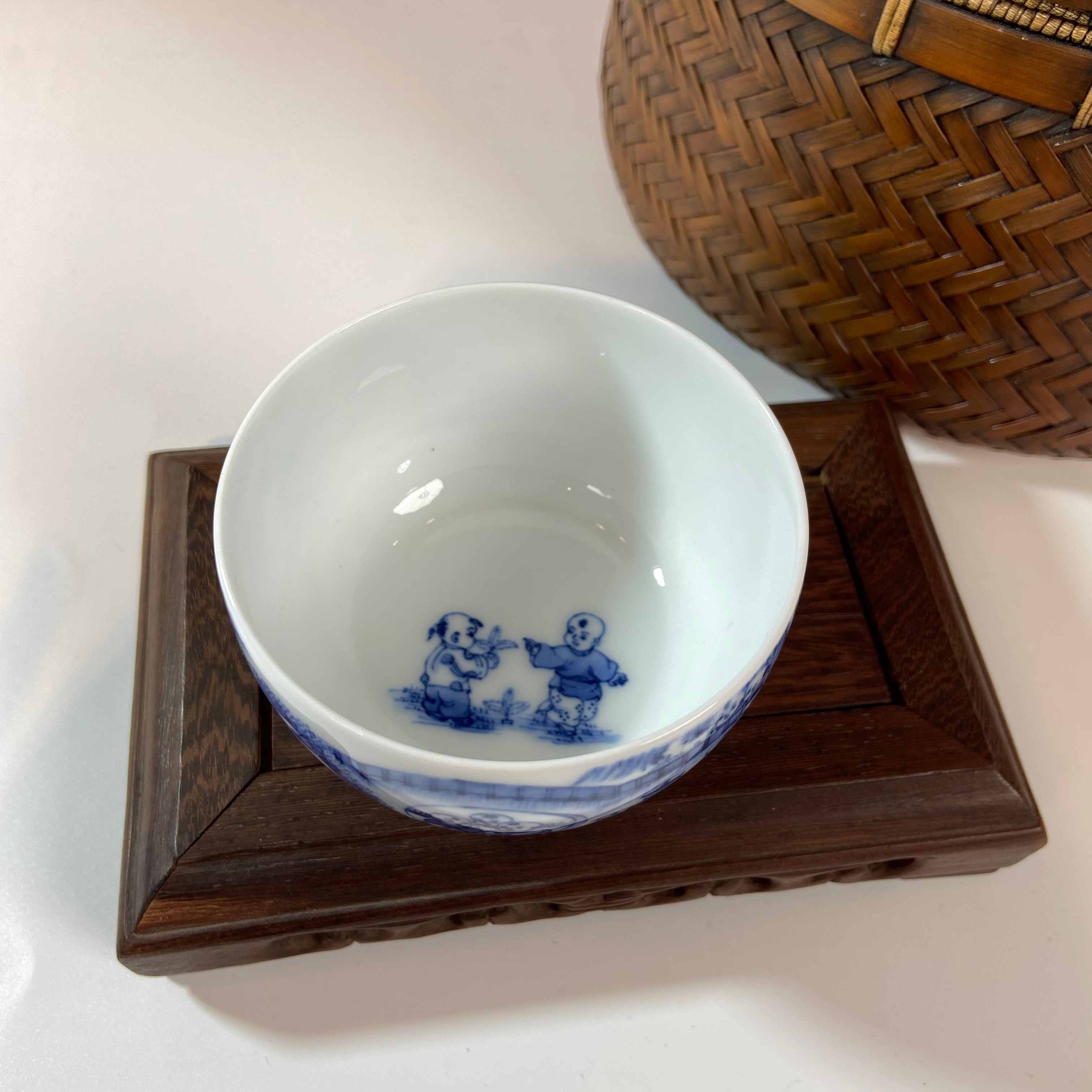 杯身绘有生动的婴戏图,众多孩童姿态各异,有的嬉戏玩耍,有的相互交流,场景充满童趣与活力, 周围还点缀着山水、树木等元素,营造出一种欢快且自然的氛围。此外,杯内底部也有两个孩童的图案,设计十分精巧,增添了细节之美。