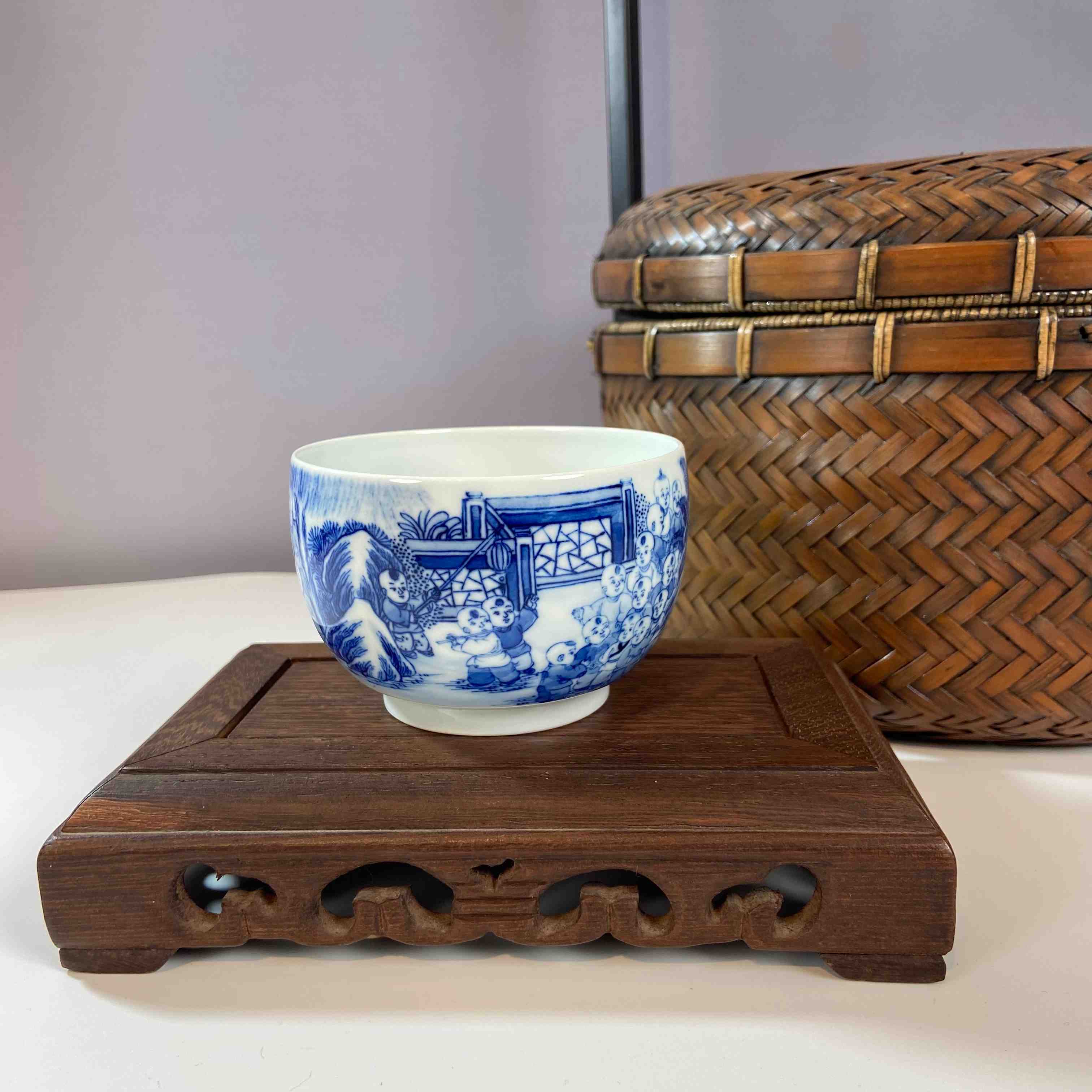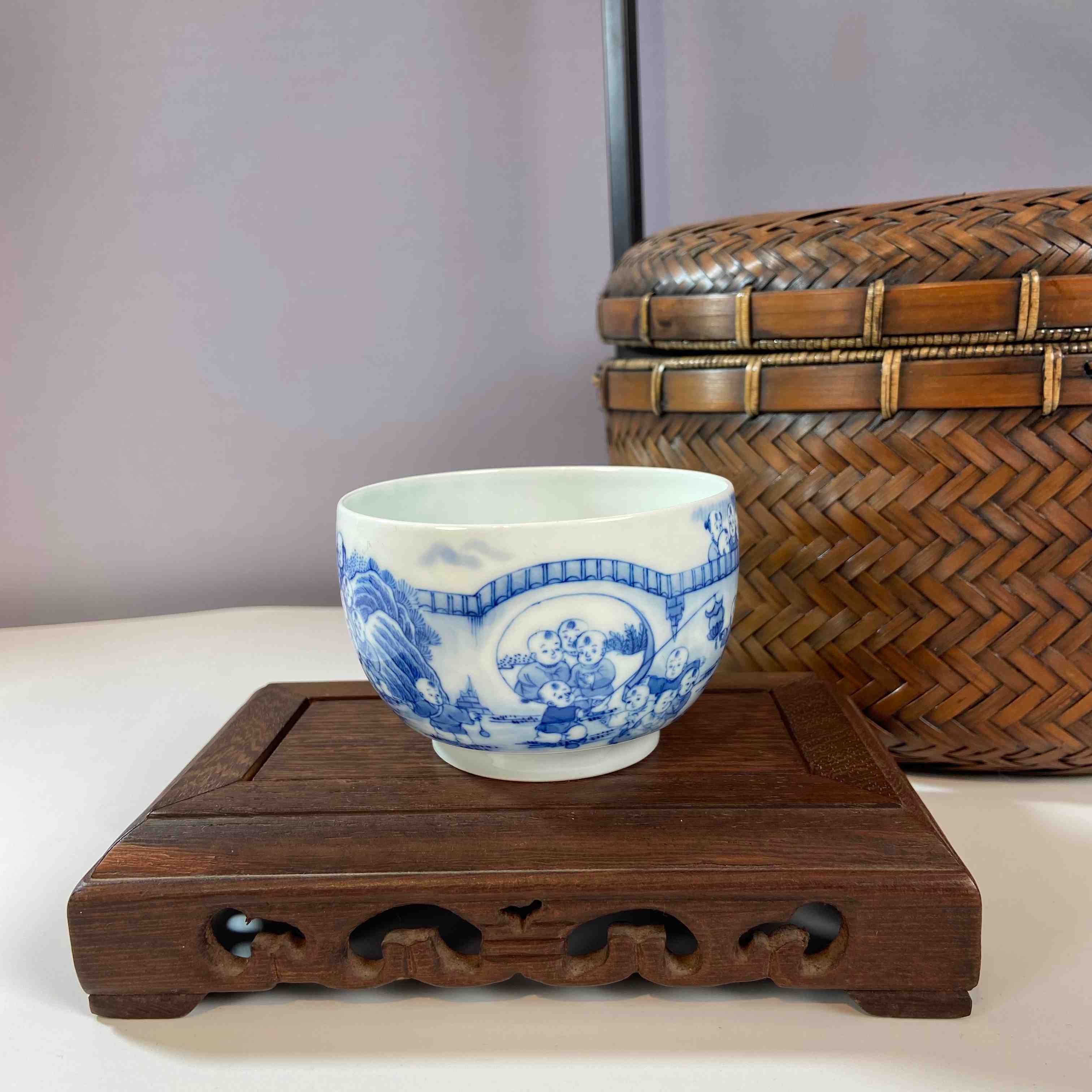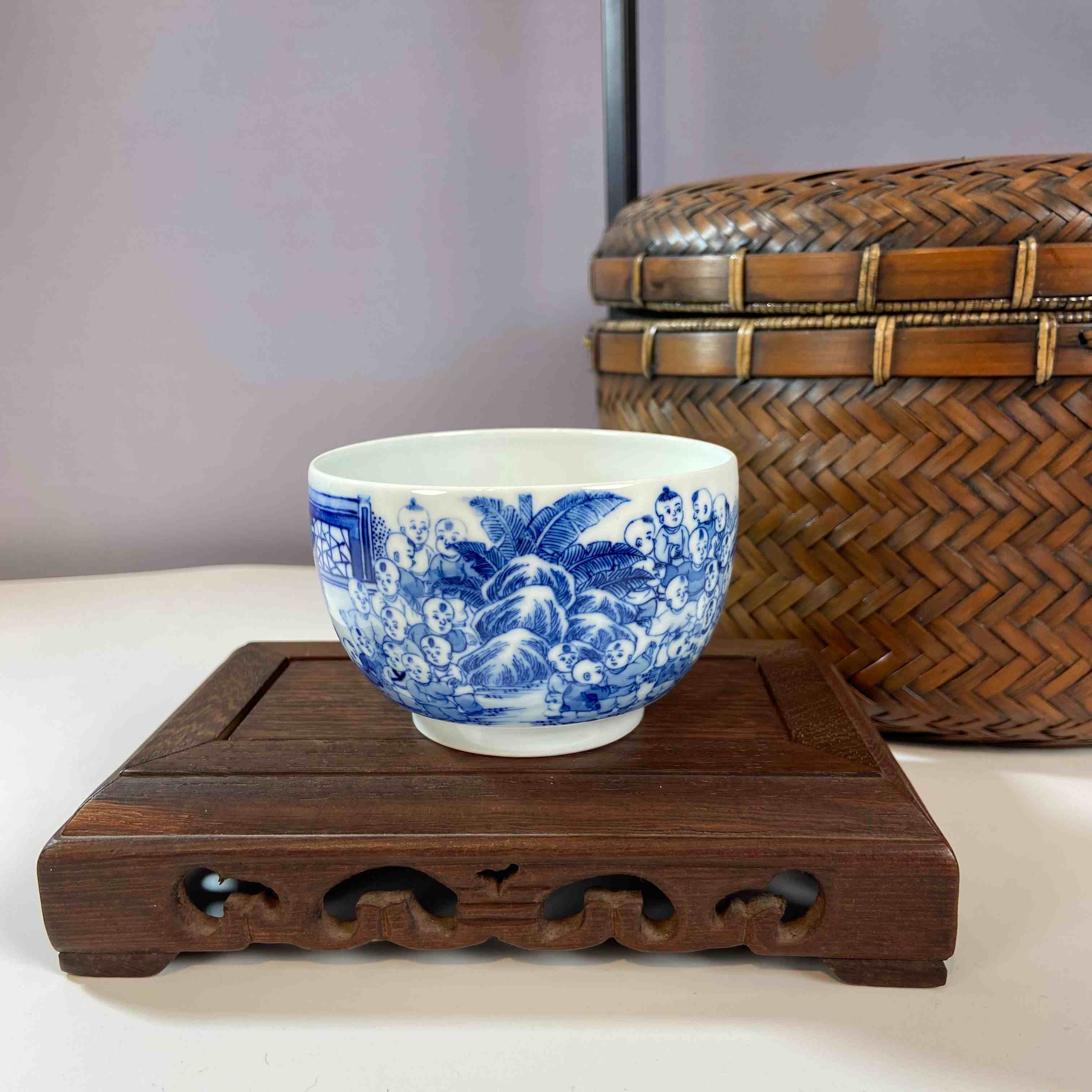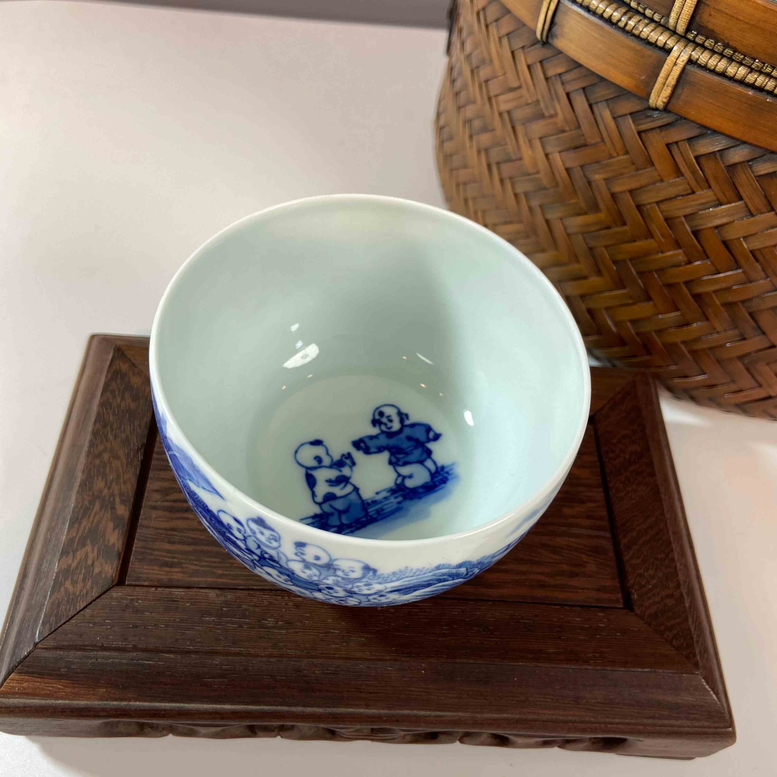 杯身绘有婴戏图,众多孩童形象活泼可爱,姿态各异。有的在庭院中嬉戏玩耍,有的在桥上追逐打闹,周围还配有山石、树木、亭台楼阁等景致,生动地营造出热闹欢快的氛围,展现出孩童的天真烂漫与生活的祥和美好。青花图案线条流畅,人物刻画细腻,无论是孩童的神态表情,还是周围景物的细节,都描绘得栩栩如生。
