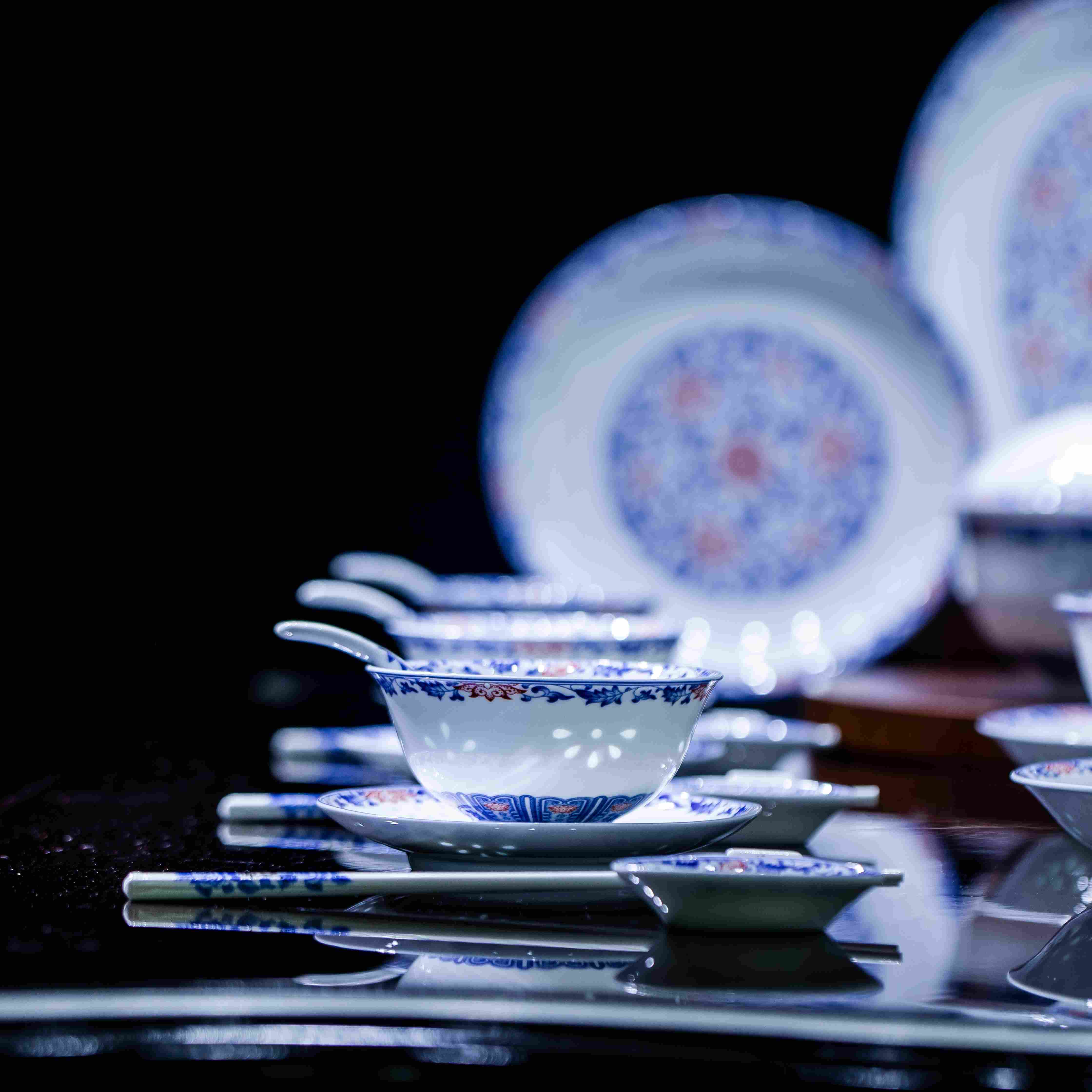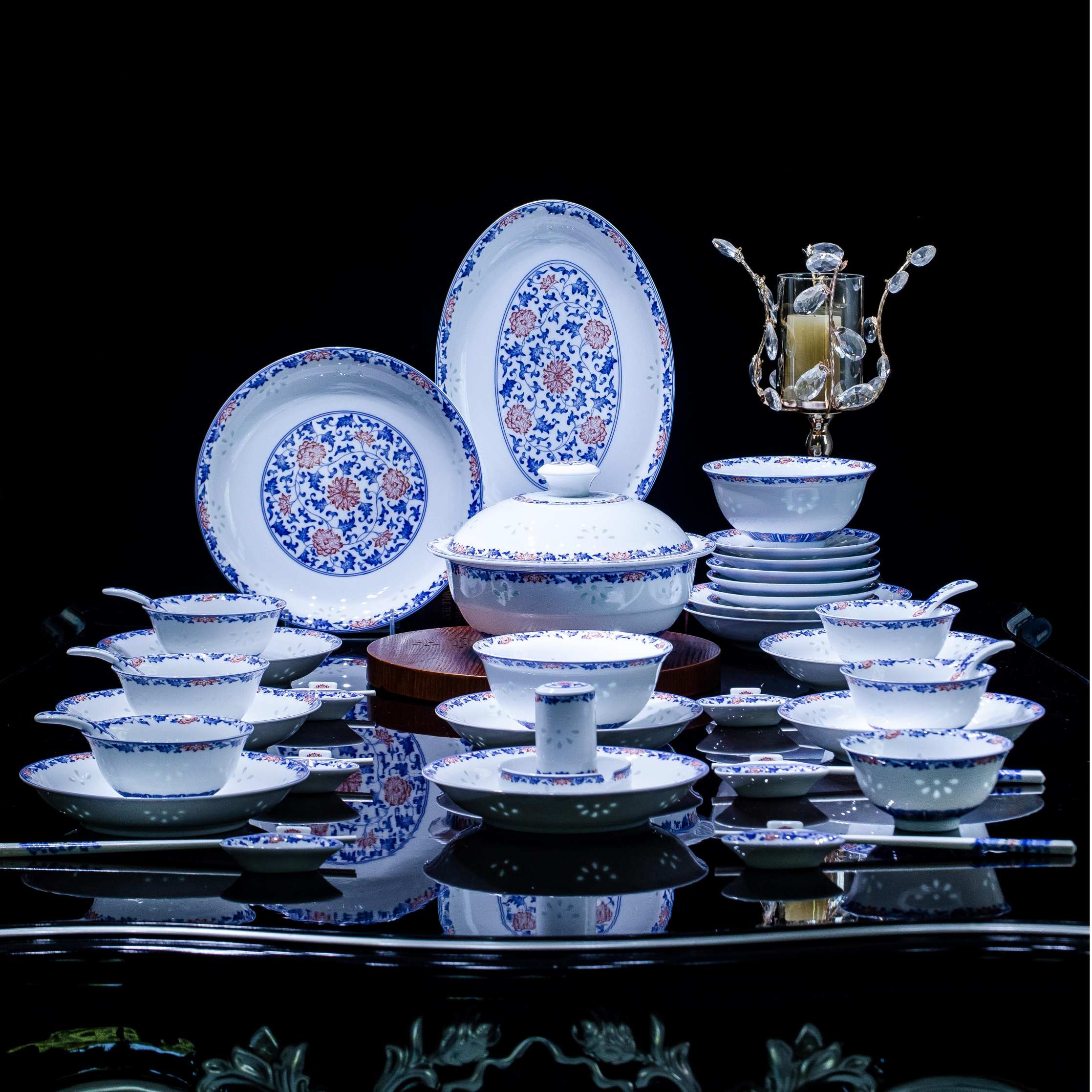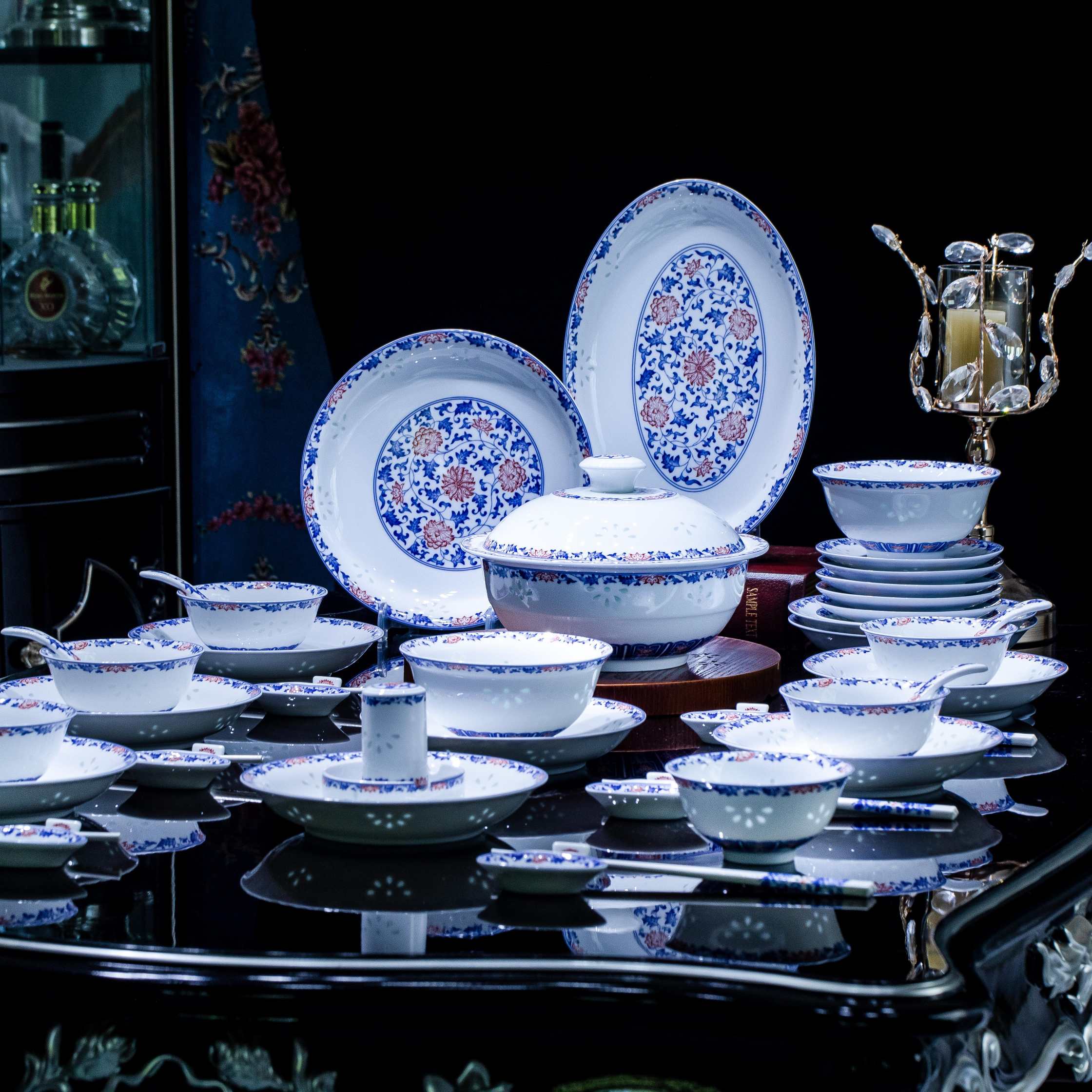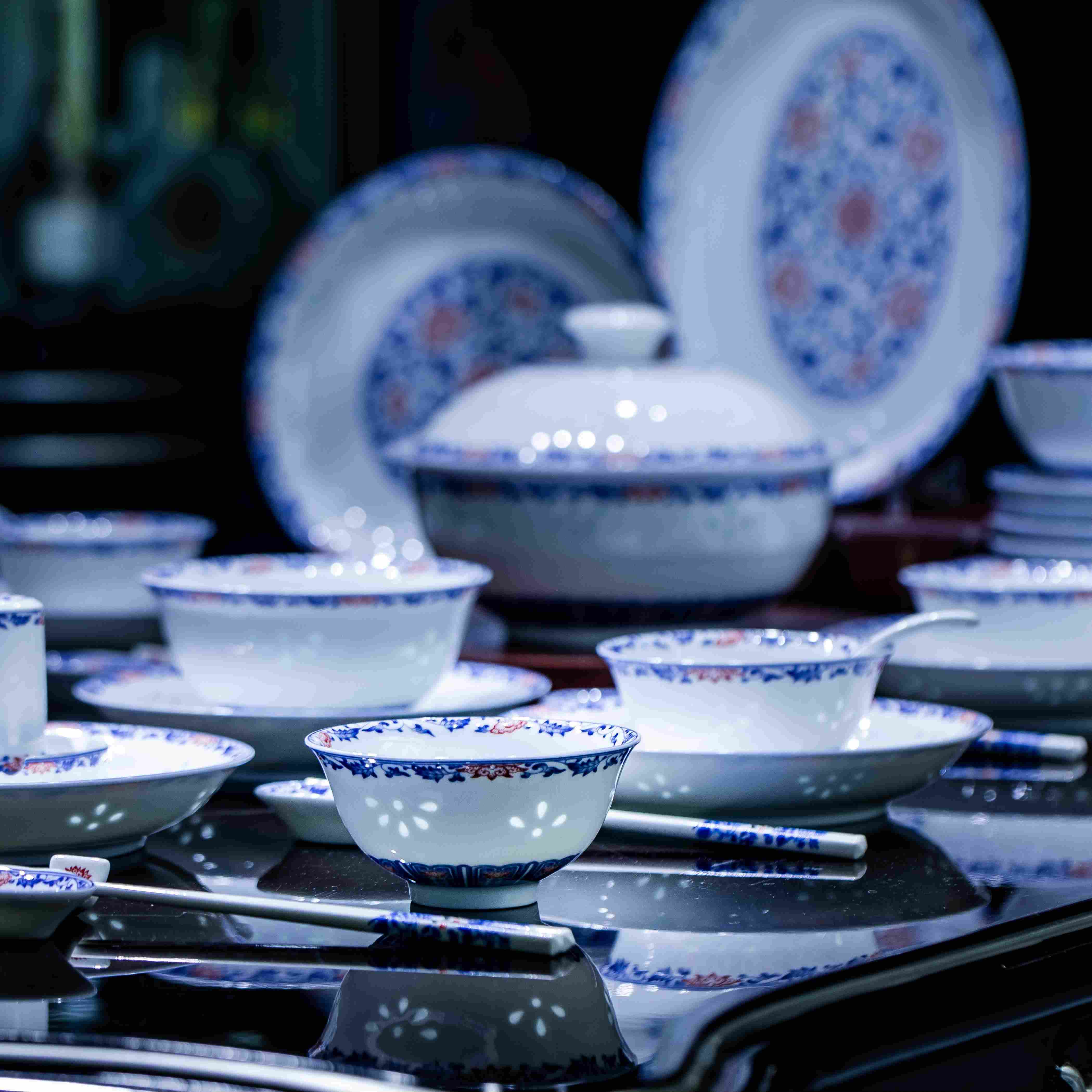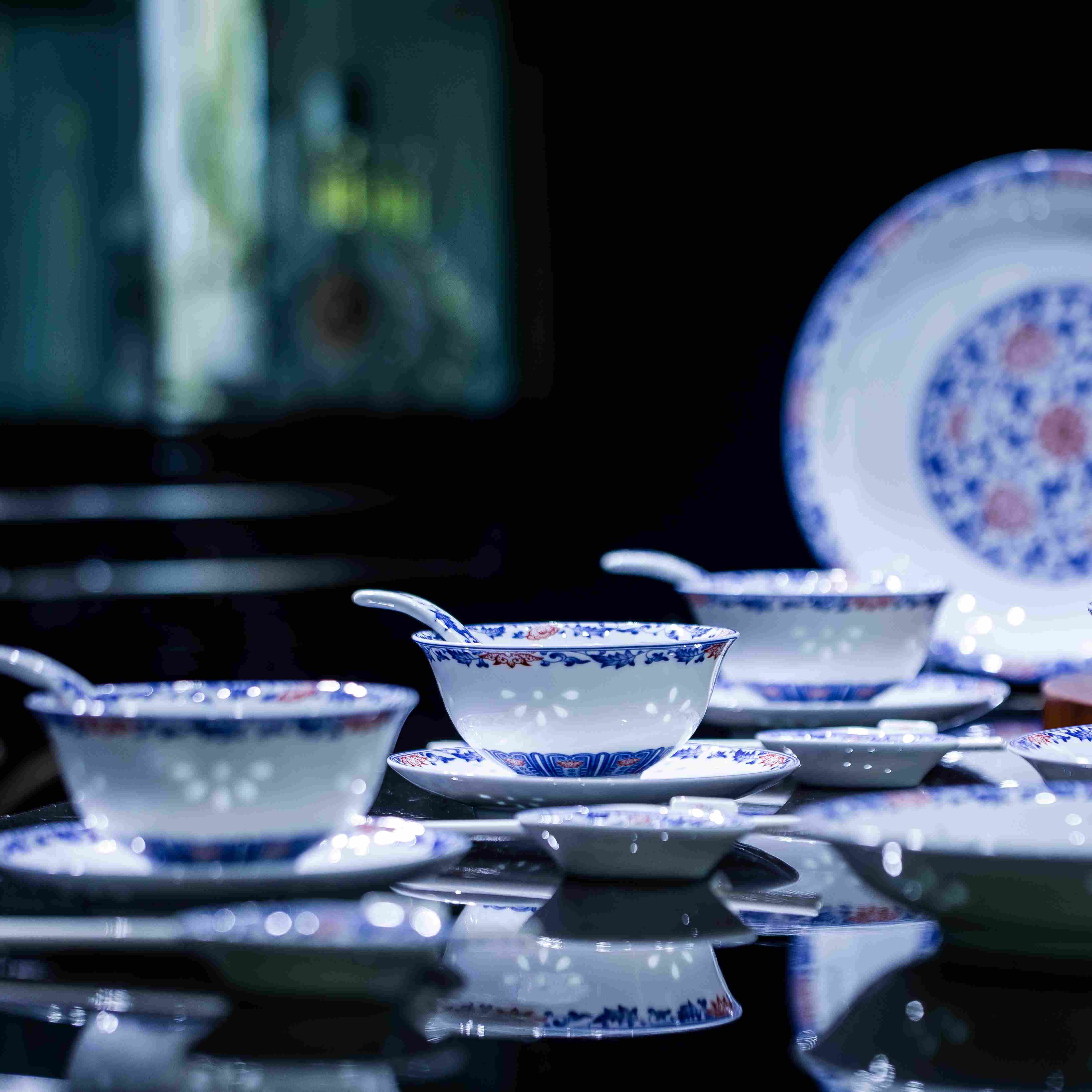 首页 / 餐具 / 套组餐具 / 68头玲珑釉里红餐具套组