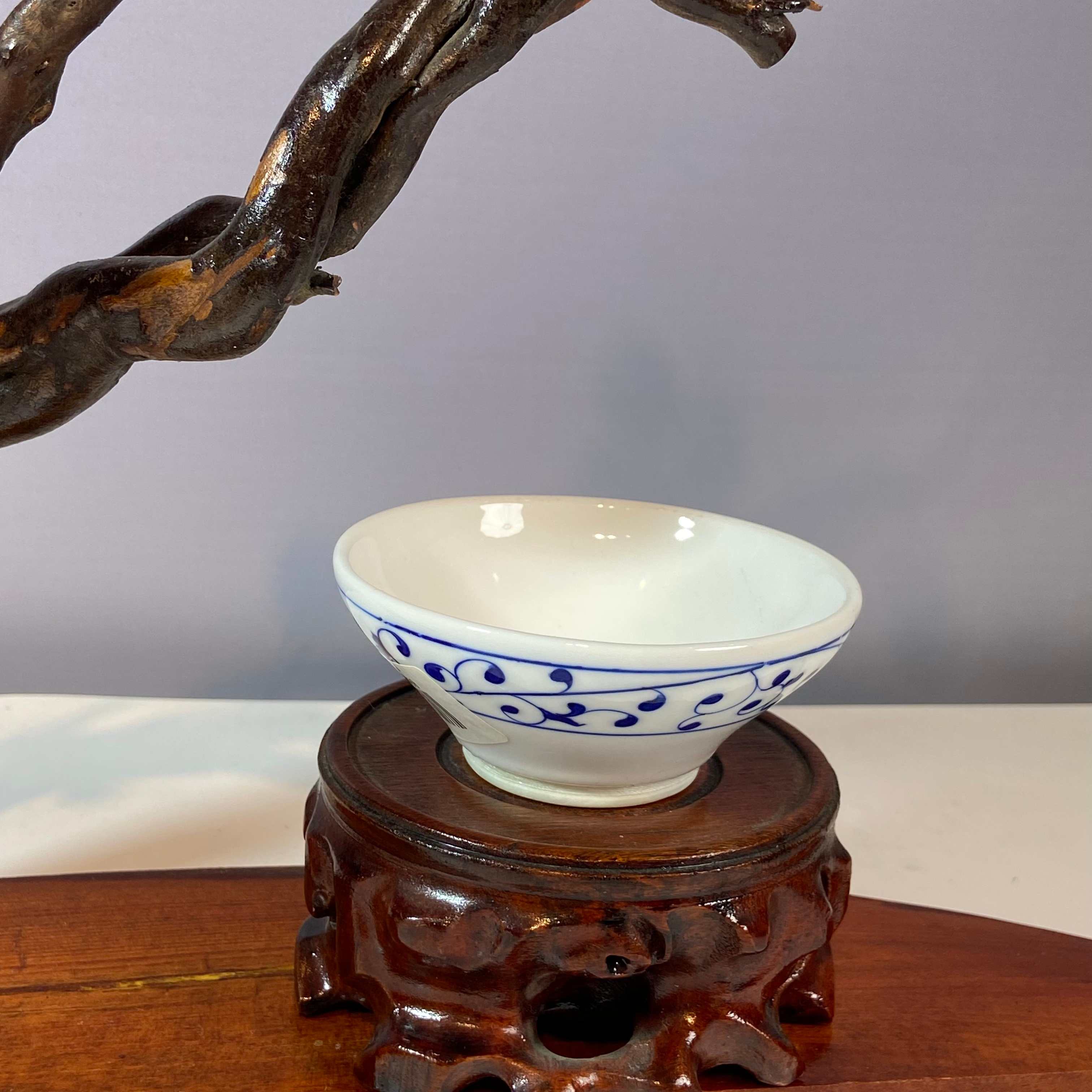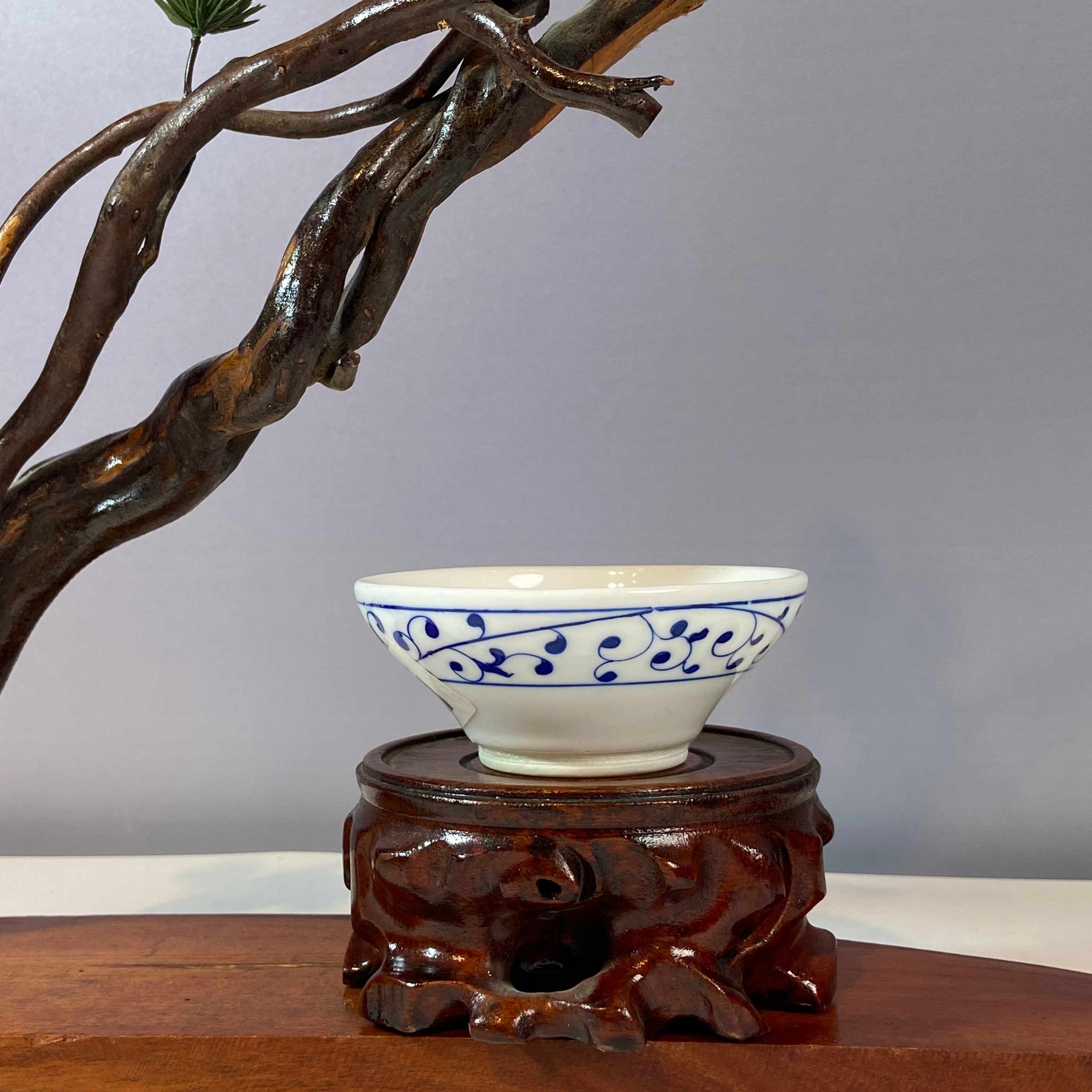 工艺上,青花图案发色纯正,蓝白对比鲜明,显示出较为成熟的青花瓷制作工艺。茶漏整体造型为敞口碗状,这种造型便于放置在公道杯或茶杯之上,能高效过滤茶叶,方便茶汤顺畅流入杯中, 既具备实用功能,又因青花装饰而极具艺术观赏性,为品茶过程增添了一份雅致的氛围。 同时,其简洁而富有韵味的设计,也适合搭配各类中式茶席布置,彰显传统文化底蕴