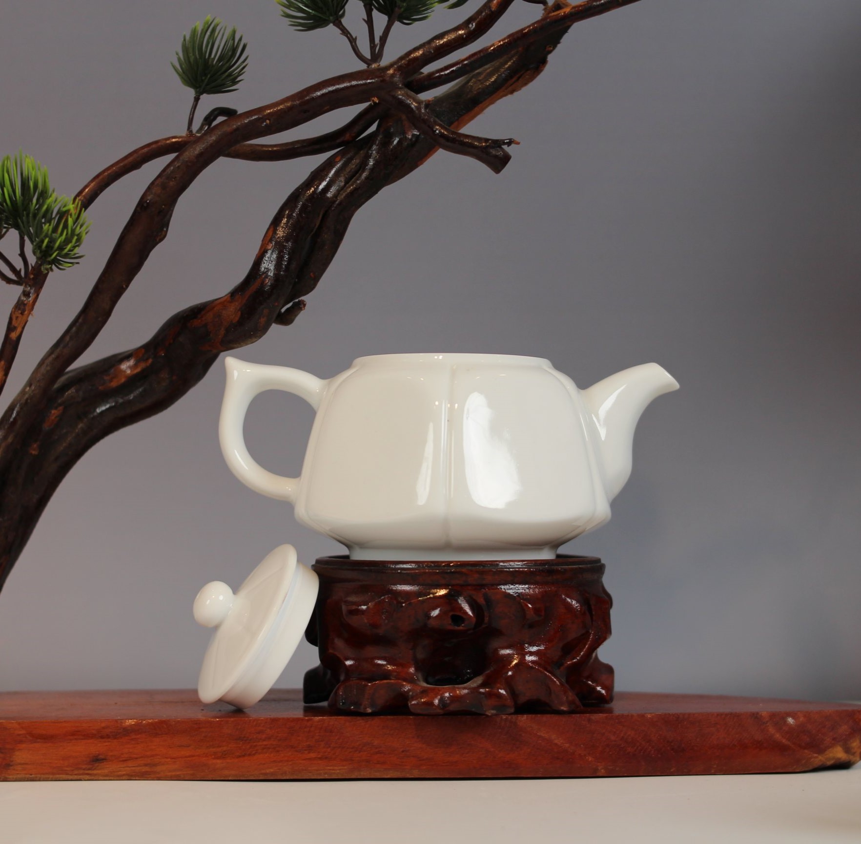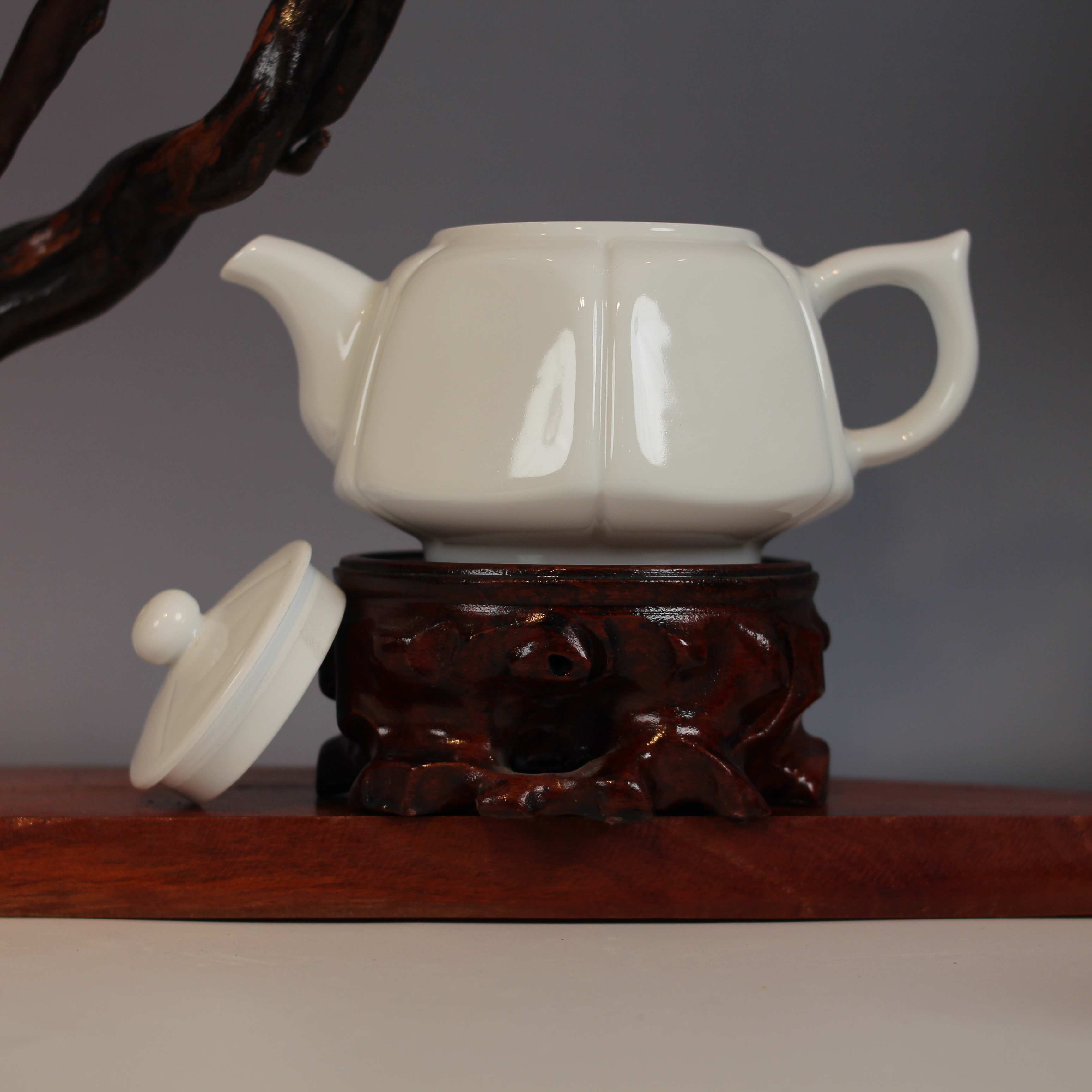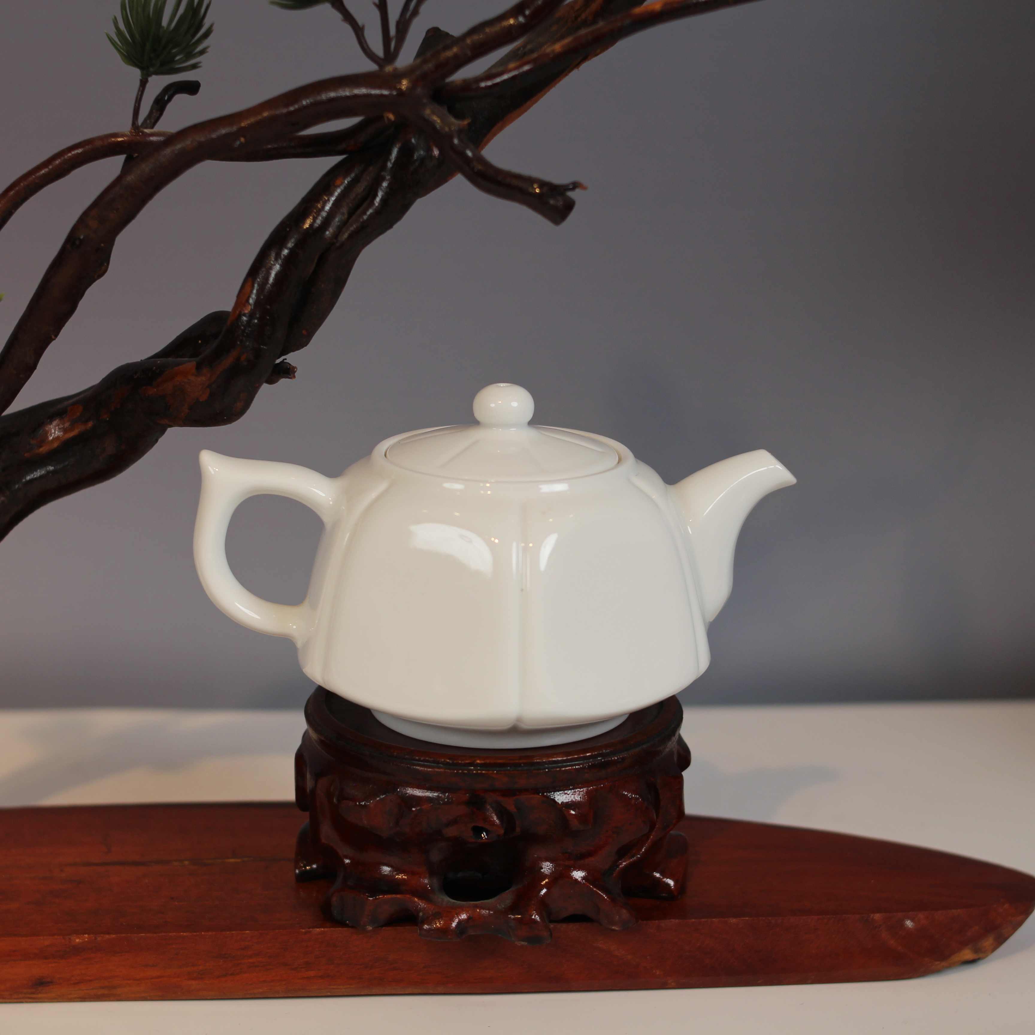 它的造型简洁大方,线条流畅,白色的釉面给人一种纯净、素雅的感觉。这种白瓷茶具在明代就已经非常有名,以其胎质细腻、釉色洁白、造型优美而著称。白瓷茶具适合冲泡各种茶叶,尤其是绿茶和白茶,能够更好地展现茶叶的色泽和香气。
