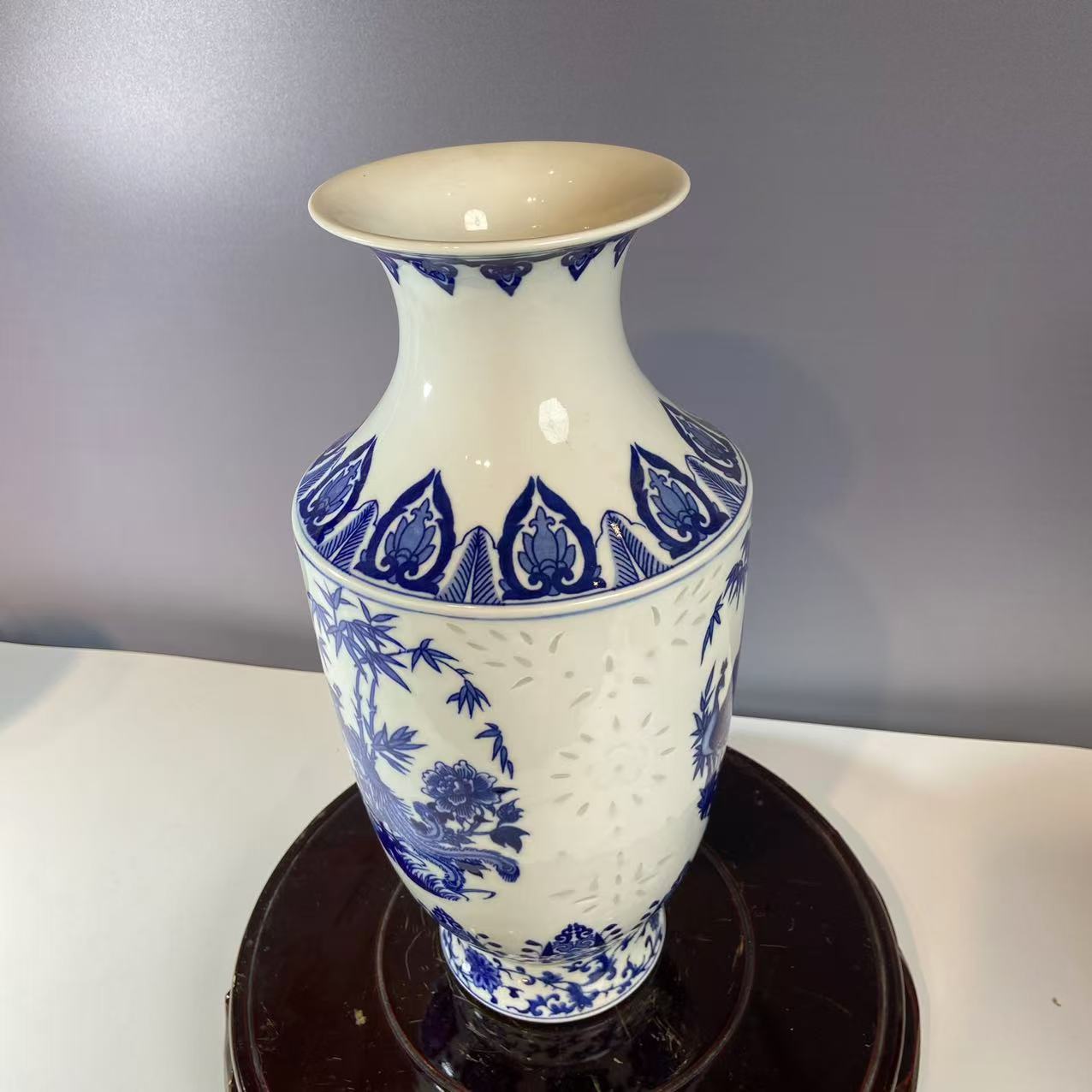 主体以白瓷为胎,饰以经典的青花图案。瓶身绘有竹子、花鸟等传统纹饰,寓意吉祥,体现中式审美 。其造型修长,颈部、肩部、足部有不同青花边饰点缀,搭配深色木质底座,尽显典雅古朴,是中式家居装饰与传统工艺收藏的佳品,展现了青花瓷 “白釉青花一火成,花从釉里透分明” 的独特魅力 。