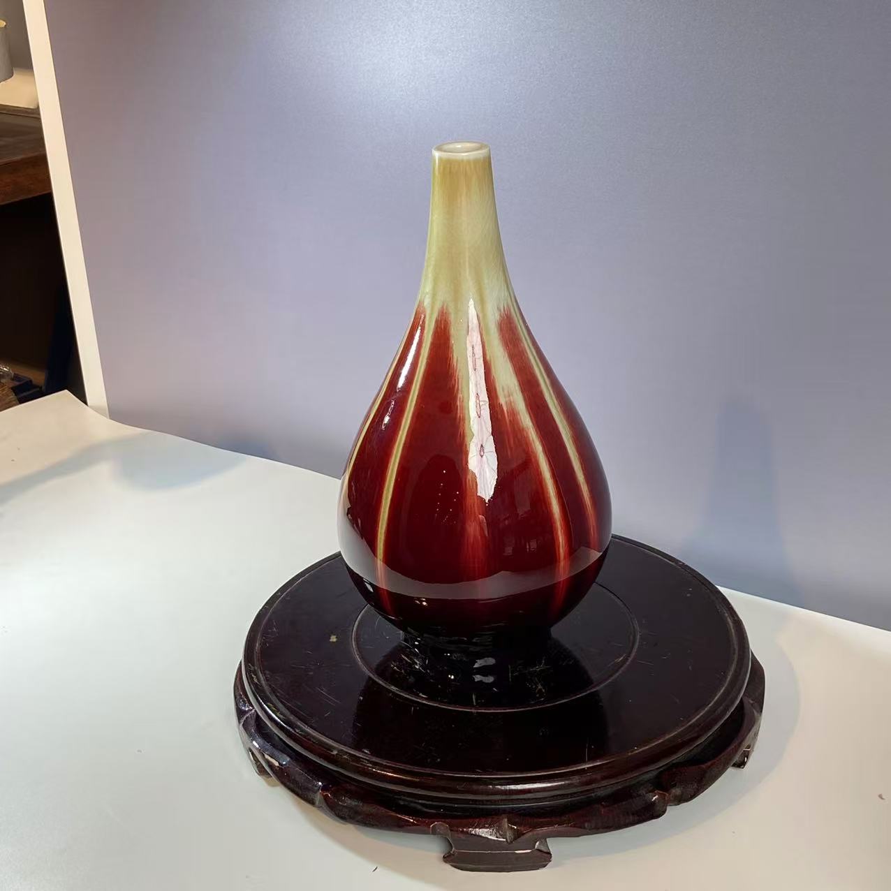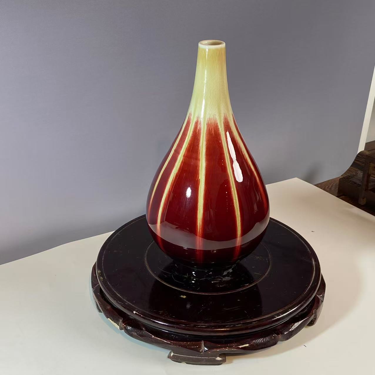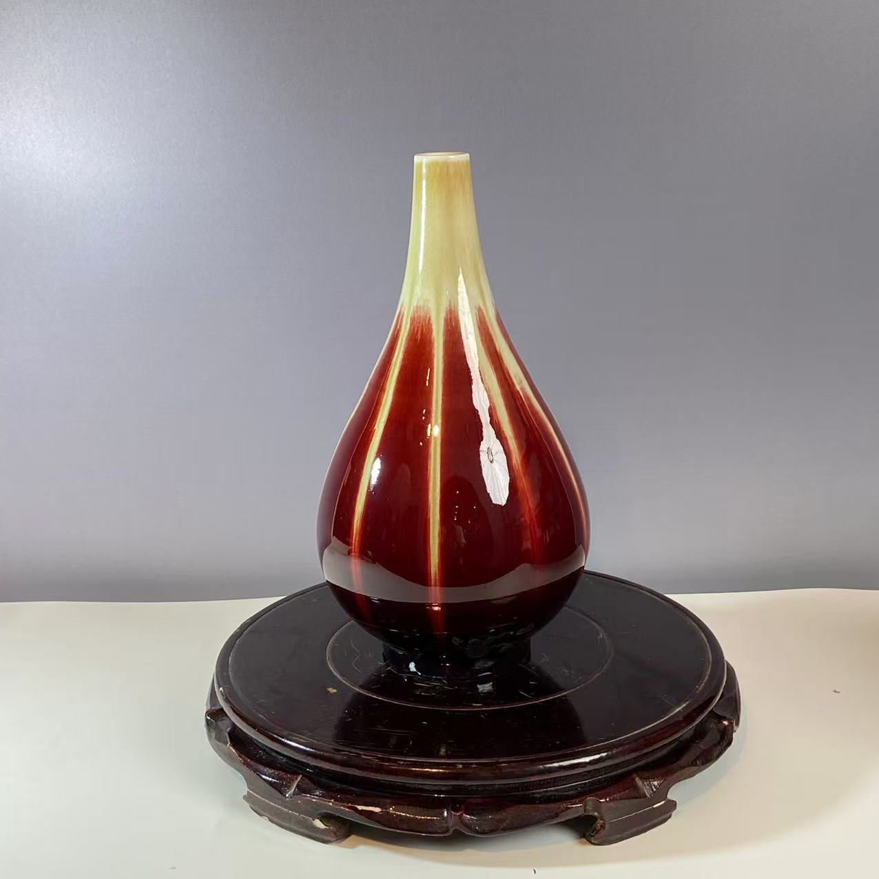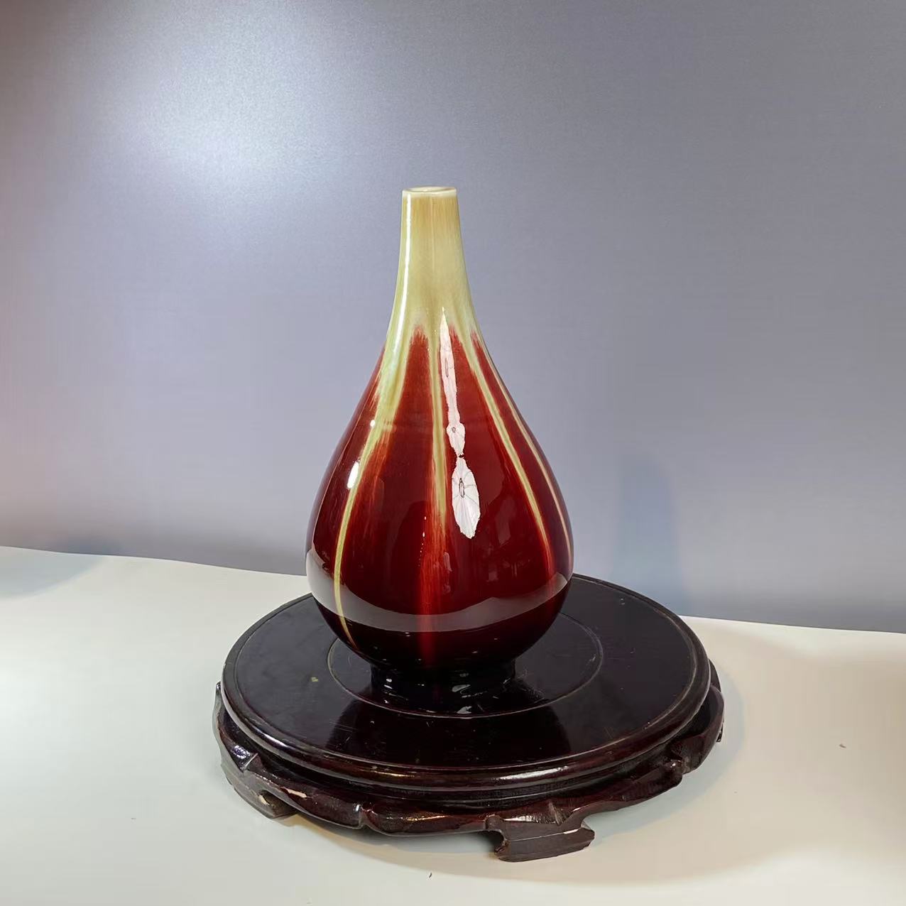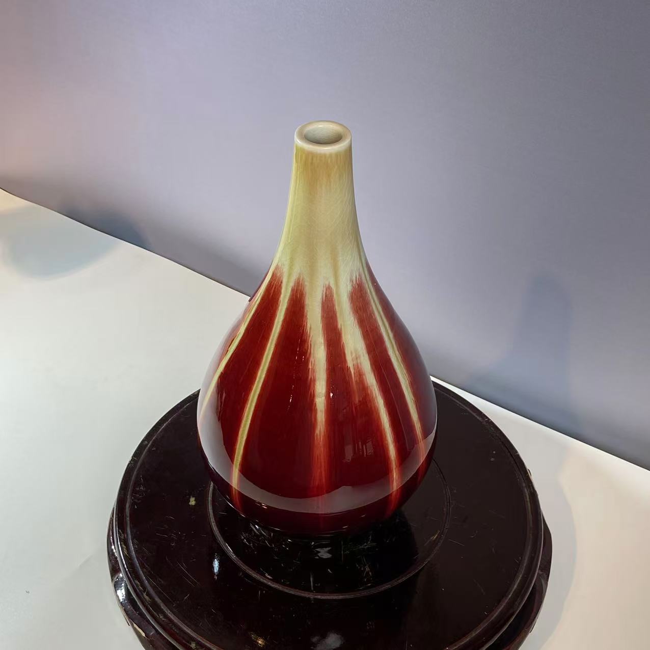 瓶身色彩独特,呈现出红褐与米黄交融的窑变效果。窑变是陶瓷烧制过程中,由于釉的组成成分、窑内气氛或温度变化等因素,导致釉面呈现出意想不到的色彩和纹理变化,使得每一件窑变瓷器都是独一无二的 。