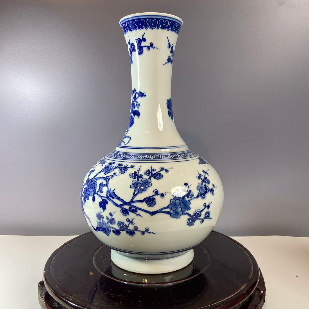 在装饰方面,瓶身以经典的蓝白配色呈现。白瓷为底,青花绘制纹饰,颈部和口沿处饰有简单的几何或花卉边饰 ,腹部则以青花描绘出繁茂的梅花枝,梅花花朵点缀其间,细腻生动,展现出中式传统绘画的韵味。青花瓷以含氧化钴的钴矿为原料,在陶瓷坯体上描绘纹饰,再罩上一层透明釉,经高温还原焰一次烧成,具有着色力强、发色鲜艳、烧成率高、呈色稳定的特点。