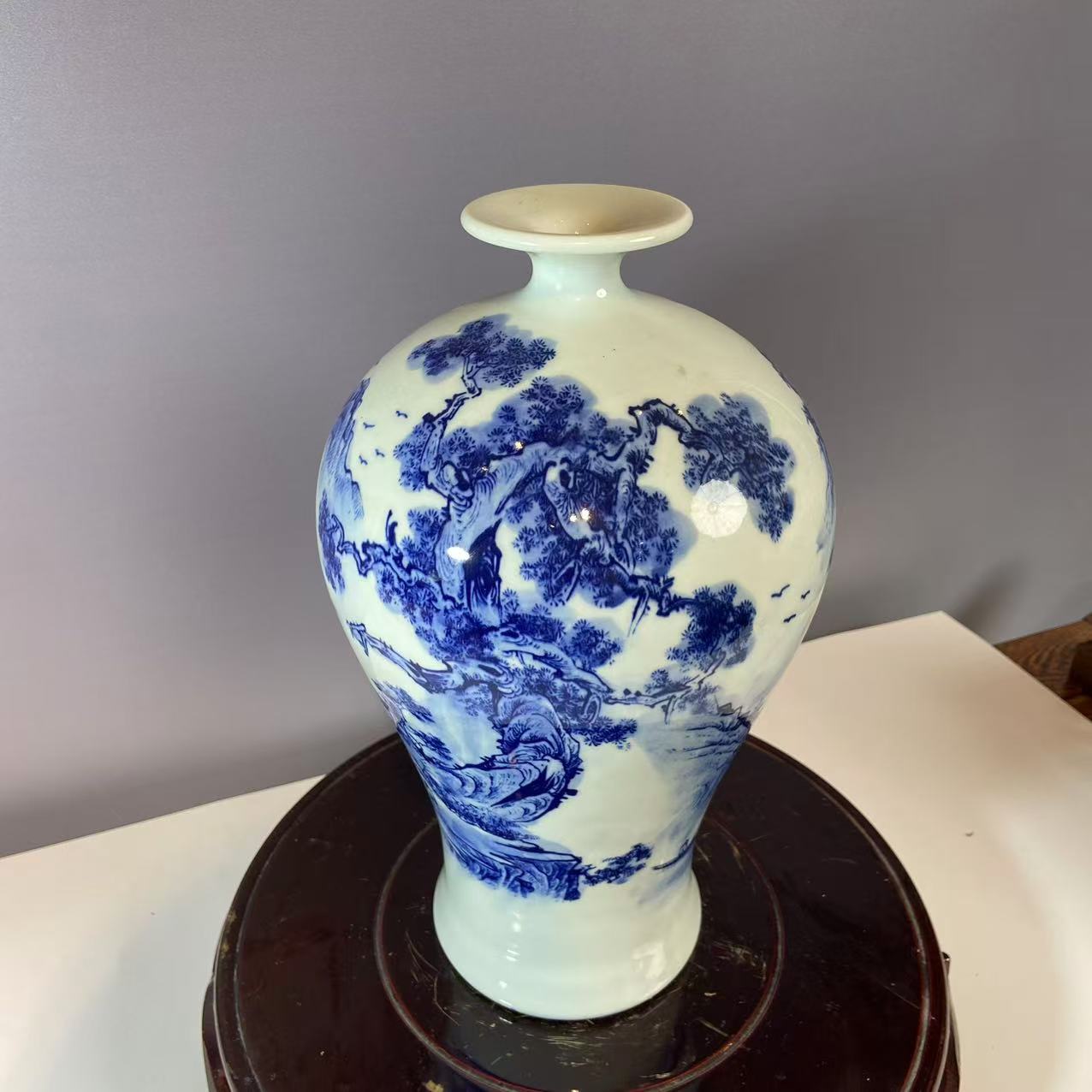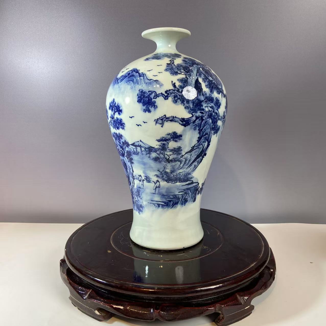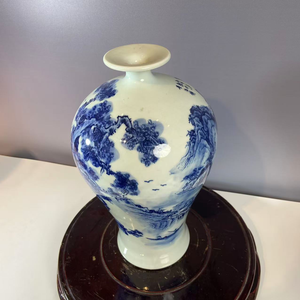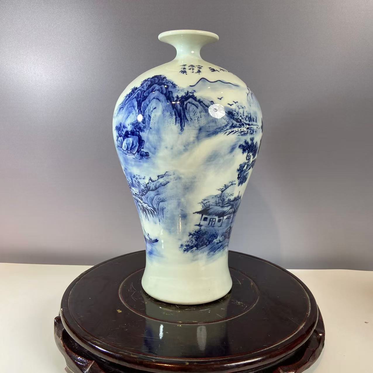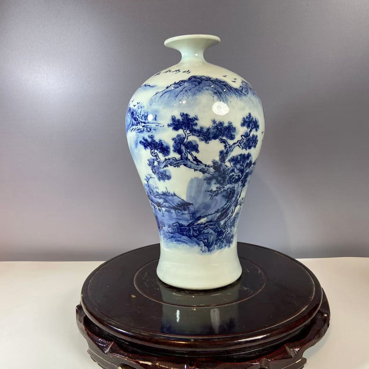 青花为装饰,钴料在瓷胎绘制图案,施透明釉后经高温烧成。瓶身青花纹饰是山水图景,山峦、树木、飞鸟勾勒细致,青花发色浓淡相宜,层次分明,呈现出传统水墨画的意境,尽显 “白釉青花一火成,花从釉里透分明” 的美感。