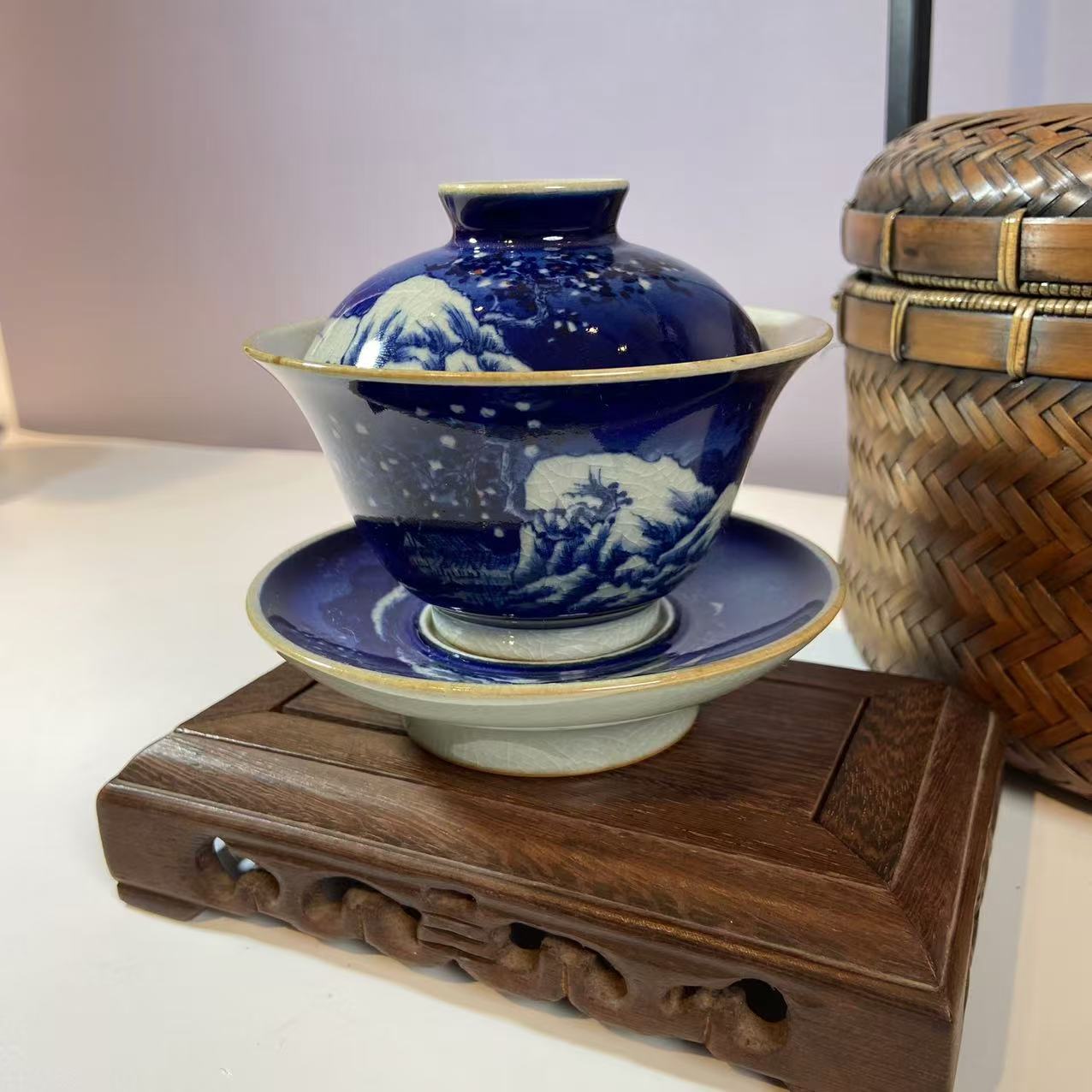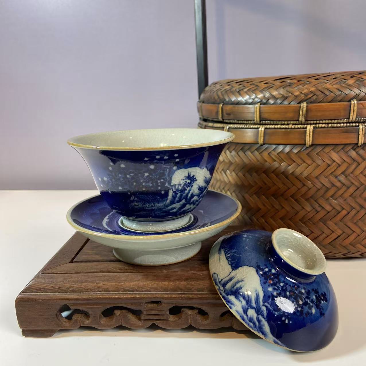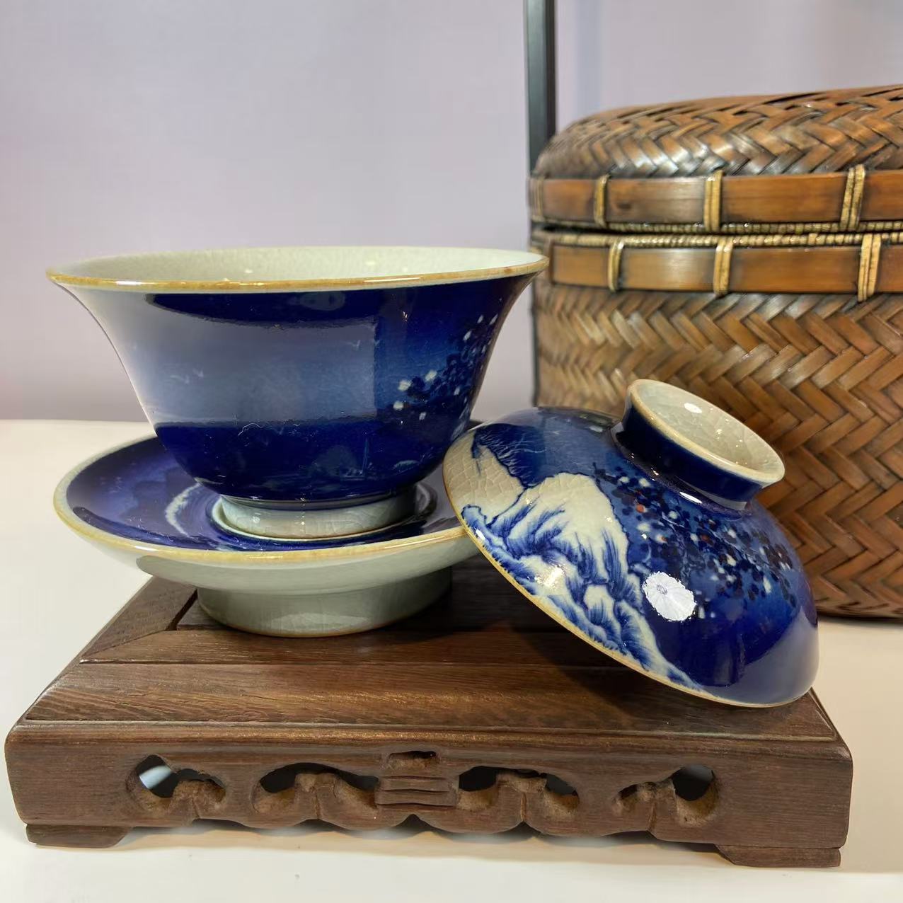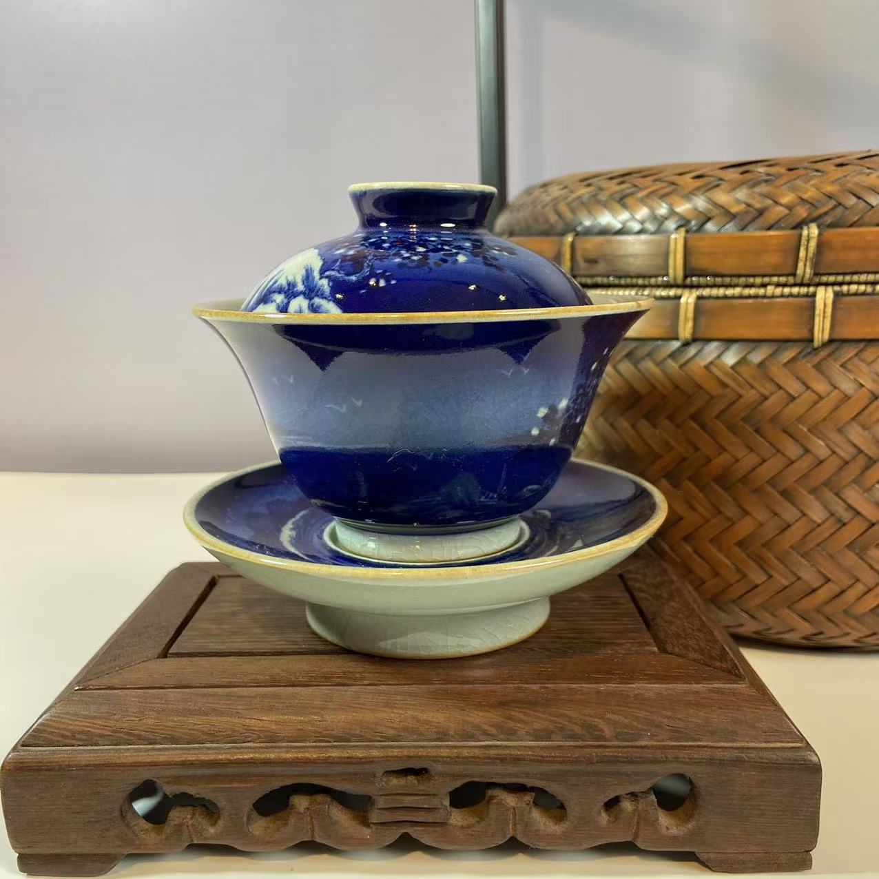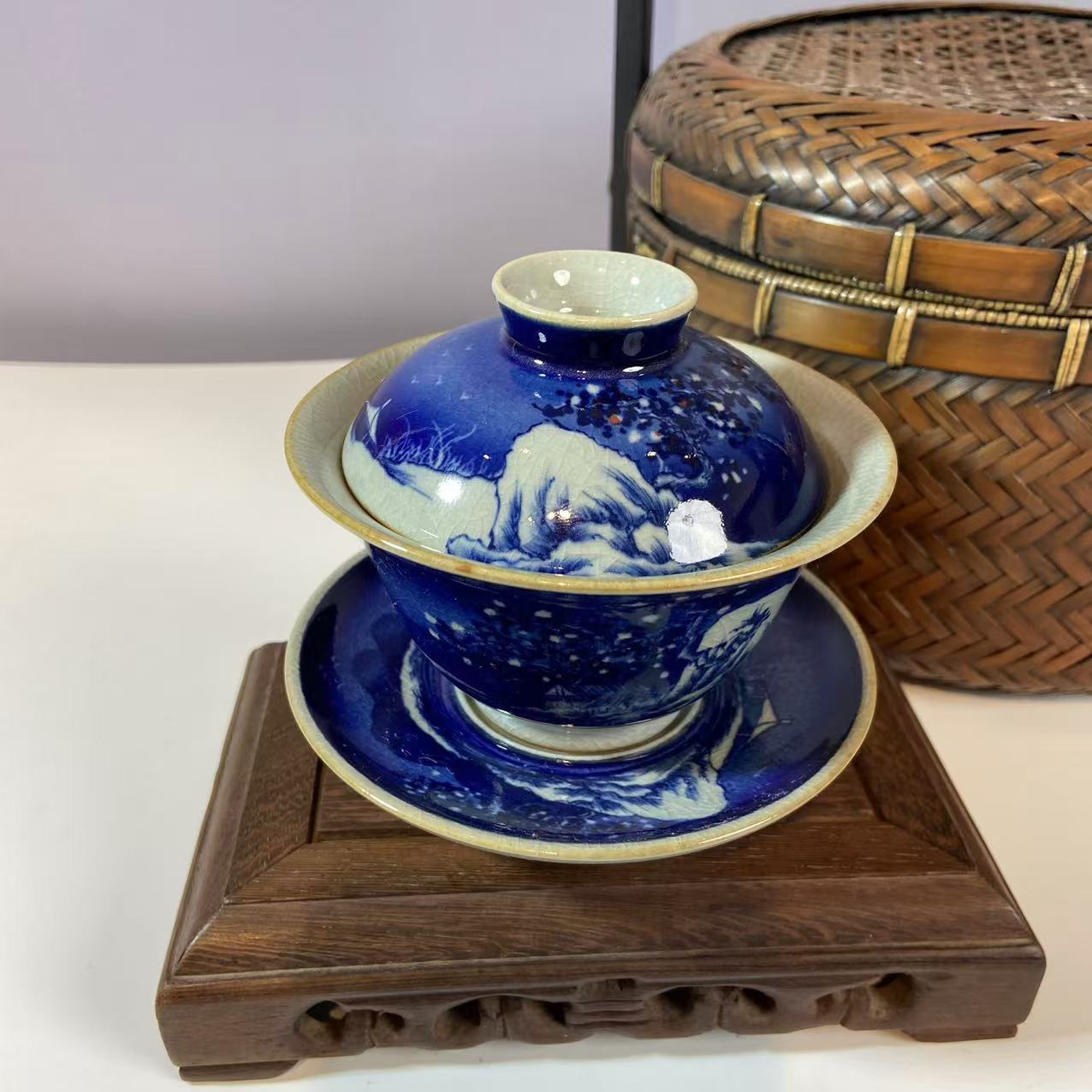 盖碗主要材质应该是瓷器,表面施以蓝釉,并且绘有青花图案。蓝色釉面色泽浓郁,青花图案精美,展现出传统的中式美学风格,可能采用了传统的青花瓷绘制工艺,这种工艺历史悠久,以氧化钴为颜料在瓷坯上绘制图案,再施透明釉,经过高温烧制而成 。