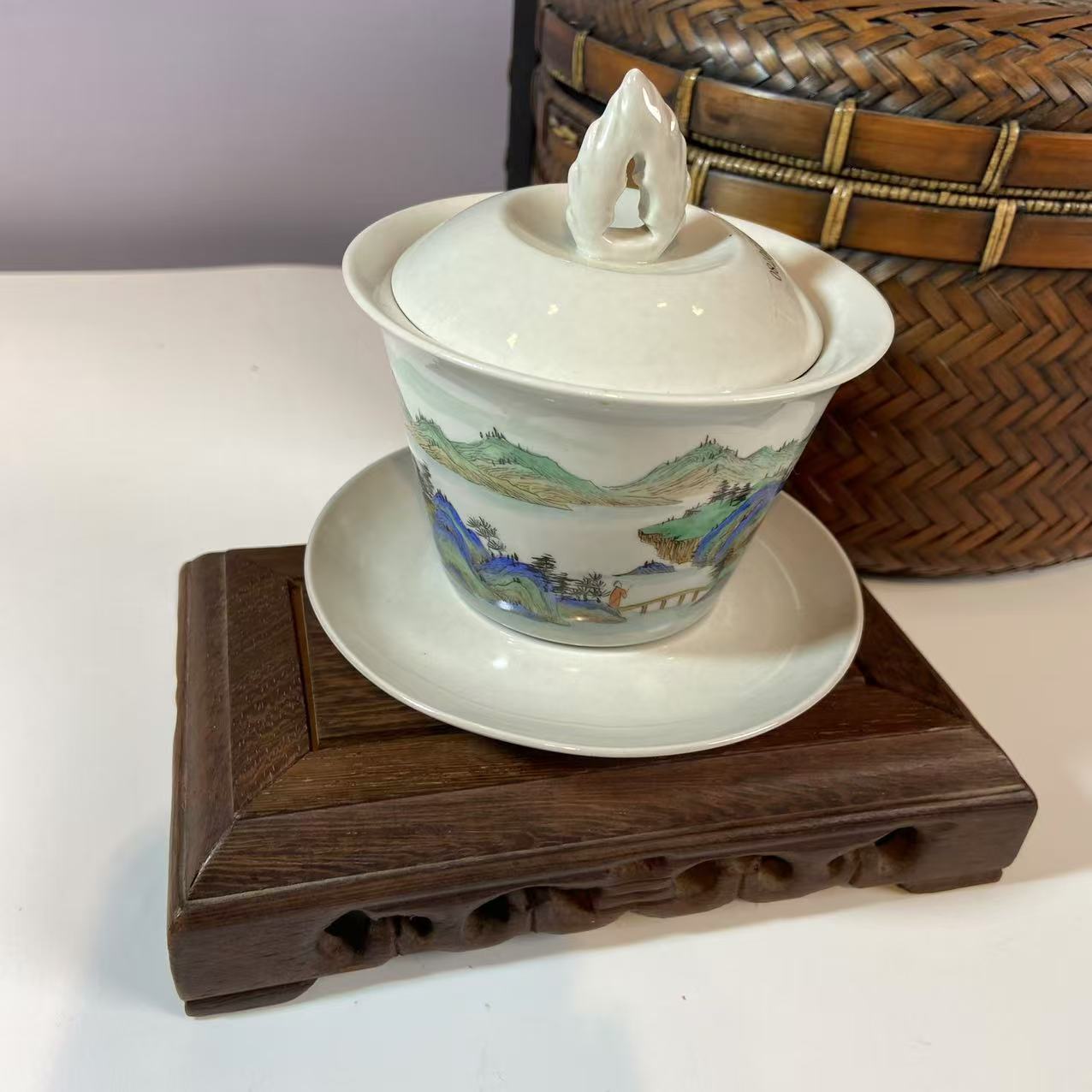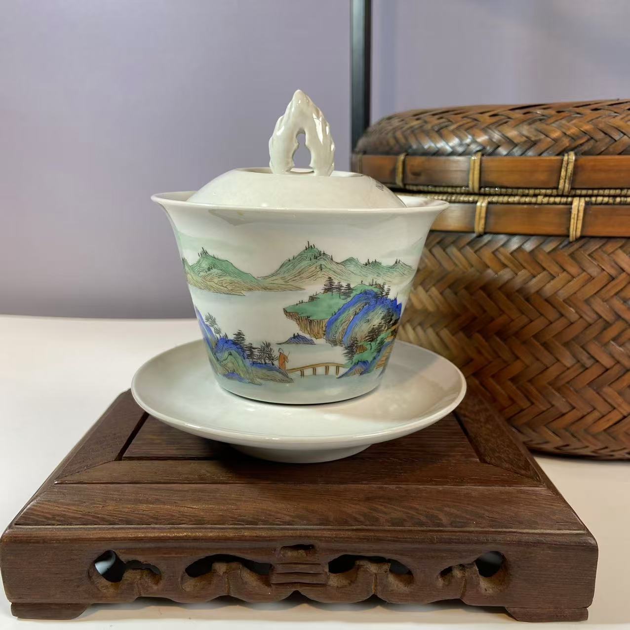 盖碗胎质洁白,碗身绘有青绿山水,山峦、树木、桥梁等景致生动,色彩搭配和谐,兼具艺术美感与文化韵味。盖钮造型别致,似火焰或祥云,增添独特设计感。搭配的白色碗托,承托盖碗,方便端拿。下方是雕花木制底座,古朴典雅