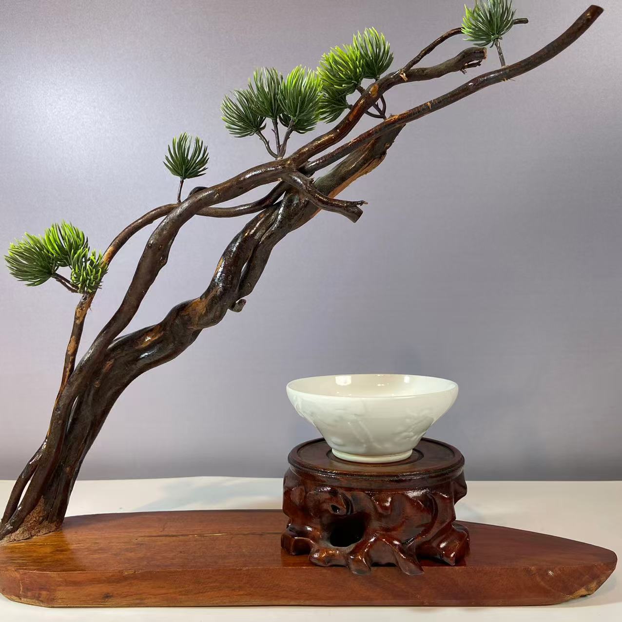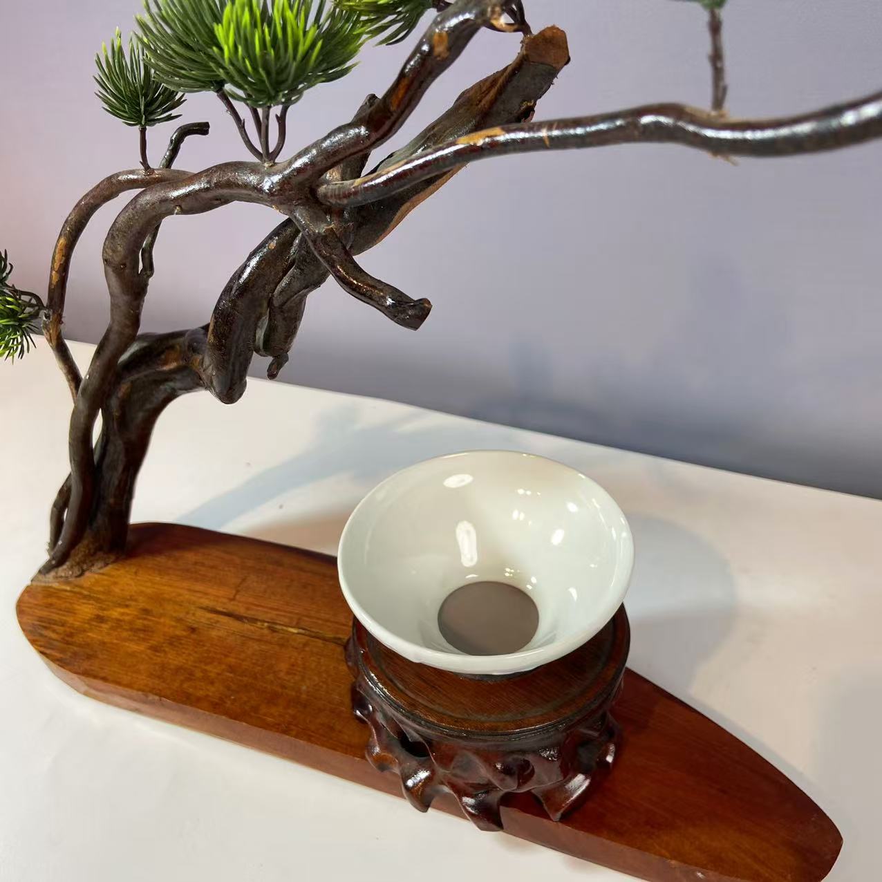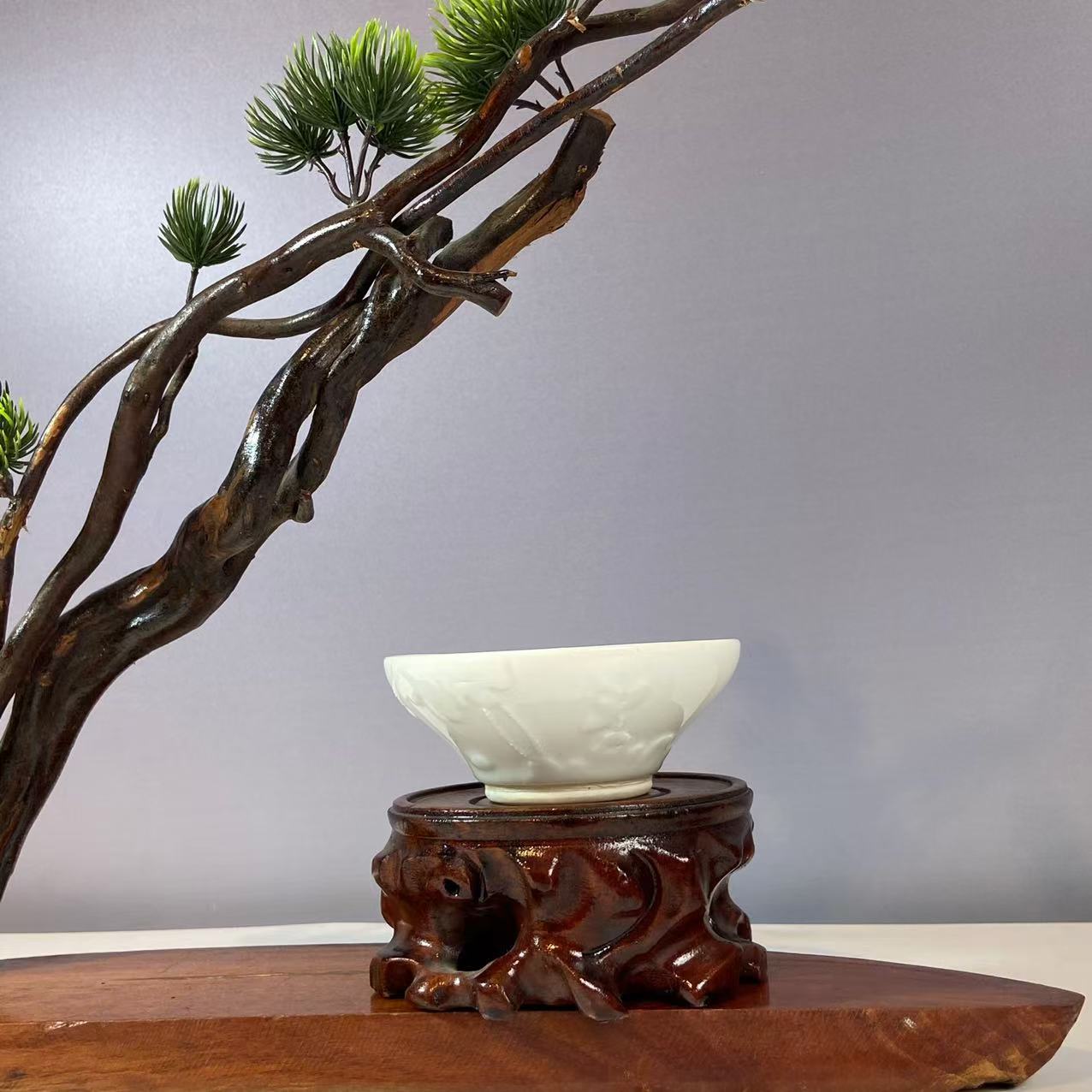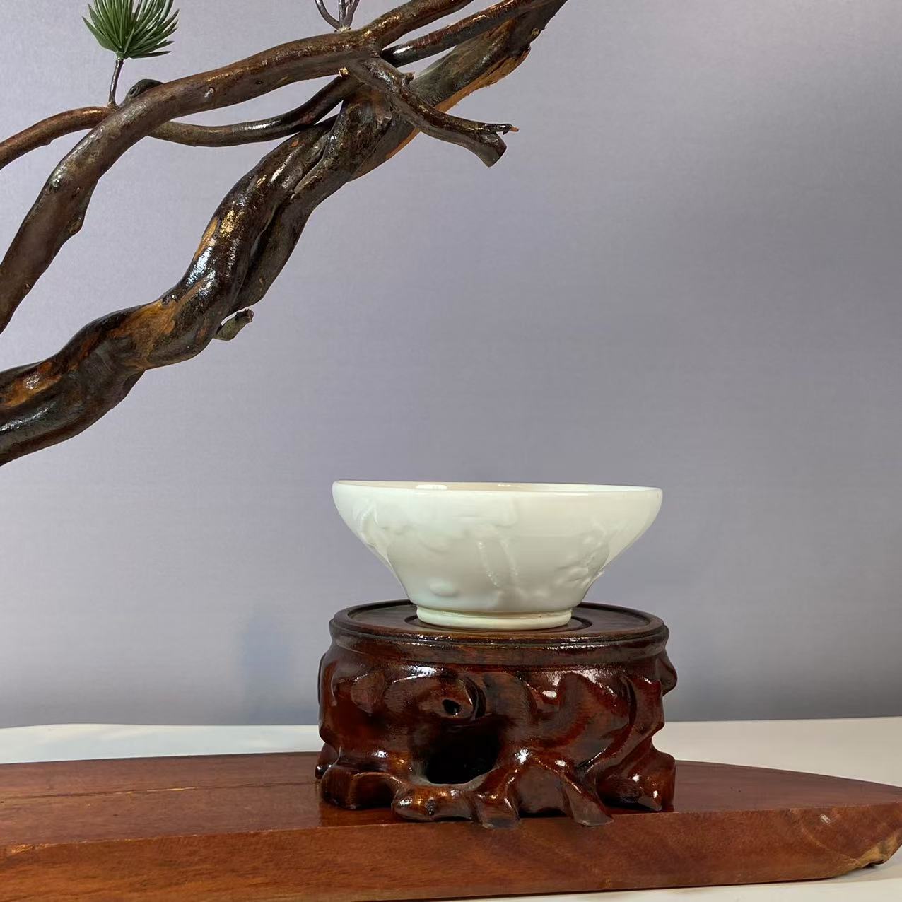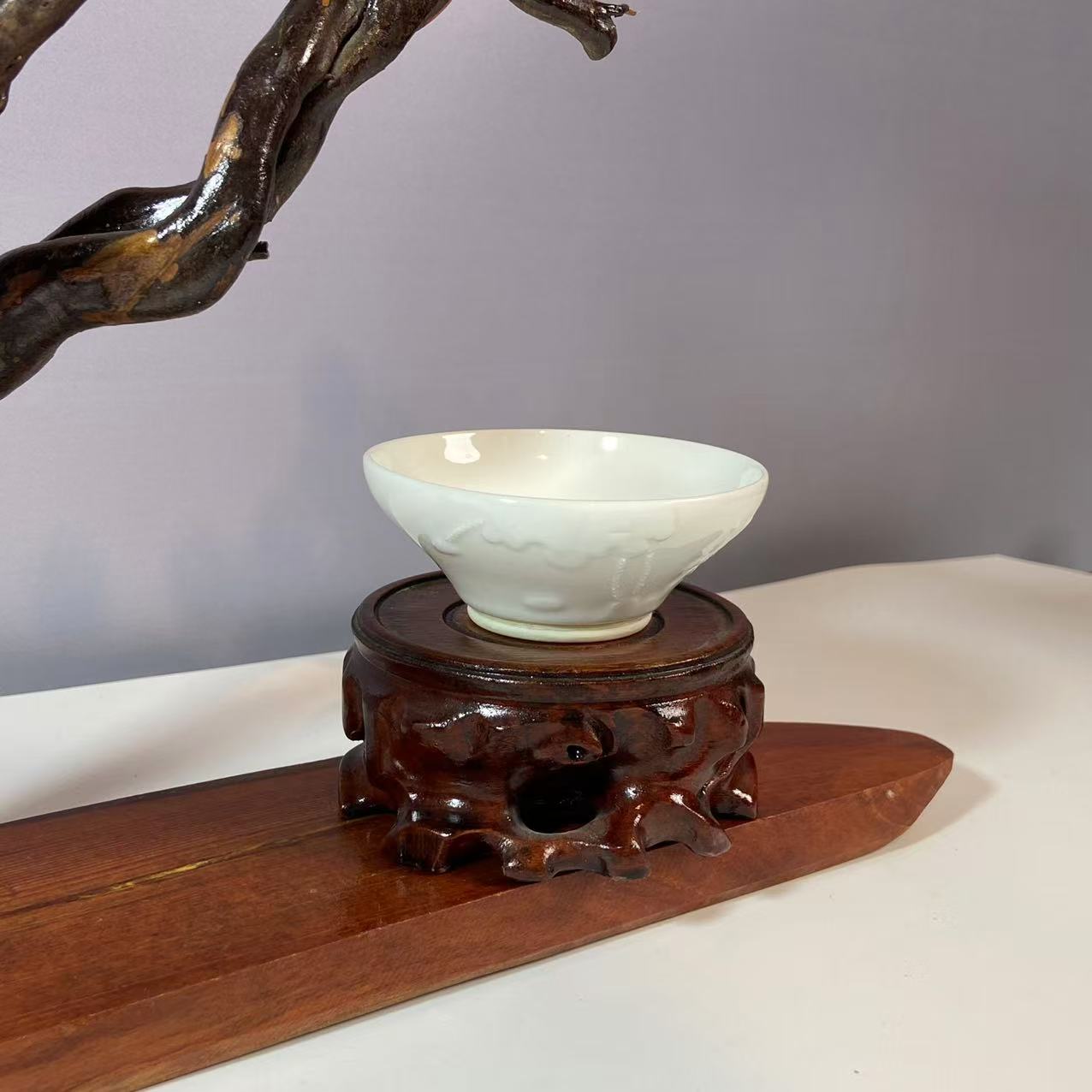 主体是一只白色的瓷质茶漏,茶碗可能采用了浮雕工艺,可见其上的花纹图案,显得素雅大方 。