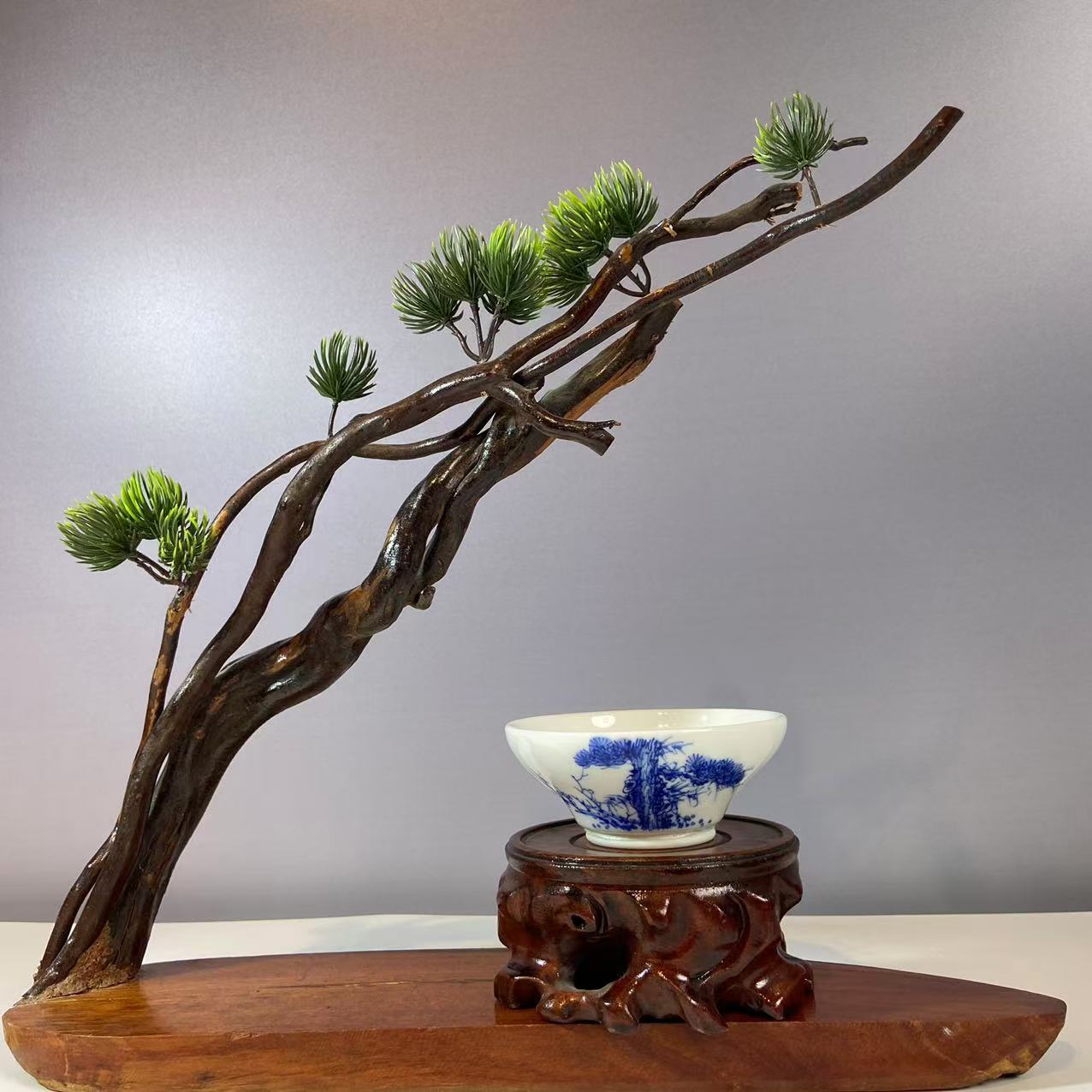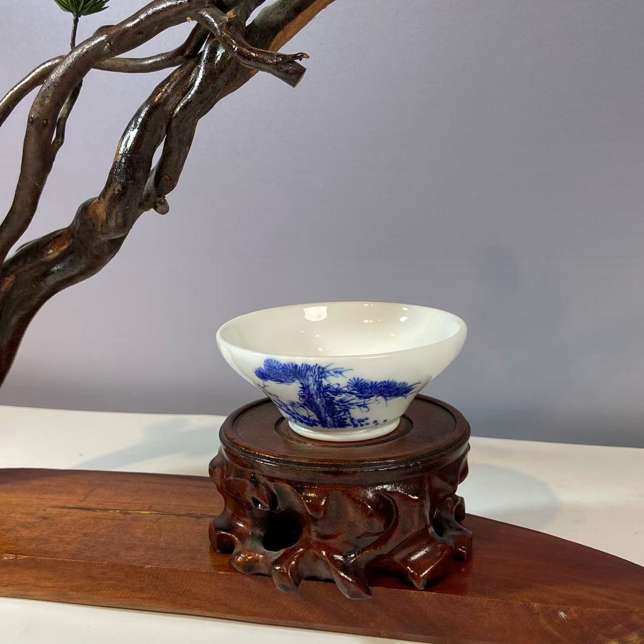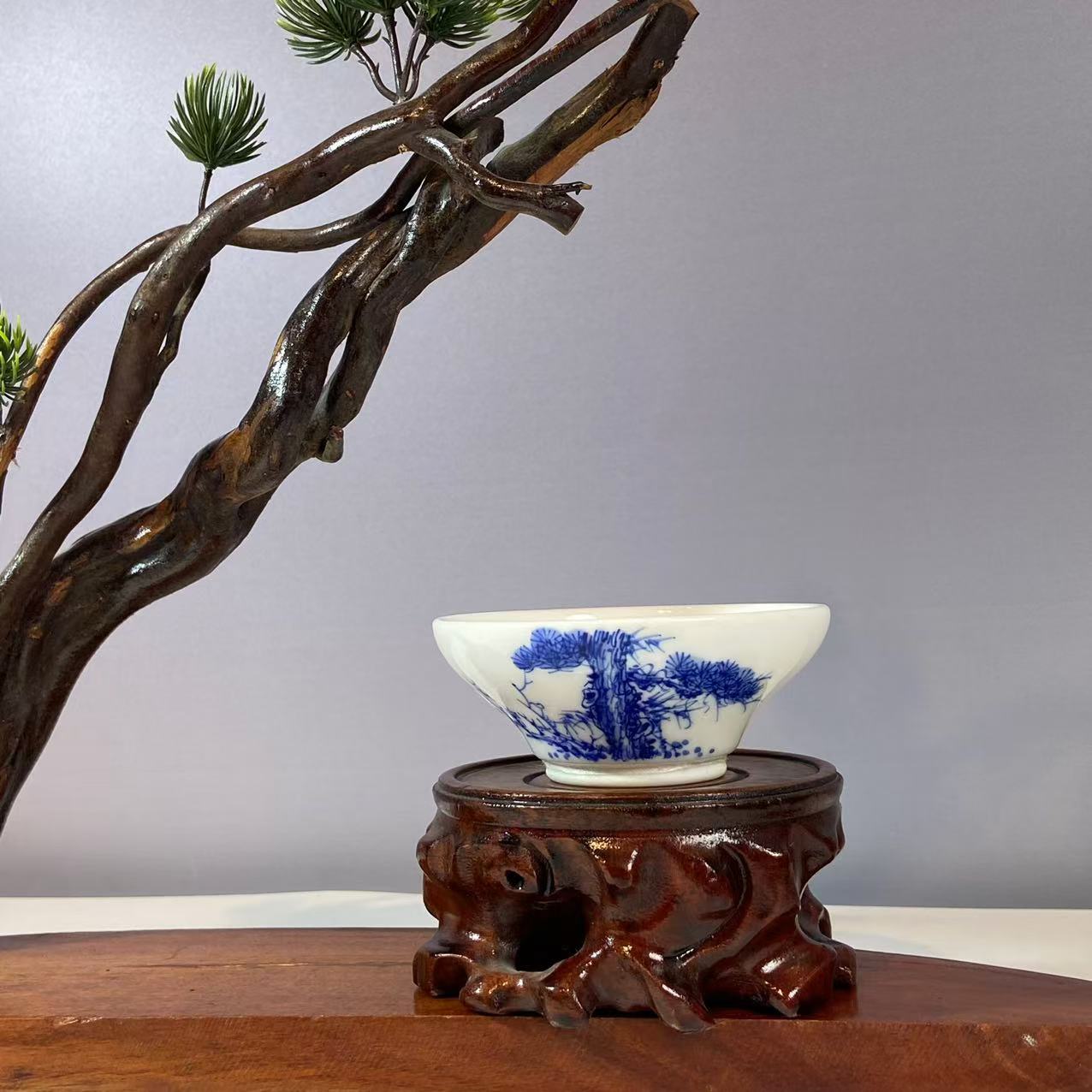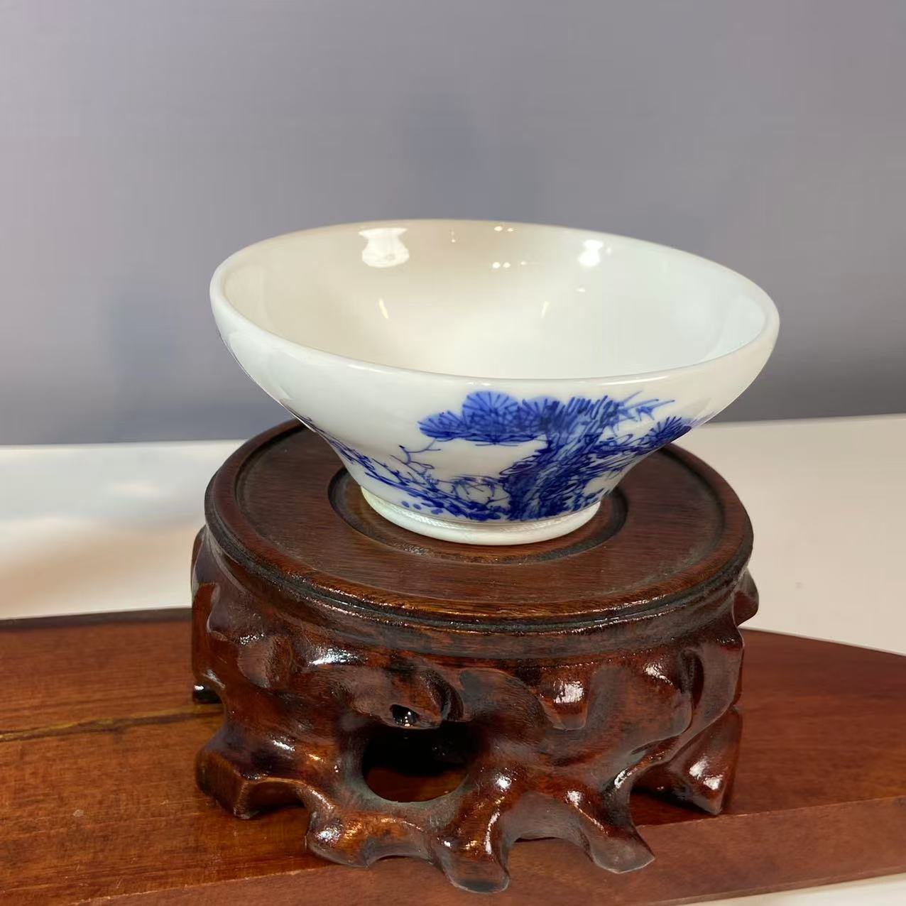 青花瓷茶杯,杯身以白色为底色,饰有蓝色的松树等图案 ,是典型的中国传统青花瓷风格,图案绘制细腻,青花发色沉稳,富有层次感,展现出中式传统绘画的意境美。