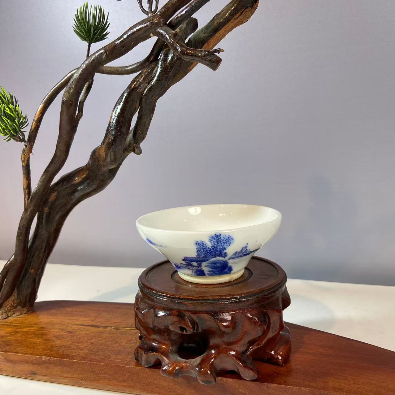 青花茶漏主体为纯净的白色,显得素雅大方 。在杯身靠近底部的位置,饰有蓝色的青花图案,虽然图案面积不大,但为杯子增添了几分雅致韵味,体现了传统青花瓷工艺特色。