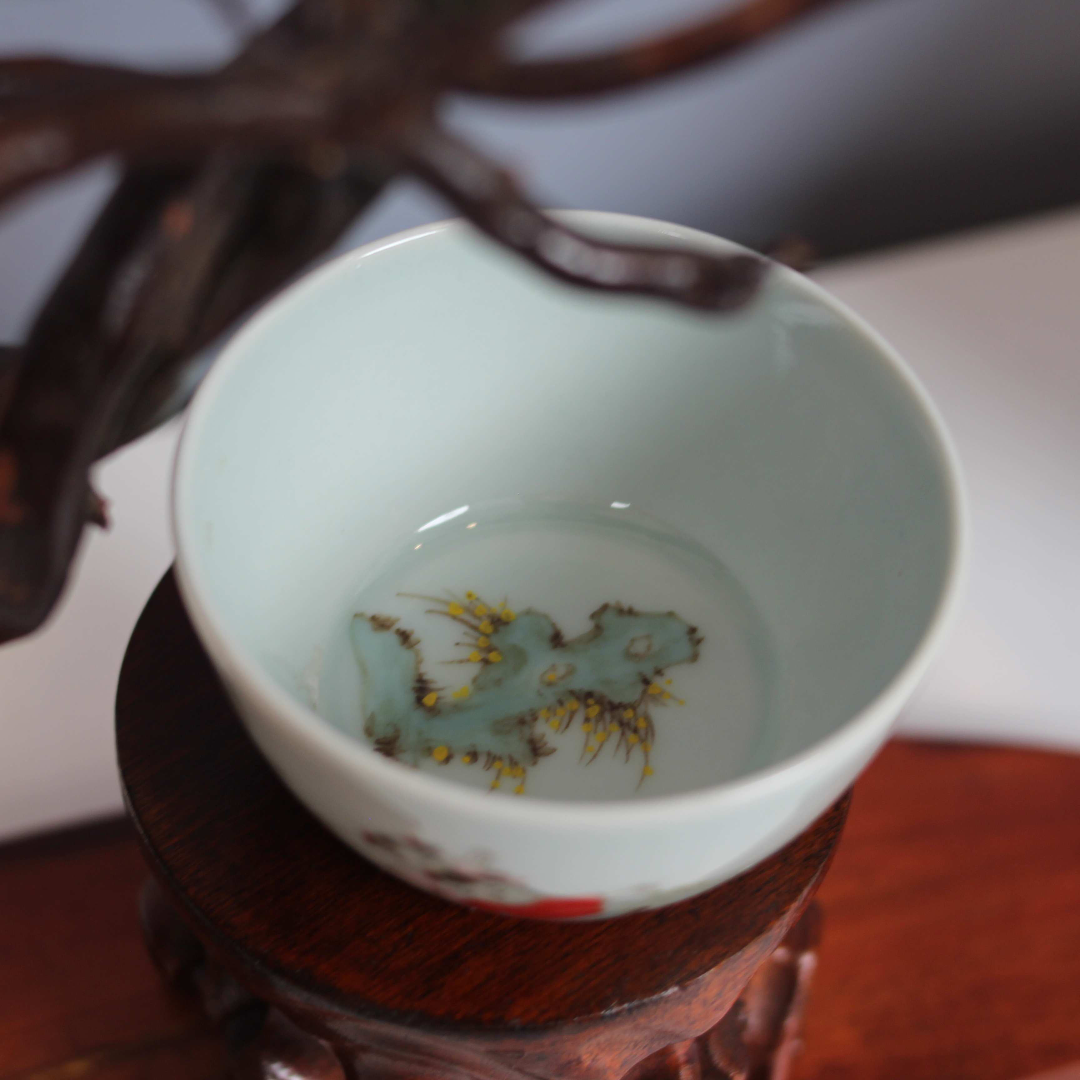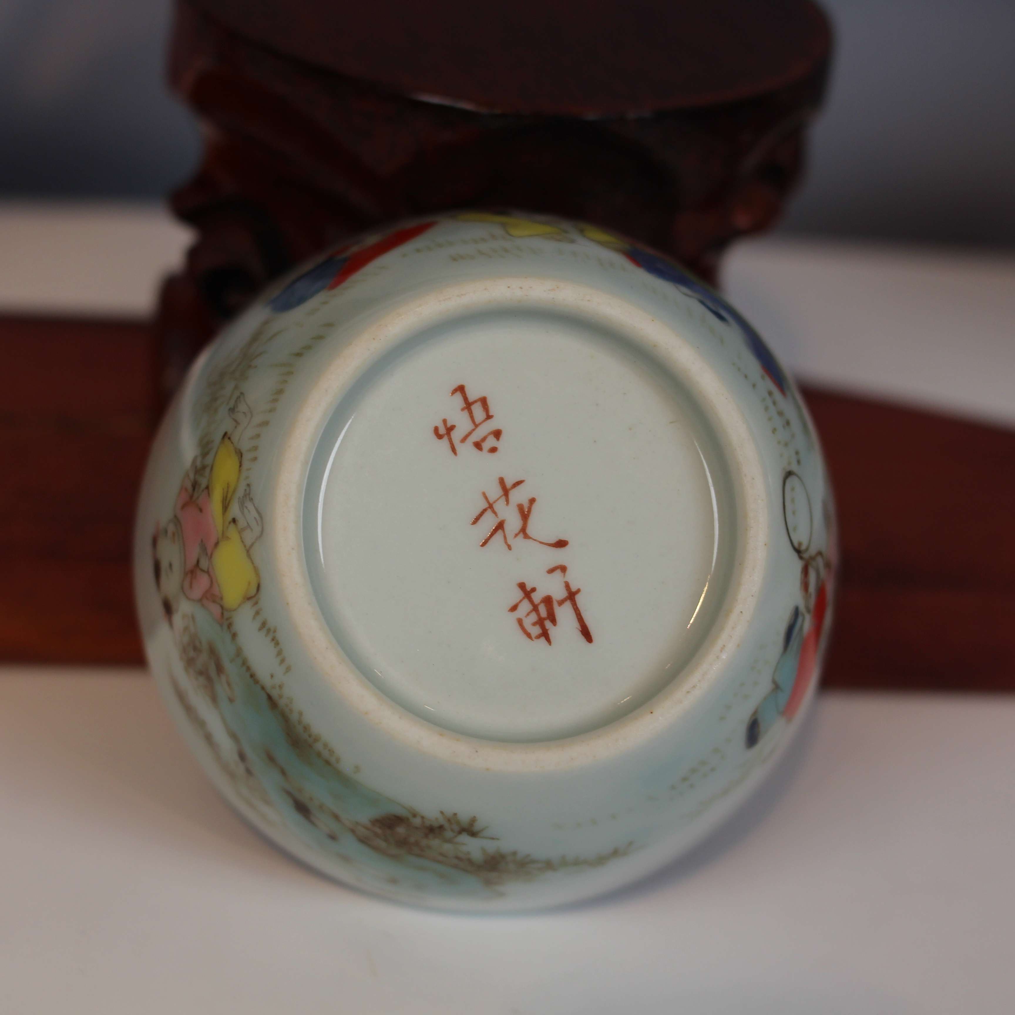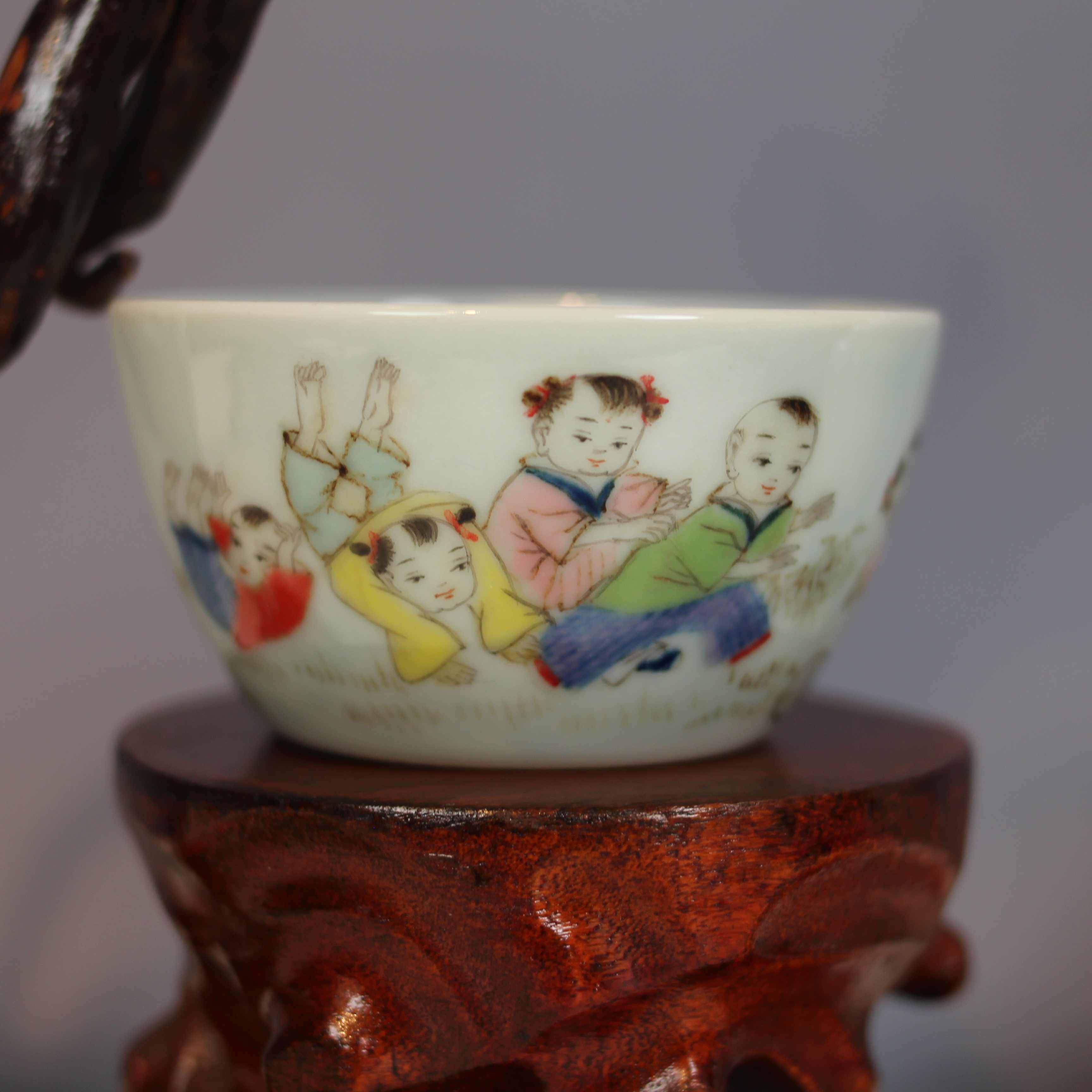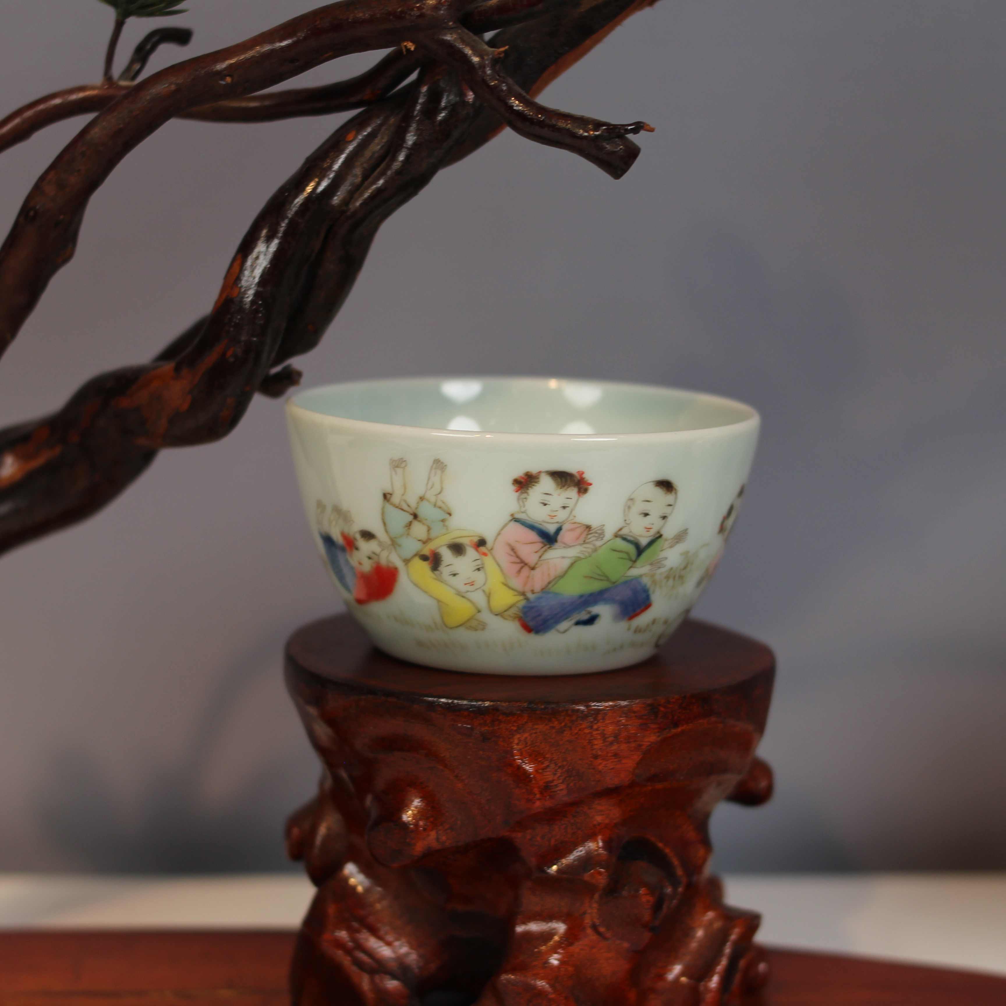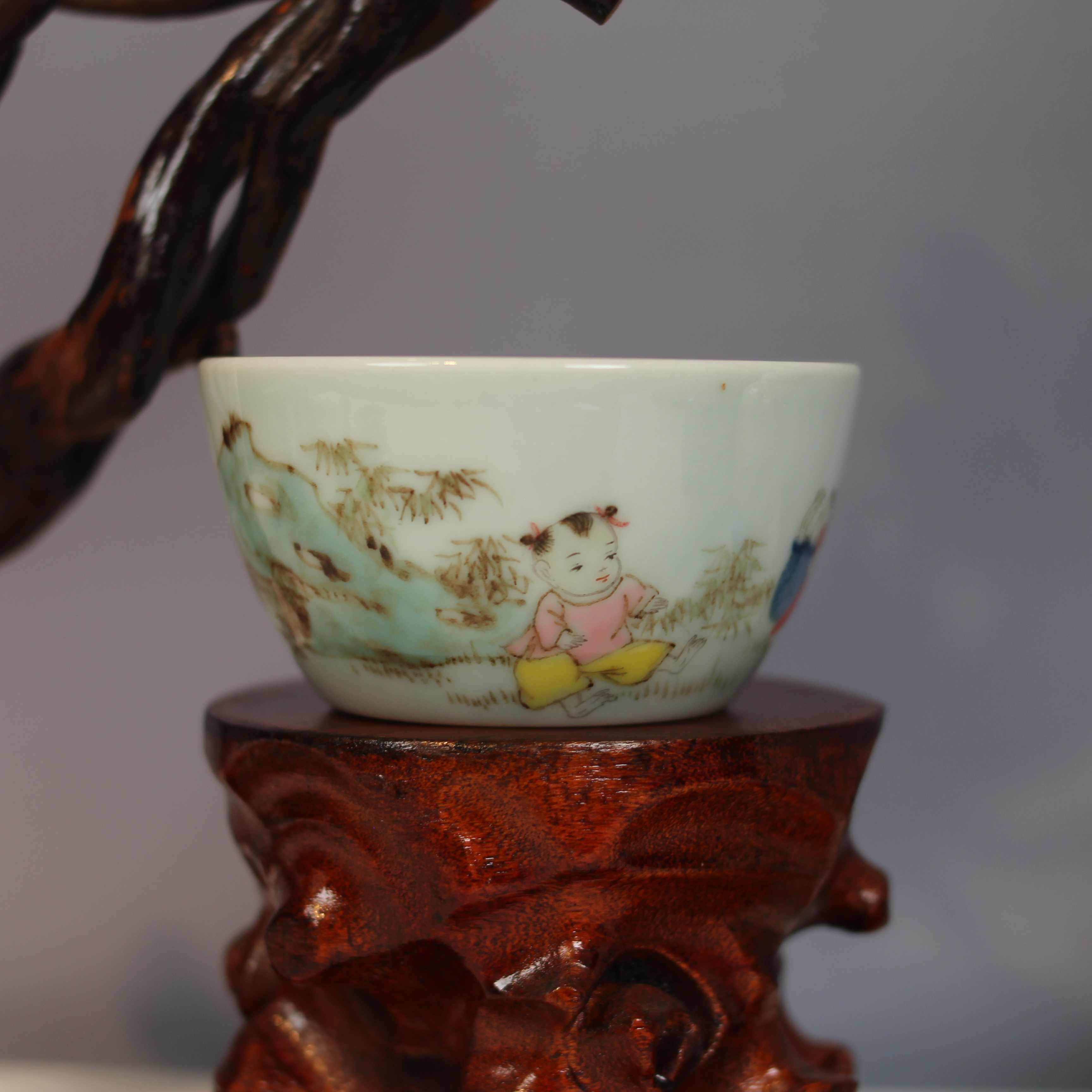 这只童子杯造型小巧,杯身以白色为底色,外壁绘制有童子等图案,童子梳着发髻,穿着色彩鲜艳的衣服 ,周围搭配山水等景致,营造出活泼又富有诗意的画面。