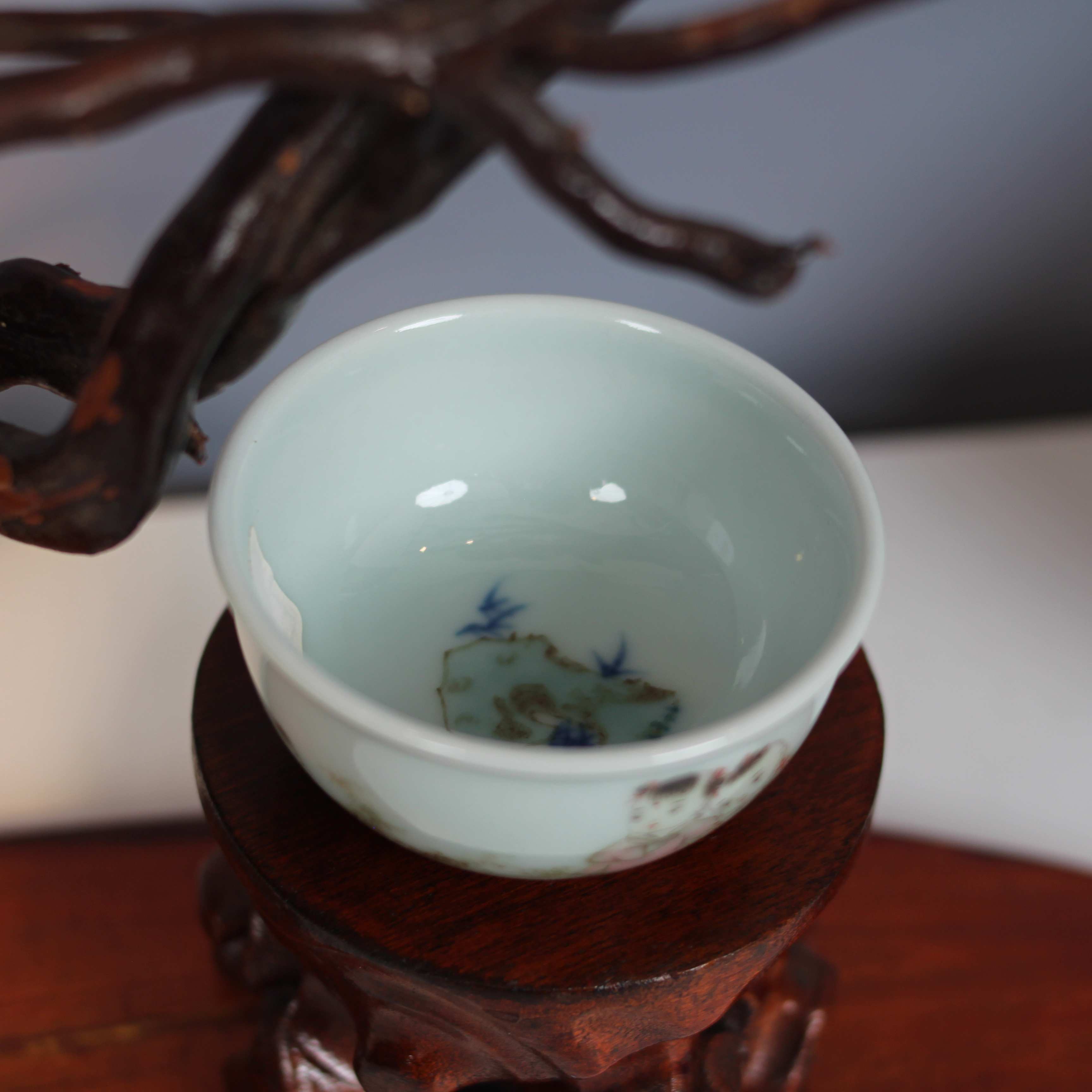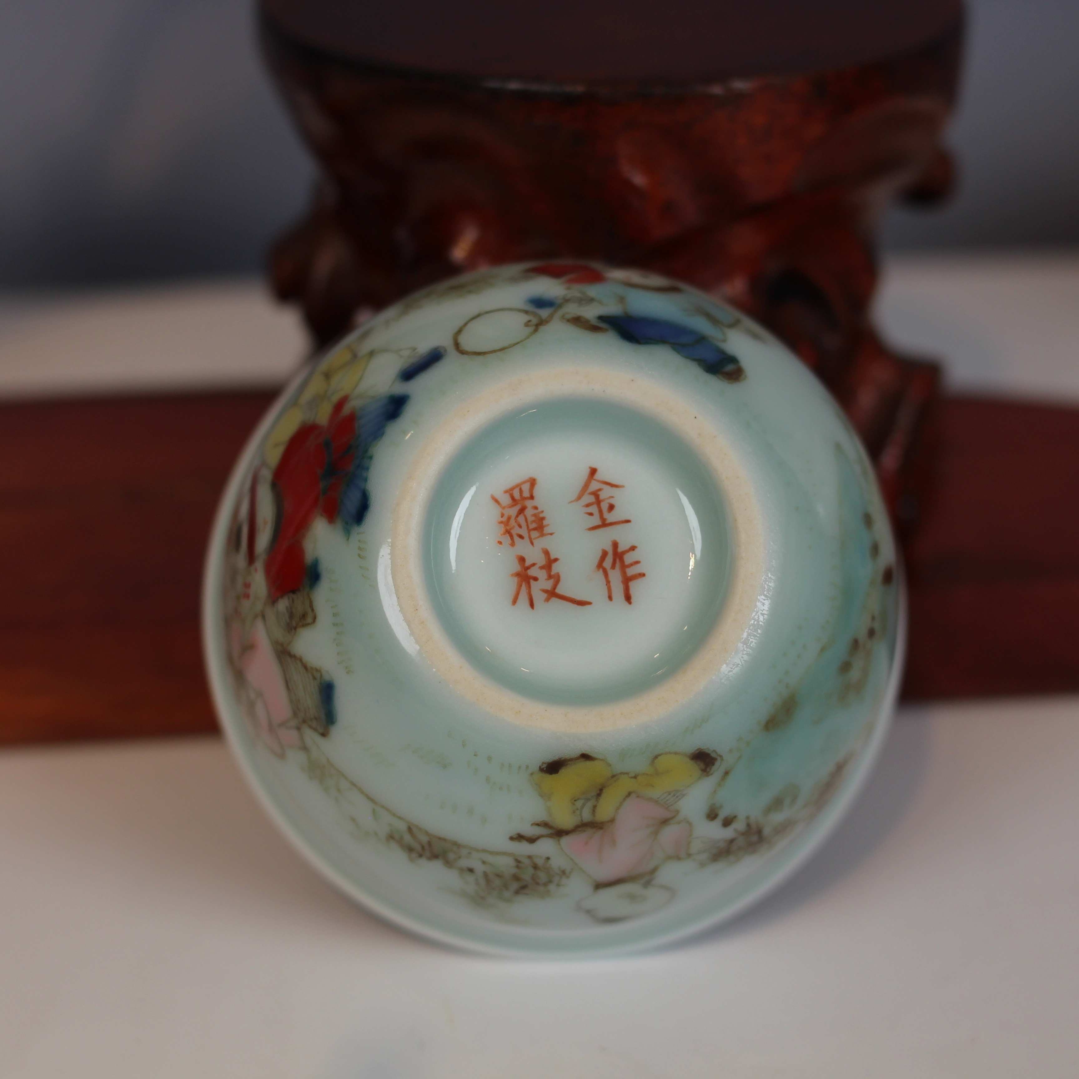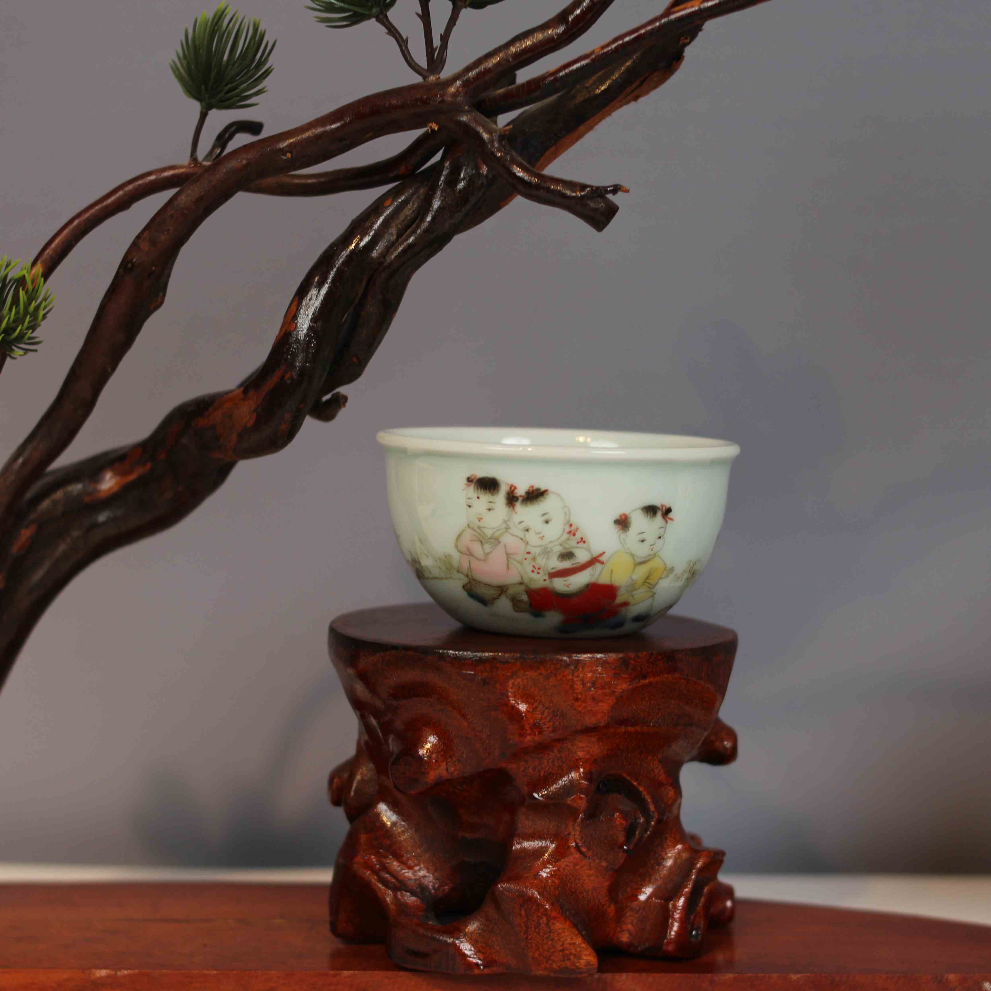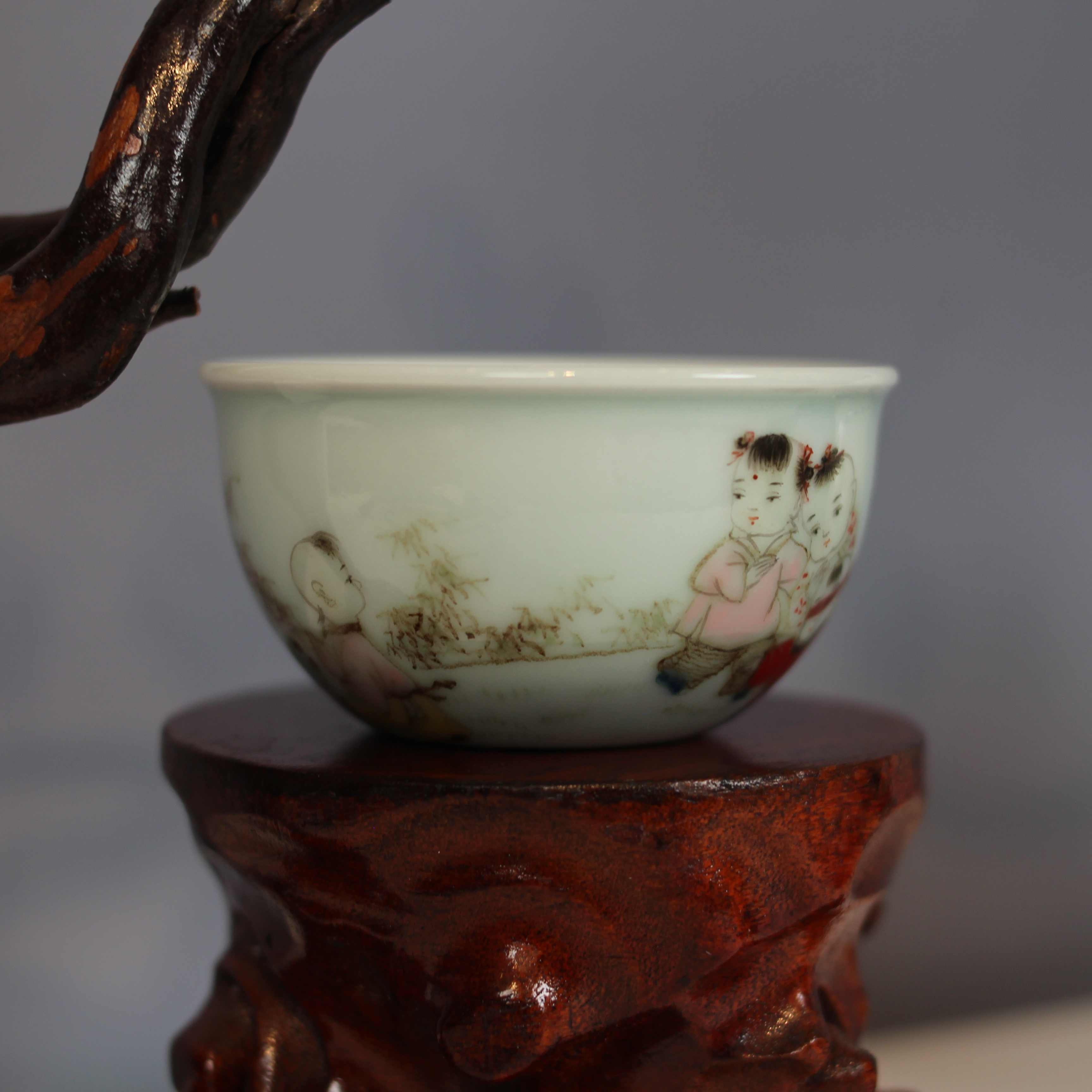 这只童子杯设计精巧,杯身绘有多个童子图案,童子形象生动活泼,或嬉戏玩耍,或结伴而行,周围还点缀着山水、草木等元素,整体画面充满童趣与生机。杯内也有细致的绘画装饰,色彩淡雅和谐。它可能是采用传统的陶瓷工艺制作而成,在中式茶具中具有一定的代表性,既可以作为实用的饮茶器具,也因其精美的绘画和独特的艺术风格,具有较高的观赏和收藏价值。