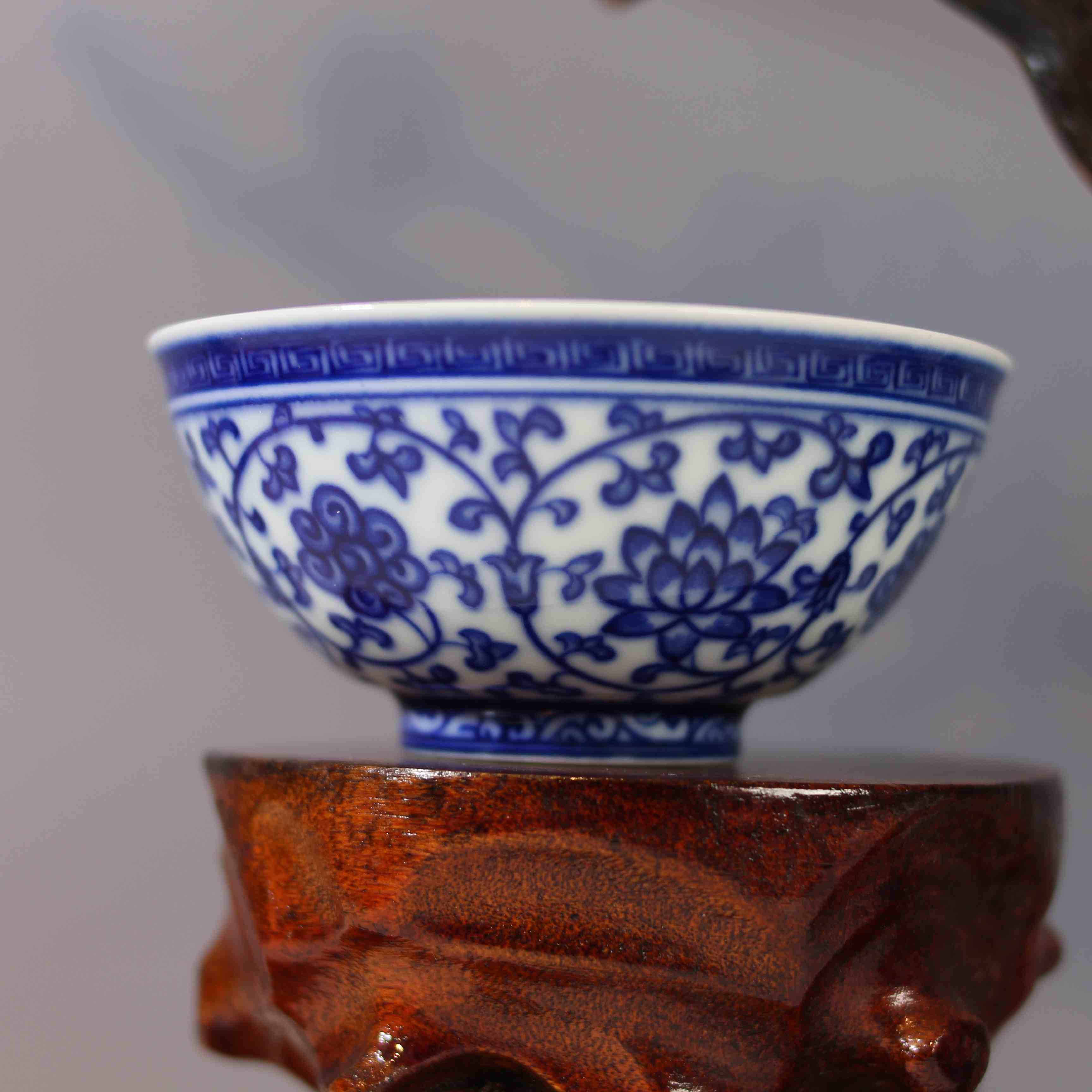 这是一只青花缠枝莲纹杯,以蓝白两色为主色调,白色为底色,其上绘制着蓝色的缠枝莲花纹饰,杯口边缘还有一圈蓝白相间的几何纹饰带。杯型简洁,底部有圈足。青花缠枝莲纹是中国传统瓷器装饰纹样,缠枝莲以藤蔓卷草缠绕,莲花点缀其中,寓意吉祥,象征生生不息、富贵连绵 ,常出现在各类瓷器上,具有较高的艺术欣赏价值和文化内涵
