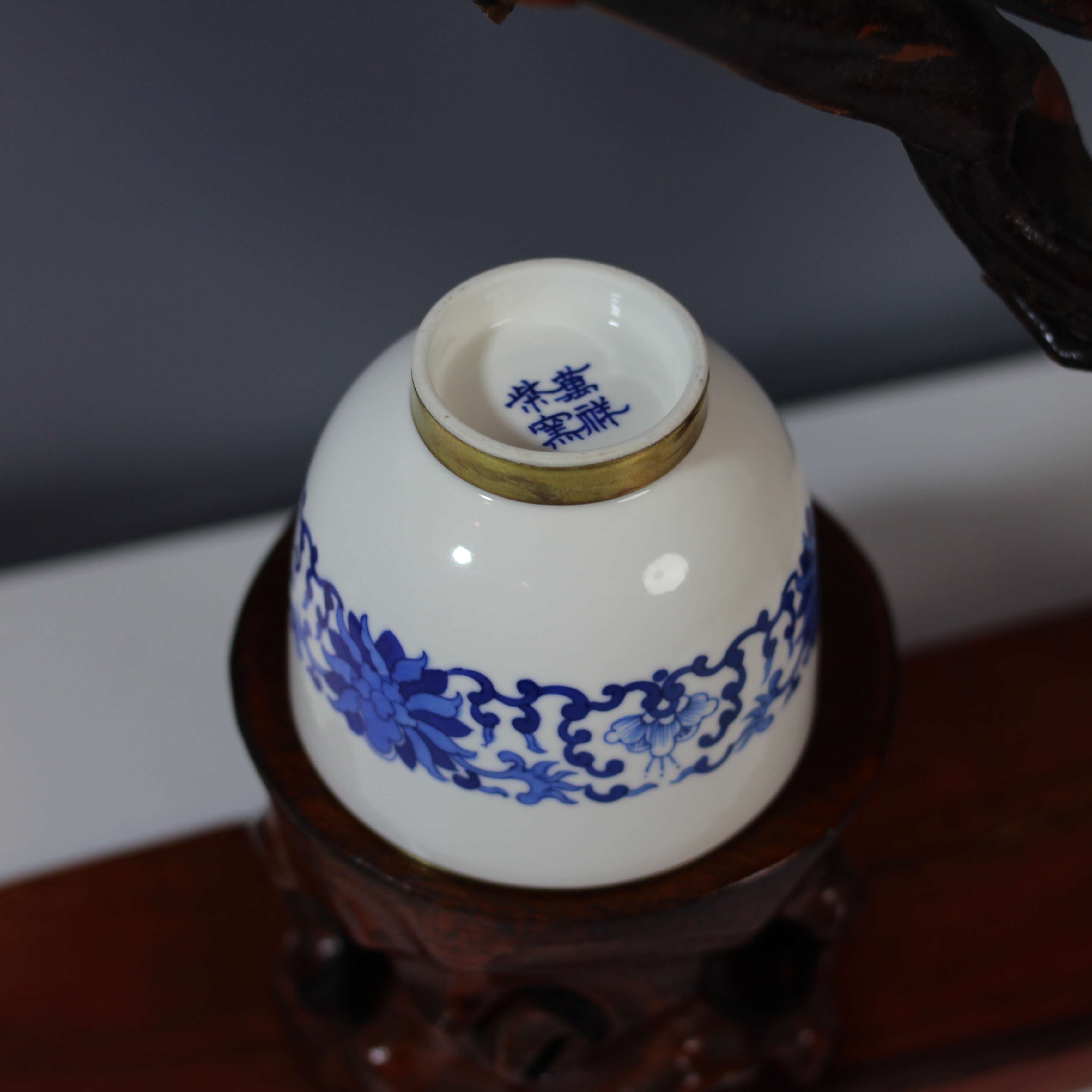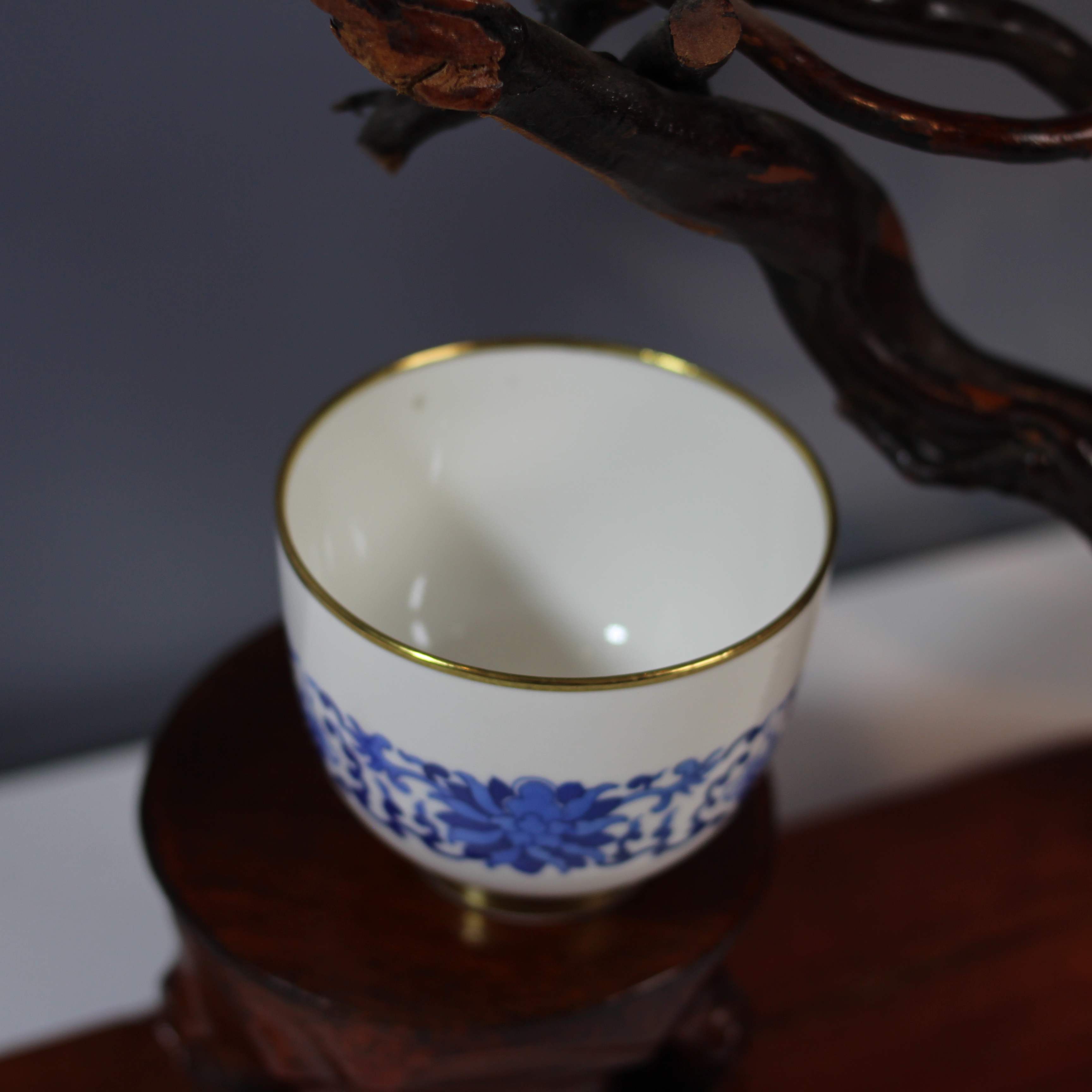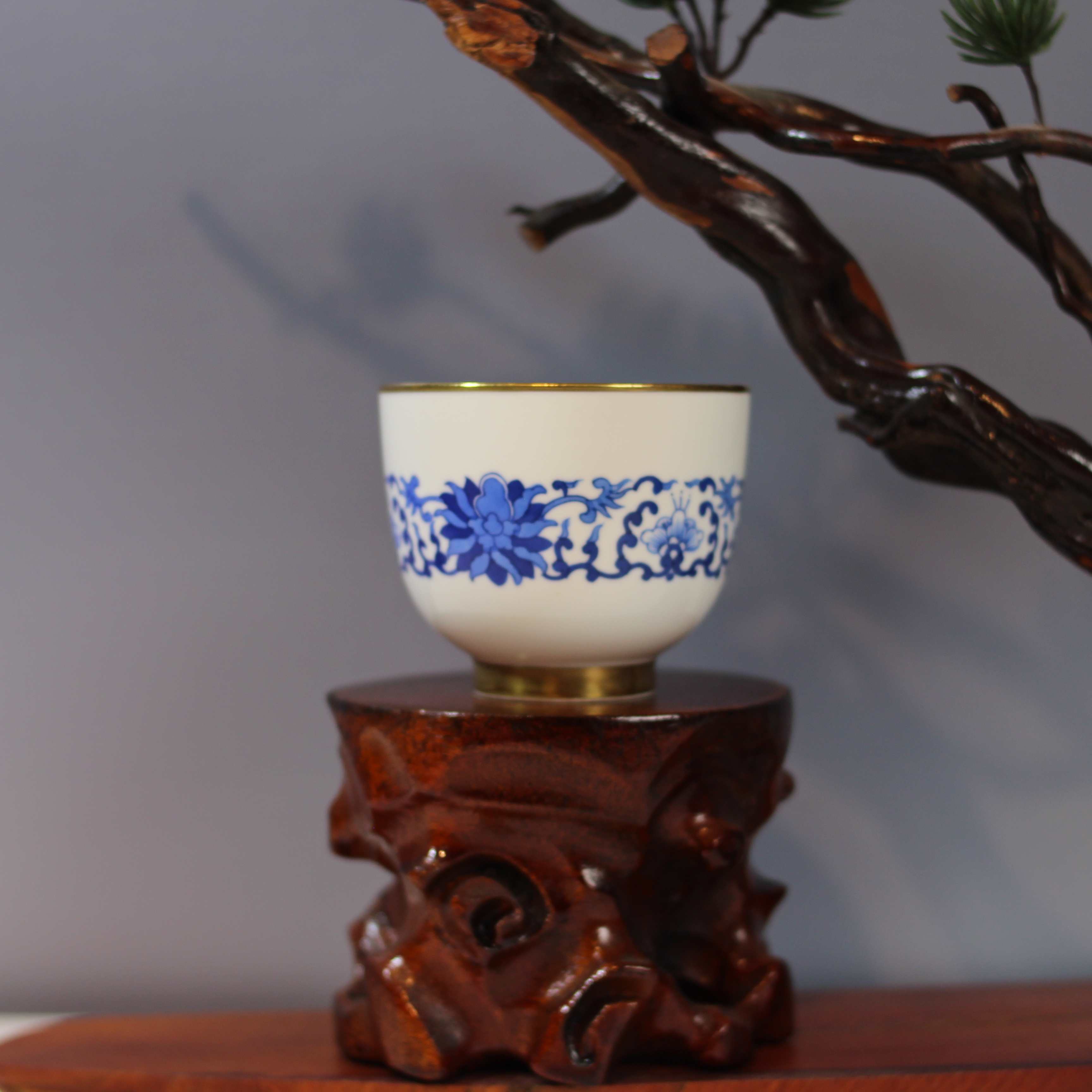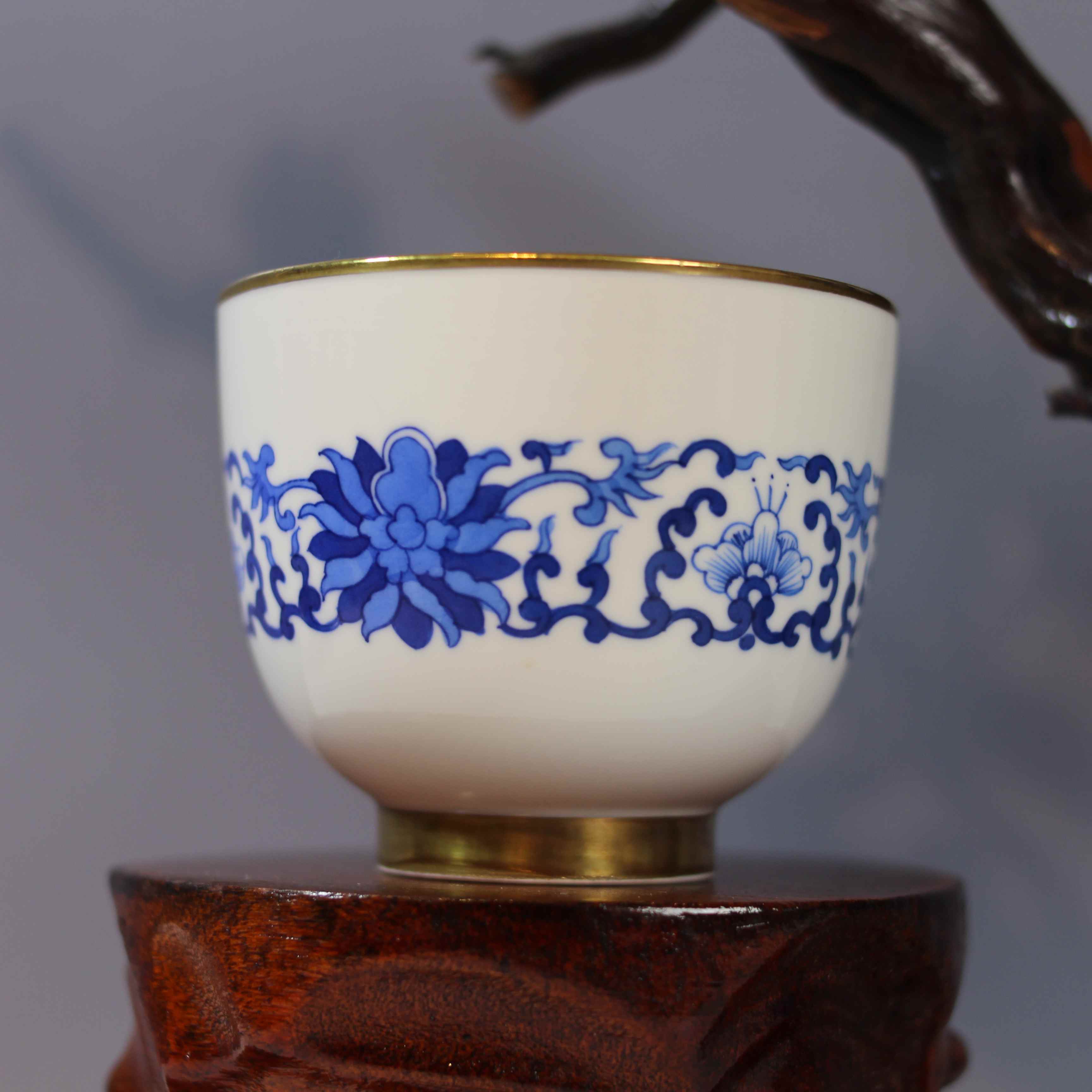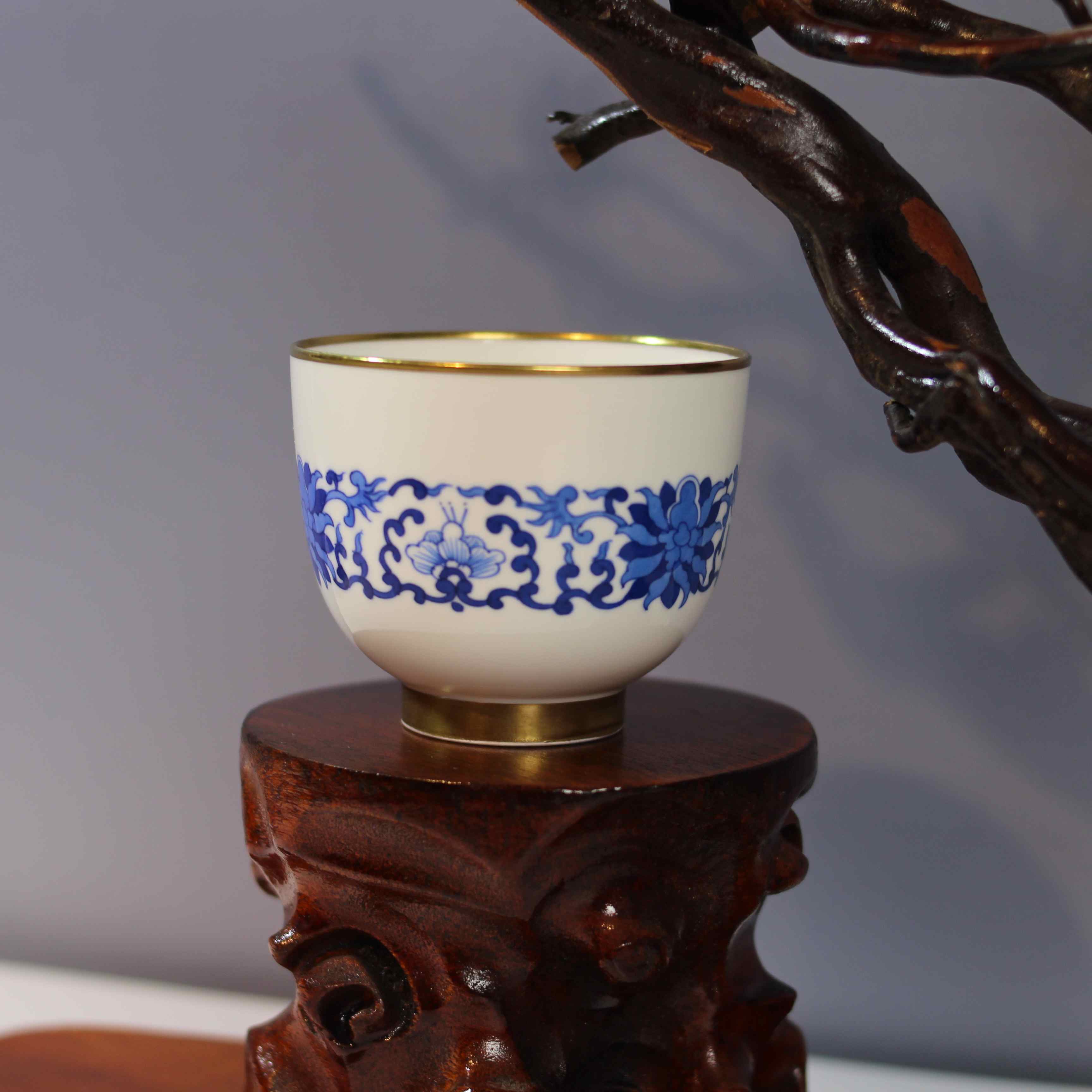 这是一只青花描金缠枝莲纹杯,属于瓷器茶具。以温润白瓷为胎,杯口与杯底饰有金色边框,增添华贵质感。杯身绘经典青花缠枝莲纹,蓝色花卉藤蔓婉转,兼具传统韵味与精致工艺,实用又具艺术观赏性,常用于品茗,尽显雅致。