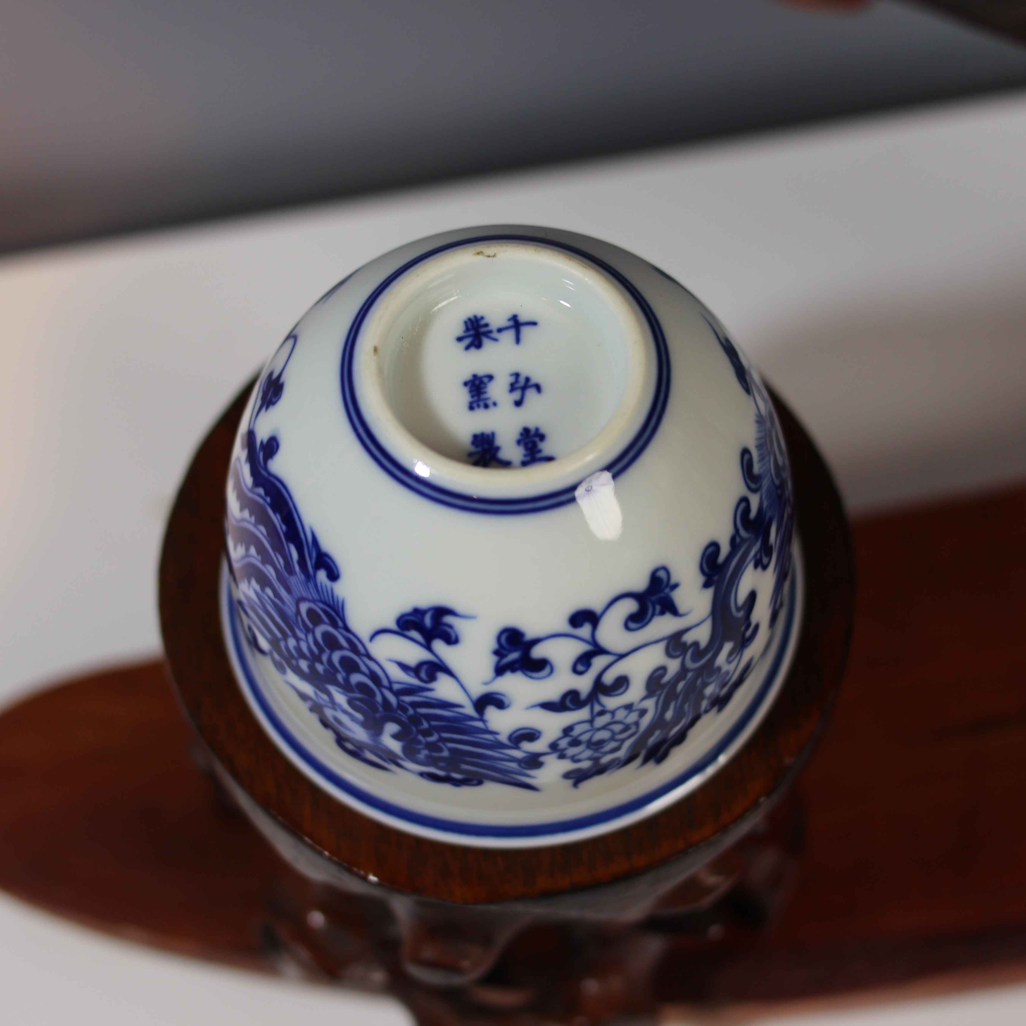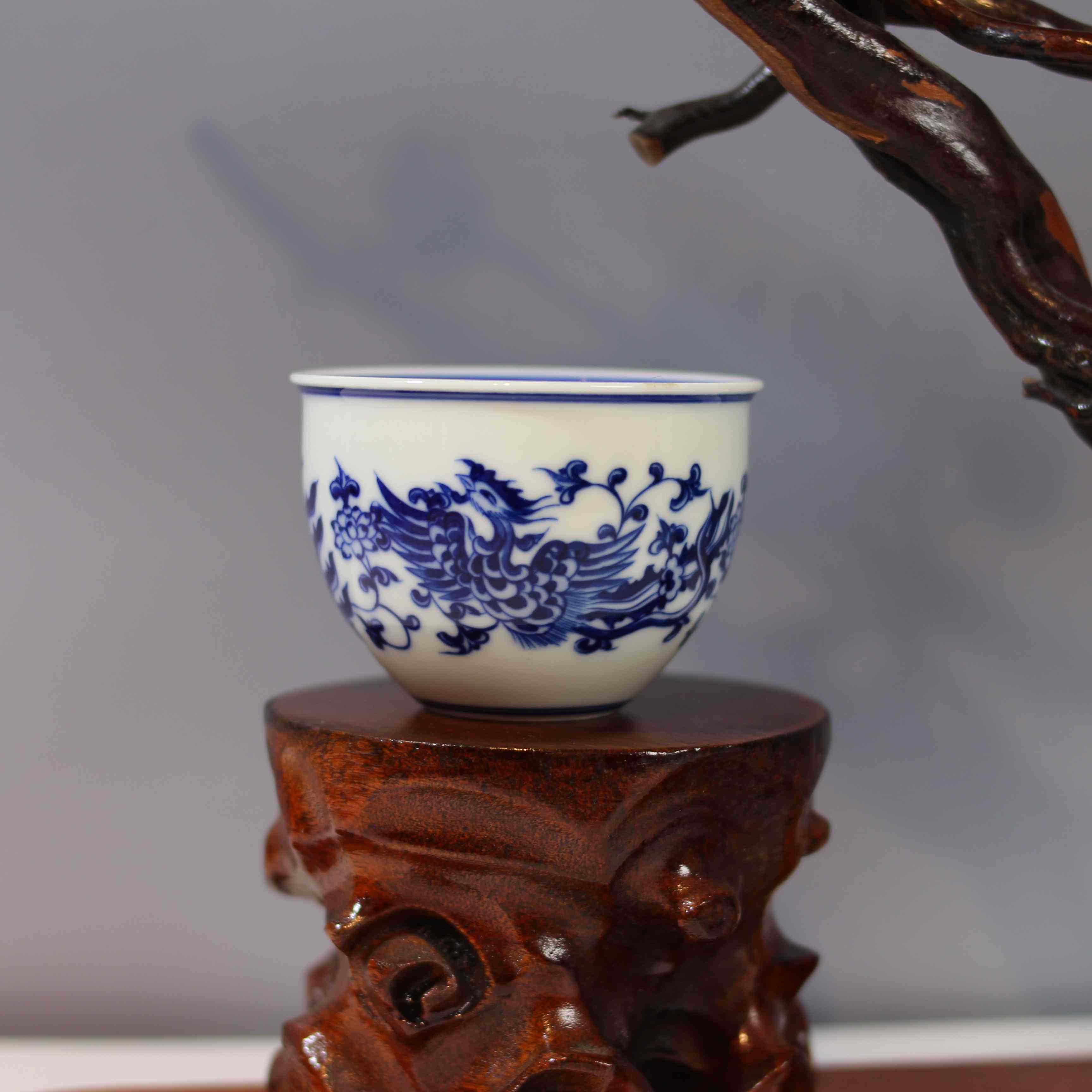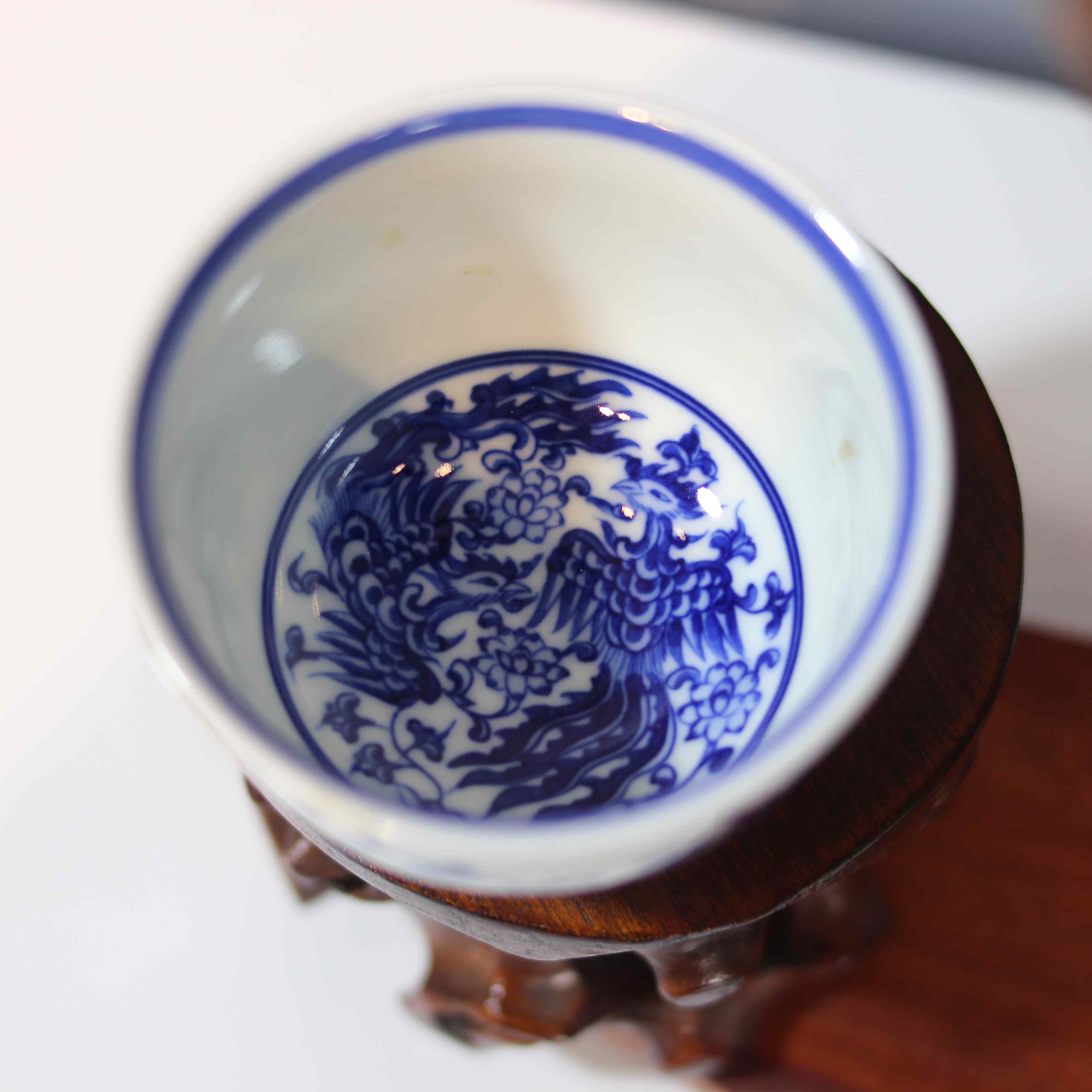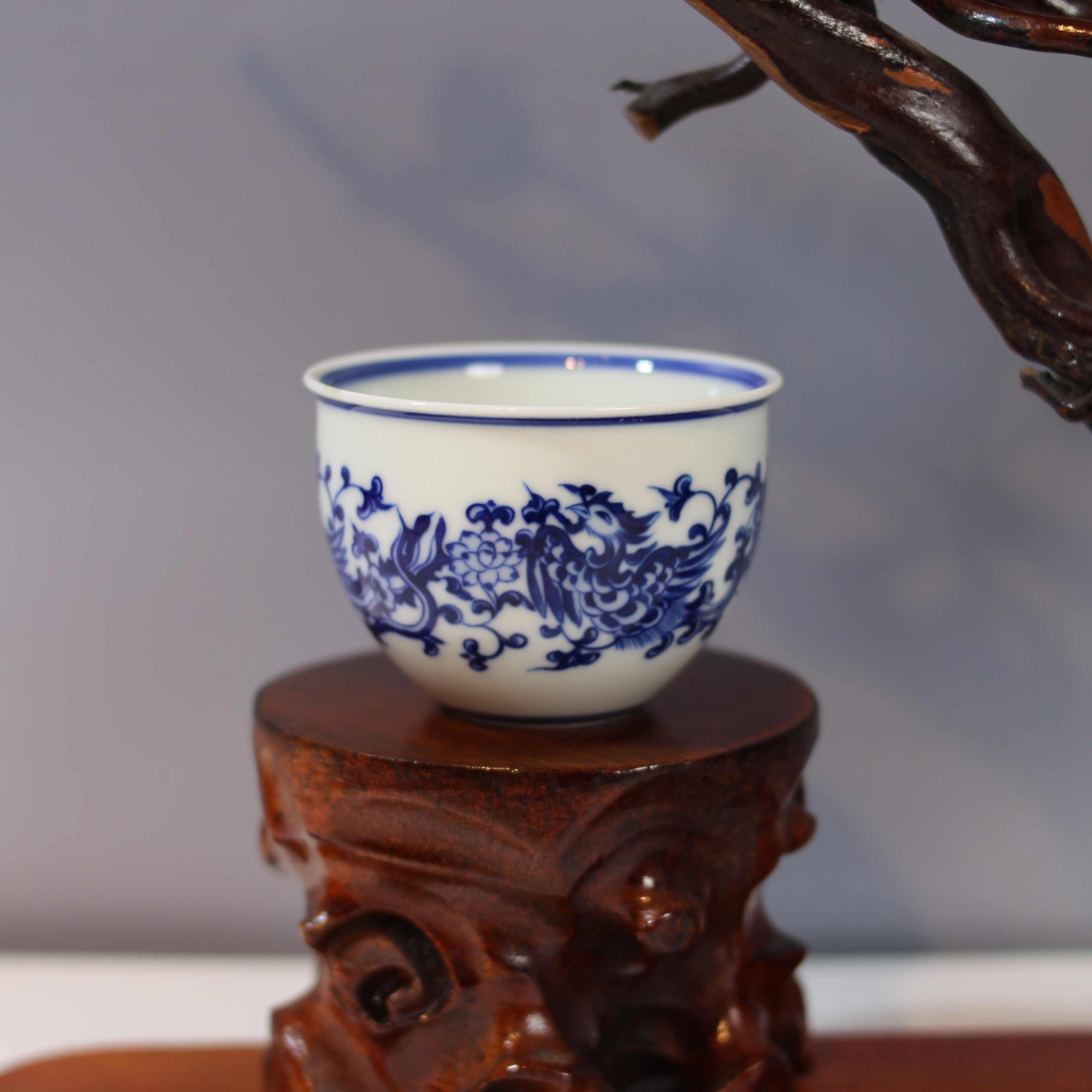 这是一只青花凤穿花纹茶杯,属于传统中式瓷器茶具。杯身以白瓷为底,采用经典的青花工艺绘制图案。图案中,凤凰身姿矫健,羽翼刻画细腻,穿梭于缠枝花卉之间,线条流畅生动