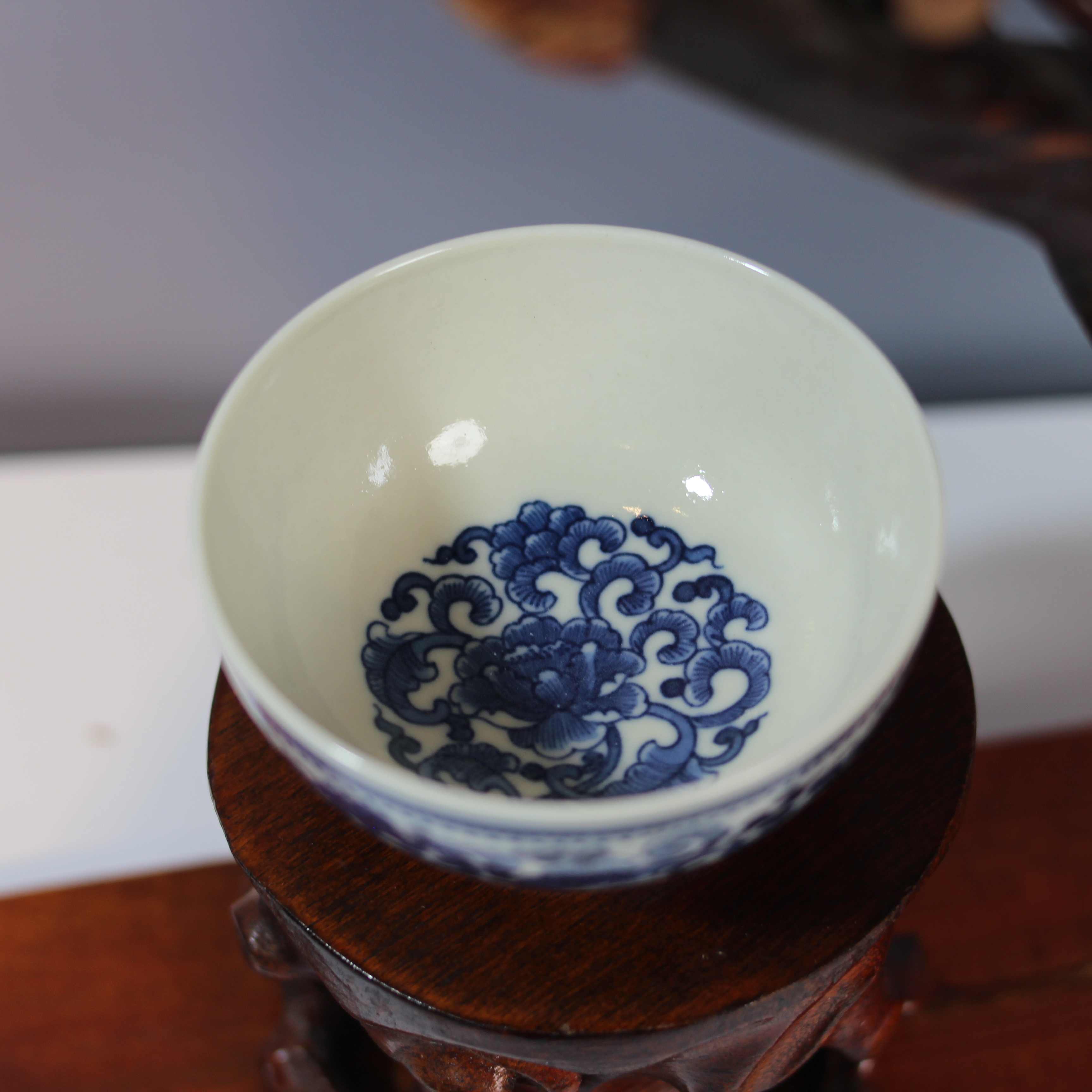 这是一只青花缠枝牡丹纹杯,属于传统中式瓷器茶具。