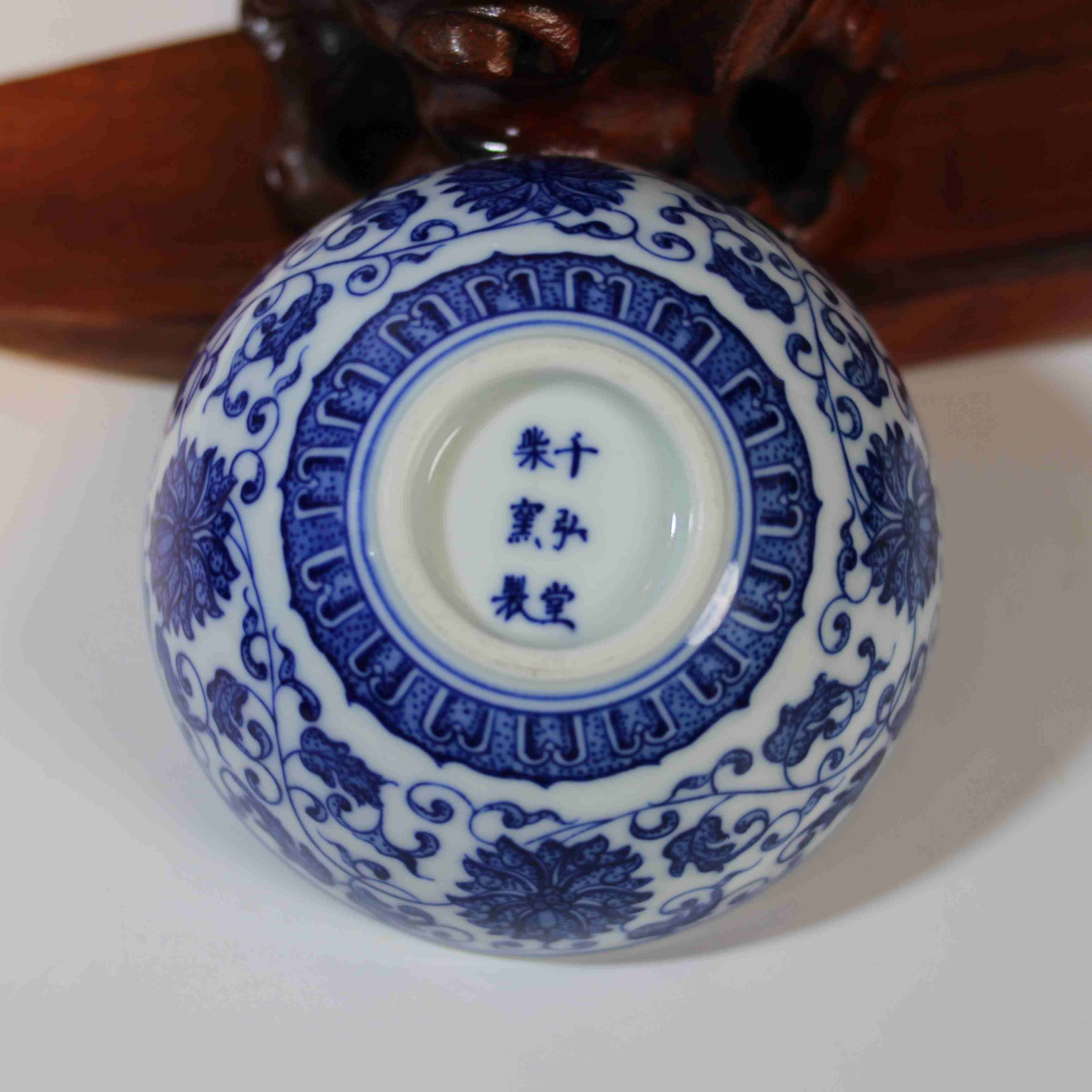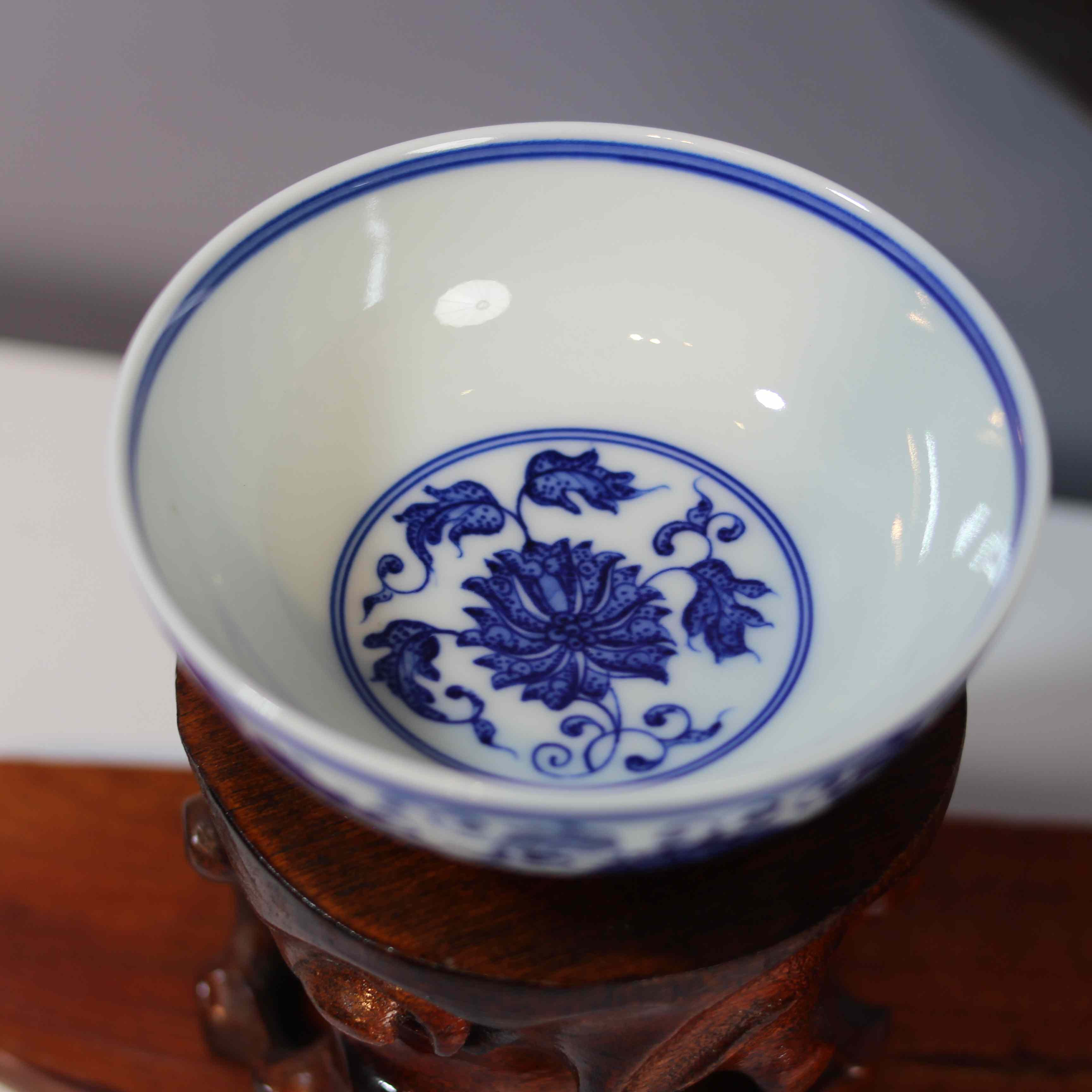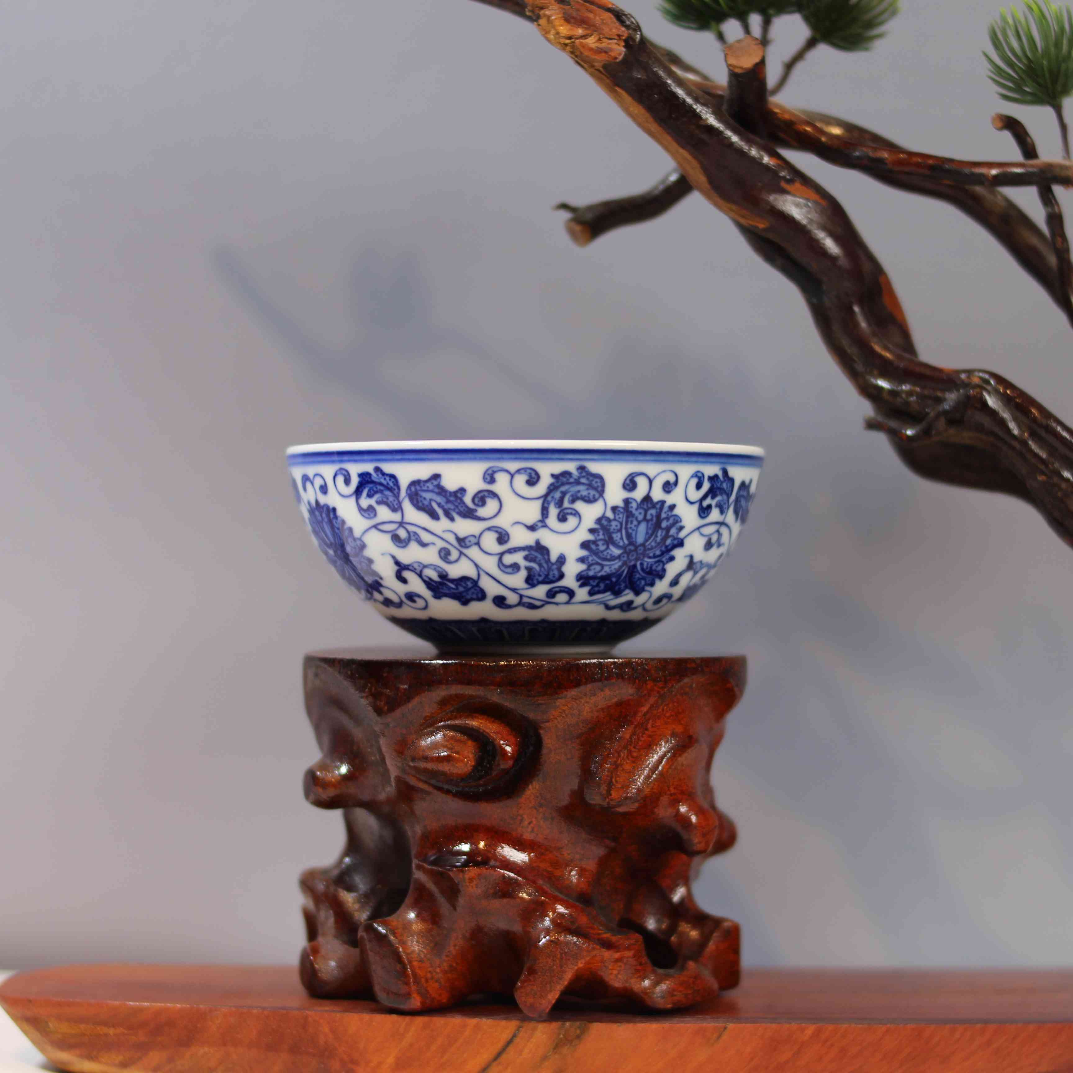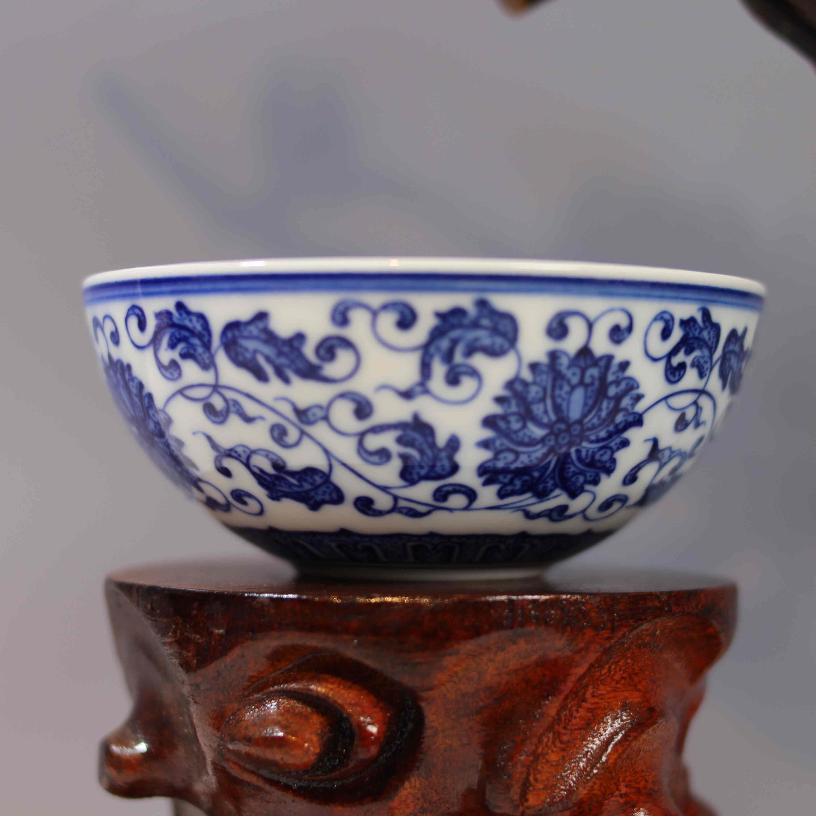 青花缠枝莲纹茶杯,属传统中式瓷器茶具。它采用青花瓷工艺,以白色瓷胎为底,用钴料绘制纹饰后经高温烧制,呈现出稳定而亮丽的蓝色花纹。纹饰上,杯身描绘了缠枝莲图案, 缠枝线条婉转灵动,莲花造型优美,花瓣层次丰富,富有动感和韵律。莲花在传统文化中有纯洁、吉祥的寓意,缠枝莲纹则象征着生生不息、富贵绵延 。