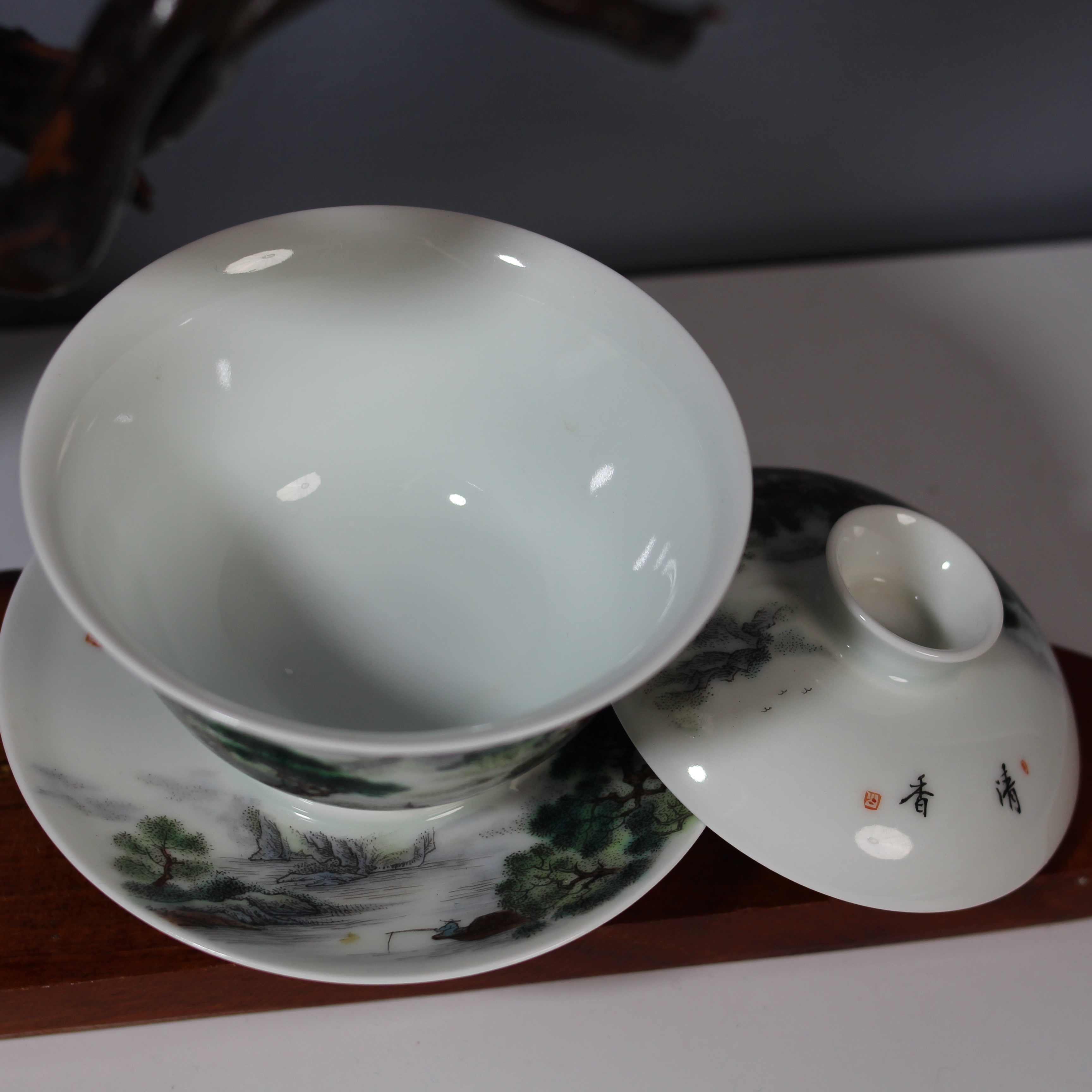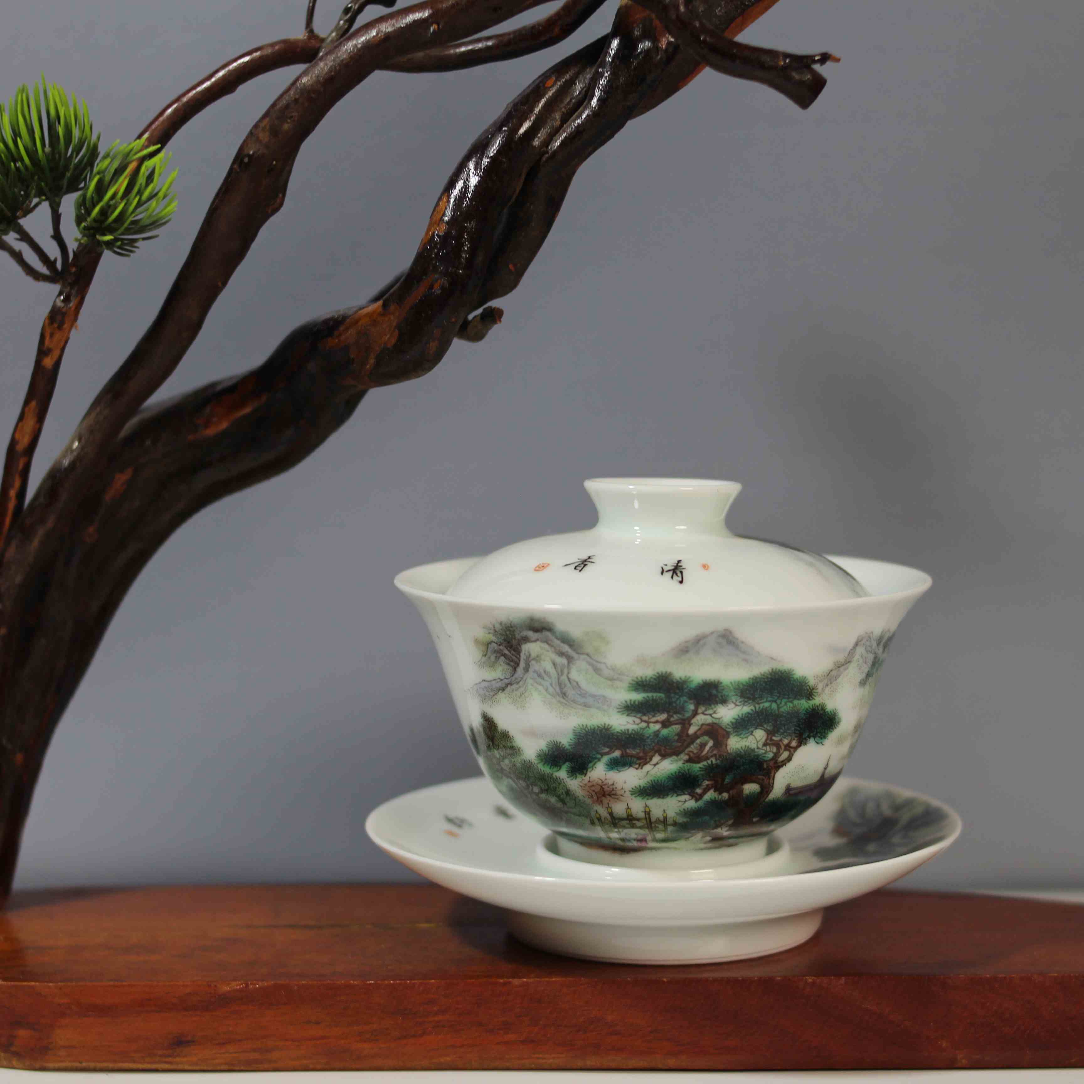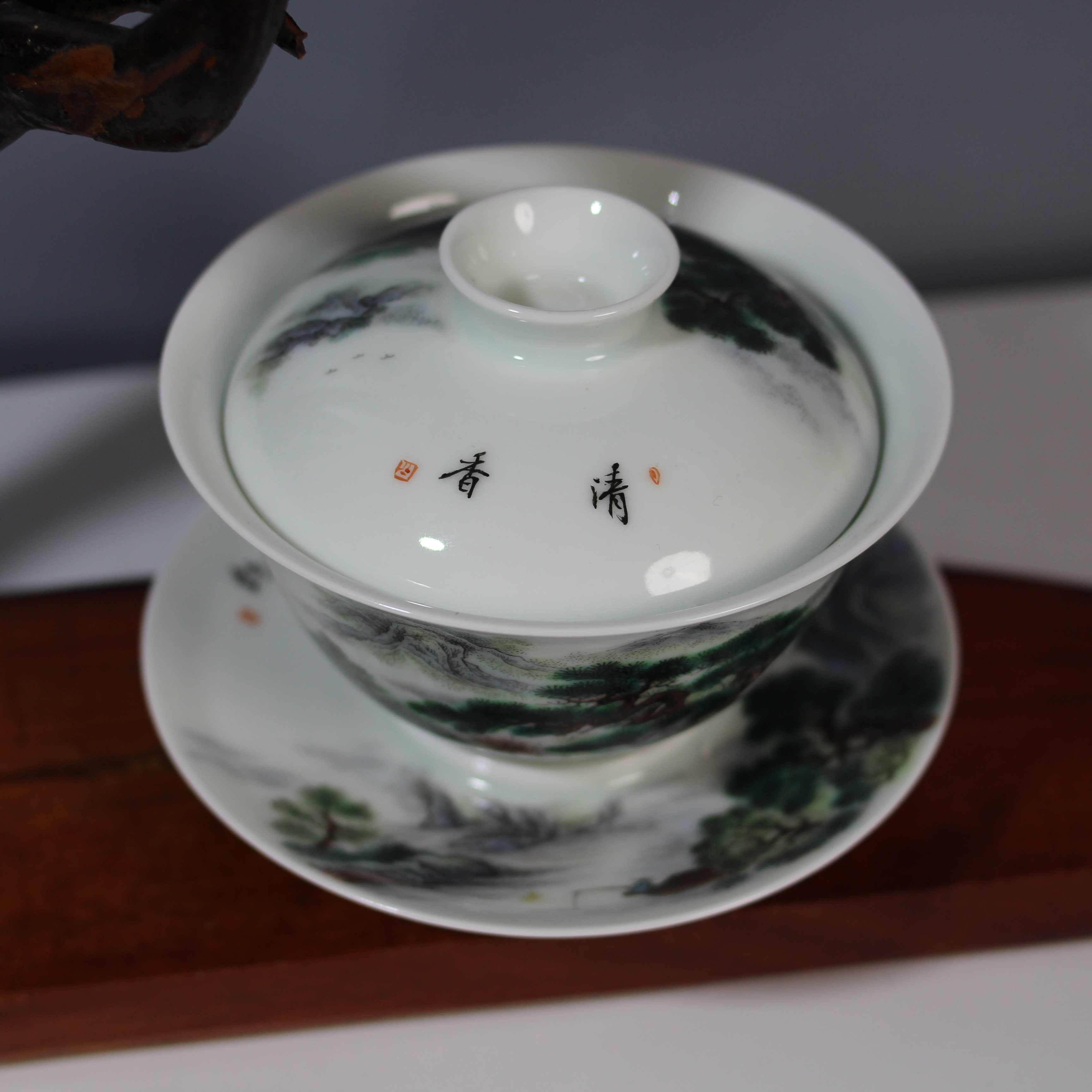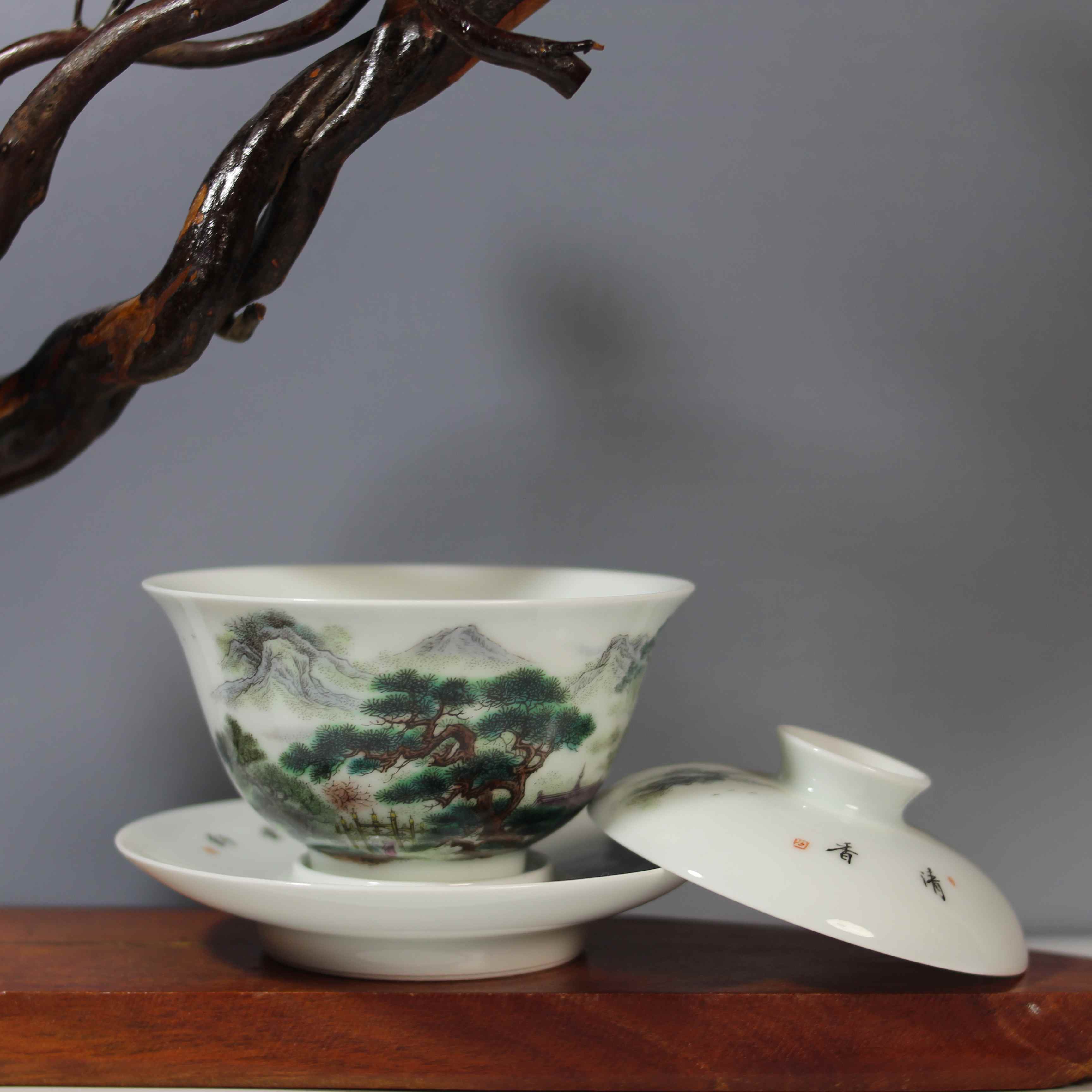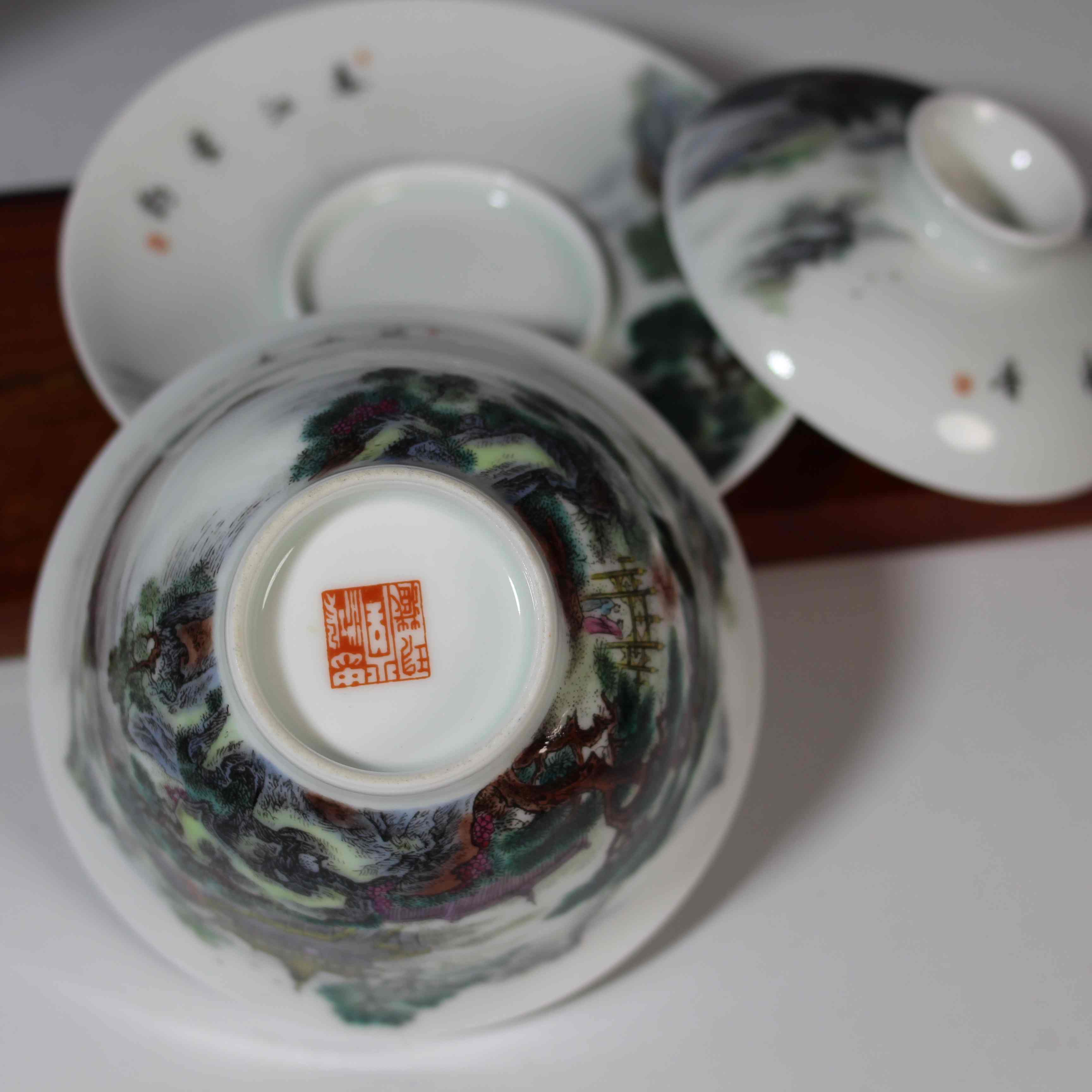 这不是单纯的杯子,而是一套 粉彩山水纹盖碗 ,是中式传统茶具,由碗身、碗盖、碗托(又称 “托子”)组成,是典型的 “三才盖碗” 形制,对应 “天、地、人” 三才,暗含 “天人合一” 哲学,泡茶时兼具实用与文化意趣。以白瓷为胎,采用 粉彩工艺 绘制山水图案。粉彩属于釉上彩,色彩柔和细腻,能精细呈现山水层次(如远山朦胧、近松苍劲 ),经烧制后画面牢固,不易脱落。