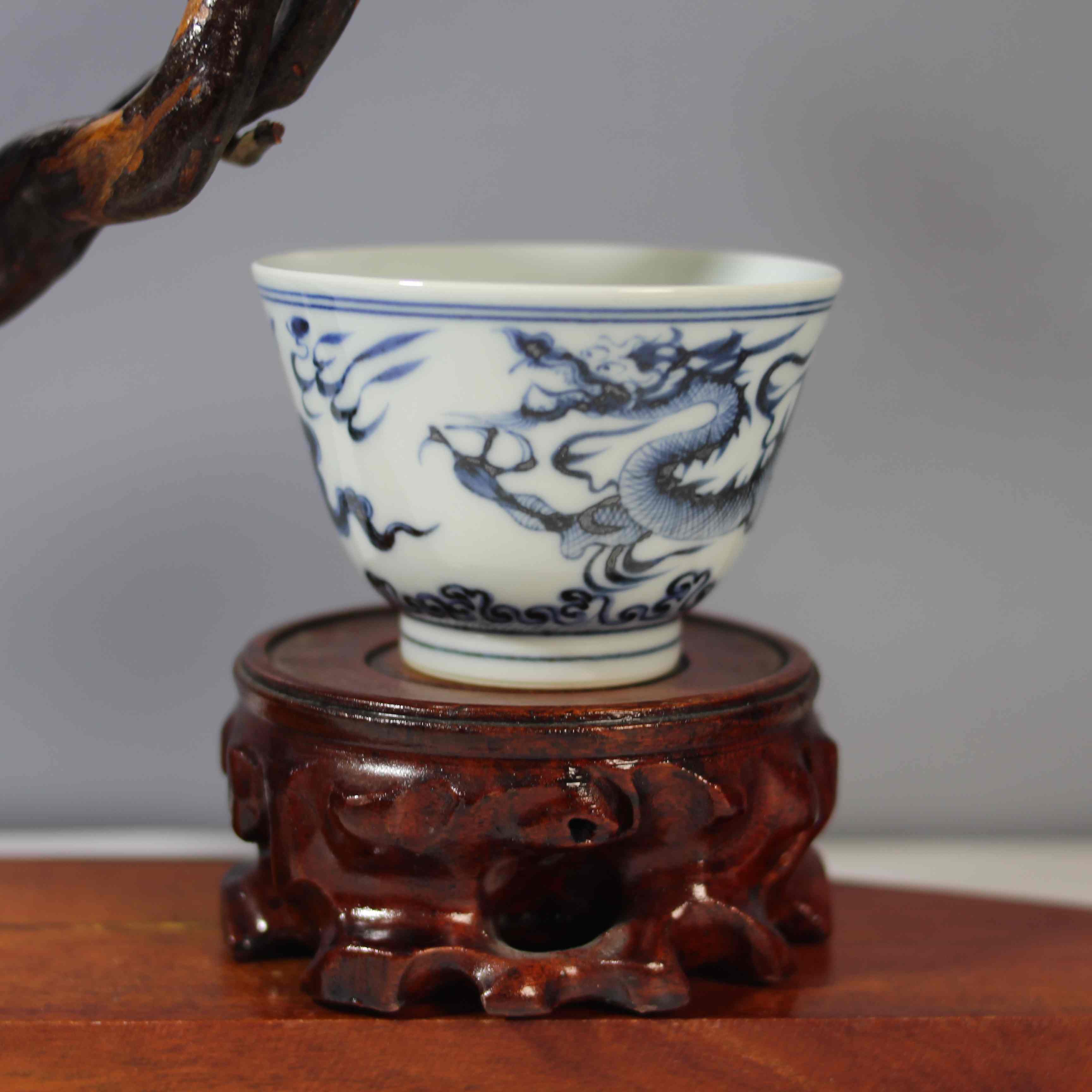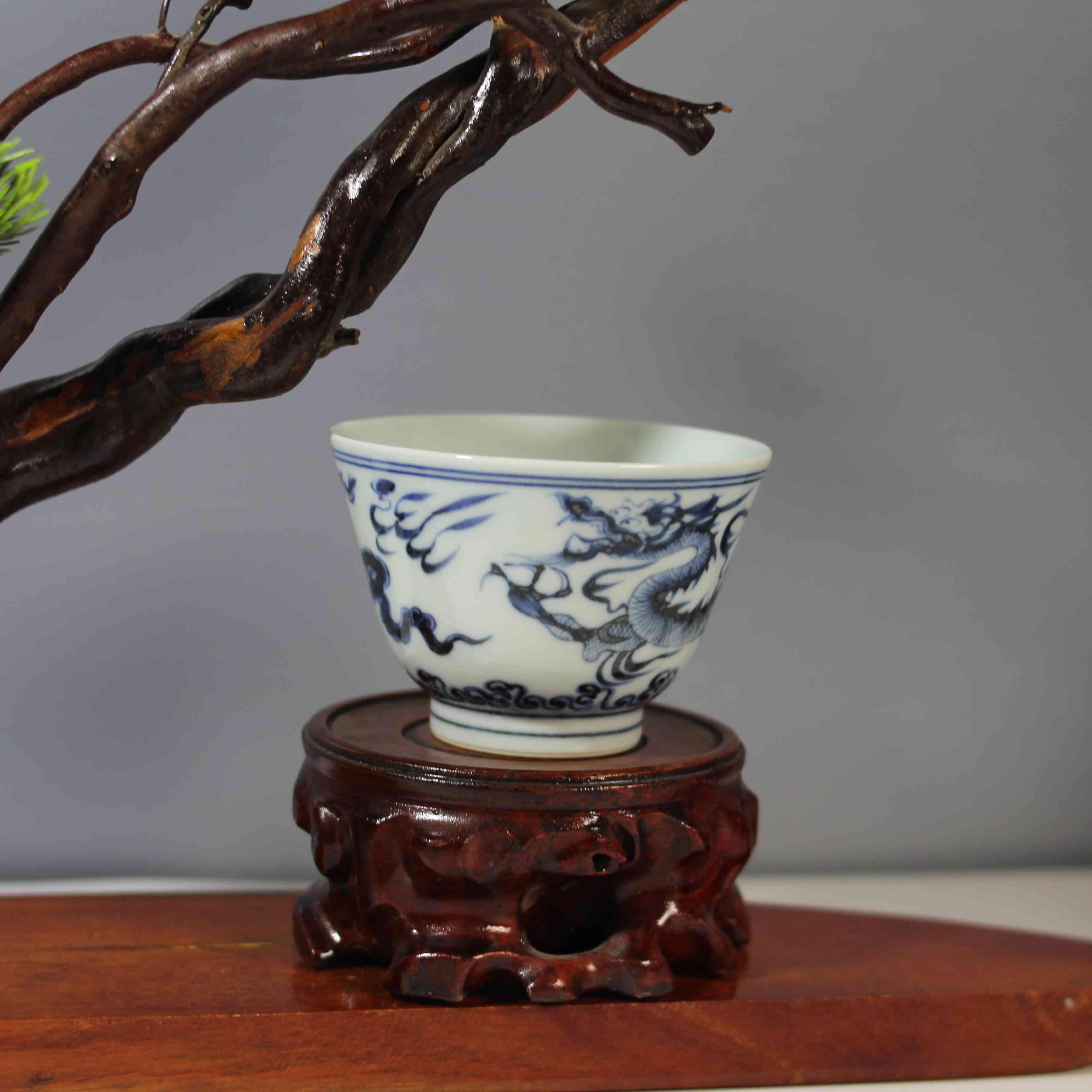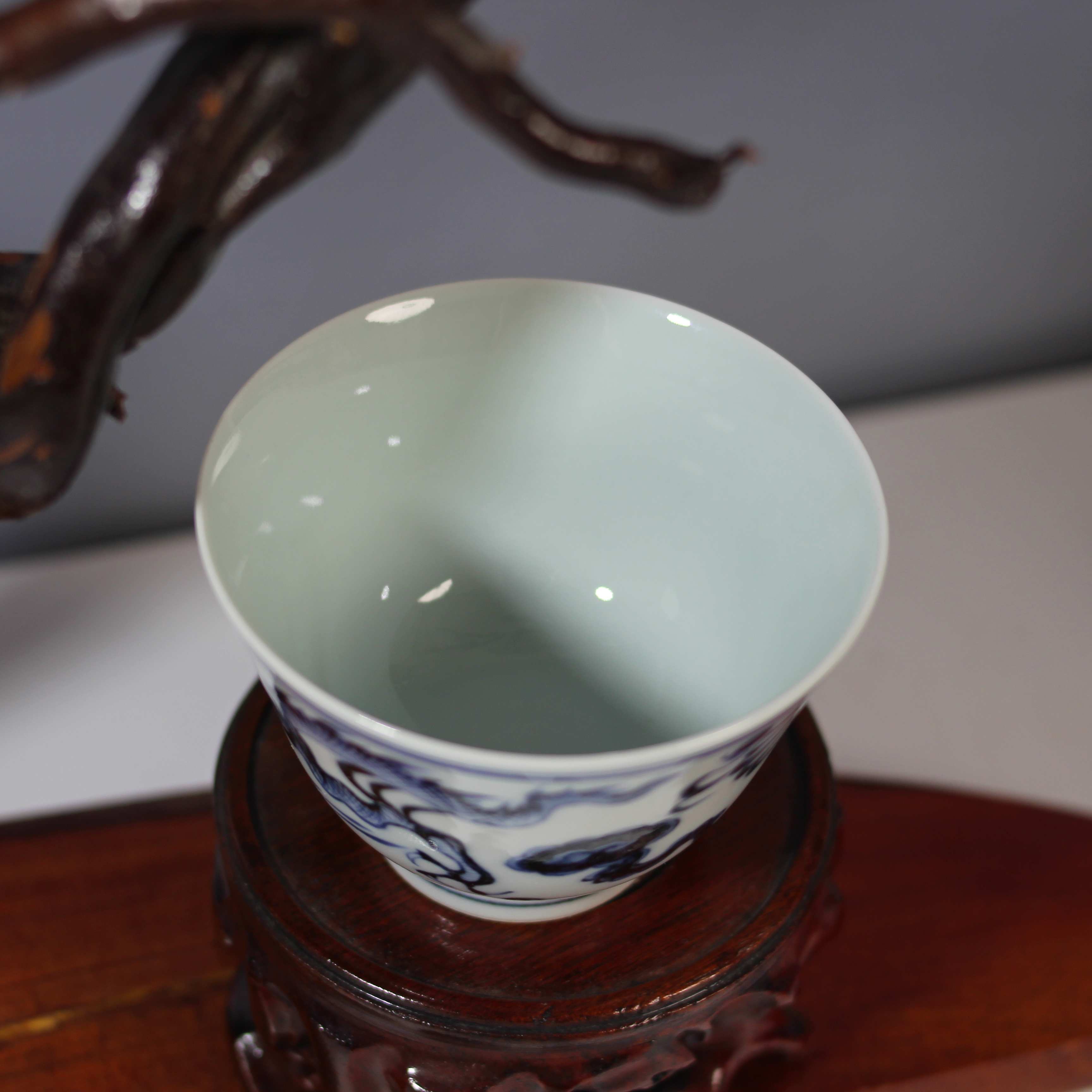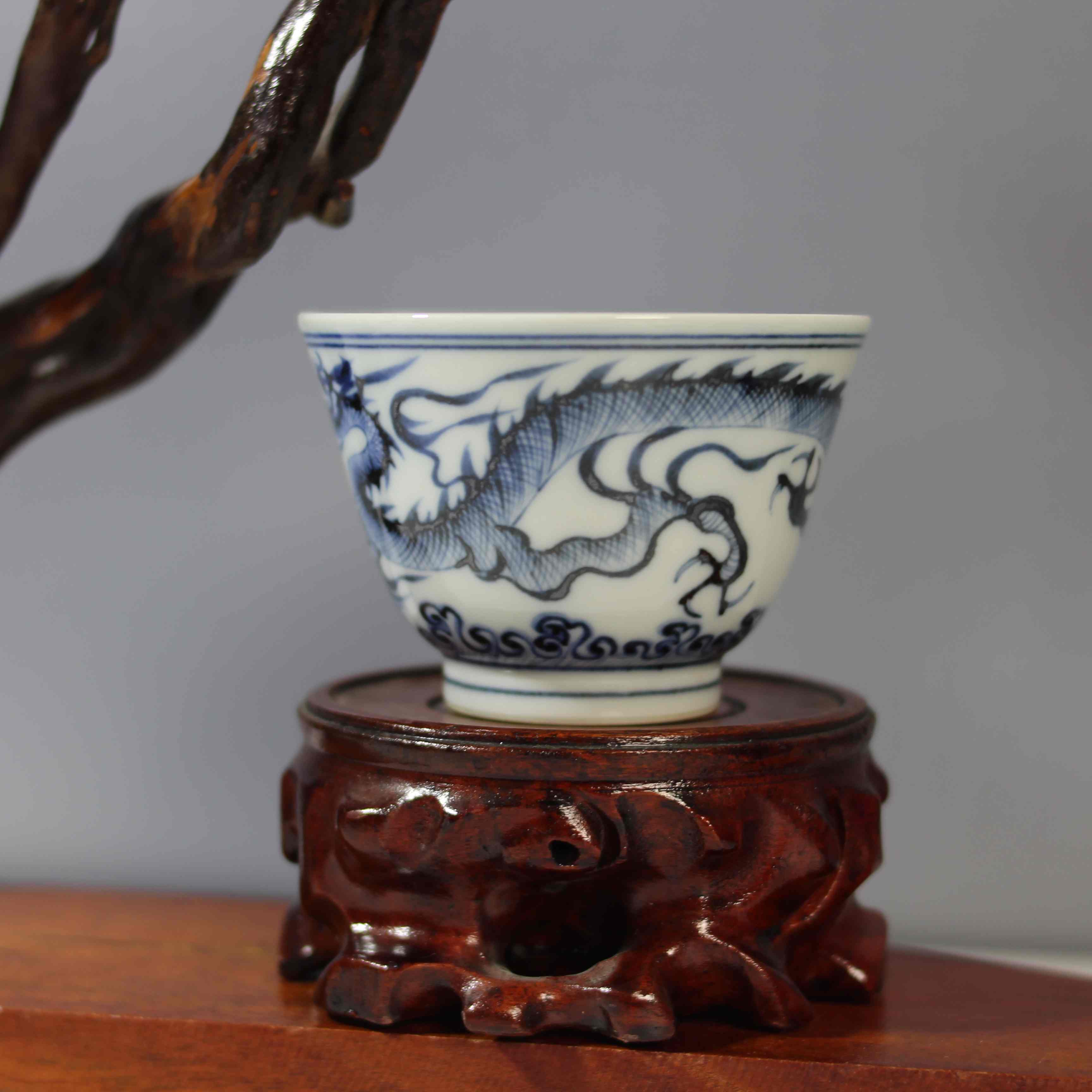 这是一只青花龙纹茶杯,属于中式传统瓷器茶具,以瓷土作为原料,经过淘洗、制坯、晾干等前期处理,制成杯体的雏形。采用青花瓷工艺,这是一种釉下彩工艺。在干燥的坯体表面,用含氧化钴的钴矿颜料绘制图案,之后再罩上一层透明釉,经过高温还原焰一次烧成。钴料在高温烧制后呈现出稳定的蓝色,使得图案能够长久保存,不易褪色 。