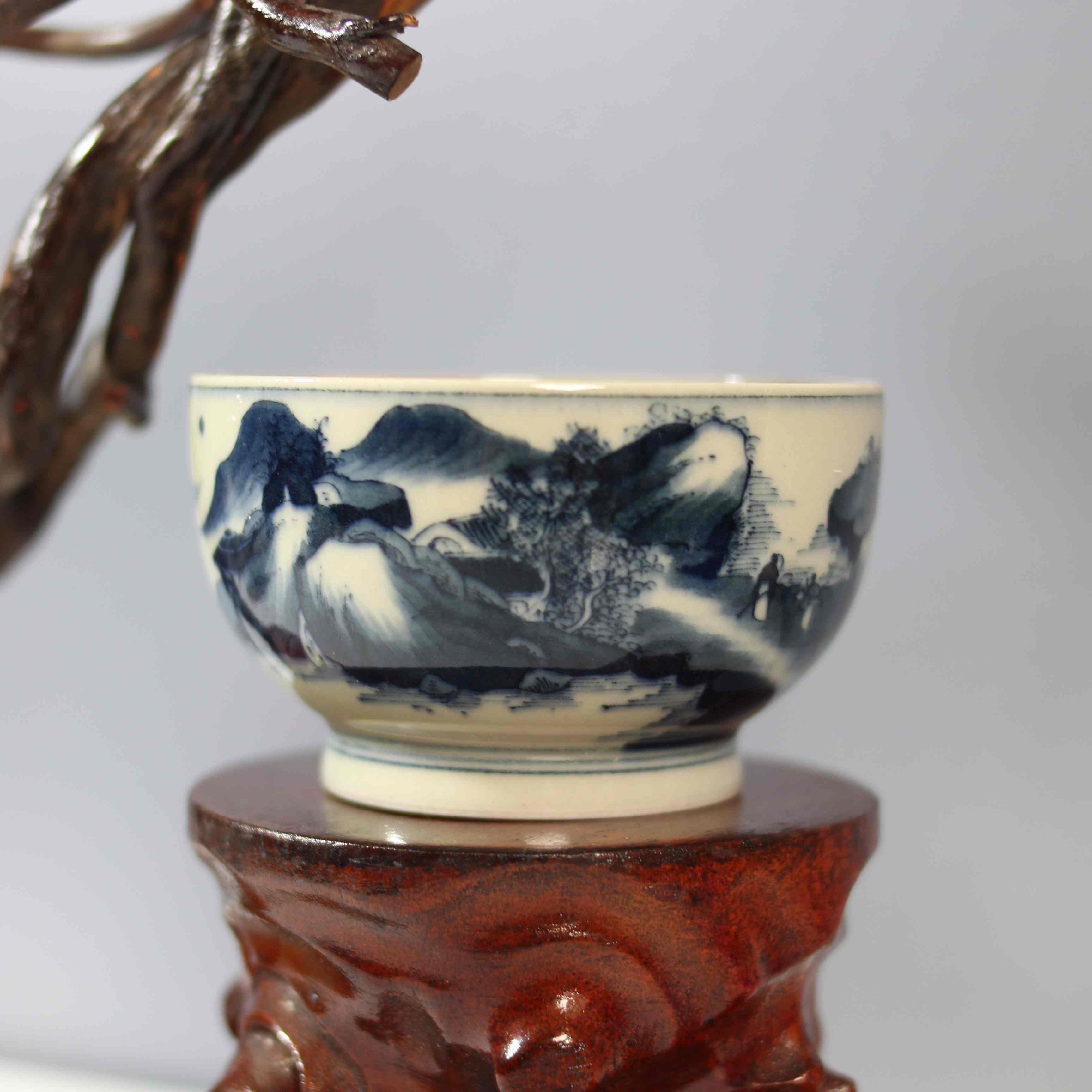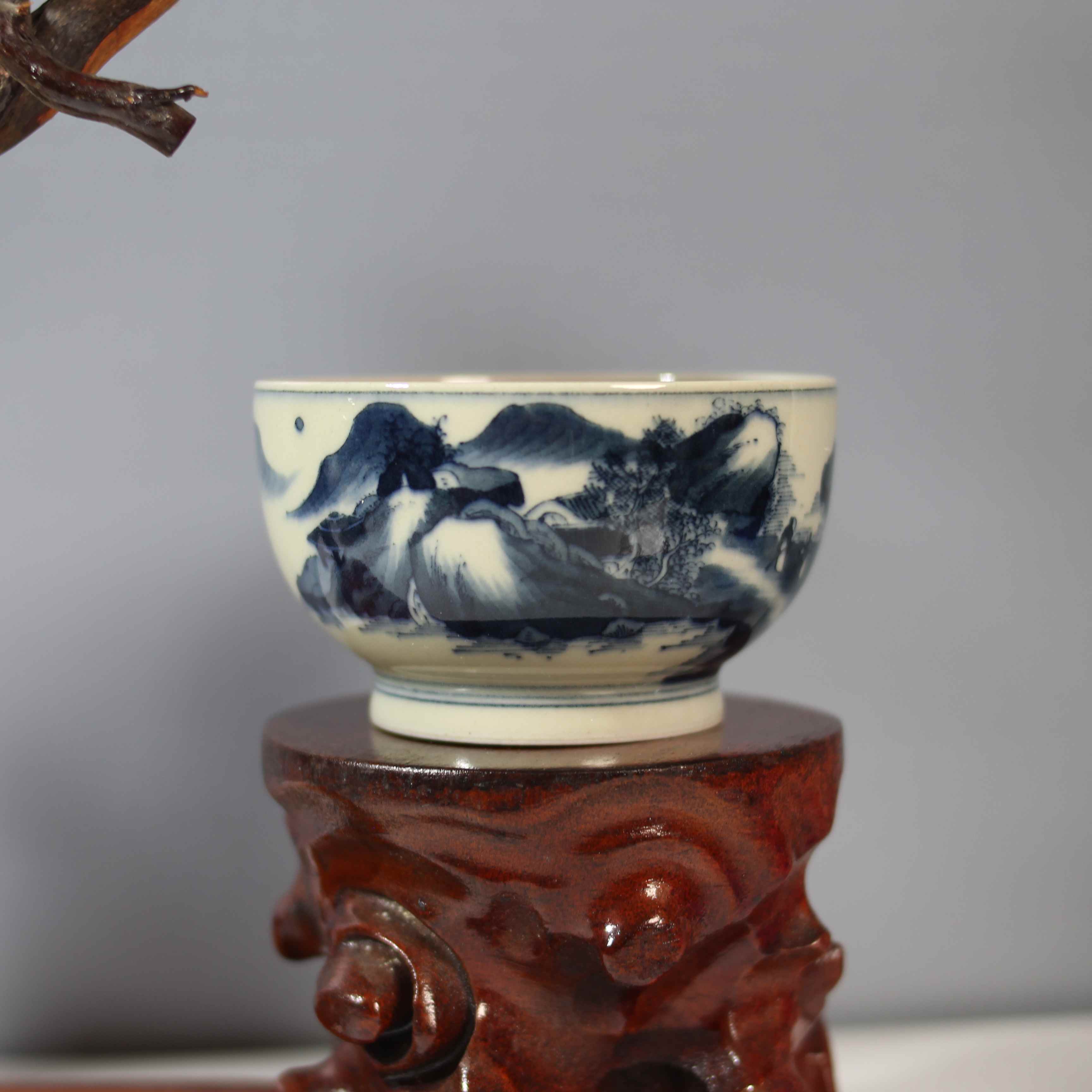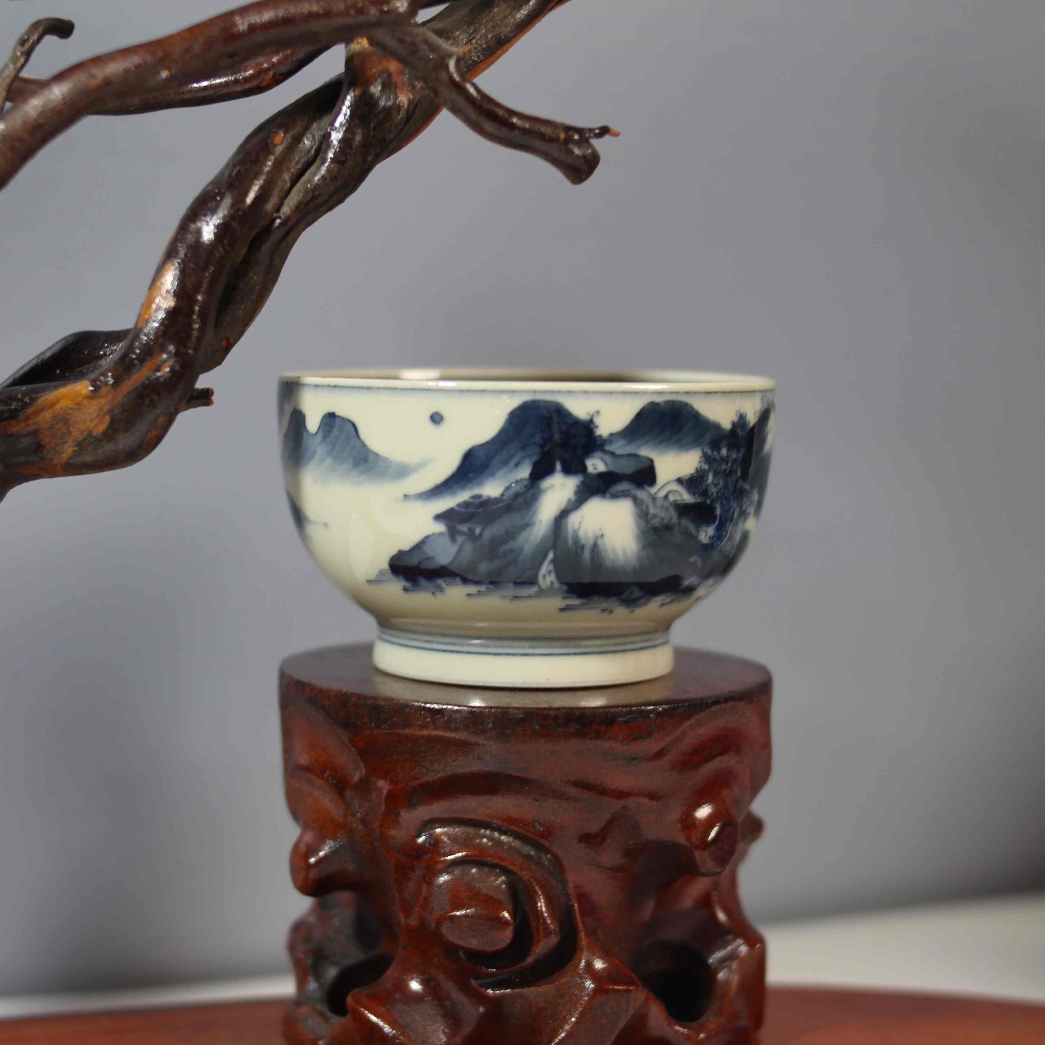 这是一只青花山水纹茶杯,属于中式传统瓷器茶具,采用了经典的青花瓷工艺,属于釉下彩瓷。先选用优质瓷土制成杯坯,晾干后,以含氧化钴的钴矿为颜料,在杯坯表面精心描绘山水图案 ,接着罩上一层透明釉,最后经高温还原焰一次烧成。烧制后,钴料呈现出蓝色,图案色彩稳定、不易褪色,且具有着色力强、发色鲜艳的特点。杯身绘有青花山水图景,画面中能看到山峦起伏、树木葱郁,可能还描绘了人物活动场景。山水题材在传统瓷器装饰中极为常见,画家通过笔墨勾勒和青花渲染,营造出悠远深邃的意境,展现出中国传统山水画的韵味。
