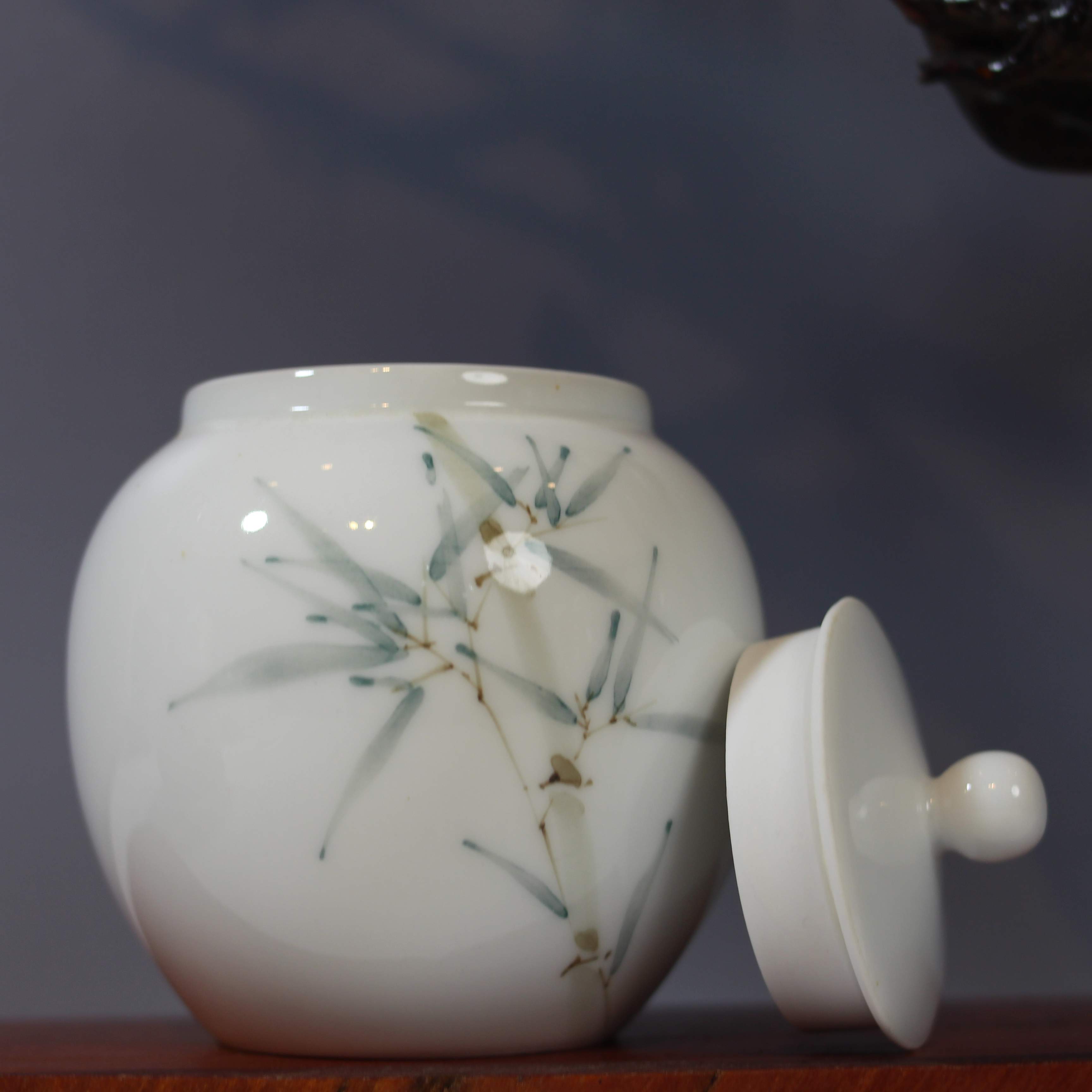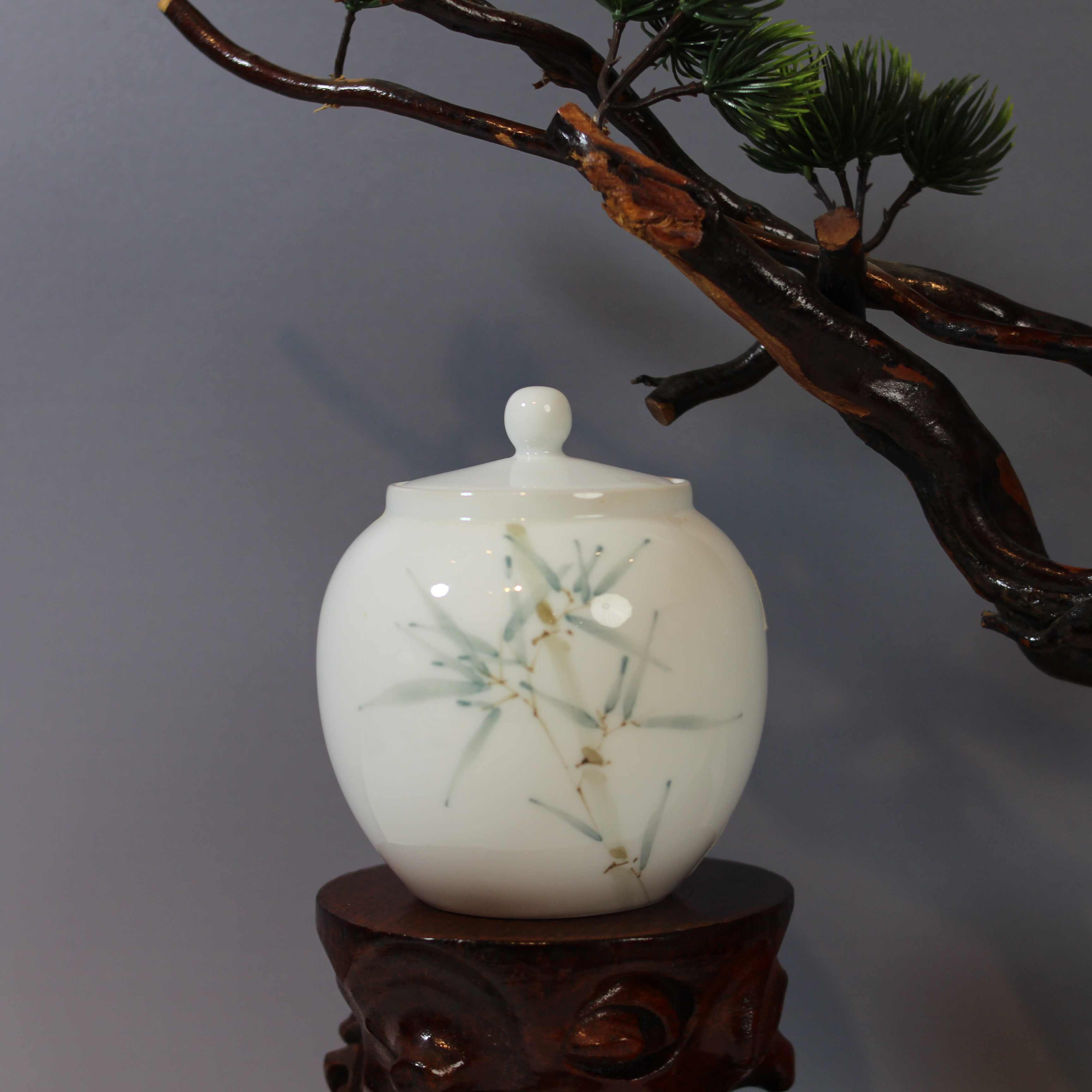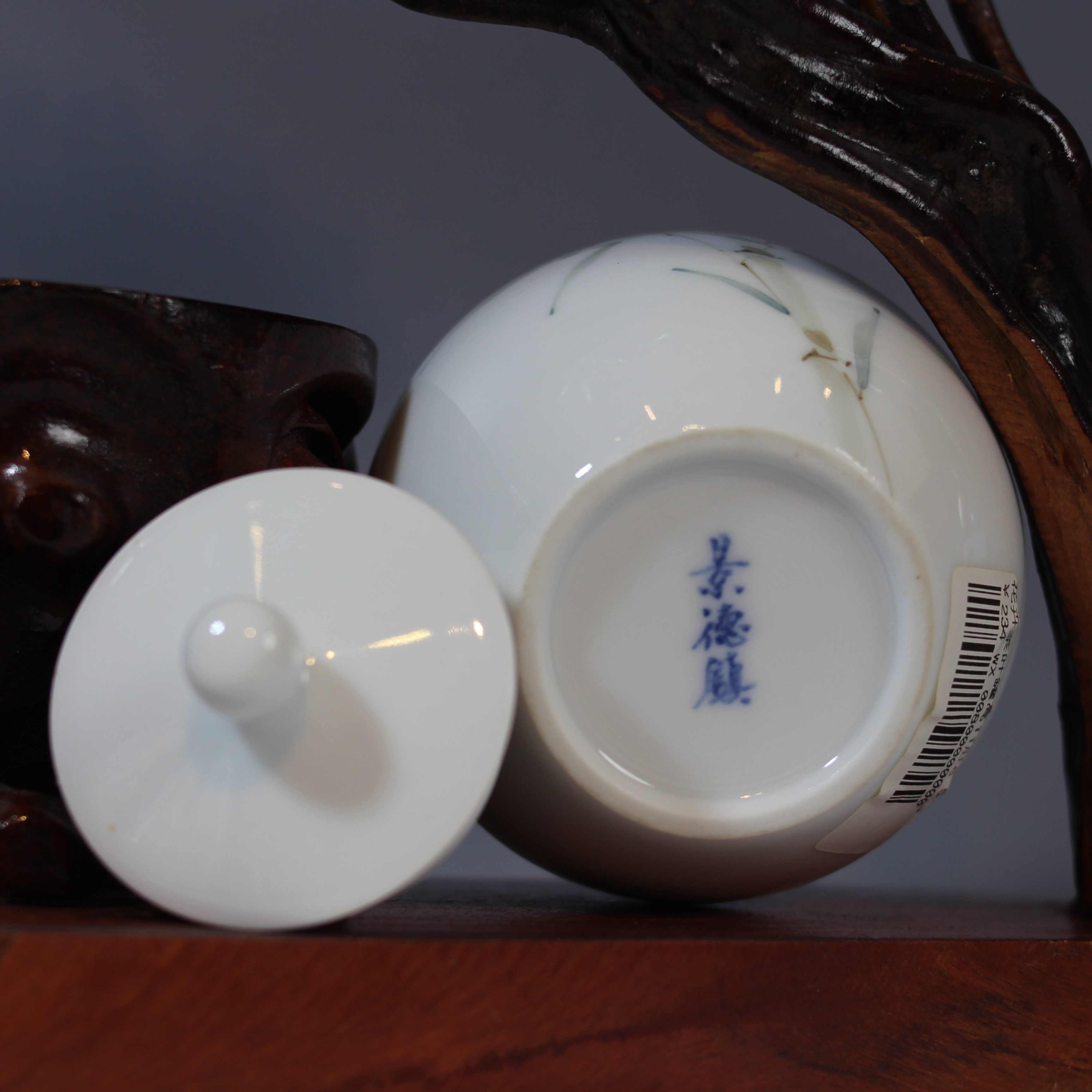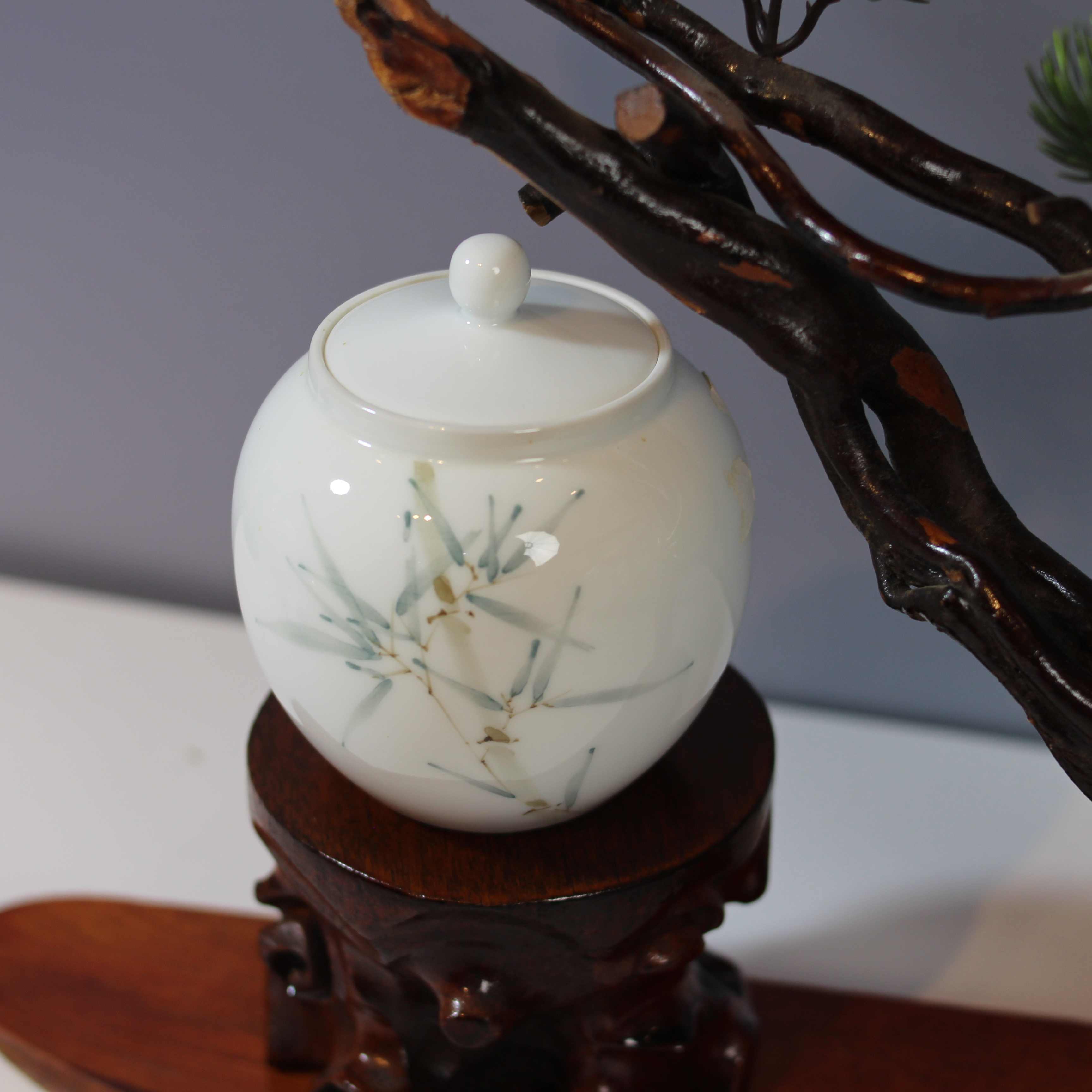 这是一款手绘花卉茶叶罐,罐体主体为白色,罐身上绘制有竹子图案 ,呈现出淡雅的风格。从底部落款可知,该茶叶罐出自景德镇,景德镇是中国著名的瓷都,以生产高质量的瓷器闻名。此茶叶罐带盖,密封性较好,适合用来储存茶叶,以保持茶叶的香气和品质 ,且造型圆润,搭配木质底座,更具古朴雅致的韵味,无论是自用还是作为礼品赠送都较为合适。