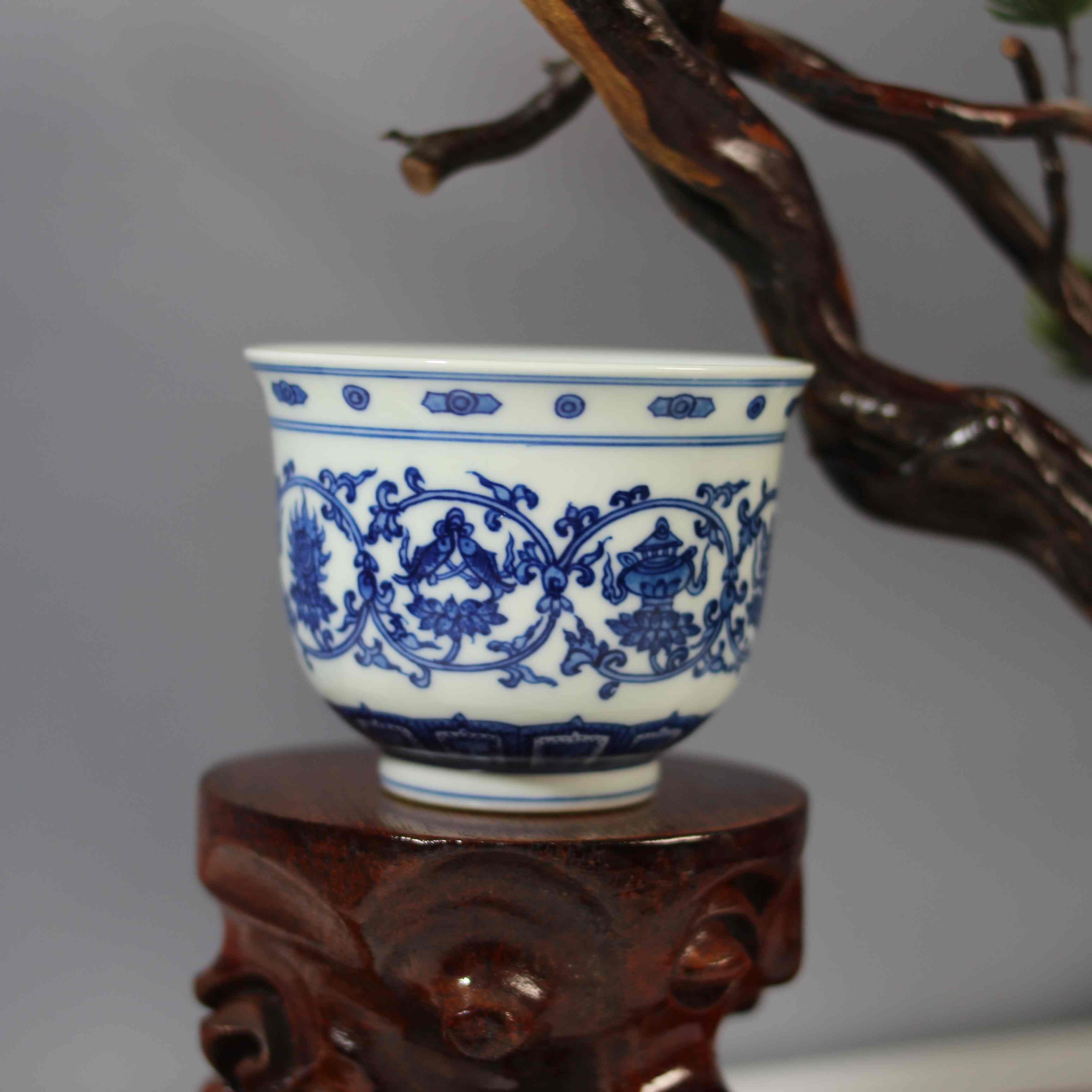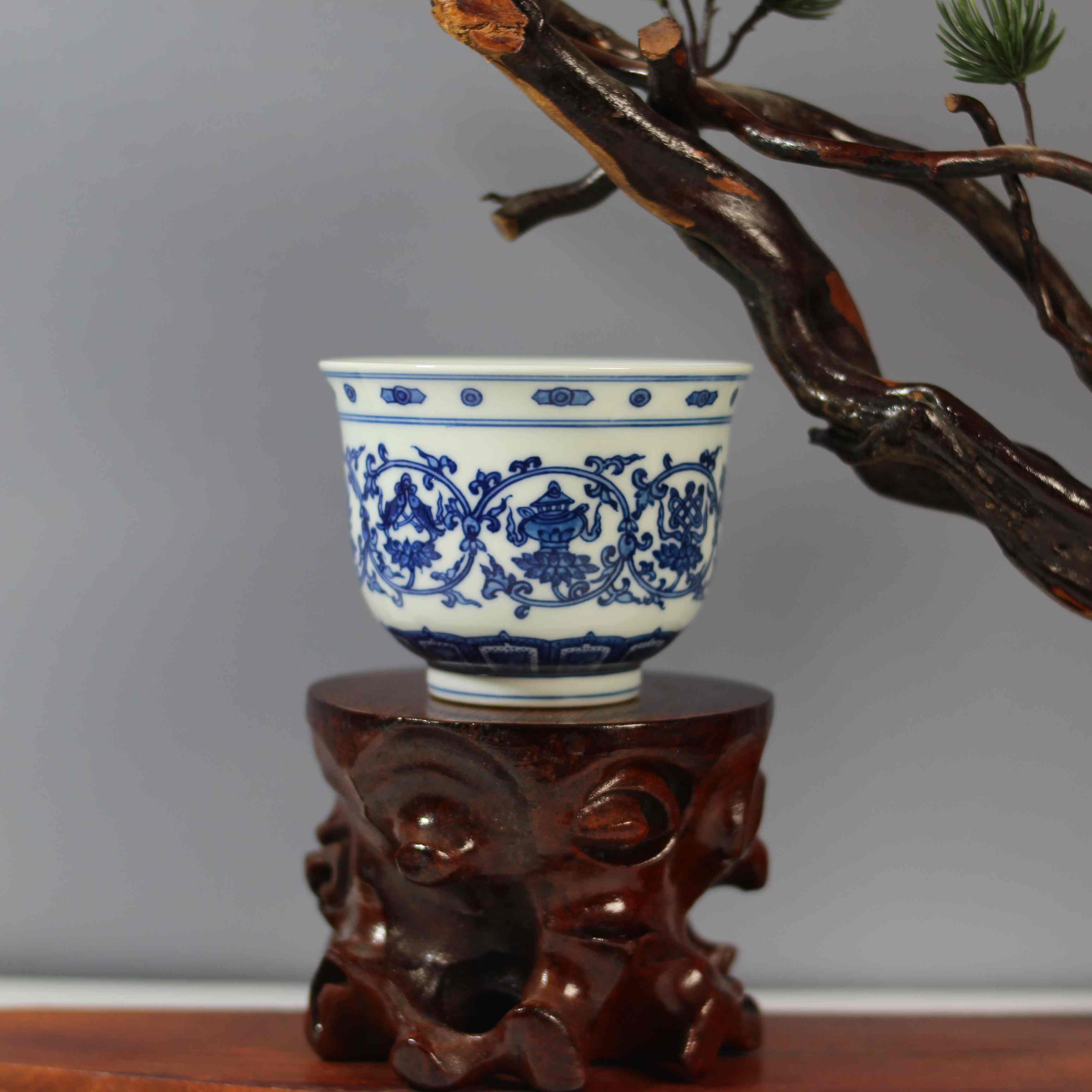 采用经典的青花瓷工艺,以白色瓷胎为基底,运用含氧化钴的颜料在瓷坯上绘制图案,之后再罩上一层透明釉,经过高温还原焰烧制而成 。烧制后,青花图案呈现出稳定而亮丽的蓝色,与白瓷胎底相互映衬,显得清新雅致。杯身主体纹饰为八宝纹,八宝又称八吉祥,分别是法轮、法螺、宝伞、白盖、莲花、宝瓶、金鱼和盘长结 。这些纹饰被缠枝花卉环绕,线条流畅婉转,构图饱满,富有动感和韵律。口沿处还饰有一道青花弦纹,并且点缀着圆形和类似云头形状的小图案,增添了细节美感。