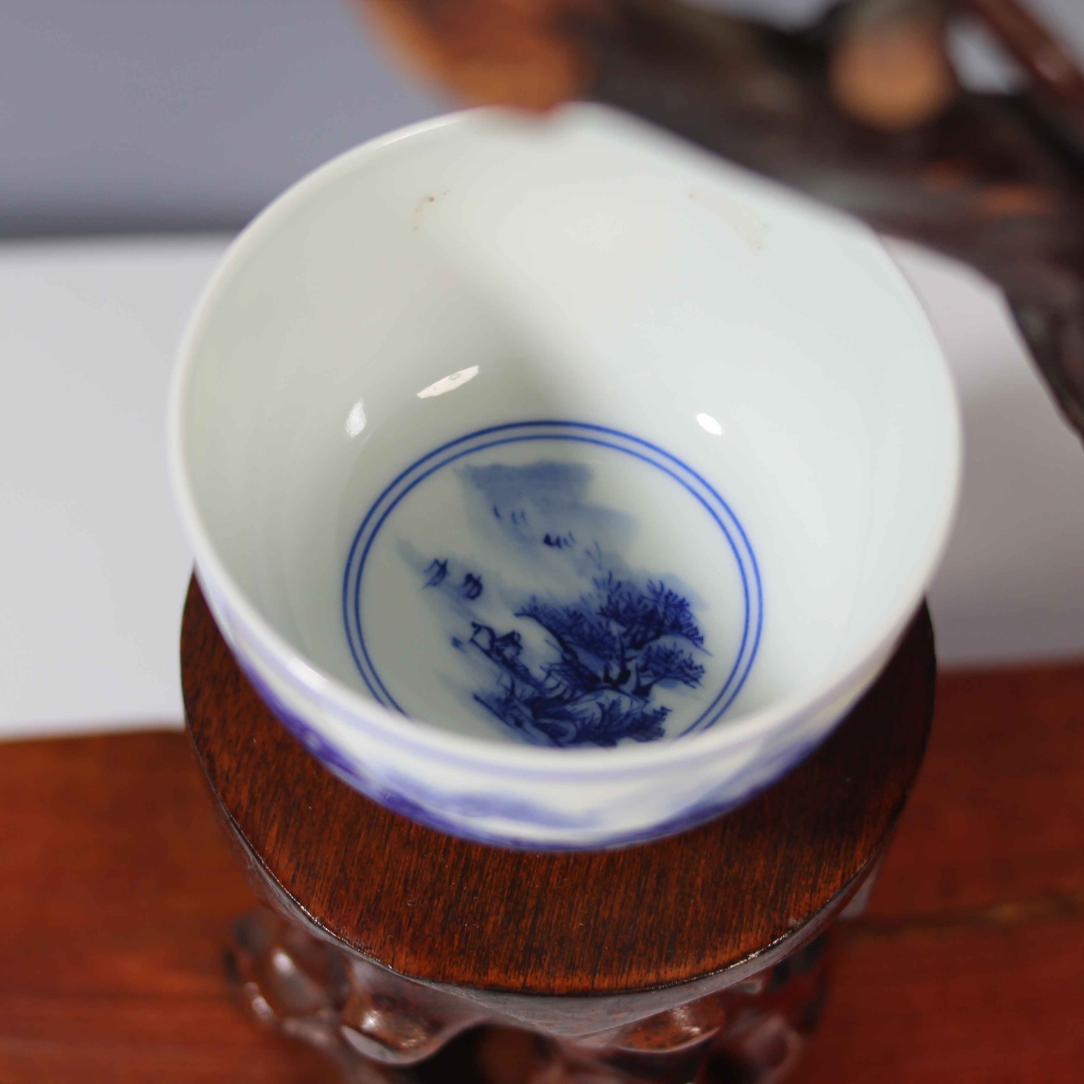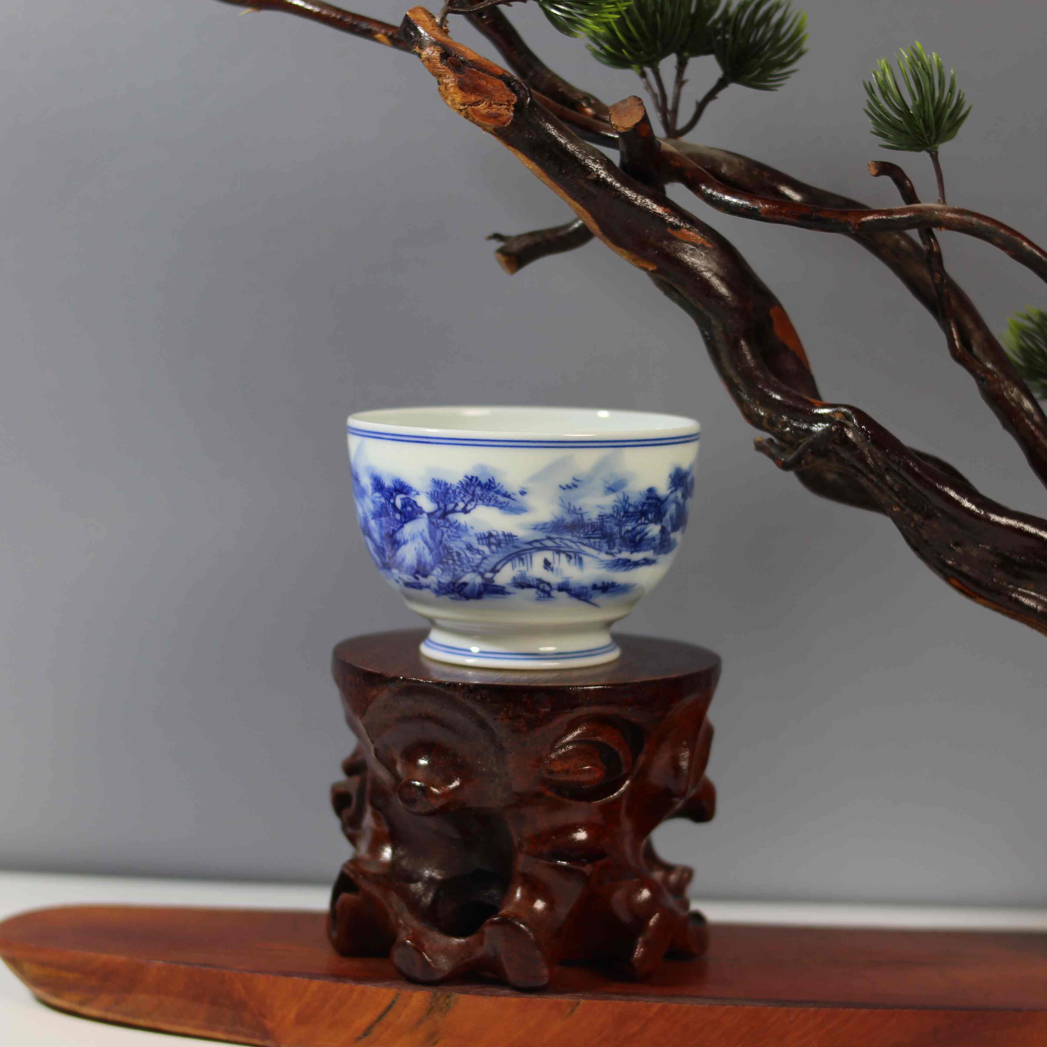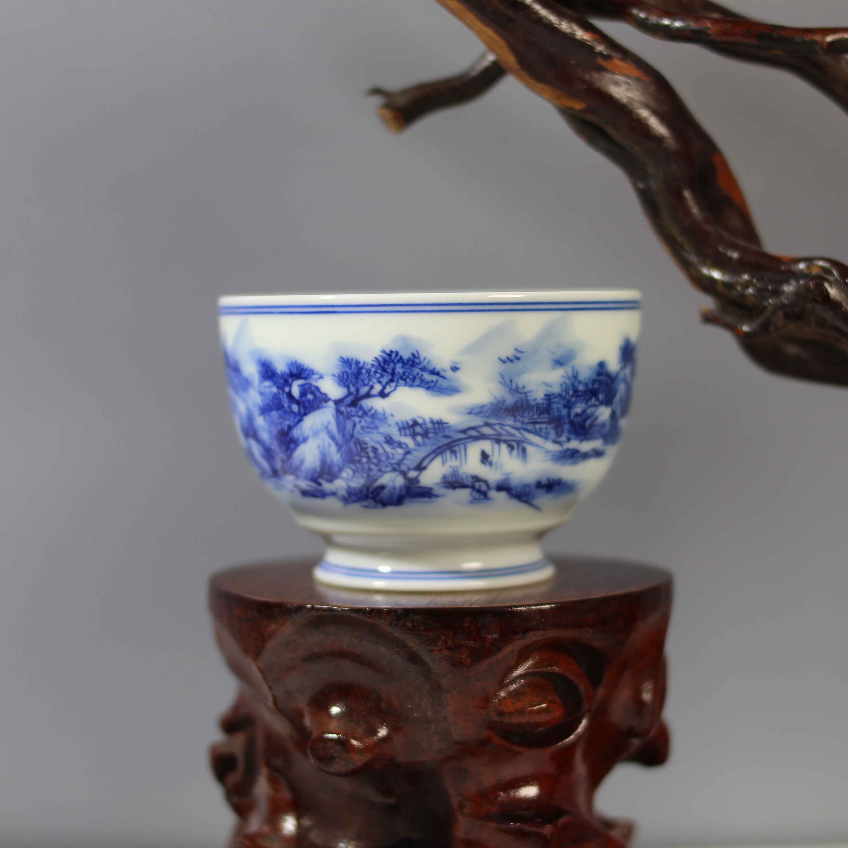 这是一只青花山水纹茶杯,属于传统中式瓷器茶具。采用青花瓷工艺制作,以白瓷为胎体,用含有氧化钴的钴矿为原料,在瓷坯上绘制图案后,再罩上一层透明釉,经高温还原焰一次烧成。烧成后的青花图案呈现出幽靓典雅的蓝色,与白瓷底色相互映衬,显得清新自然