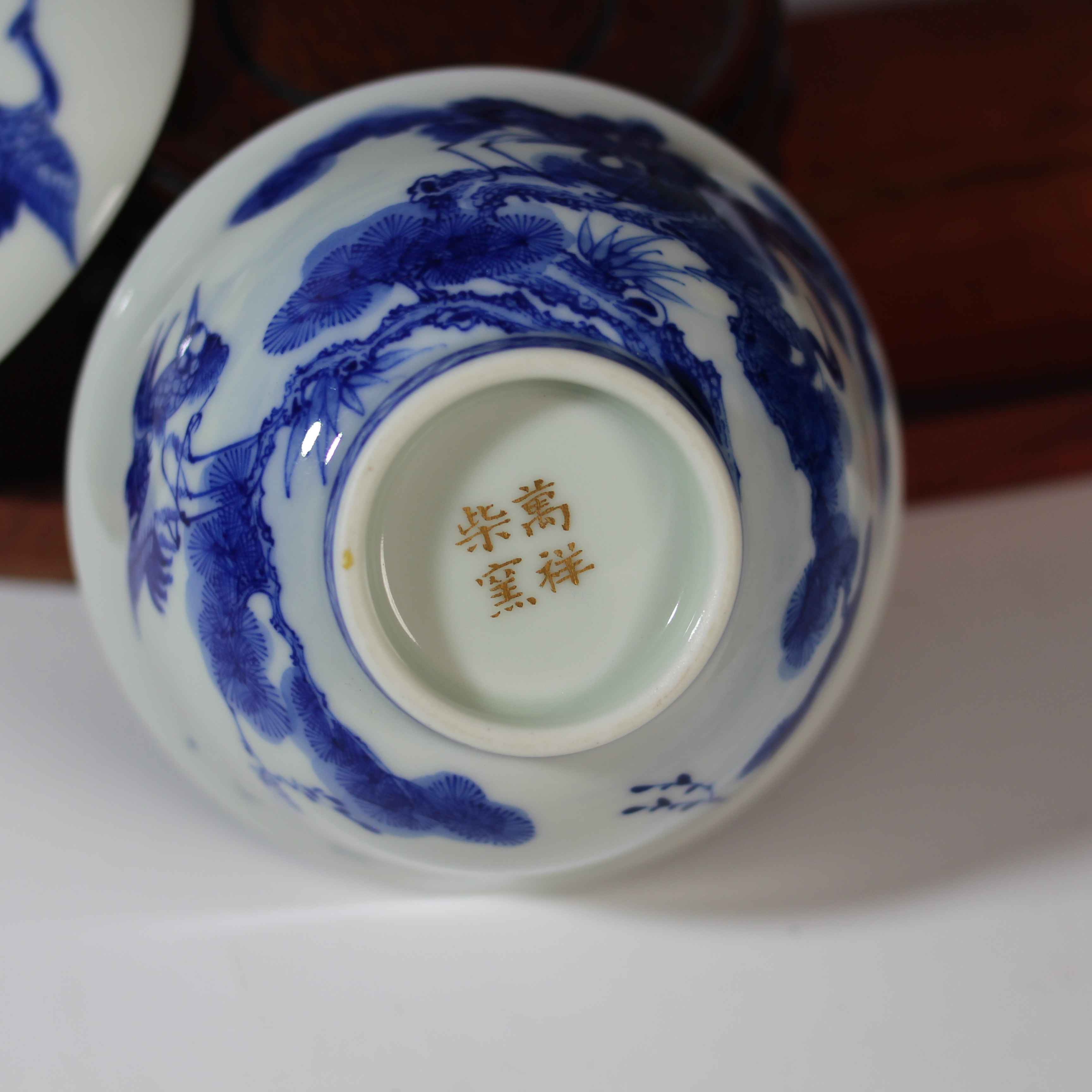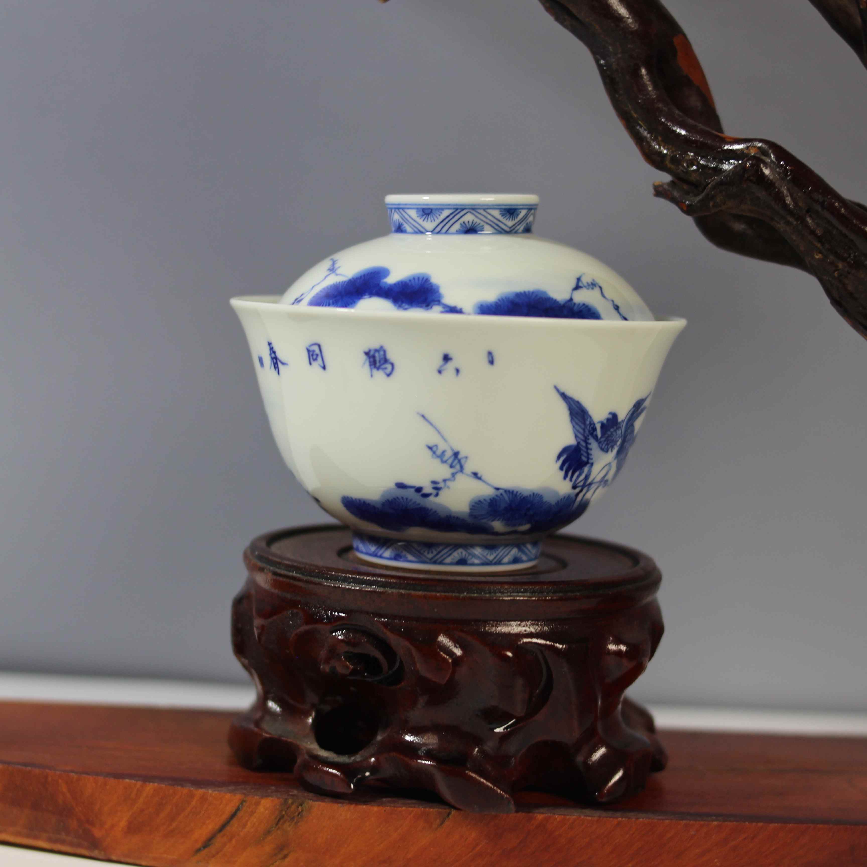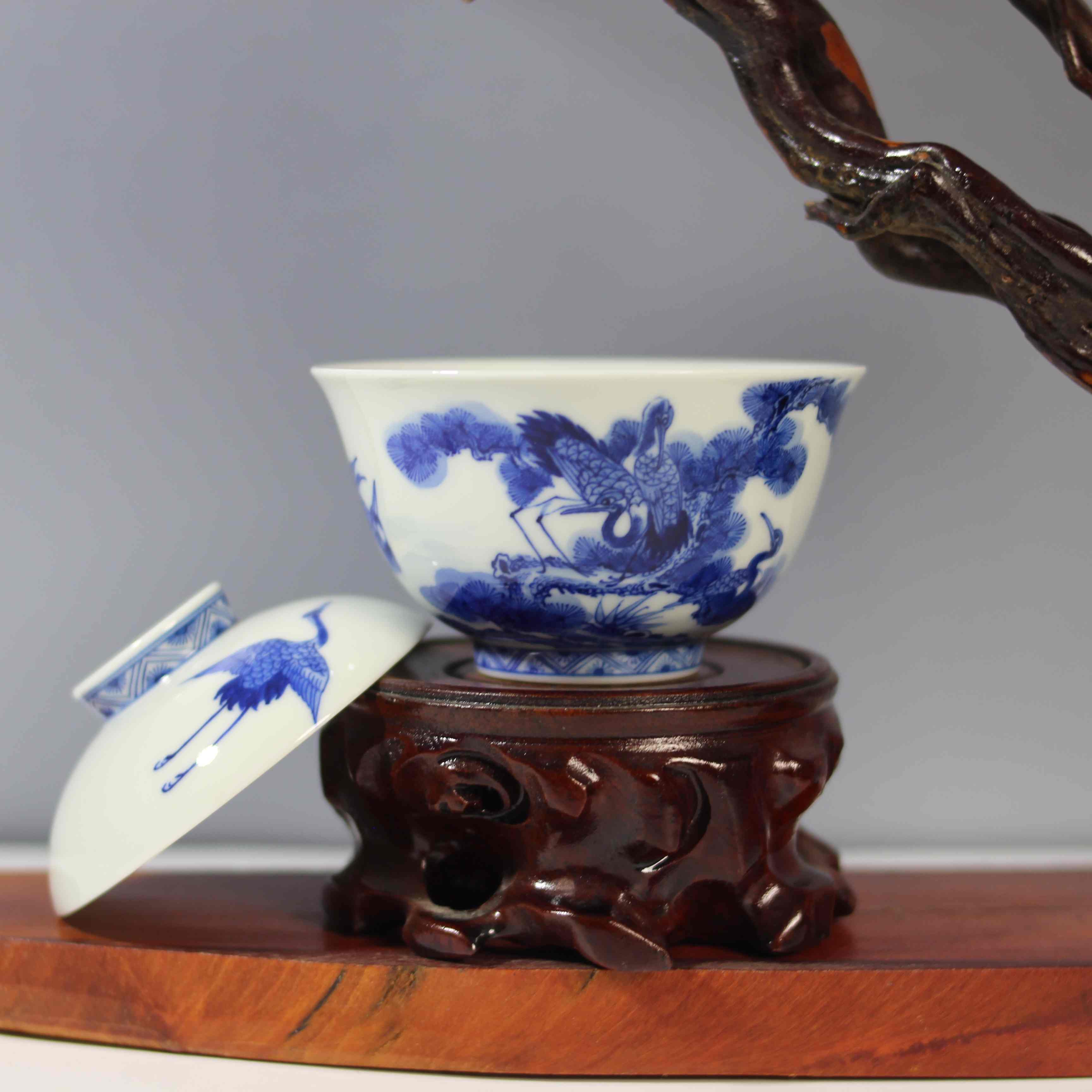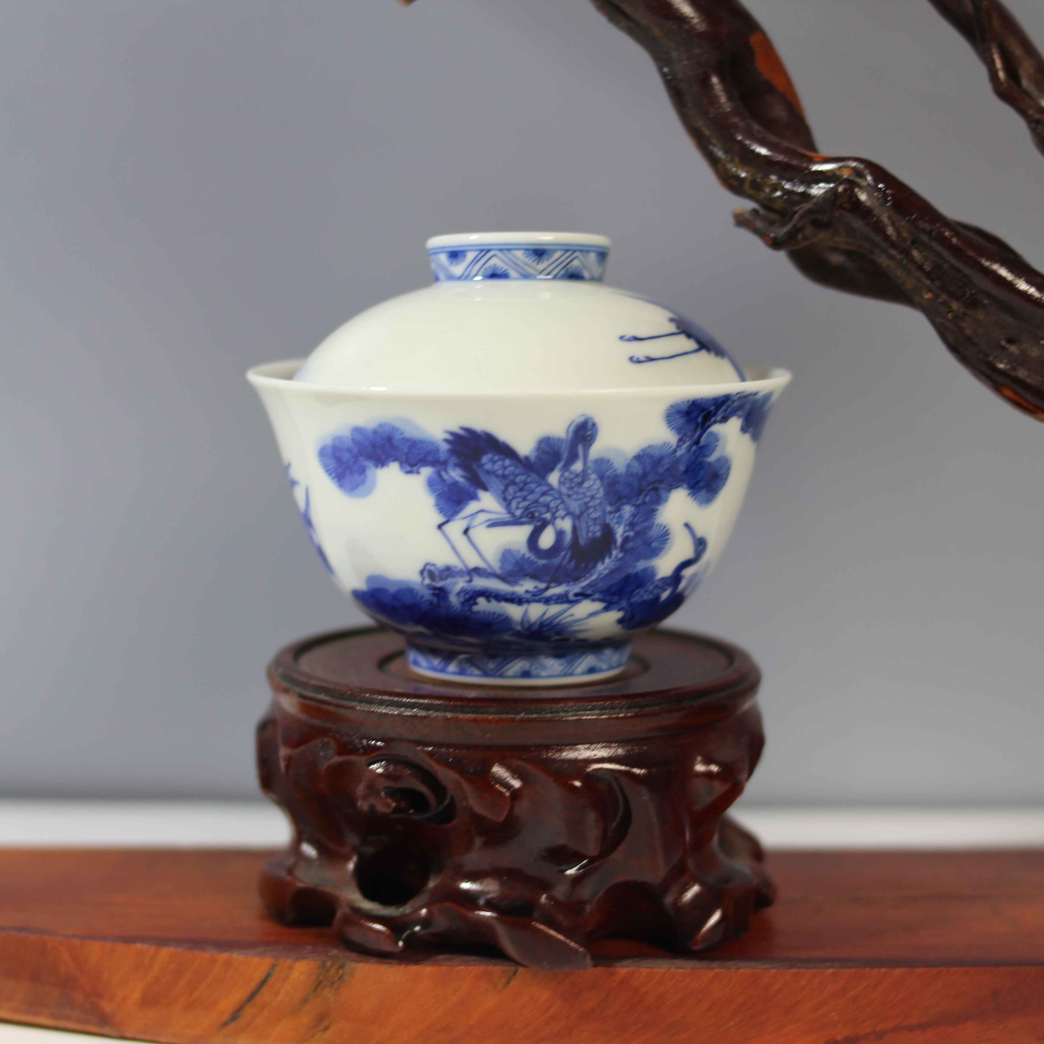 这是一只青花松鹤纹盖碗,属于传统中式瓷器茶具。