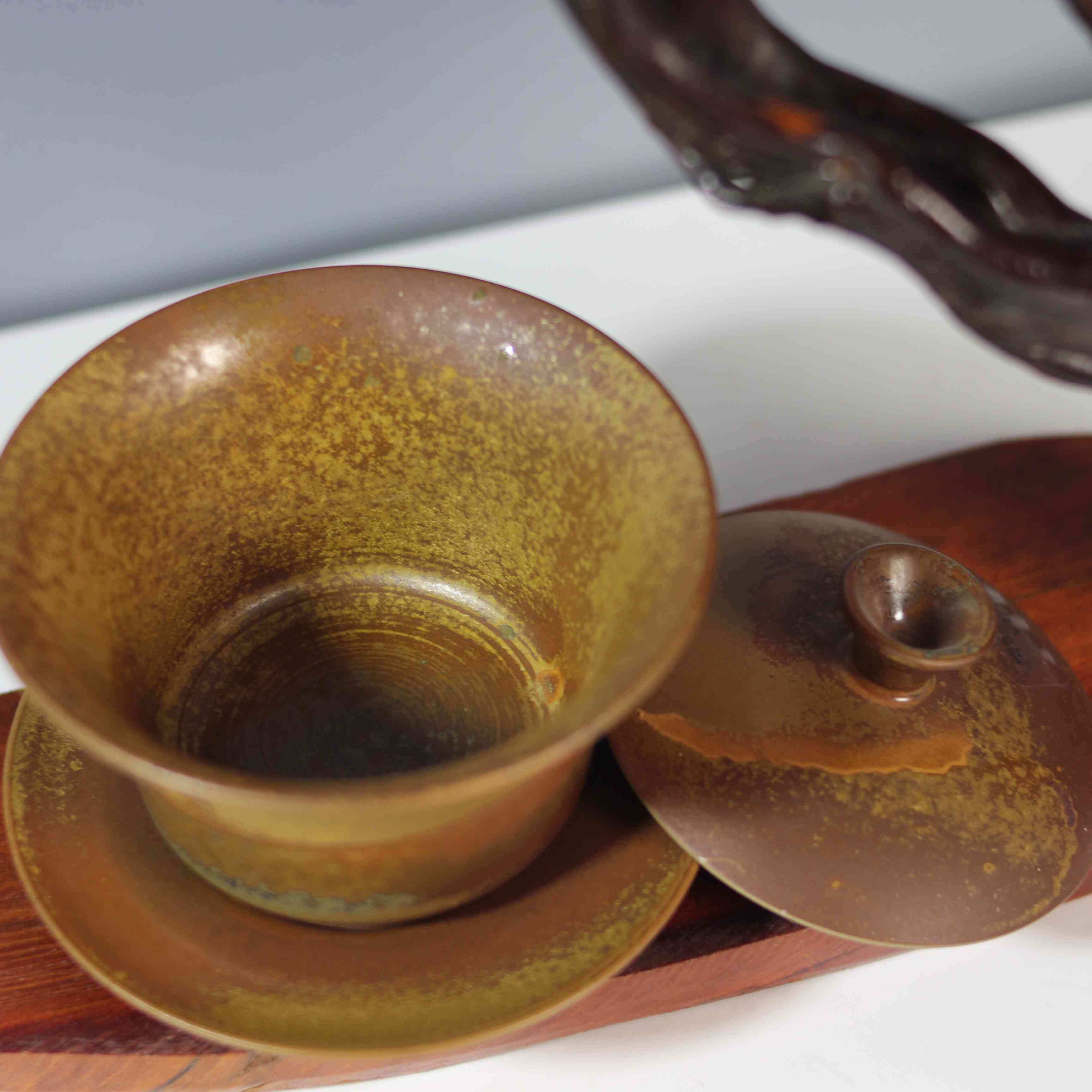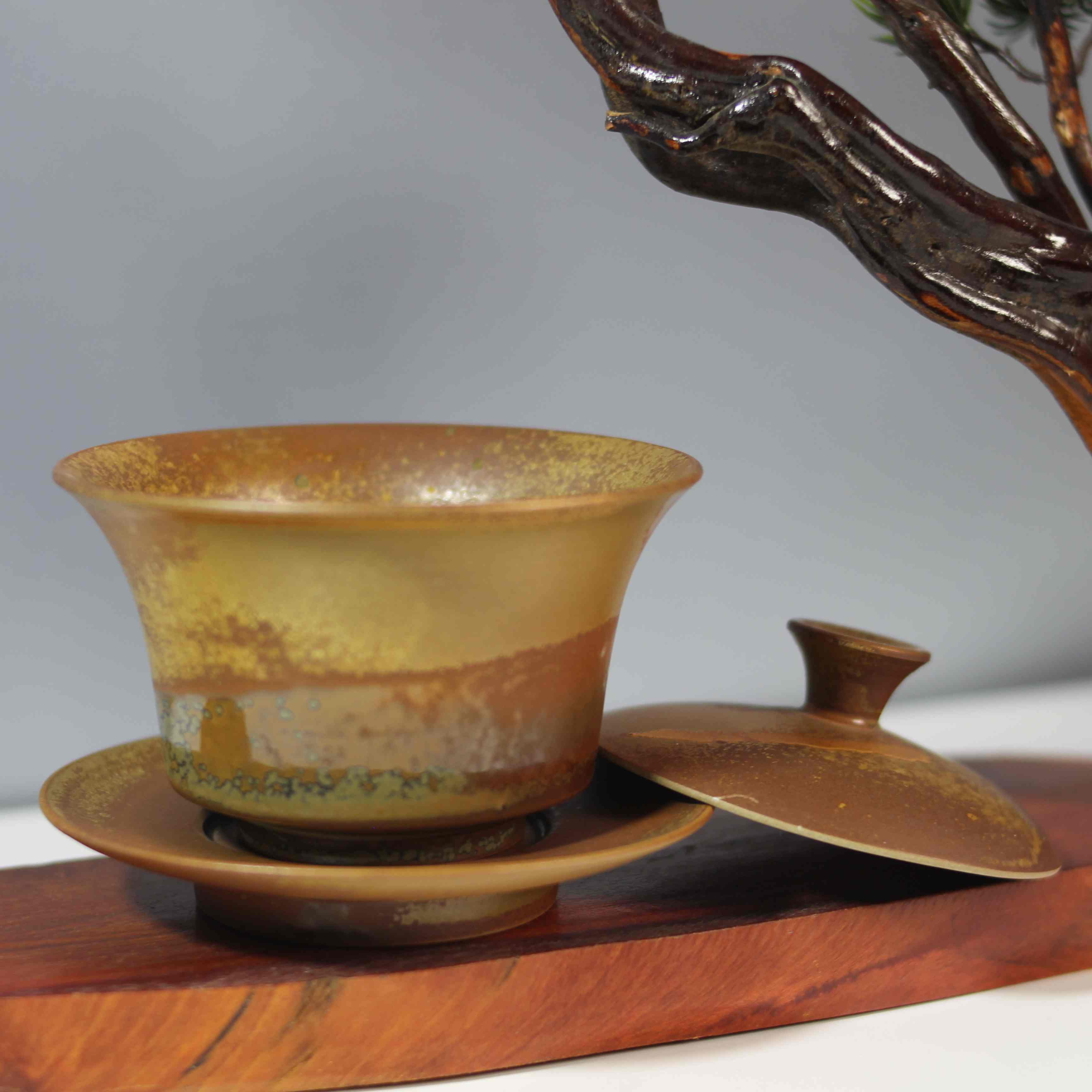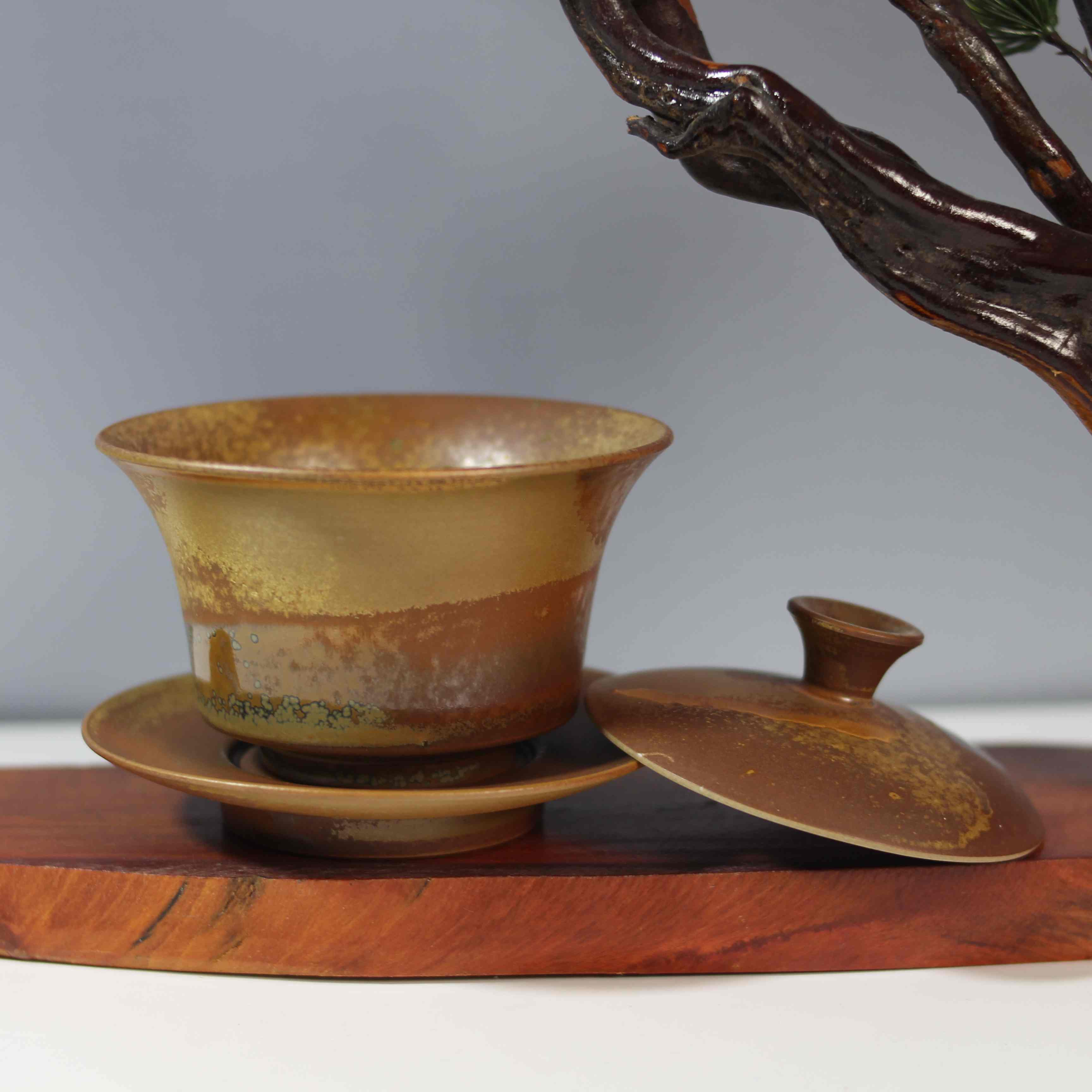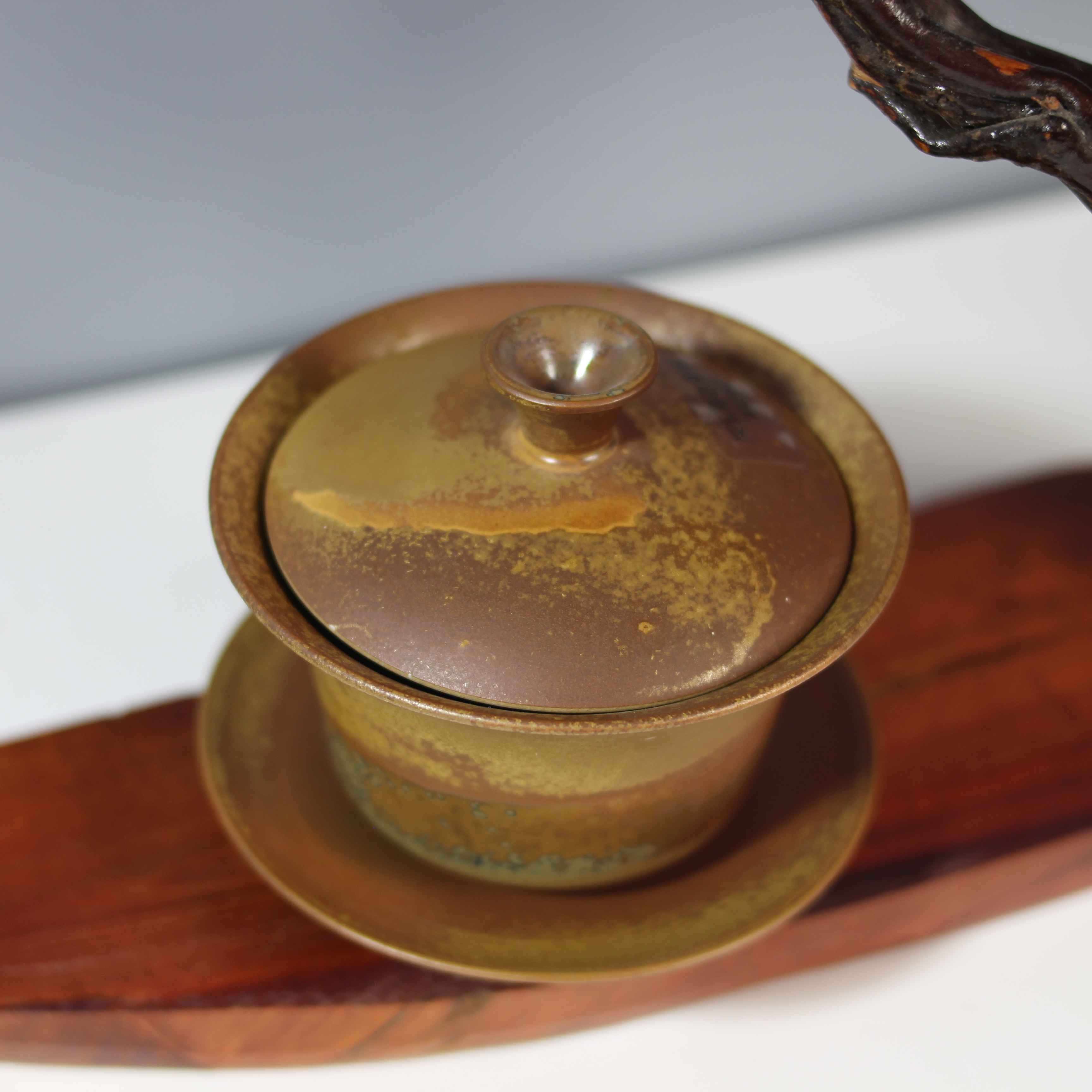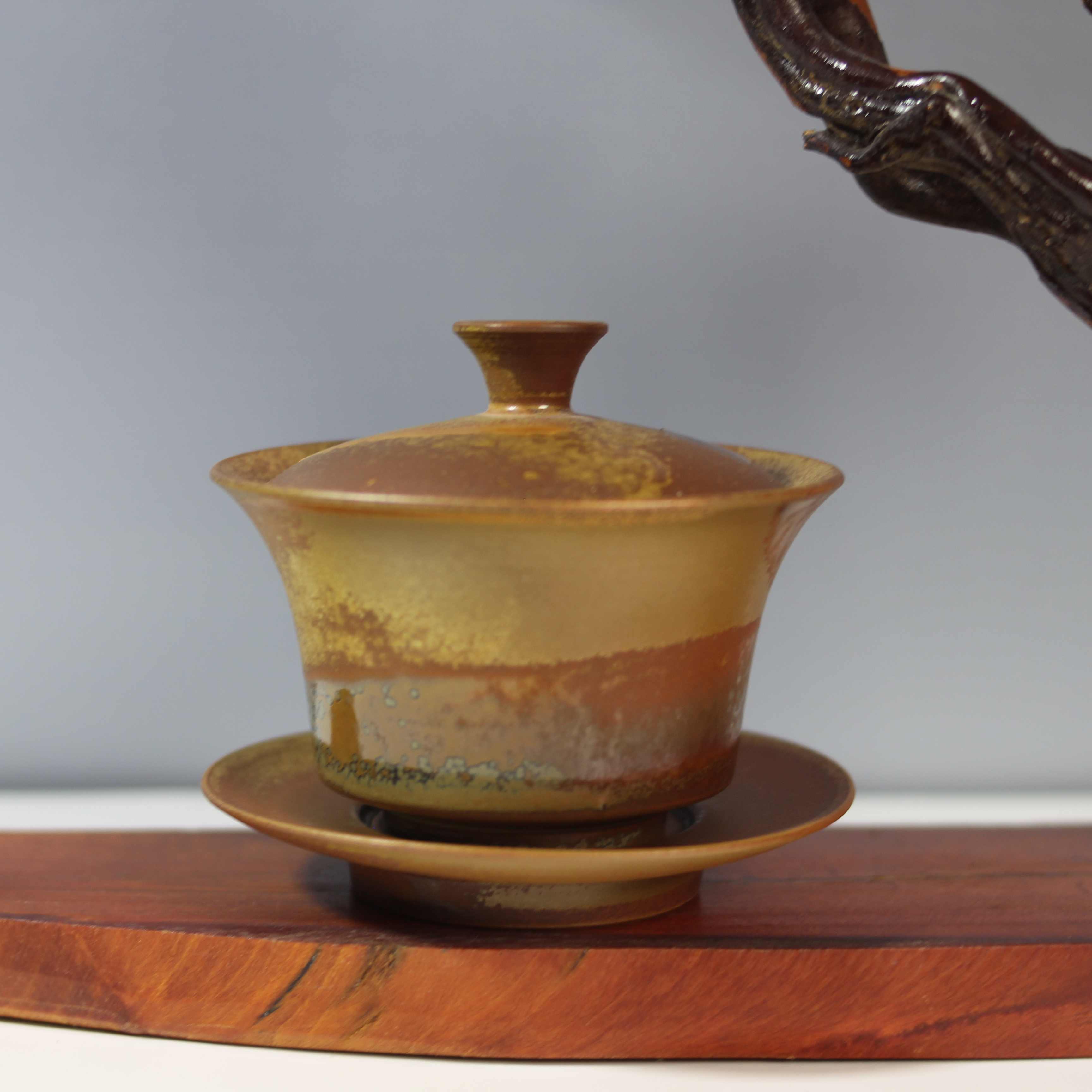 这是一套柴烧盖碗茶具,由盖、碗、托组成。