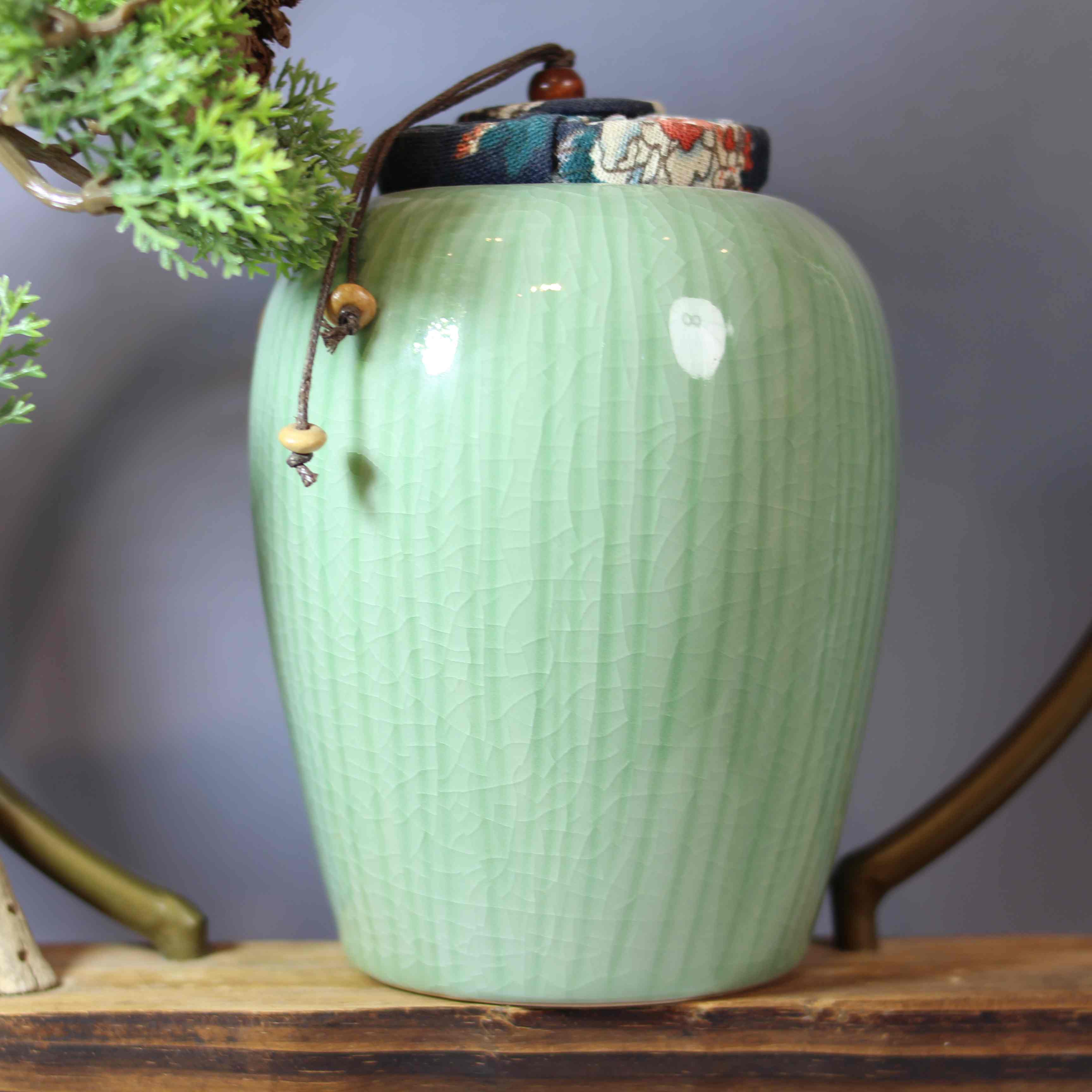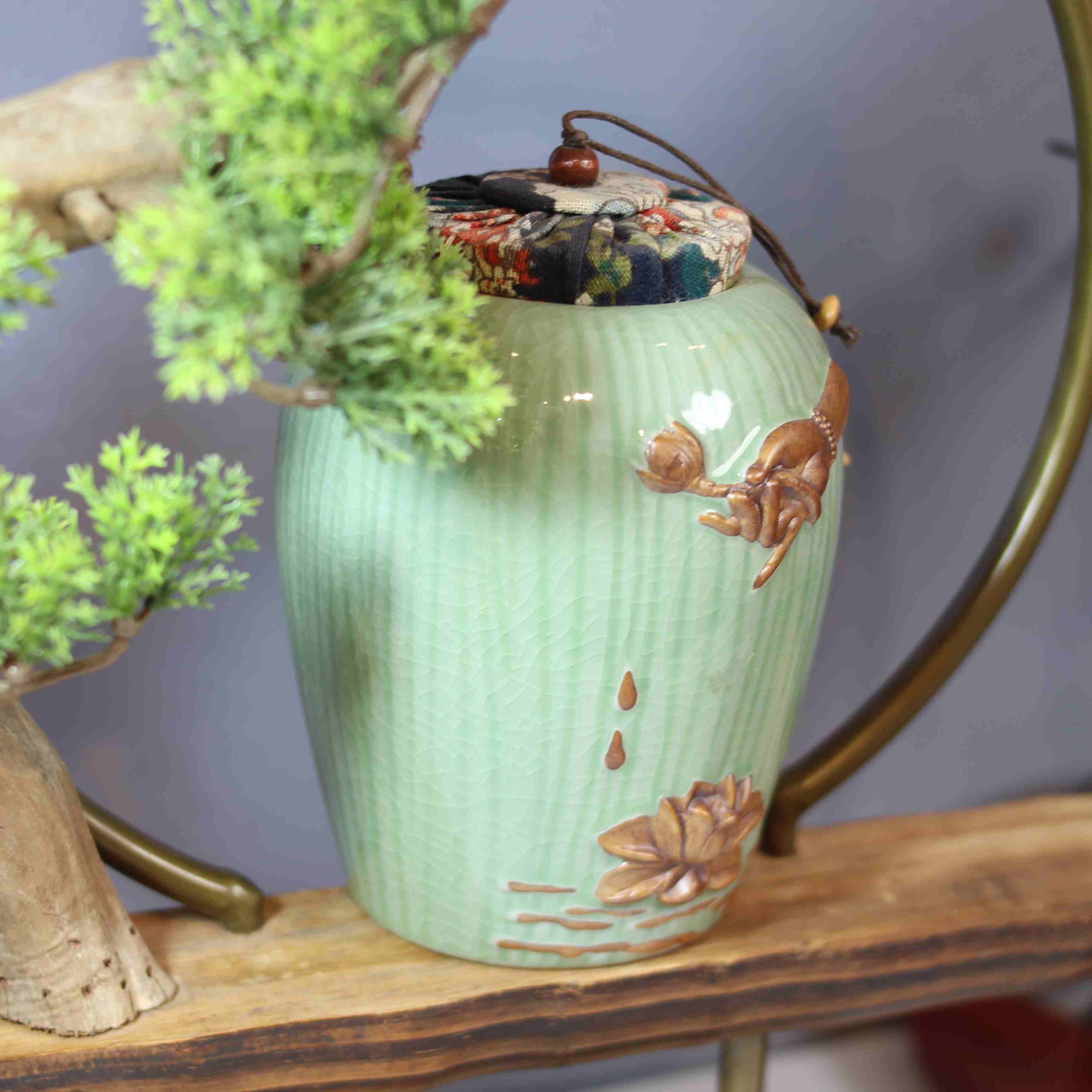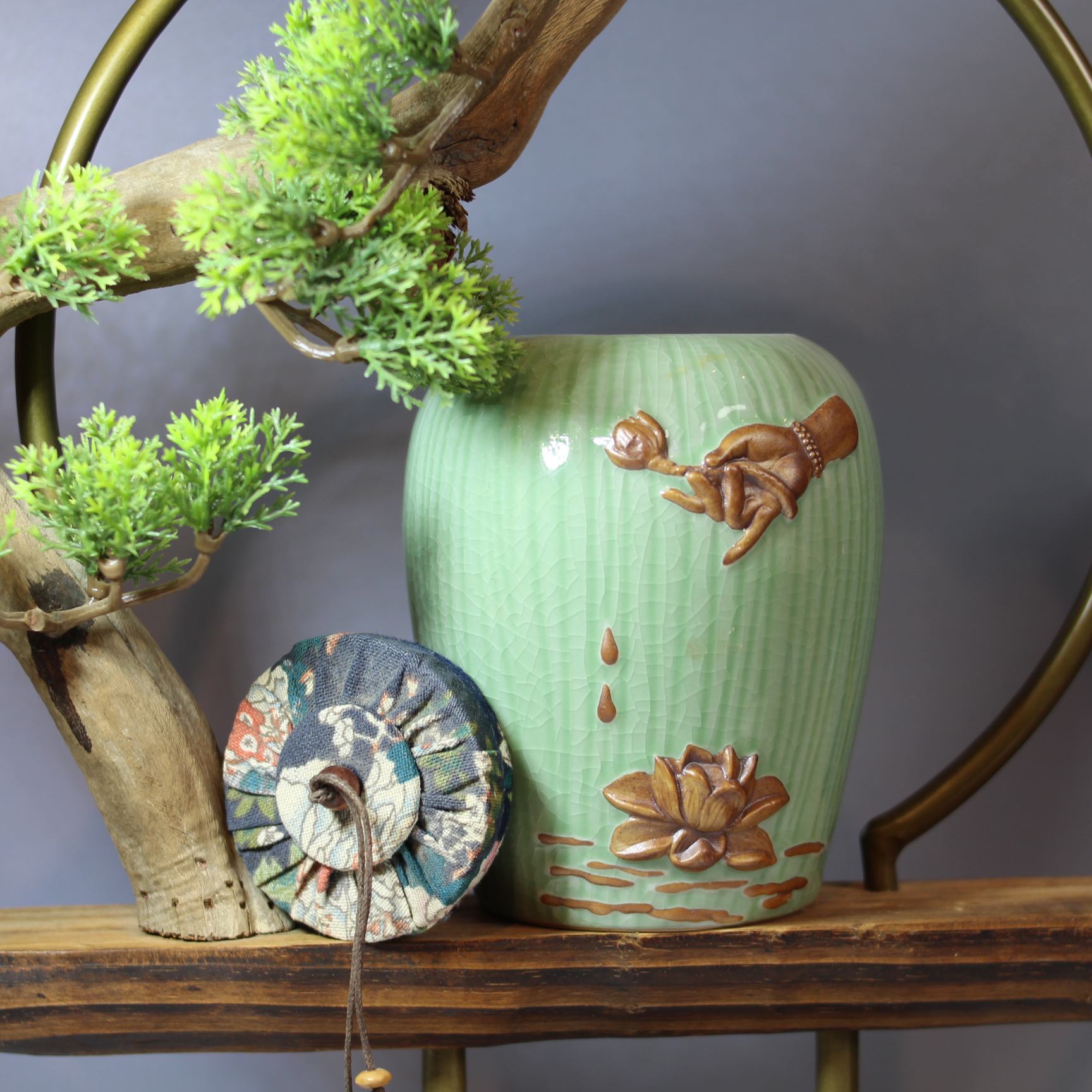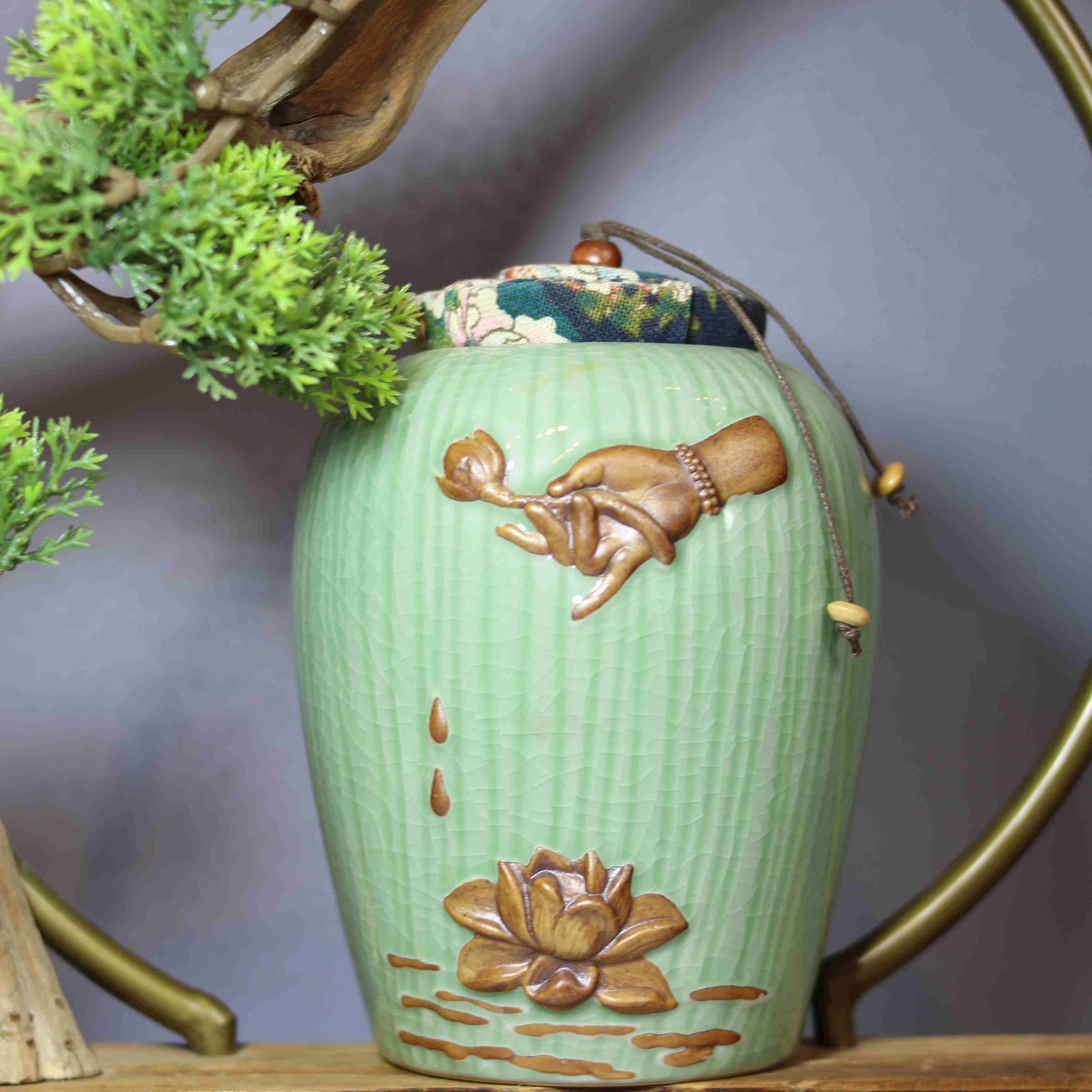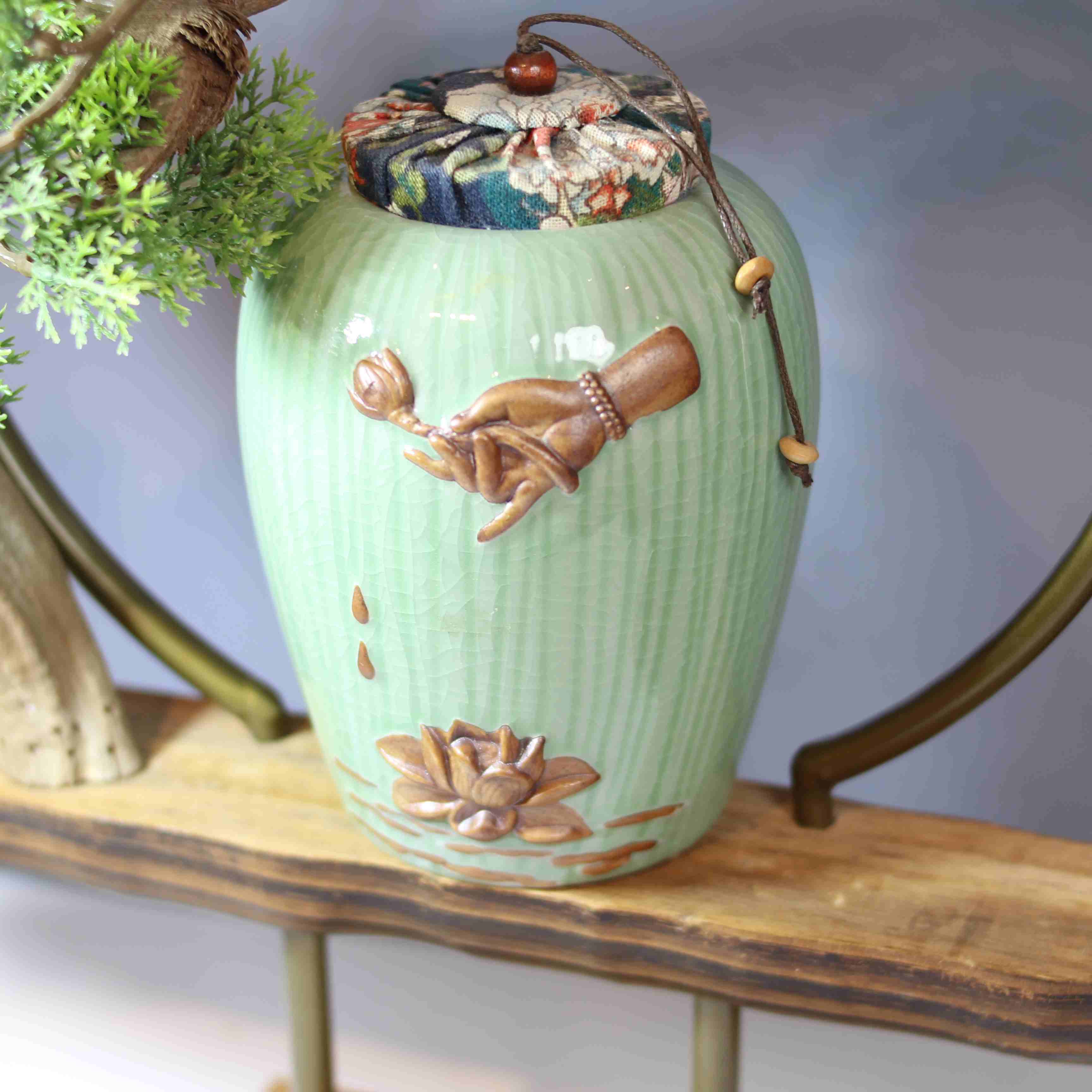 30元3串陶瓷吊坠这个茶叶罐别具一格,罐体采用了清新的浅绿色,表面带有自然的开片纹理,给人一种古朴雅致的感觉。 罐身上装饰有立体的浮雕图案,刻画了一只手正拈着一朵莲花,莲花造型栩栩如生,手的细节也十分精致,还有水滴和下方完整的莲花图案,整体富有禅意。罐口配有一个带有布艺装饰的盖子,布料花色丰富,增添了几分文艺气息,盖子上还系有串着木珠的绳子,兼具美观与实用性。 从工艺来看,这种带有浮雕装饰和开片效果的设计,对制作工艺要求较高,需要经过精心的塑形、雕刻、上釉和烧制等多道工序。 这款茶叶罐不仅可以很好地储存茶叶,保持茶叶的风味,其独特的外观设计还使其成为一件不错的家居装饰摆件,能够为空间增添一份宁静、雅致的氛围。