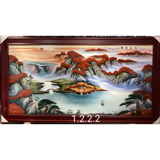 这幅瓷板画尺寸为 1.2x2.2(米) ,是一幅极具中式韵味的山水题材作品。