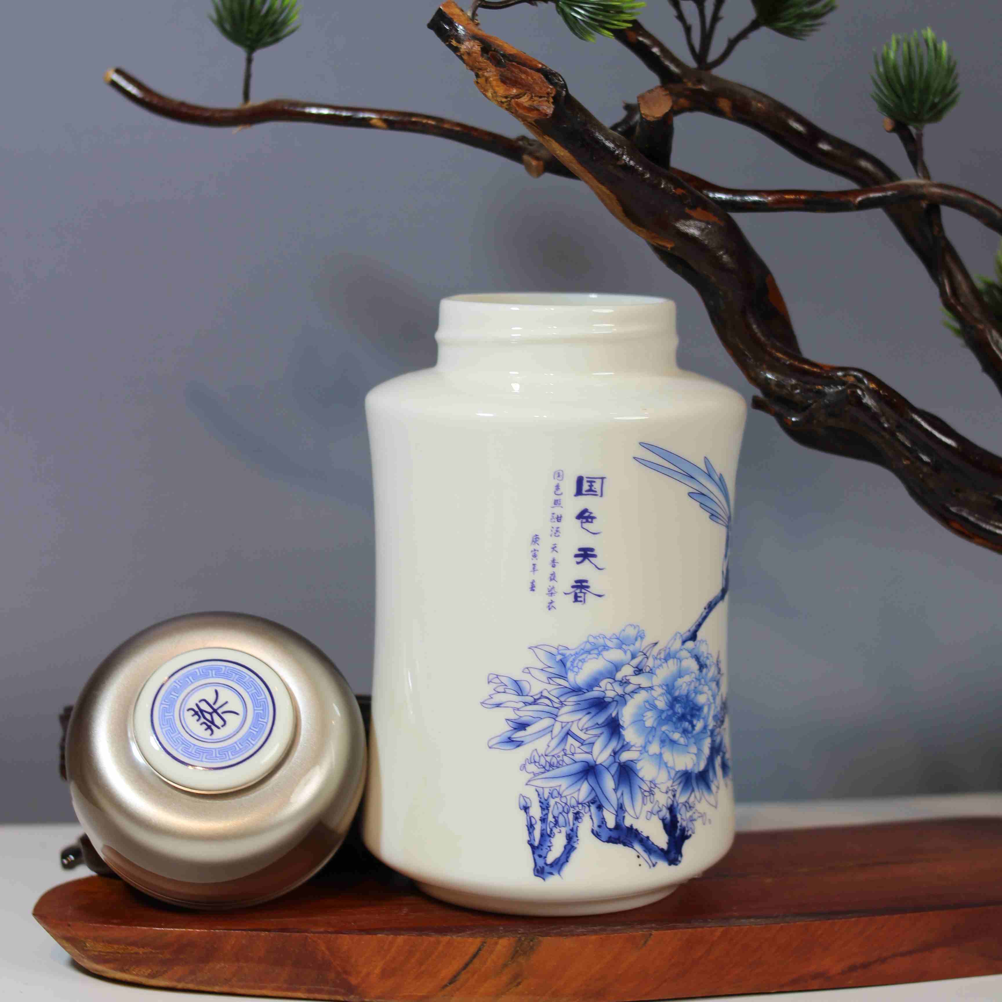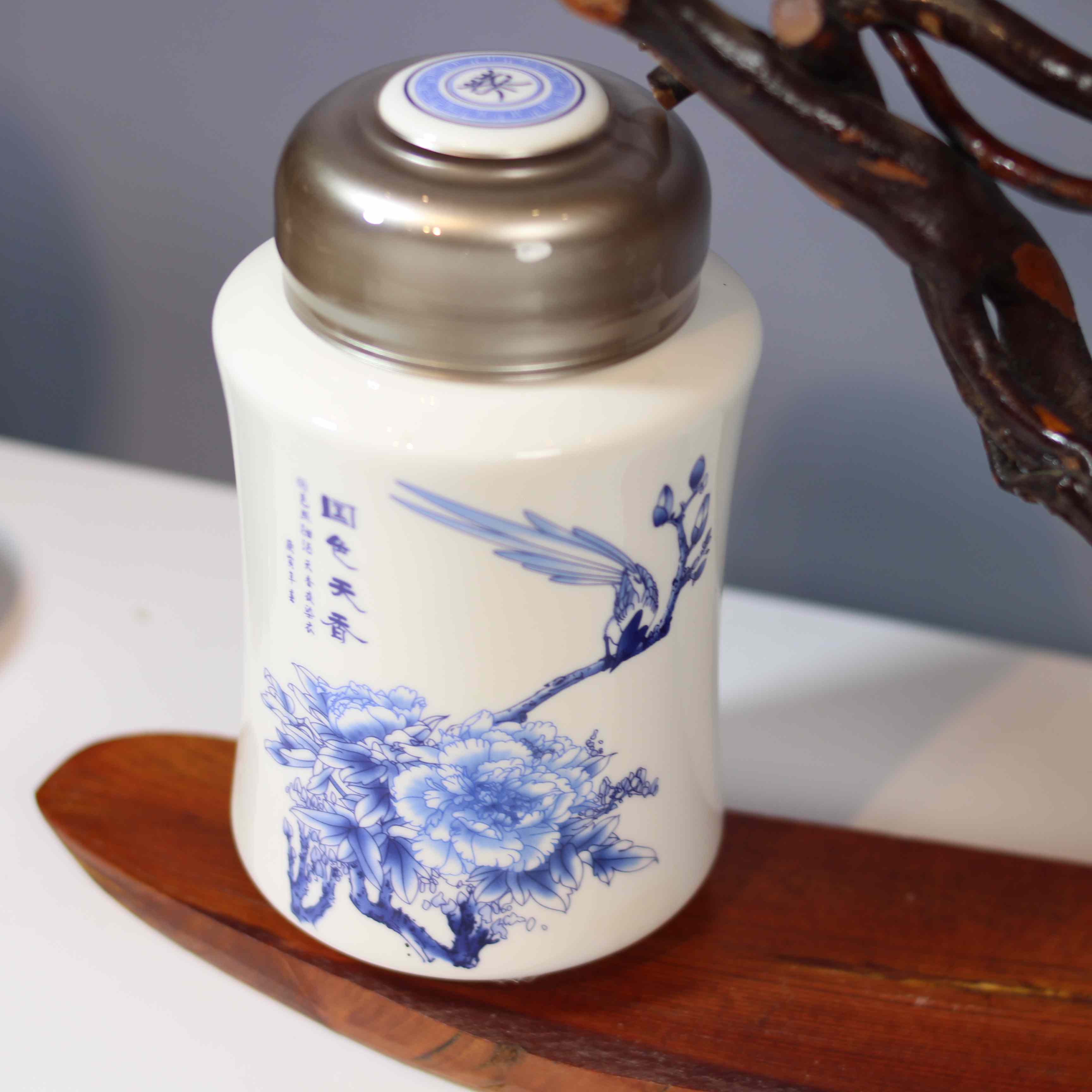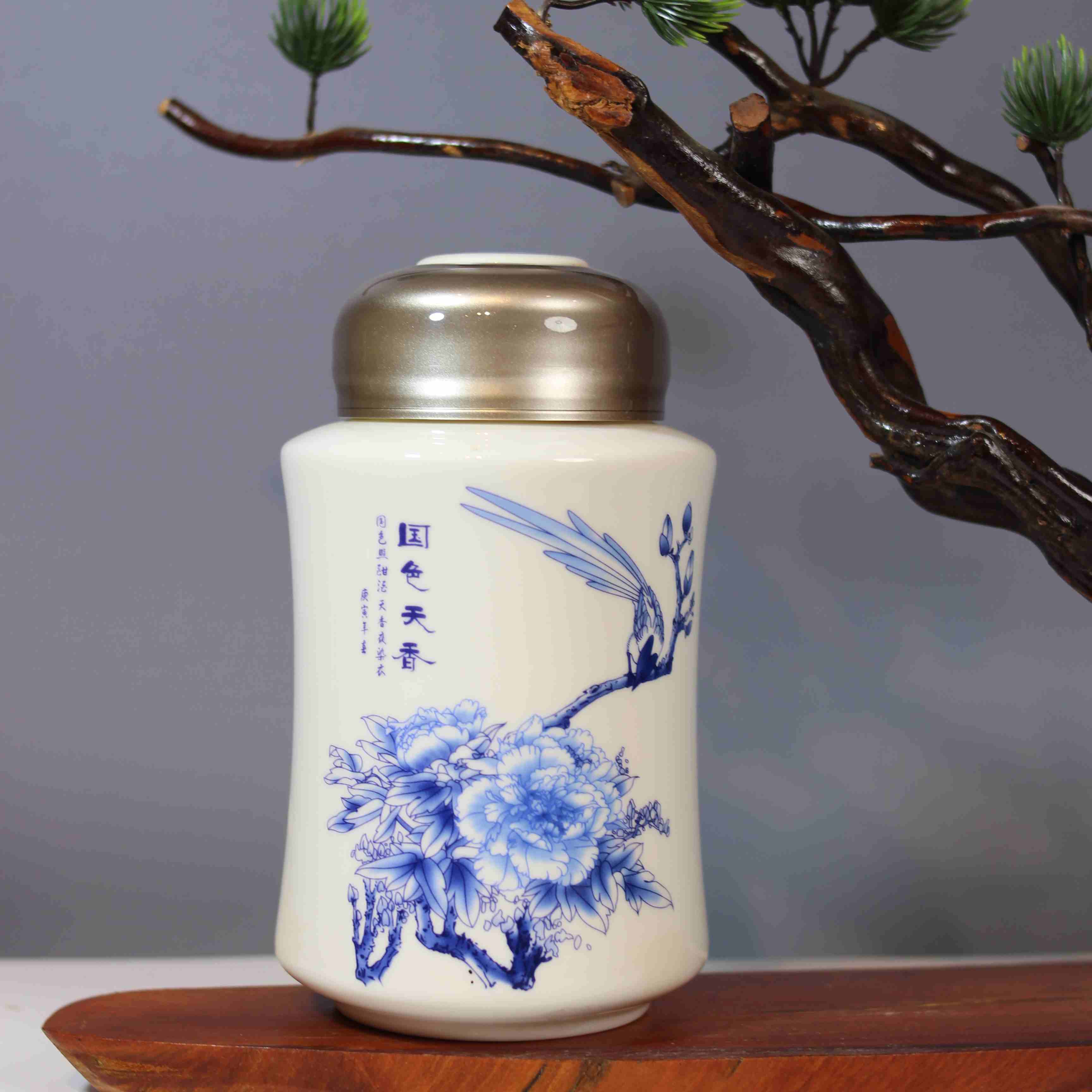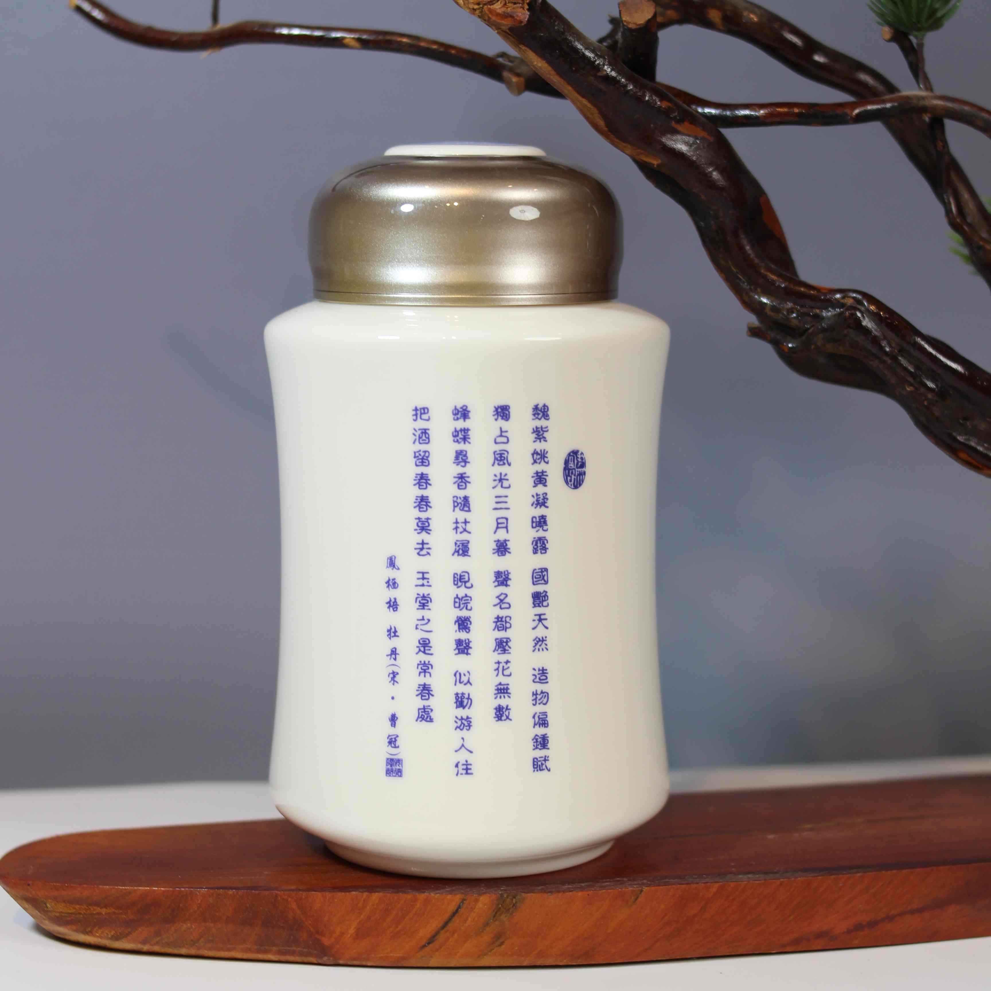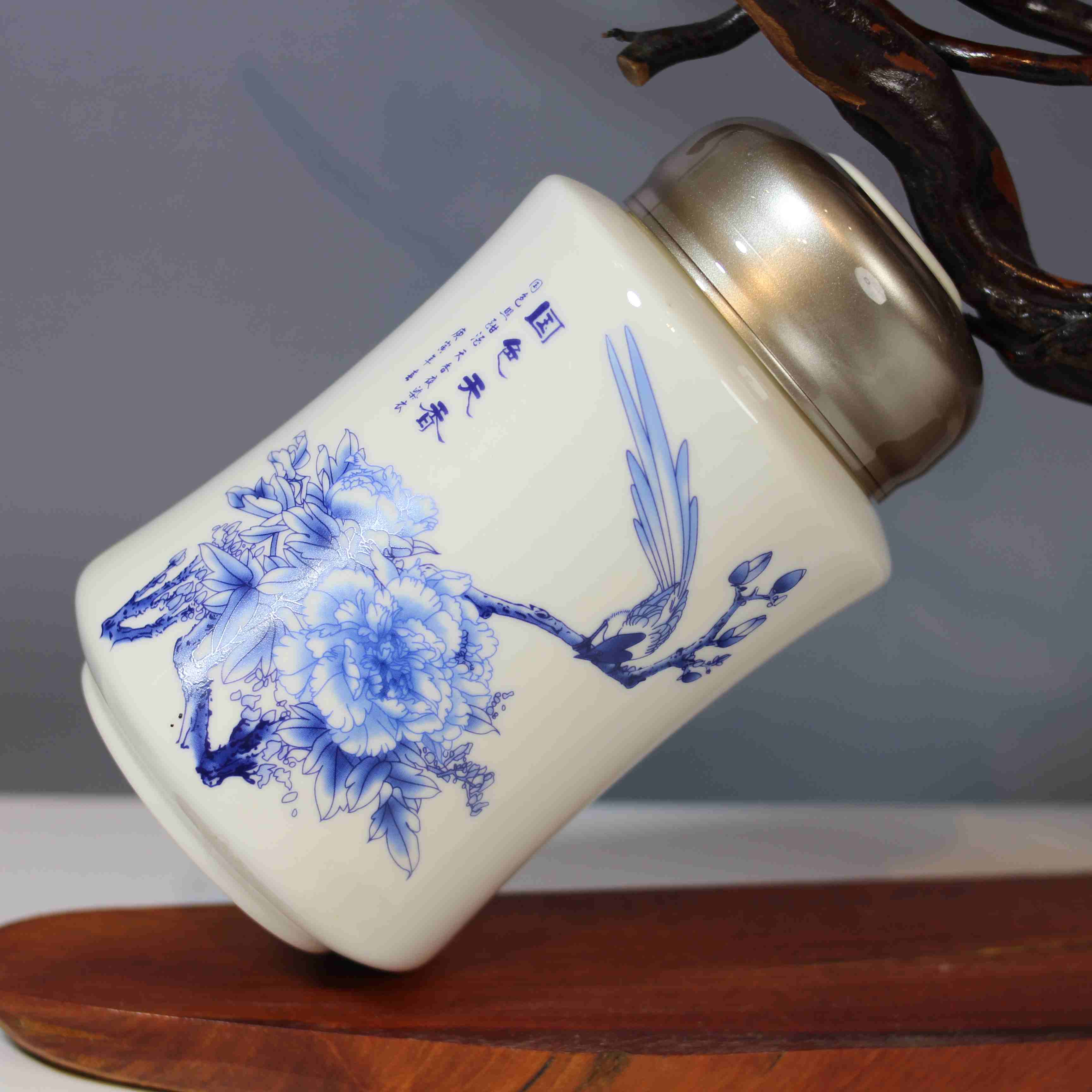 它整体造型简约大方,罐体主体为白色,呈现出温润的质感。 杯身一侧绘有精美的青花瓷图案,盛开的牡丹花栩栩如生,搭配枝头的鸟儿,画面富有生机 ,且旁边题写着“国色天香”字样,点明主题。另一侧则书写有关于牡丹的诗句,字体工整,增添了文化韵味,落款处还有印章,彰显其艺术价值。 配备了金属材质的盖子,密封性较好,从工艺上,罐身的青花瓷图案采用了传统的青花绘制工艺,线条流畅,色彩清雅,既具备实用功能,又具有较高的观赏性和艺术价值。