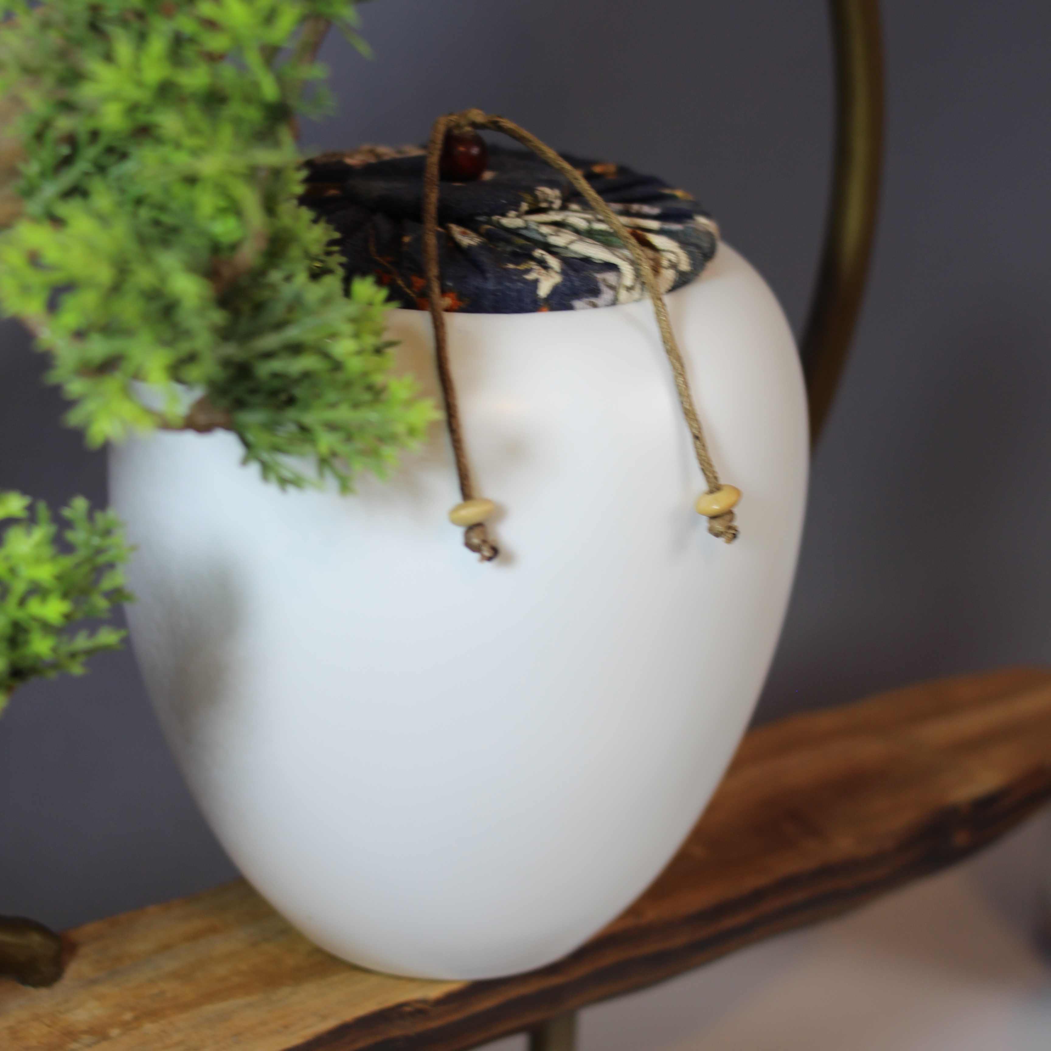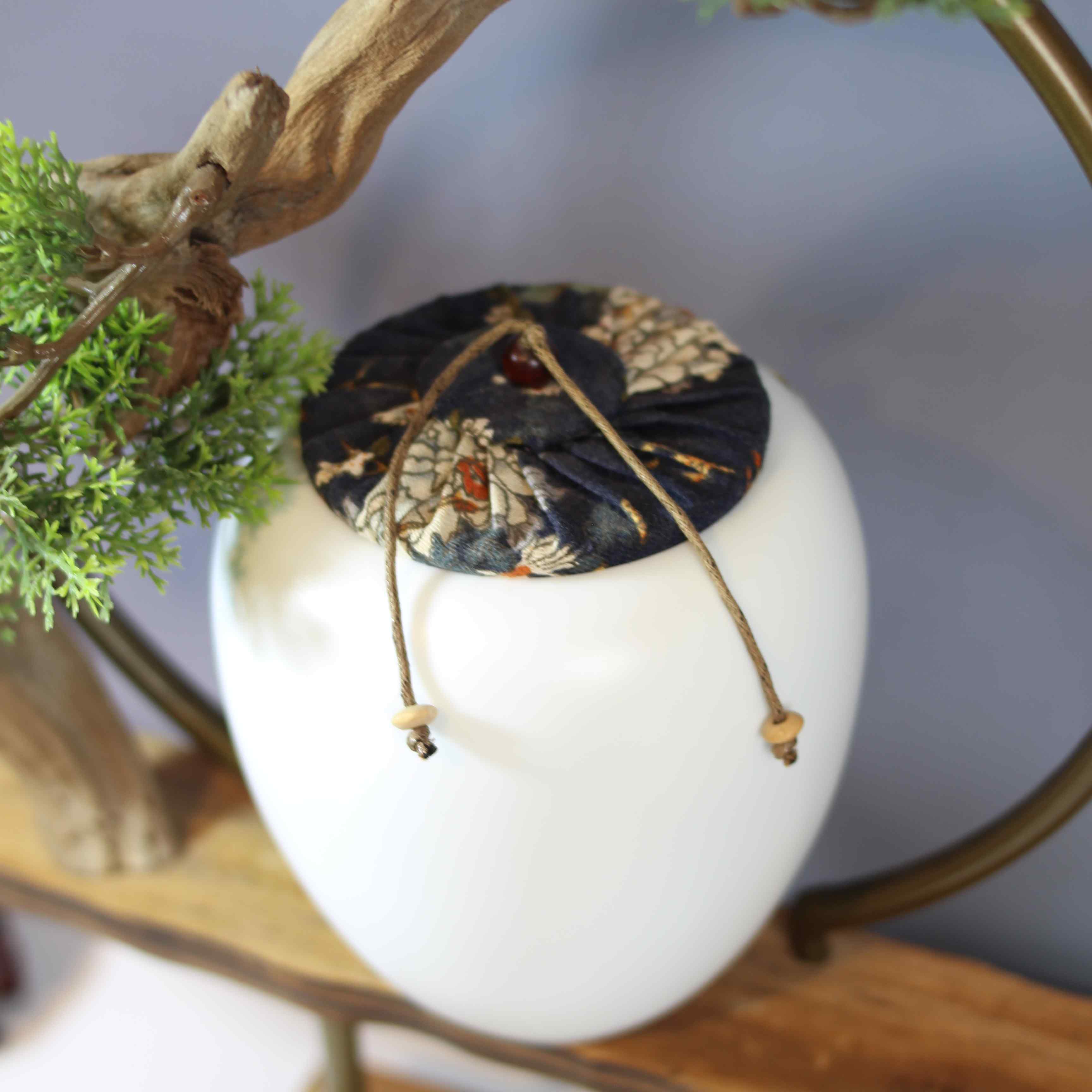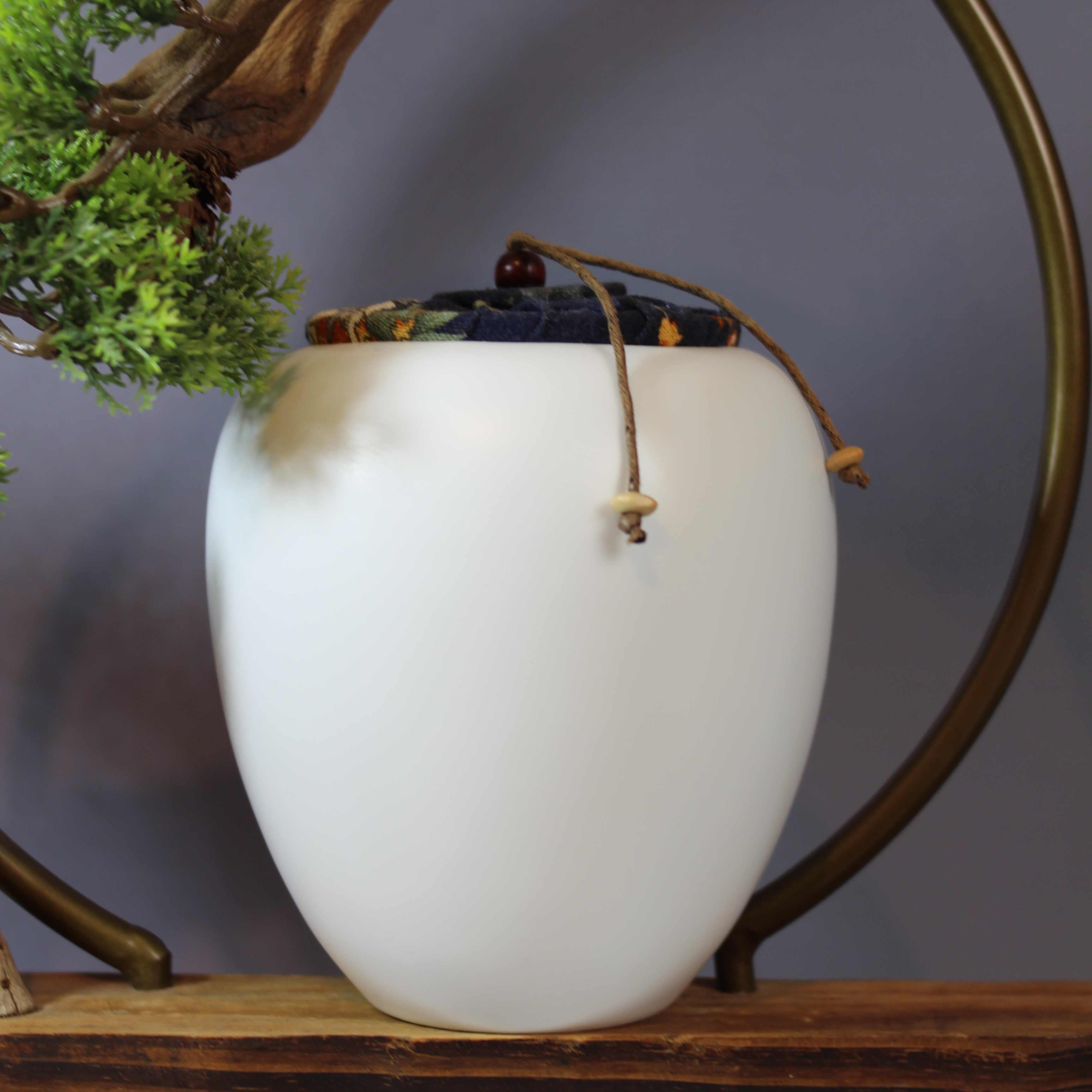 这个是陶瓷茶叶罐。陶瓷茶叶罐在茶叶储存方面有着不少优势呢,陶瓷的材质相对稳定,不容易和茶叶发生化学反应,能比较好地保持茶叶原本的风味和品质。而且从外观来看,它也颇具美感,很多陶瓷茶叶罐的造型、釉色都很精致,像图里这个设计简约大方,还搭配了带有装饰的布盖和绳子,既实用又有一定的装饰性,放在家里也能成为一个不错的摆件哦。在日常生活中,用它来存放茶叶,能让茶叶在相对密封、稳定的环境里保存,减少受潮、串味等问题,对于爱茶之人来说是个挺实用的器具呢。