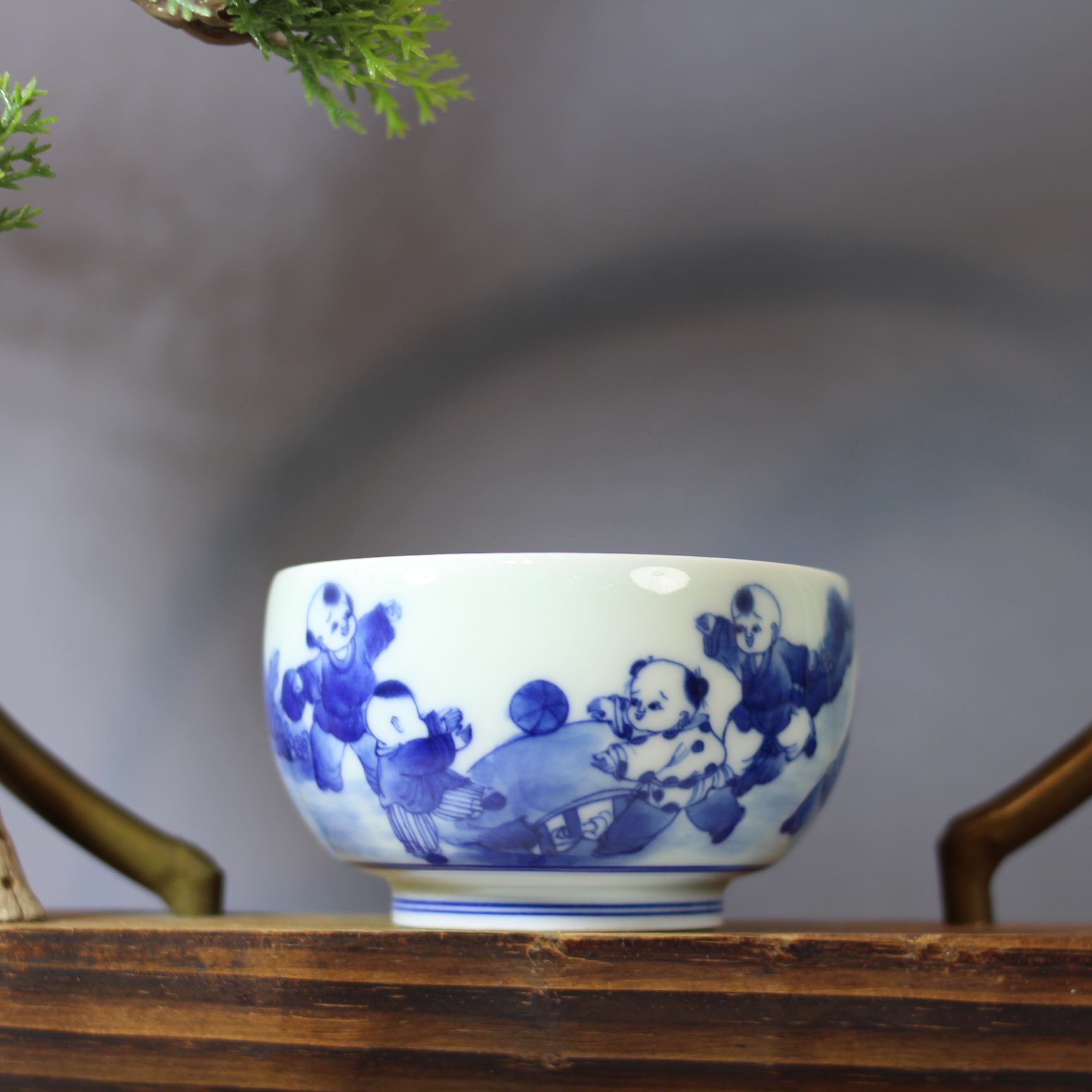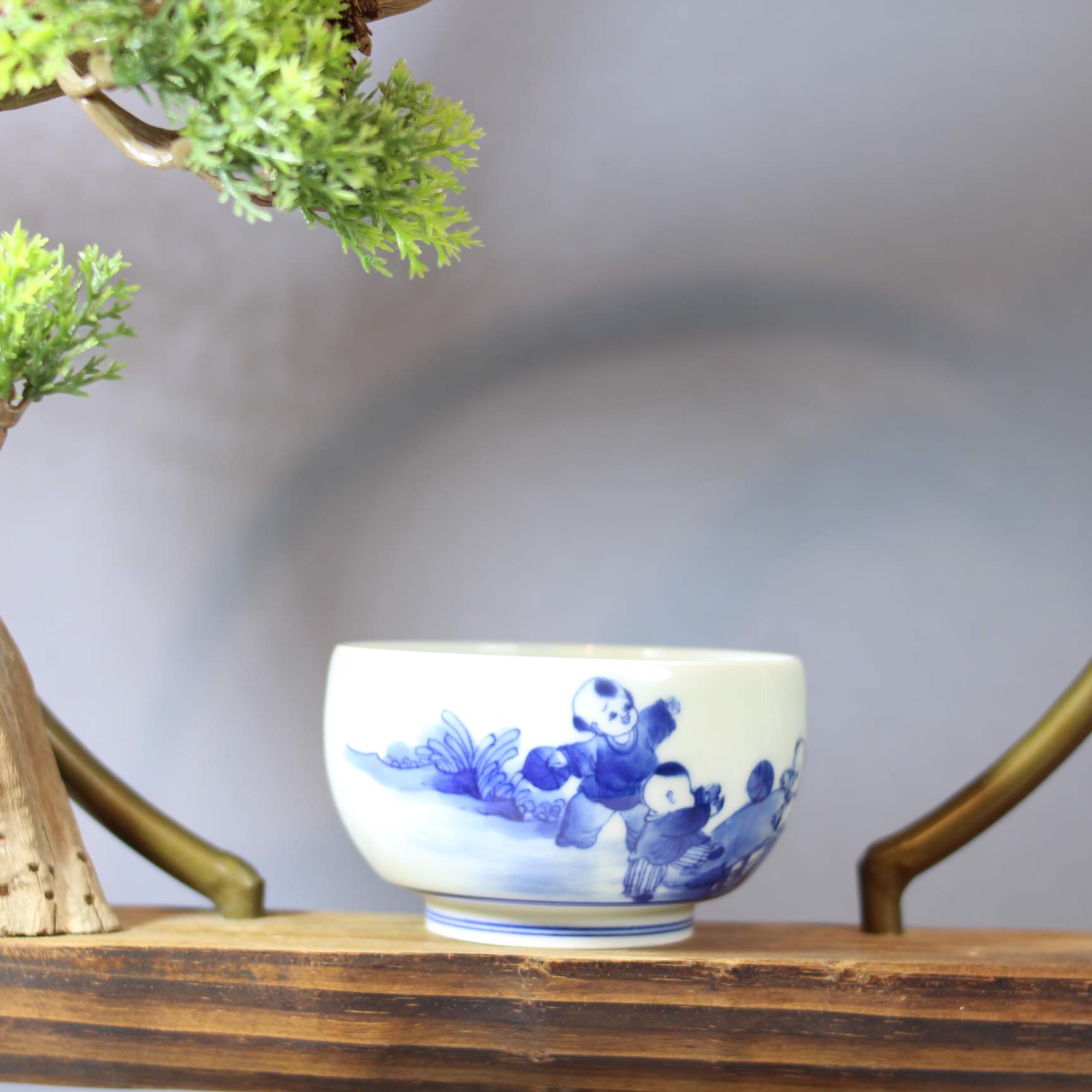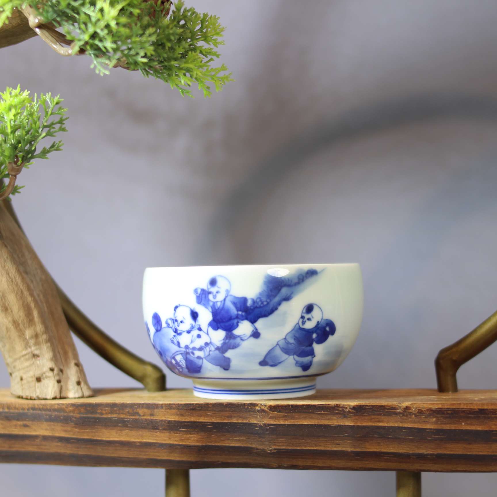 青花童子纹茶杯,以经典的蓝白配色呈现。杯身上绘制了孩童嬉戏玩耍的场景,充满童趣与生活气息。从装饰技法上看,属于青花瓷,是通过在瓷胎上绘制青花纹样,再施透明釉,经高温烧制而成。这类茶杯常作为功夫茶具中的主人杯使用,兼具实用性与艺术观赏性,展现了传统陶瓷工艺之美和深厚的文化底蕴。