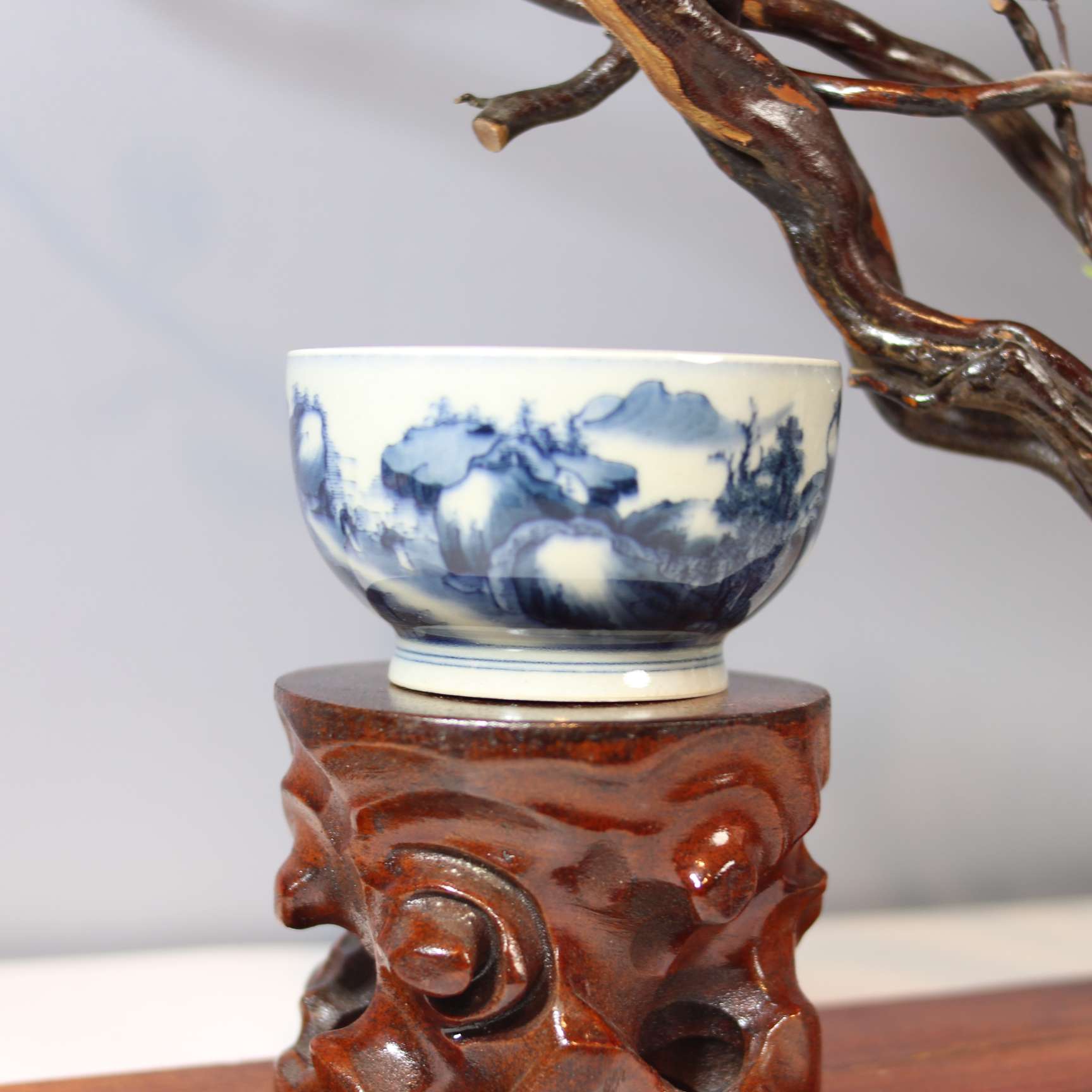 这是一只青花山水纹茶杯,属于传统的青花瓷制品,它运用了青花瓷工艺,先以含氧化钴的颜料在瓷胎上精心绘制山水图案,再施一层透明釉,经高温烧制后,氧化钴呈现出稳定的蓝色,与洁白的瓷胎相互映衬,形成蓝白分明、清新雅致的独特艺术效果 。